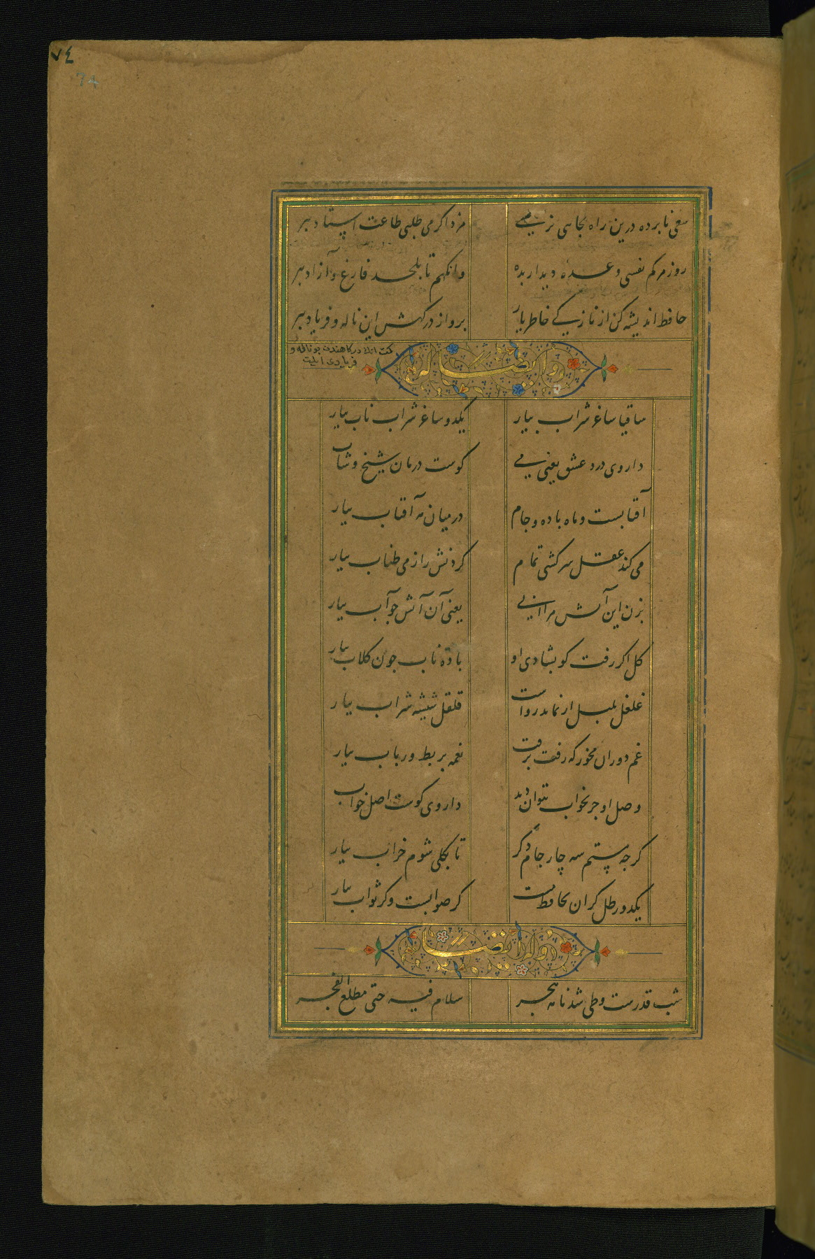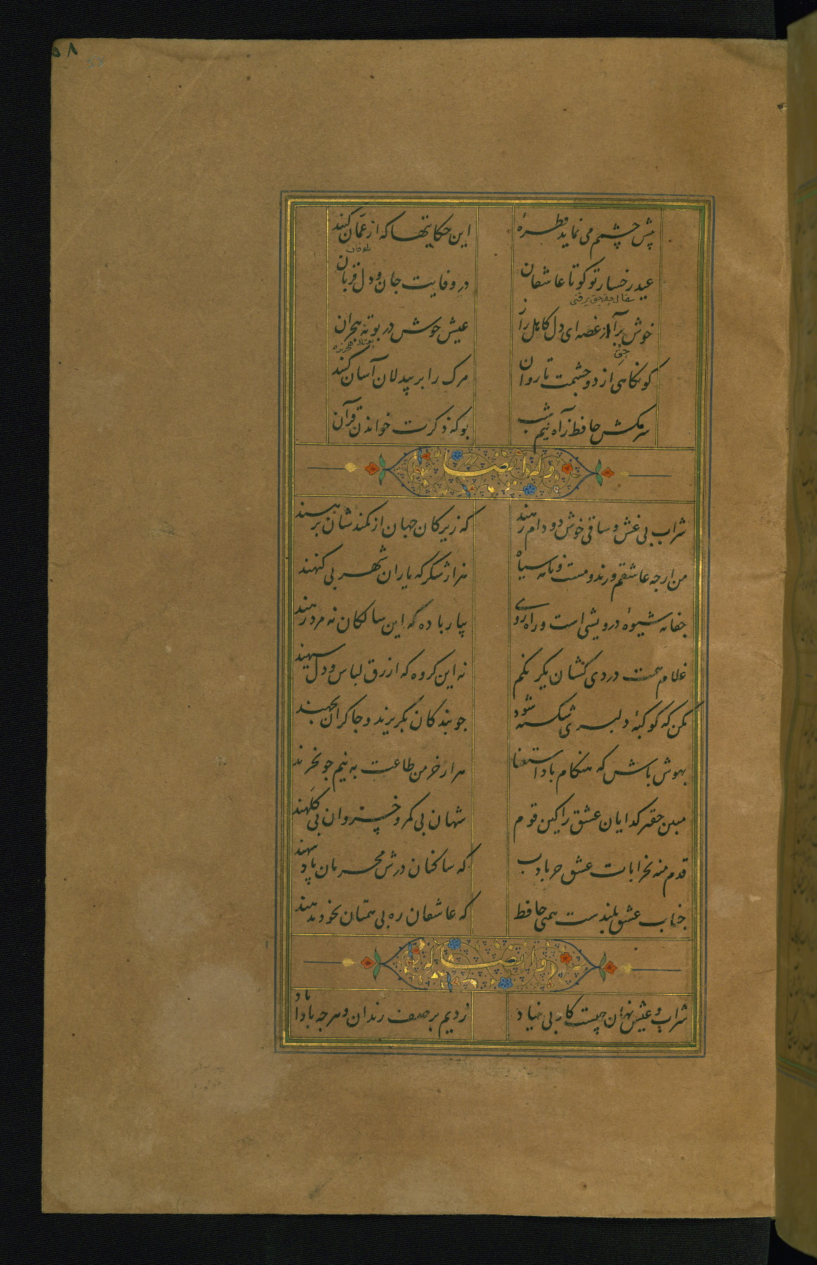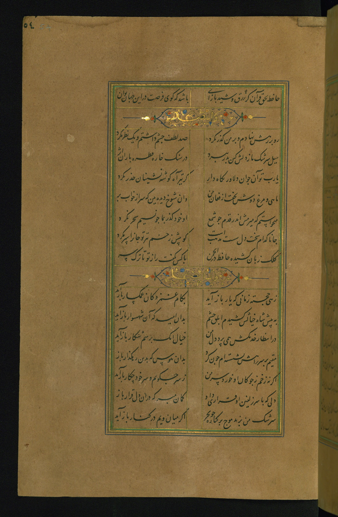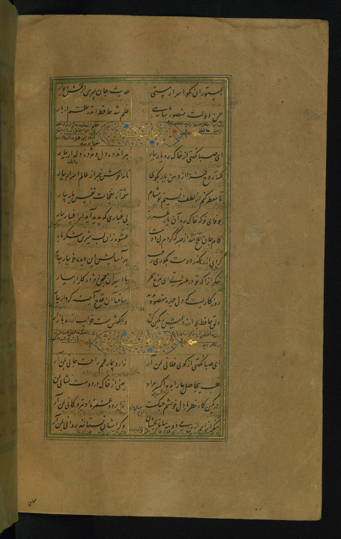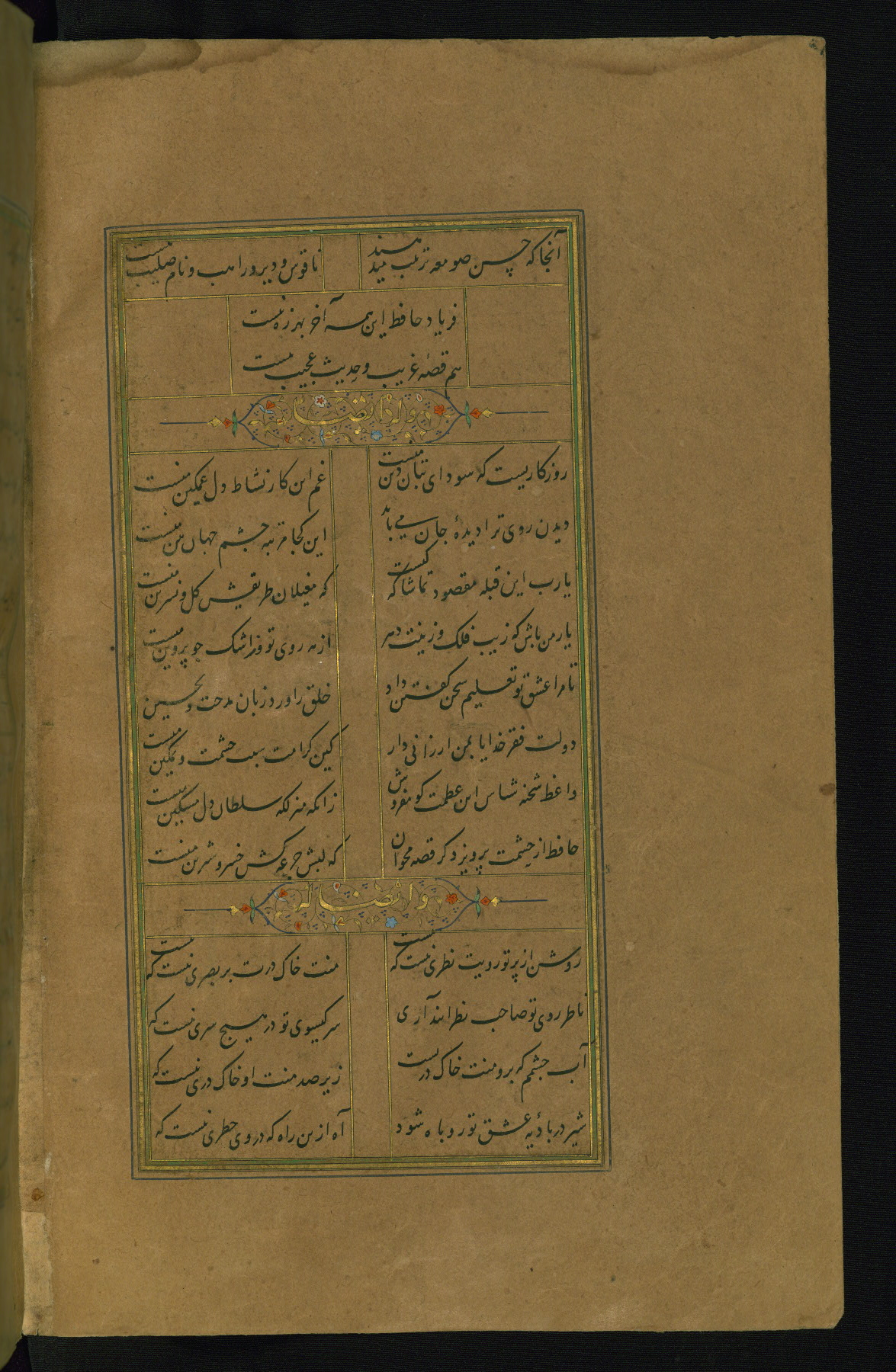 This is an illuminated and illustrated manuscript copy of the Collection of poems (dīvān) by Shams al-Dīn Muḥammad Ḥāfiz al-Shīrāzī (fl. eighth century AH / fourteenth CE). It was written in black nasta‘līq script with chapter/section headings in gold ink by Zayn al-‘Ābidīn ‘Abd al-Raḥmān al-Jāmī in 918 AH / 1512 CE in Safavid Iran. The manuscript opens with an illuminated medallion (fol. 1a), followed by a double-page illustrated frontispiece (fols. 1b-2a). The text begins with an incipit page with illuminated headpiece (fol. 2b). There are three additional illustrations (fols. 24a, 49b, and 87a). The red leather binding, which is not original and may be attributed to late twelfth-century AH / eighteenth CE or thirteenth-century AH / nineteenth CE Turkey, has a scalloped medallion with gold-tooled decoration and borders.