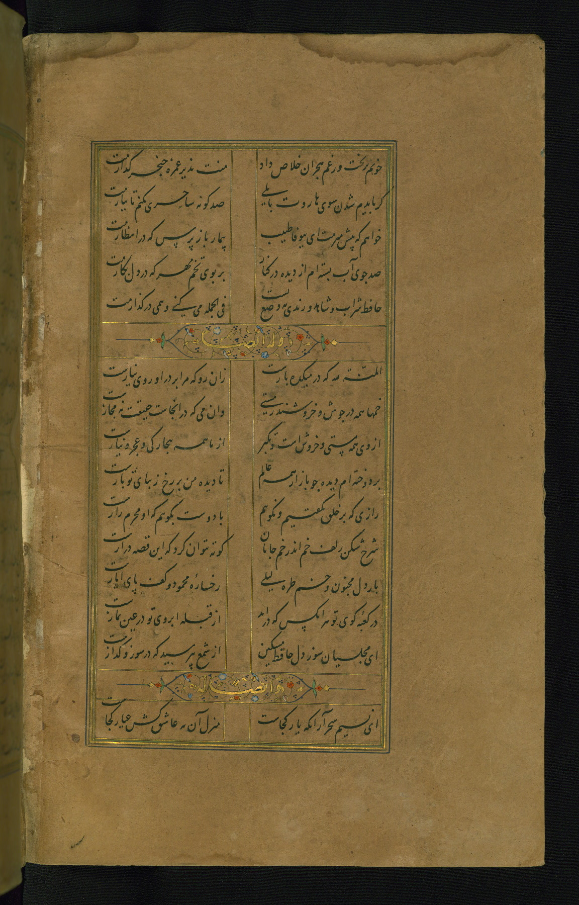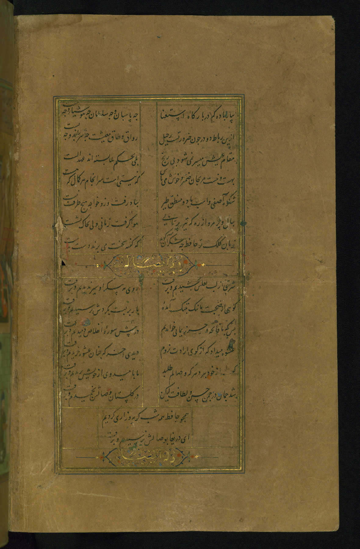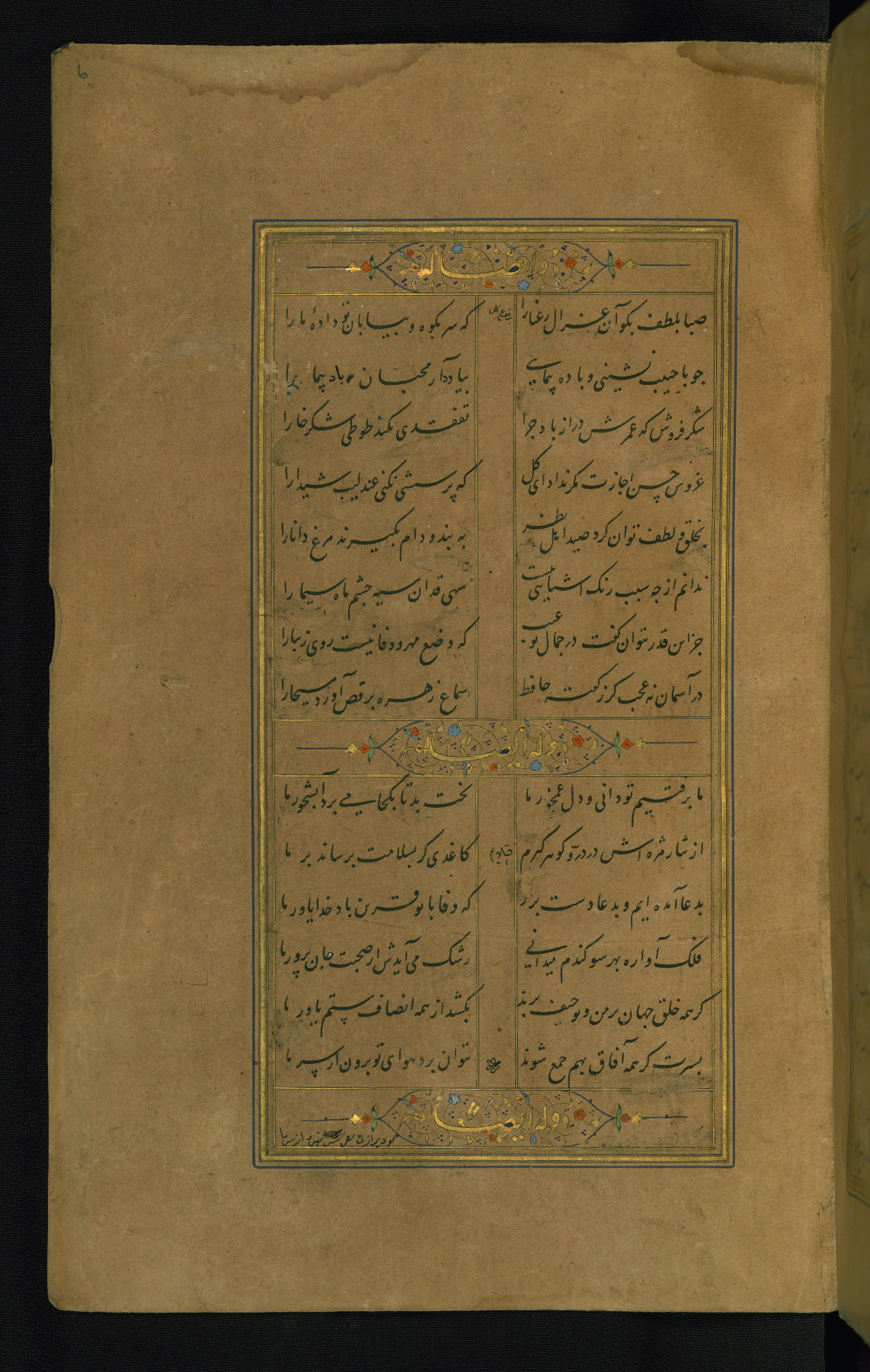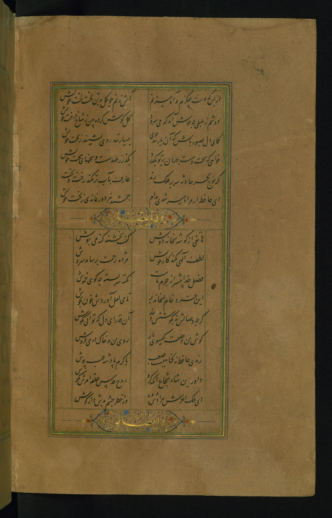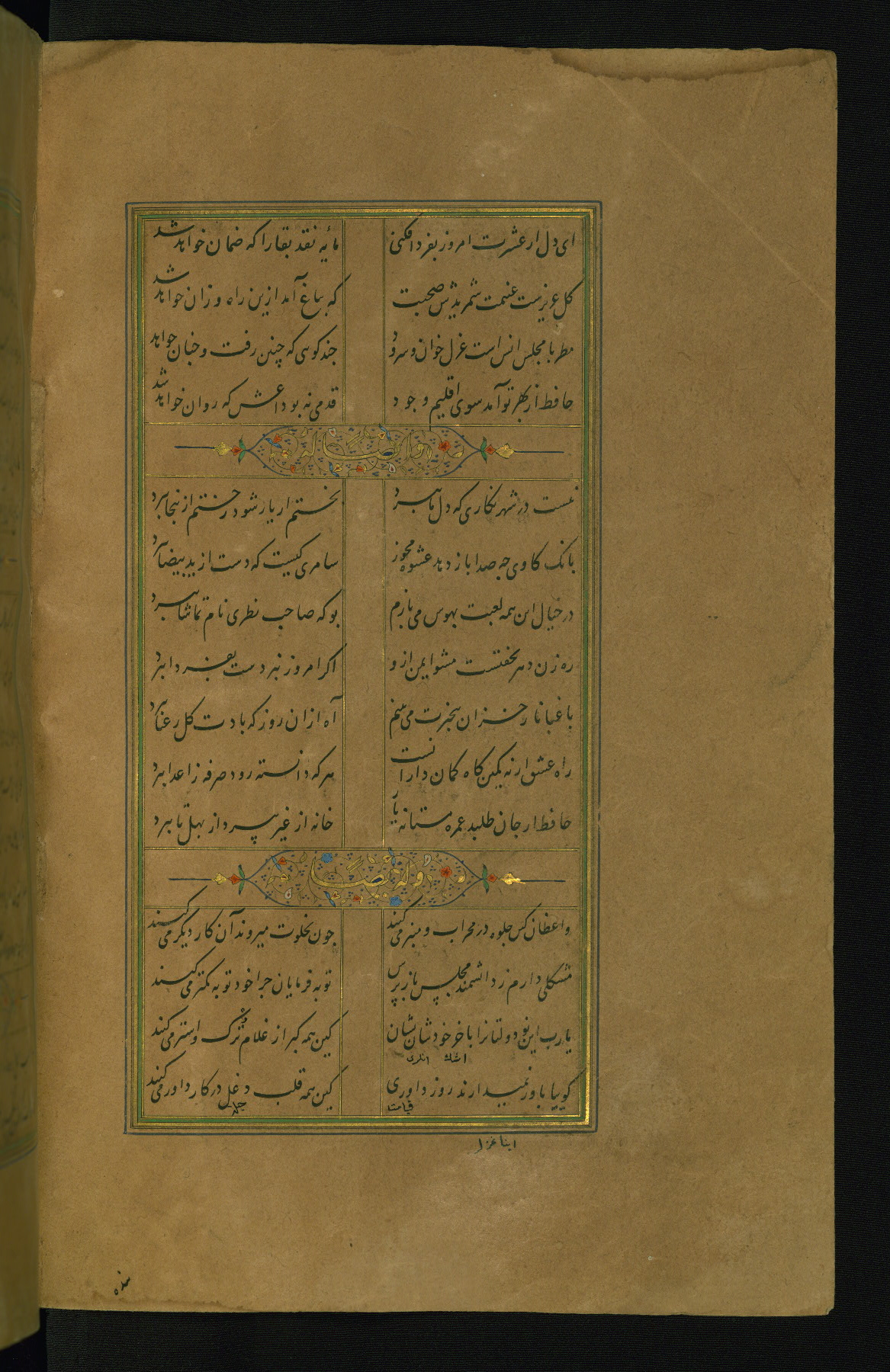 This is an illuminated and illustrated manuscript copy of the Collection of poems (dīvān) by Shams al-Dīn Muḥammad Ḥāfiz al-Shīrāzī (fl. eighth century AH / fourteenth CE). It was written in black nasta‘līq script with chapter/section headings in gold ink by Zayn al-‘Ābidīn ‘Abd al-Raḥmān al-Jāmī in 918 AH / 1512 CE in Safavid Iran. The manuscript opens with an illuminated medallion (fol. 1a), followed by a double-page illustrated frontispiece (fols. 1b-2a). The text begins with an incipit page with illuminated headpiece (fol. 2b). There are three additional illustrations (fols. 24a, 49b, and 87a). The red leather binding, which is not original and may be attributed to late twelfth-century AH / eighteenth CE or thirteenth-century AH / nineteenth CE Turkey, has a scalloped medallion with gold-tooled decoration and borders.