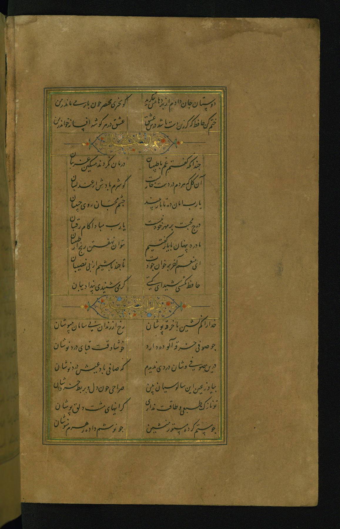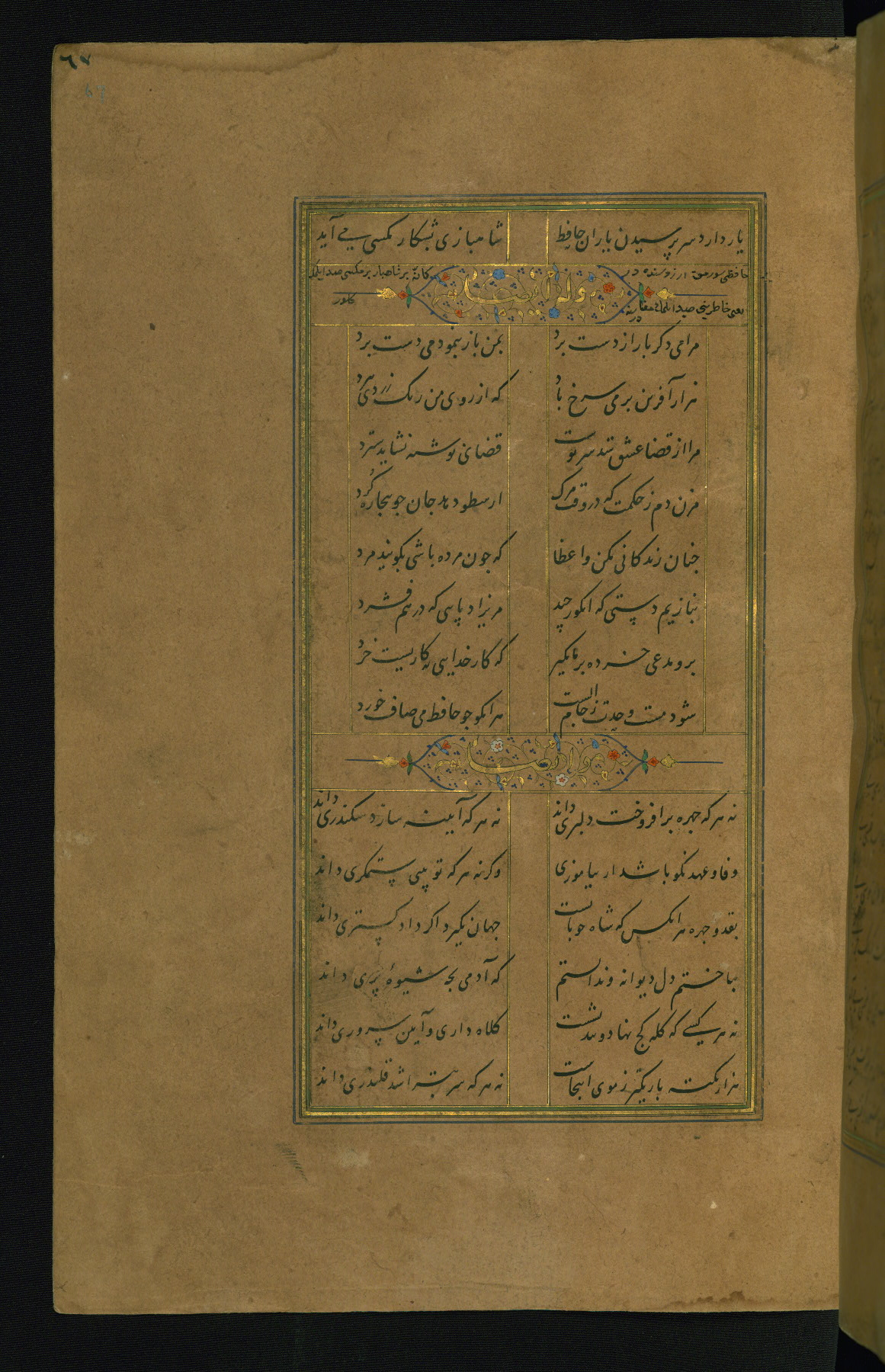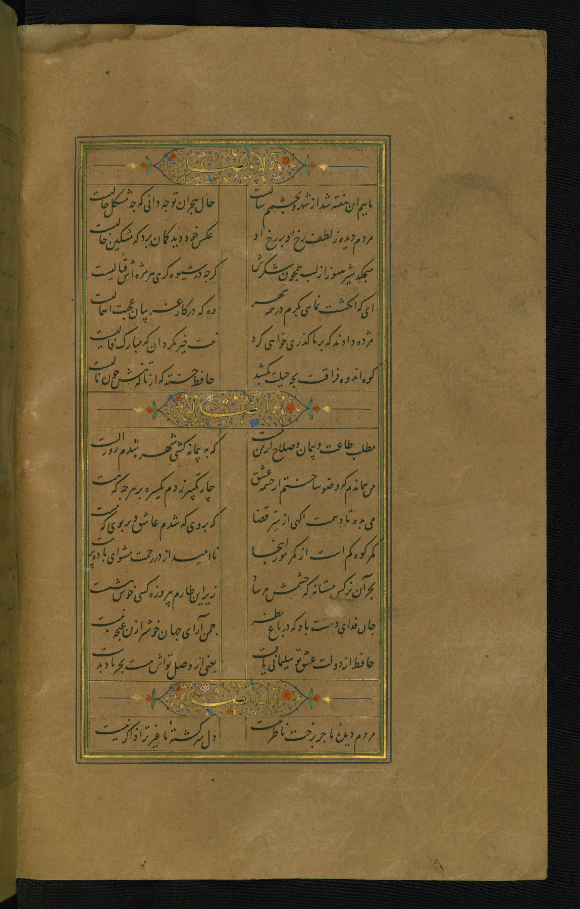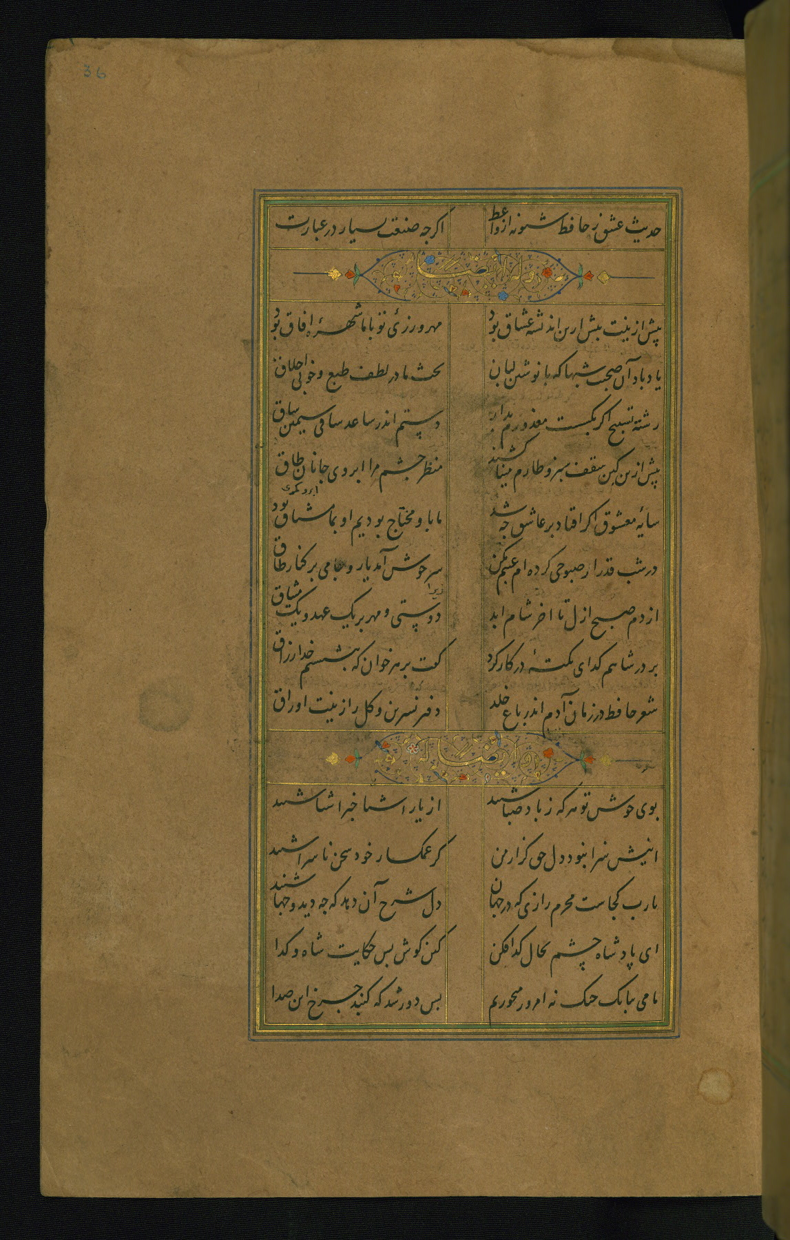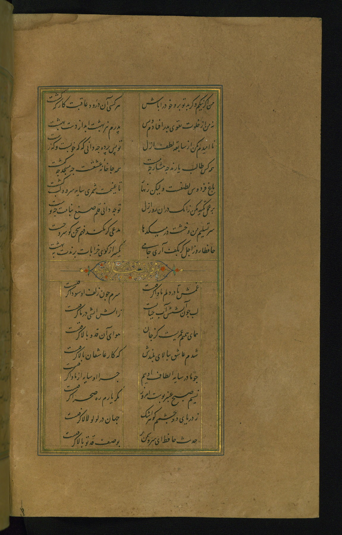 This is an illuminated and illustrated manuscript copy of the Collection of poems (dīvān) by Shams al-Dīn Muḥammad Ḥāfiz al-Shīrāzī (fl. eighth century AH / fourteenth CE). It was written in black nasta‘līq script with chapter/section headings in gold ink by Zayn al-‘Ābidīn ‘Abd al-Raḥmān al-Jāmī in 918 AH / 1512 CE in Safavid Iran. The manuscript opens with an illuminated medallion (fol. 1a), followed by a double-page illustrated frontispiece (fols. 1b-2a). The text begins with an incipit page with illuminated headpiece (fol. 2b). There are three additional illustrations (fols. 24a, 49b, and 87a). The red leather binding, which is not original and may be attributed to late twelfth-century AH / eighteenth CE or thirteenth-century AH / nineteenth CE Turkey, has a scalloped medallion with gold-tooled decoration and borders.