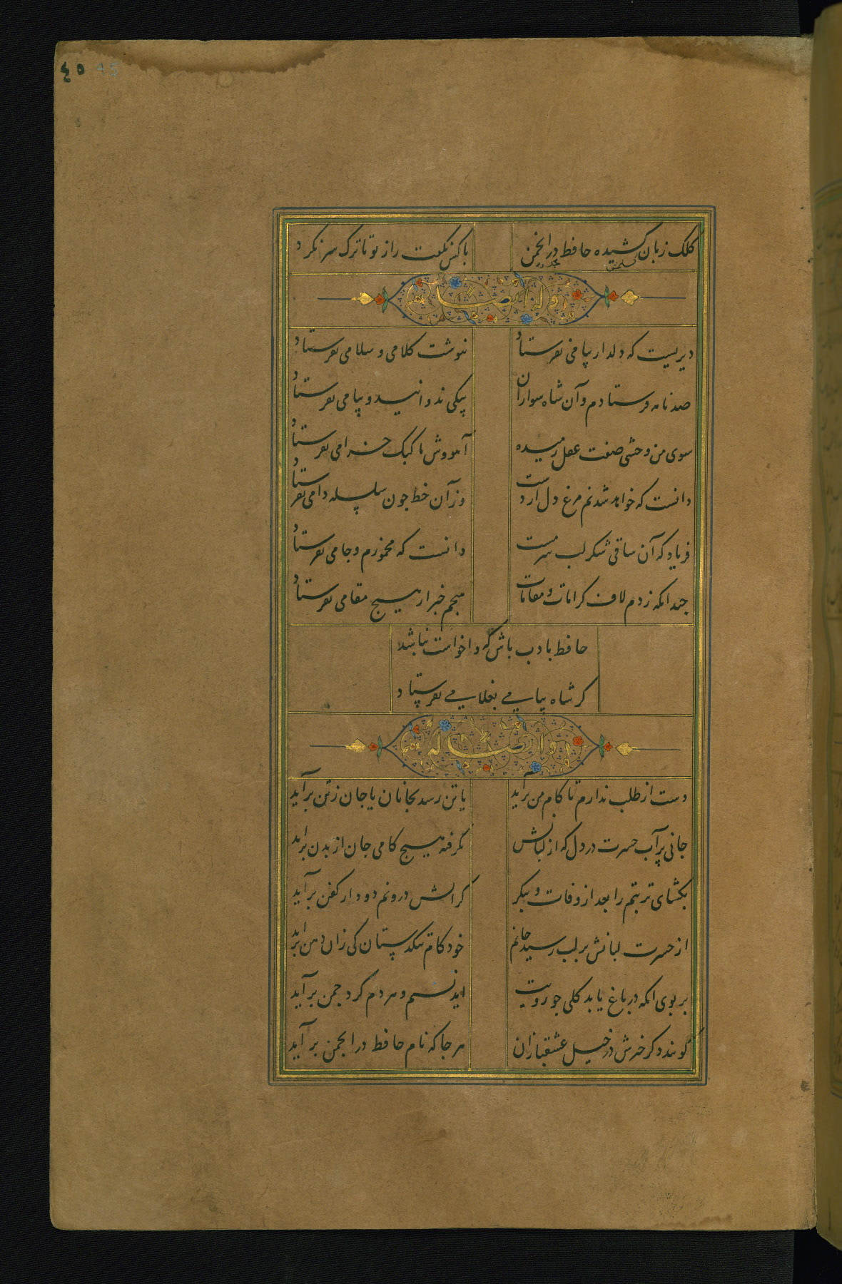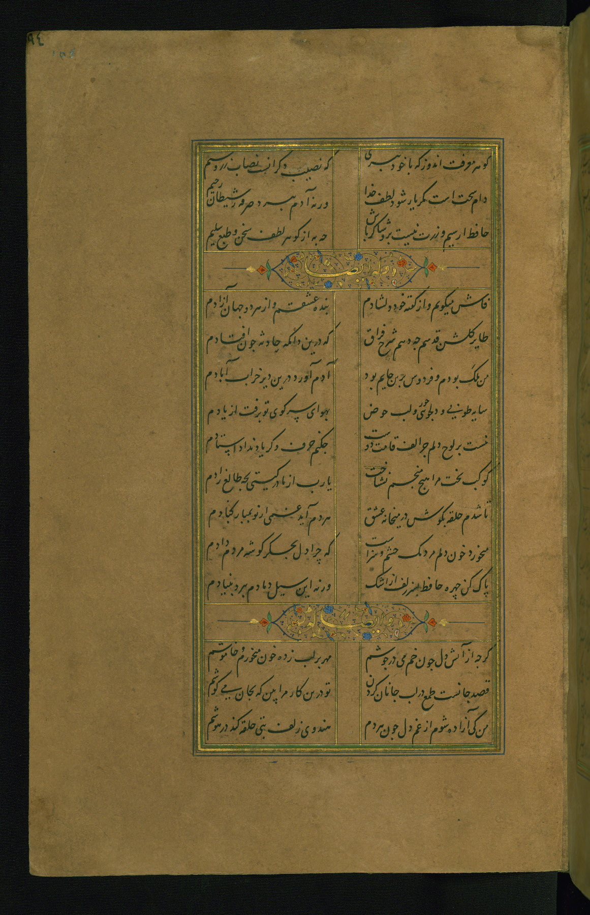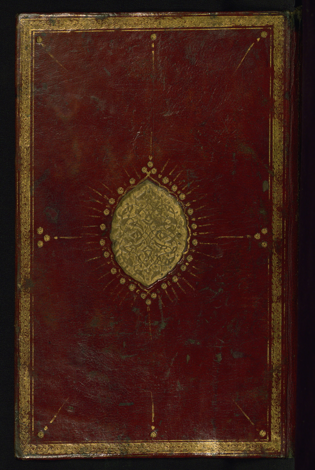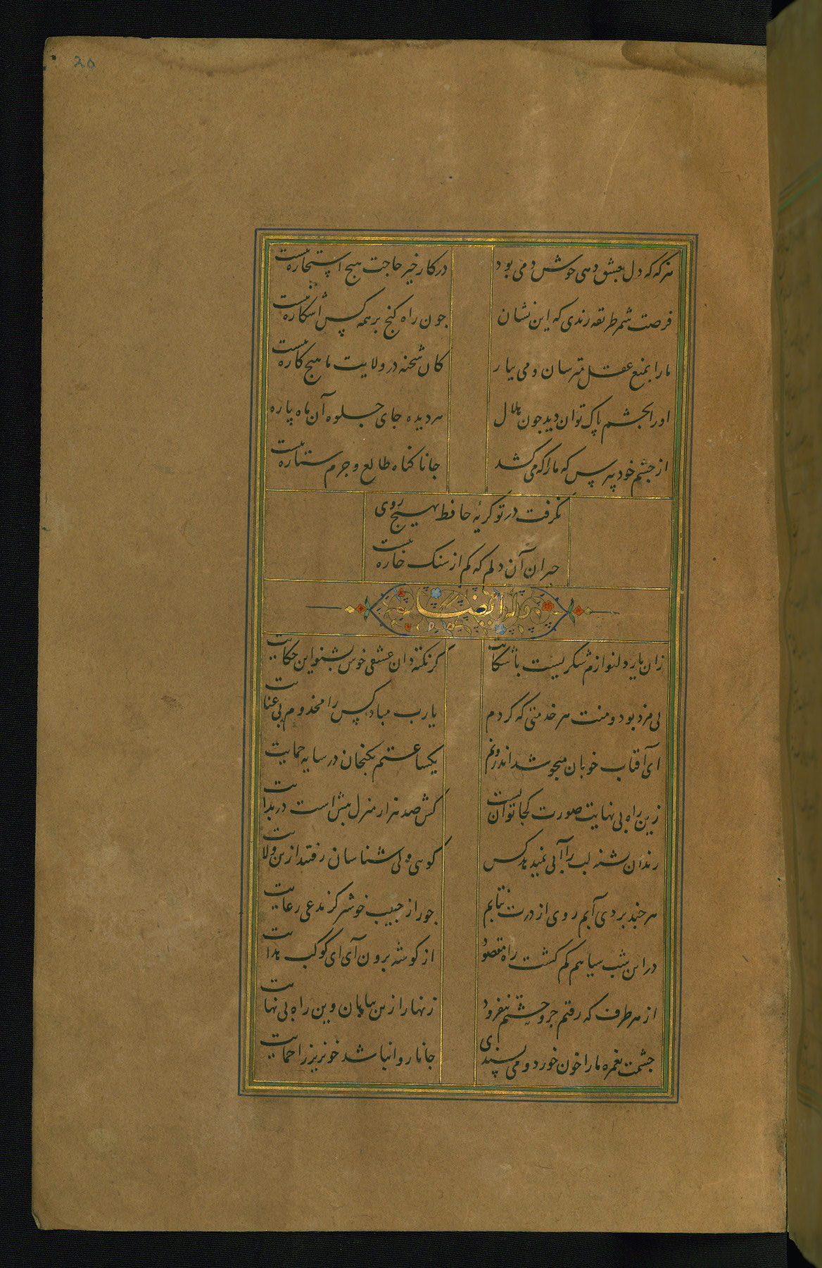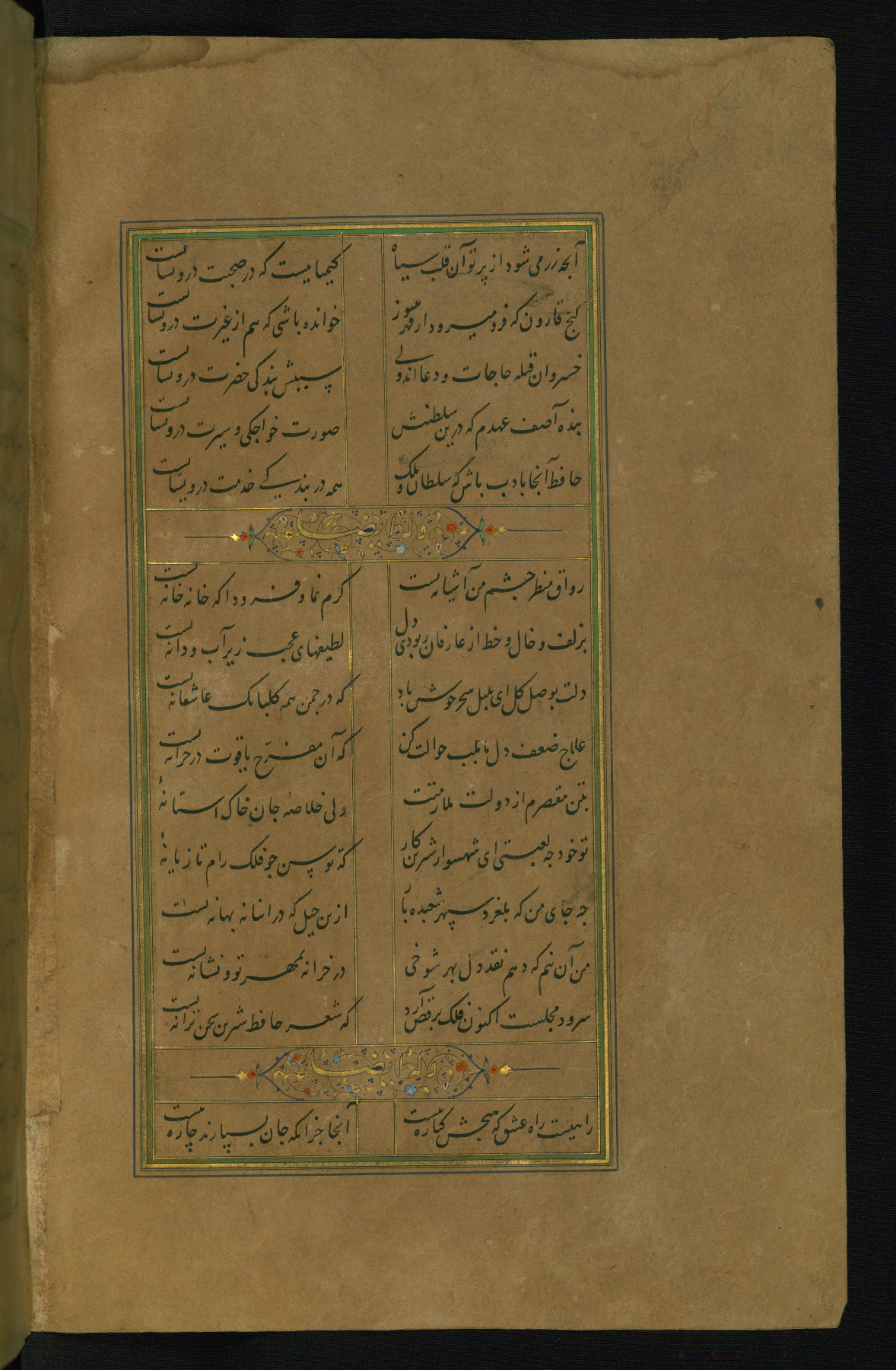 This is an illuminated and illustrated manuscript copy of the Collection of poems (dīvān) by Shams al-Dīn Muḥammad Ḥāfiz al-Shīrāzī (fl. eighth century AH / fourteenth CE). It was written in black nasta‘līq script with chapter/section headings in gold ink by Zayn al-‘Ābidīn ‘Abd al-Raḥmān al-Jāmī in 918 AH / 1512 CE in Safavid Iran. The manuscript opens with an illuminated medallion (fol. 1a), followed by a double-page illustrated frontispiece (fols. 1b-2a). The text begins with an incipit page with illuminated headpiece (fol. 2b). There are three additional illustrations (fols. 24a, 49b, and 87a). The red leather binding, which is not original and may be attributed to late twelfth-century AH / eighteenth CE or thirteenth-century AH / nineteenth CE Turkey, has a scalloped medallion with gold-tooled decoration and borders.