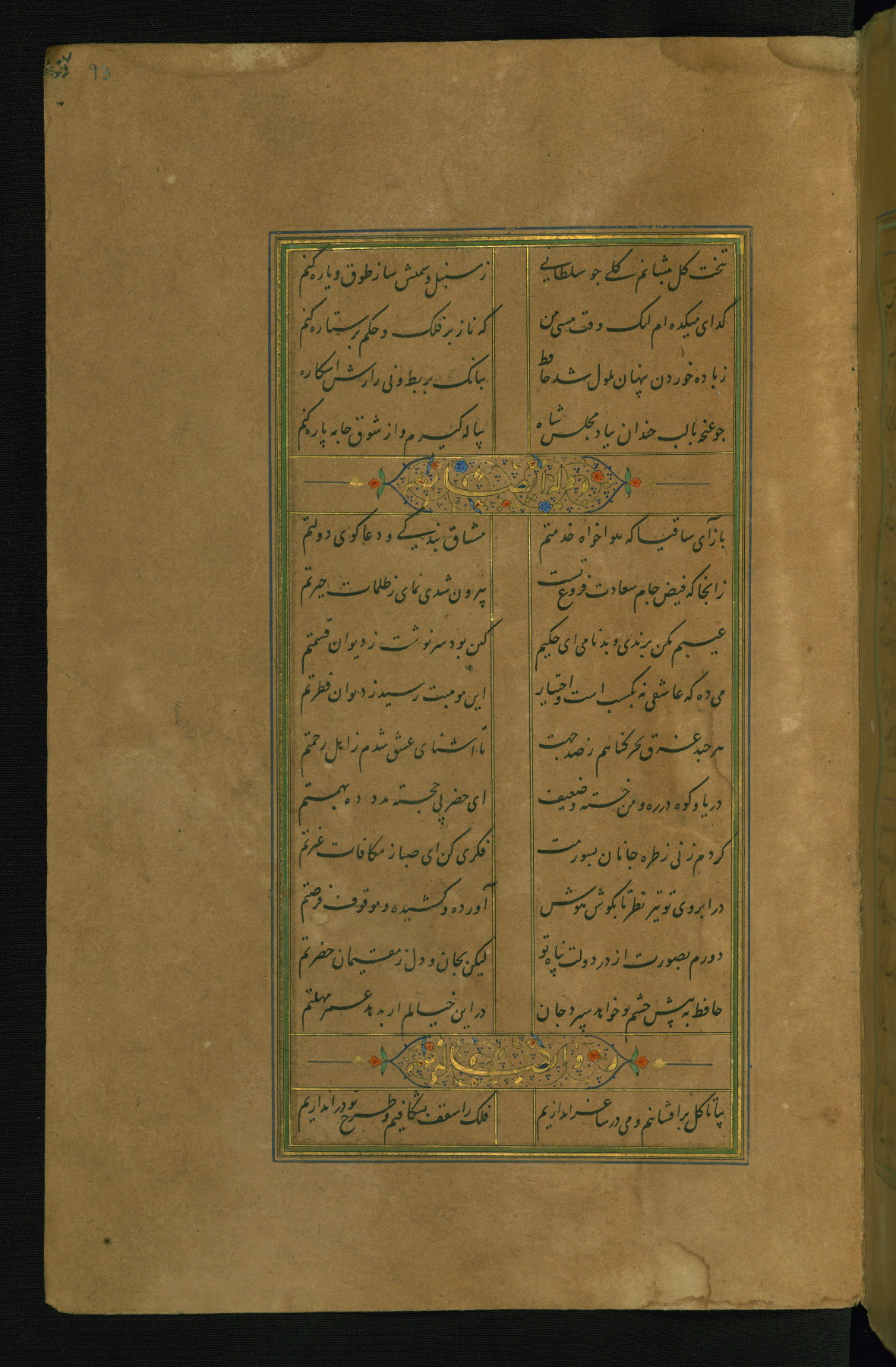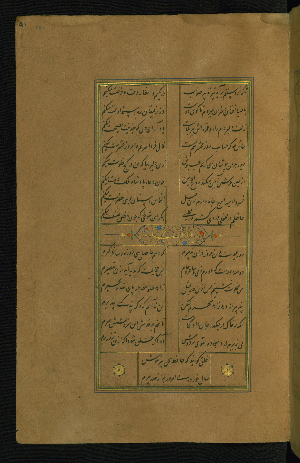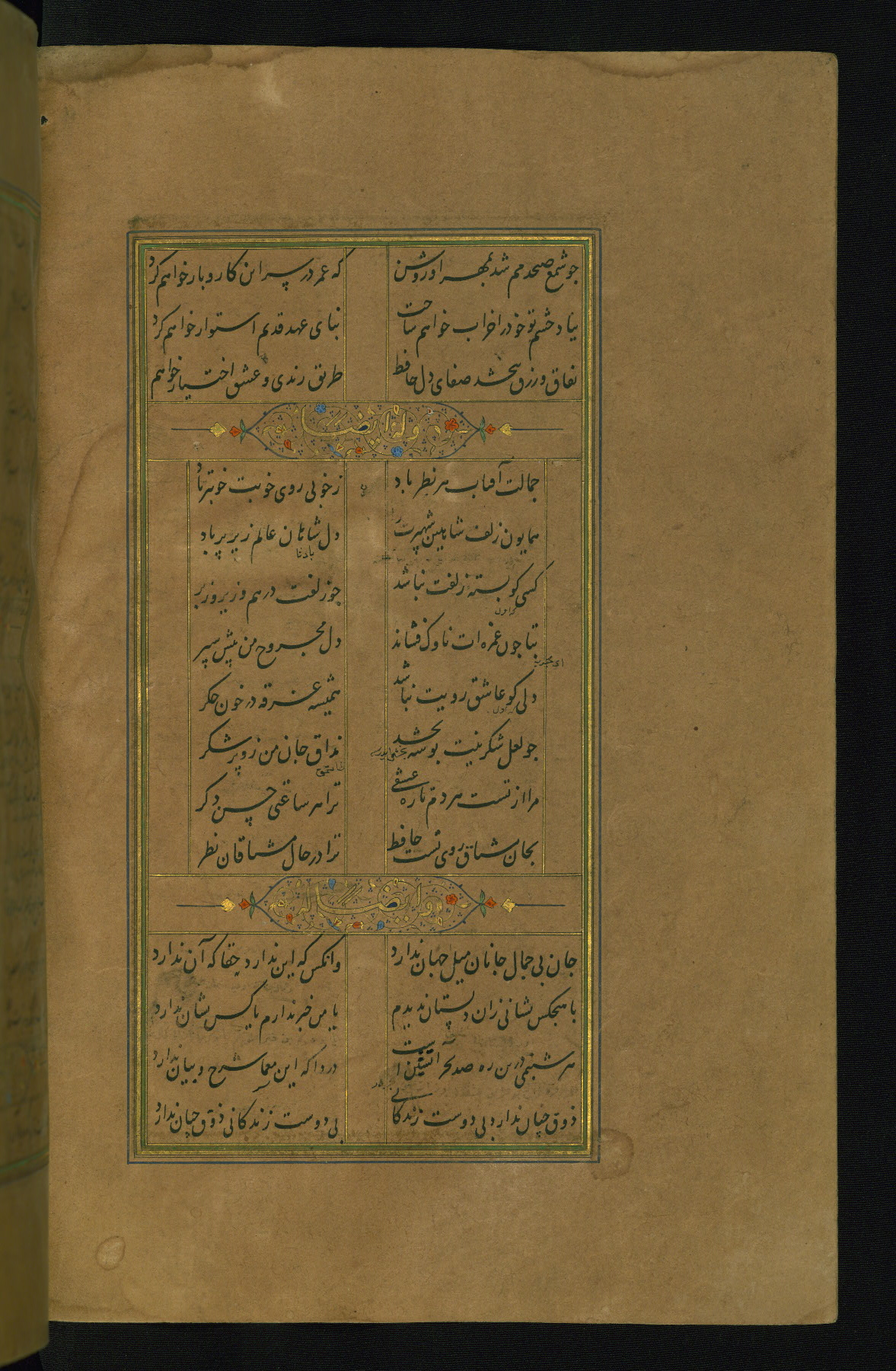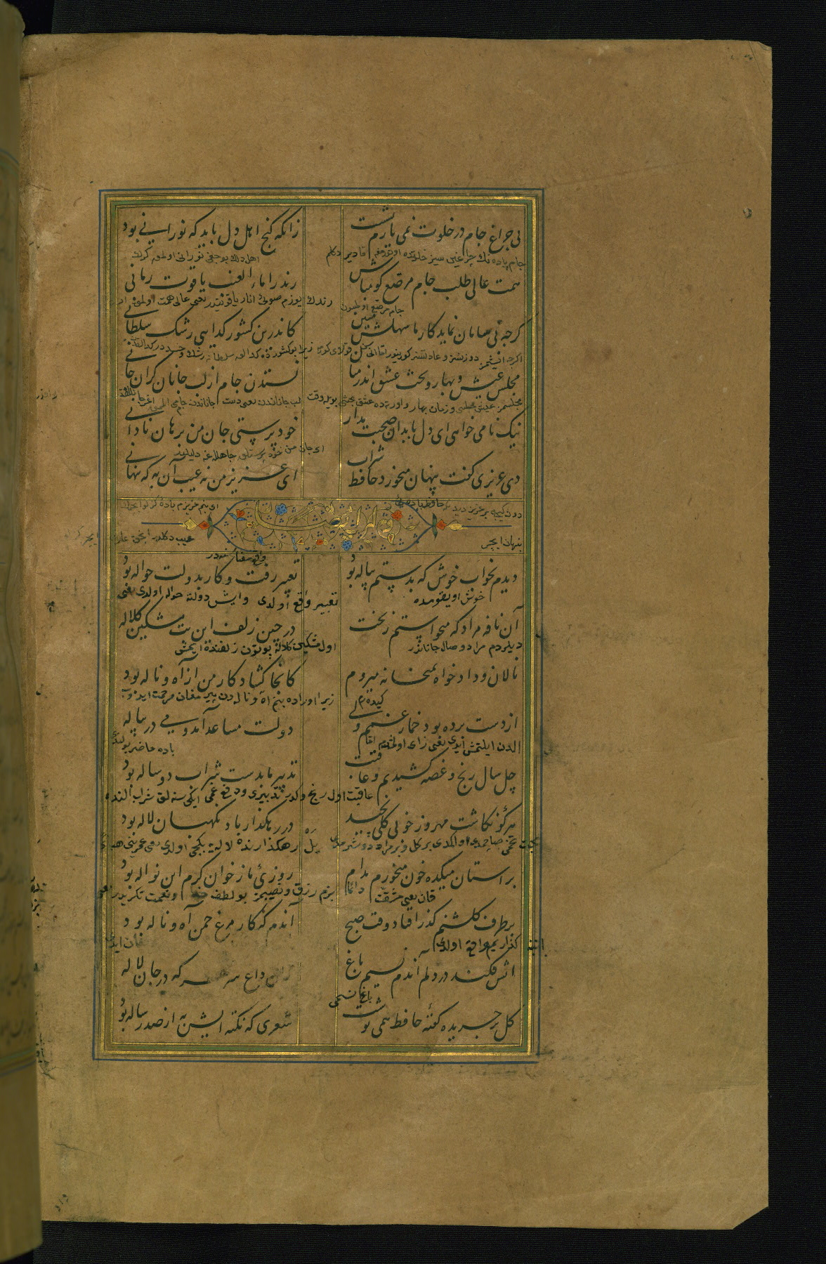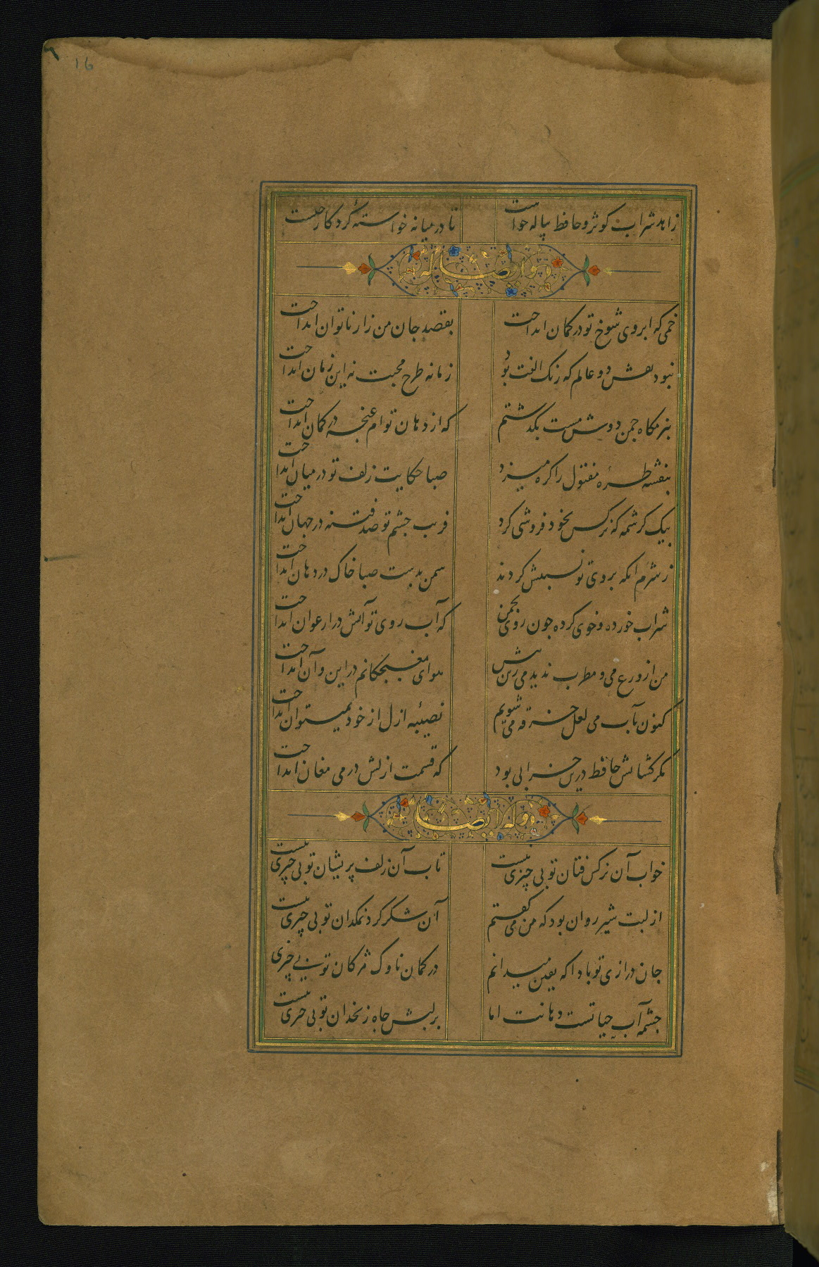 This is an illuminated and illustrated manuscript copy of the Collection of poems (dīvān) by Shams al-Dīn Muḥammad Ḥāfiz al-Shīrāzī (fl. eighth century AH / fourteenth CE). It was written in black nasta‘līq script with chapter/section headings in gold ink by Zayn al-‘Ābidīn ‘Abd al-Raḥmān al-Jāmī in 918 AH / 1512 CE in Safavid Iran. The manuscript opens with an illuminated medallion (fol. 1a), followed by a double-page illustrated frontispiece (fols. 1b-2a). The text begins with an incipit page with illuminated headpiece (fol. 2b). There are three additional illustrations (fols. 24a, 49b, and 87a). The red leather binding, which is not original and may be attributed to late twelfth-century AH / eighteenth CE or thirteenth-century AH / nineteenth CE Turkey, has a scalloped medallion with gold-tooled decoration and borders.