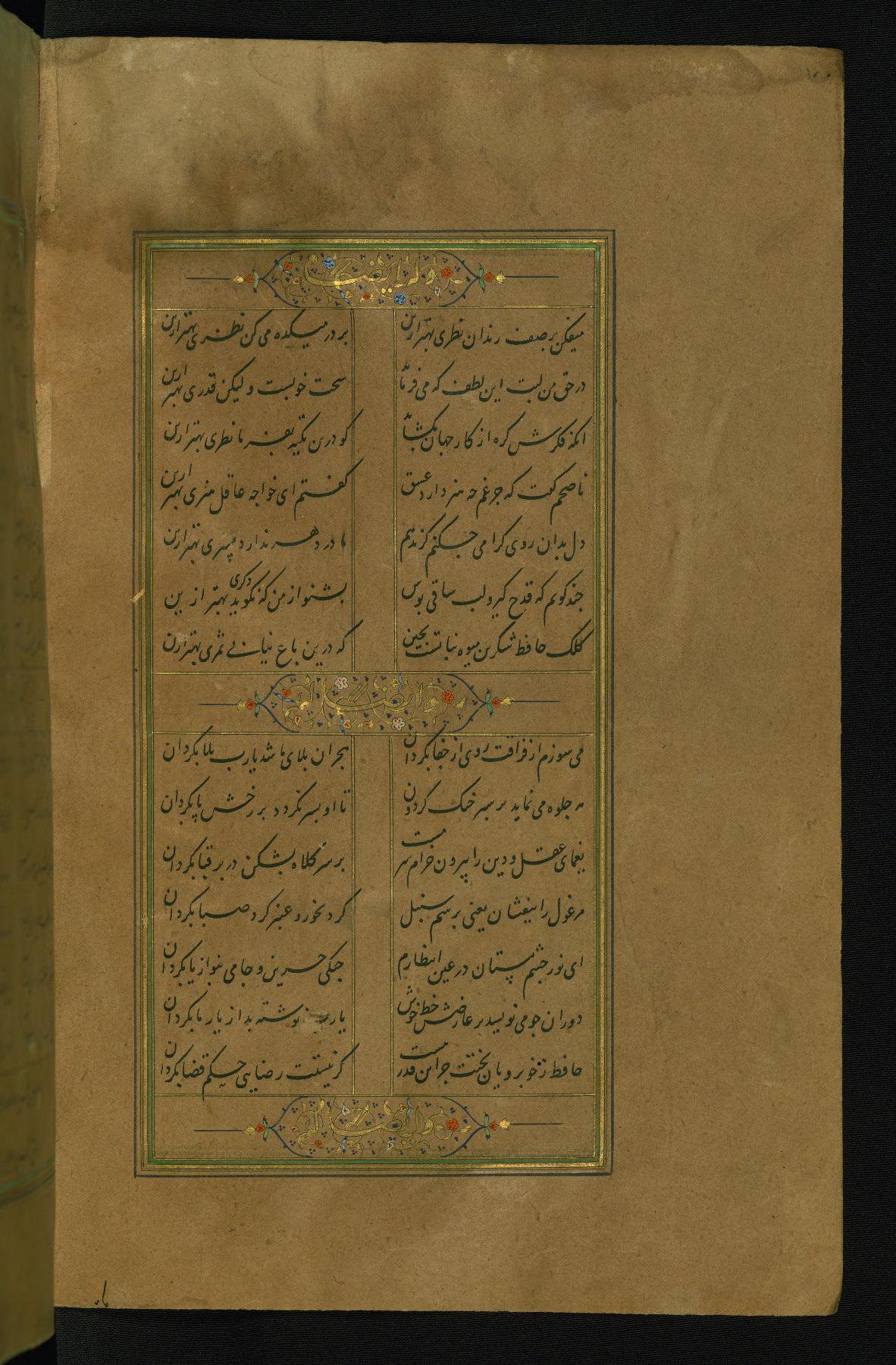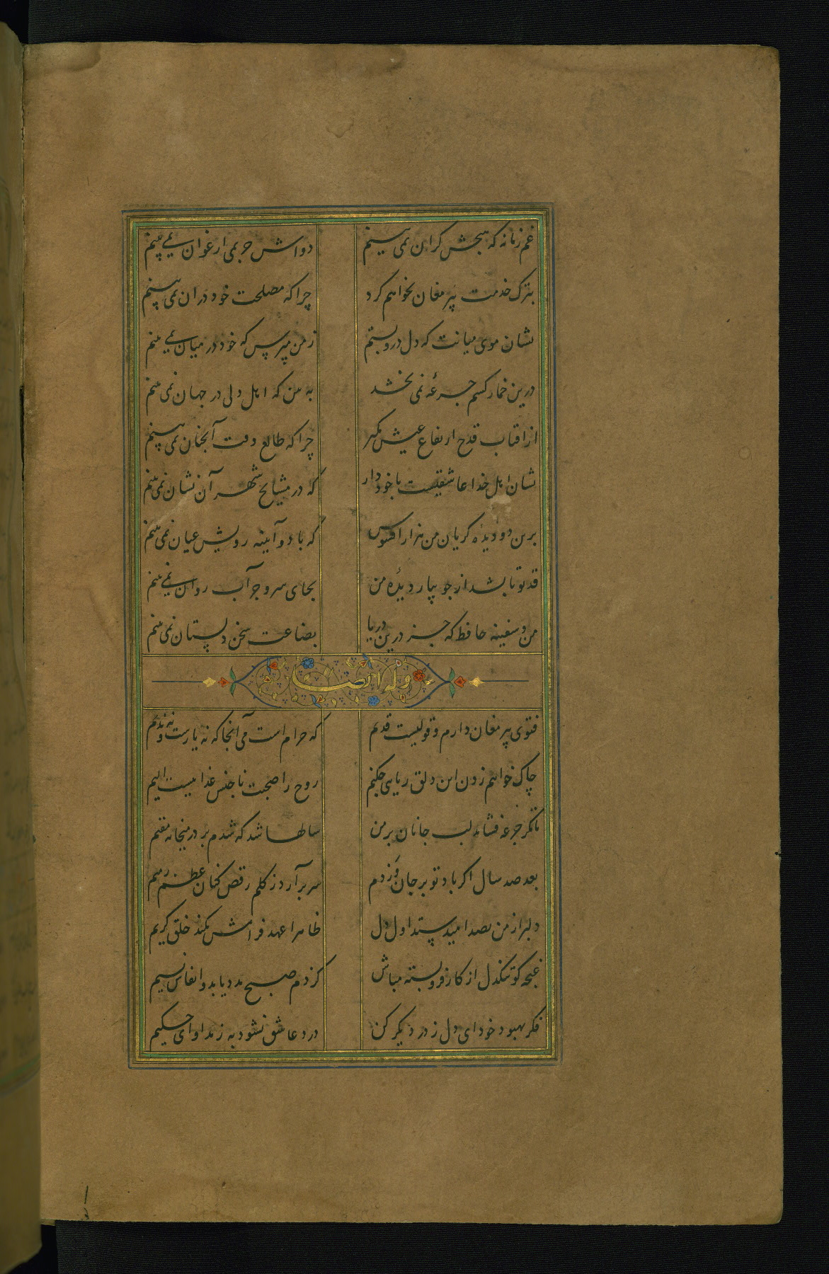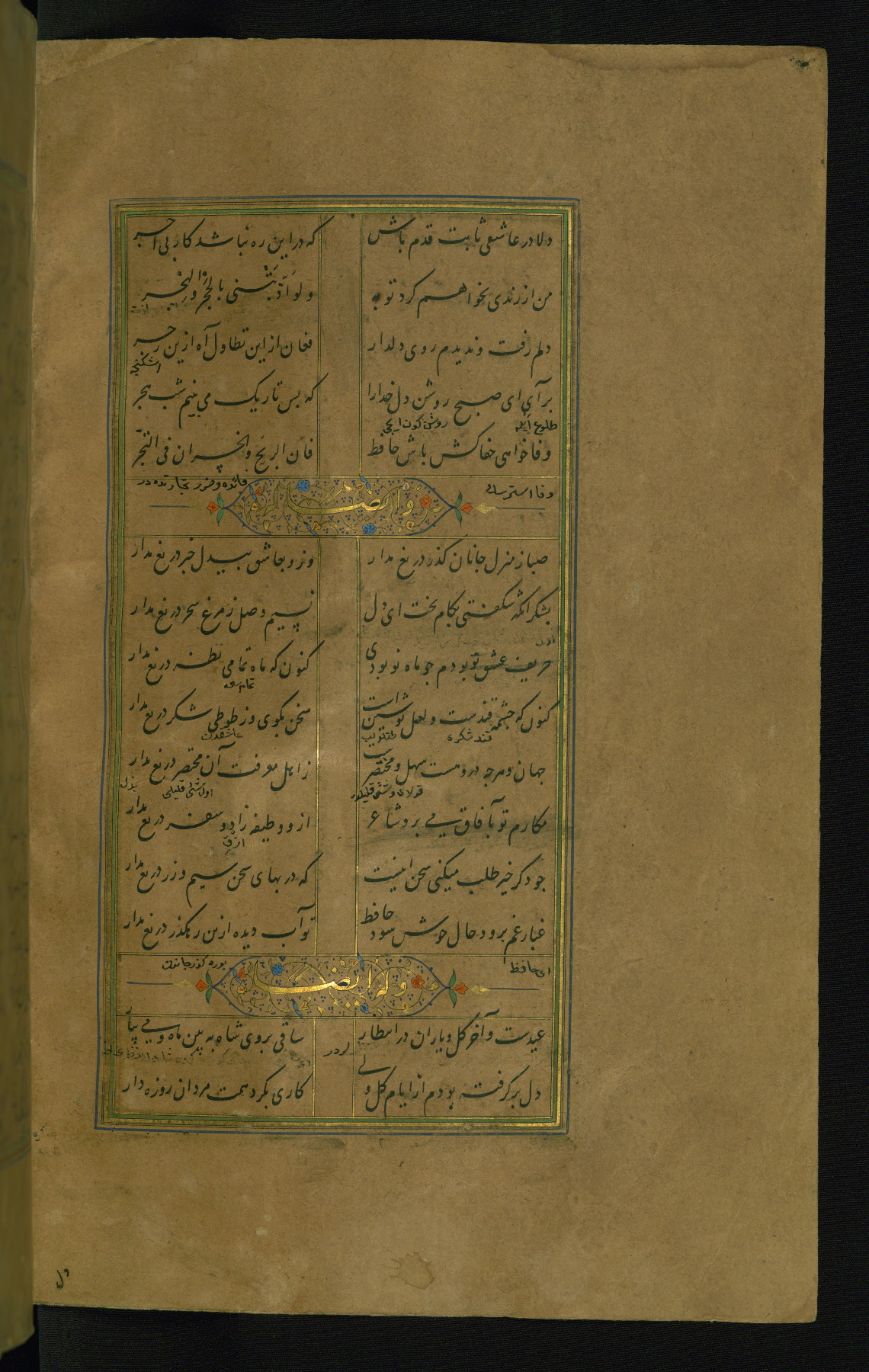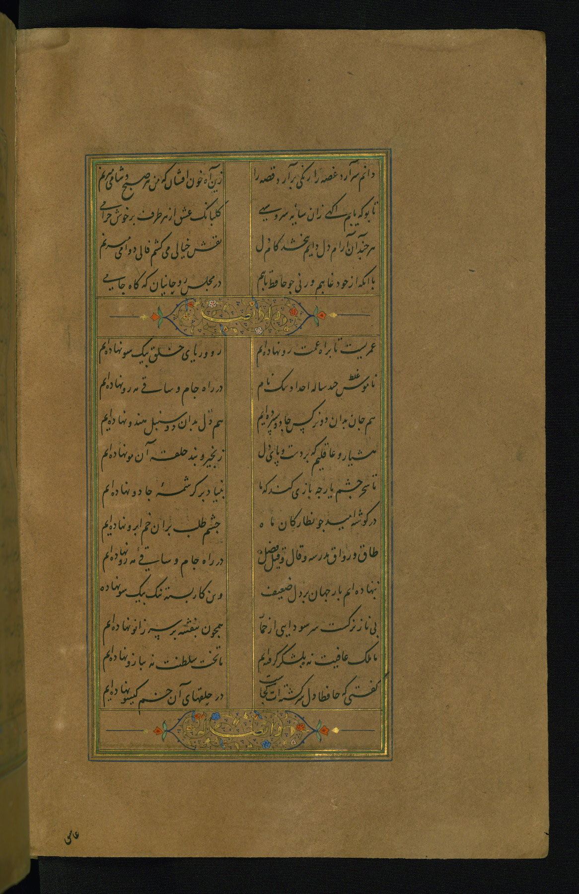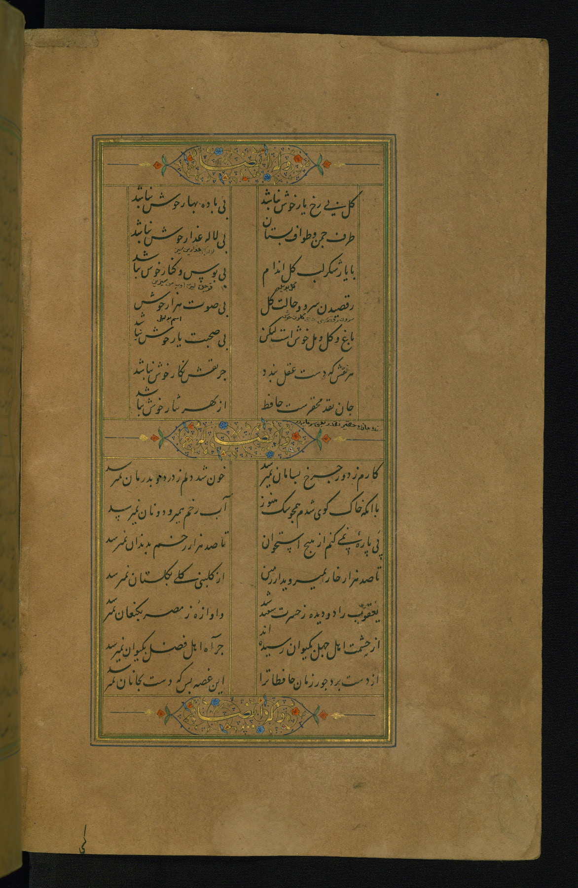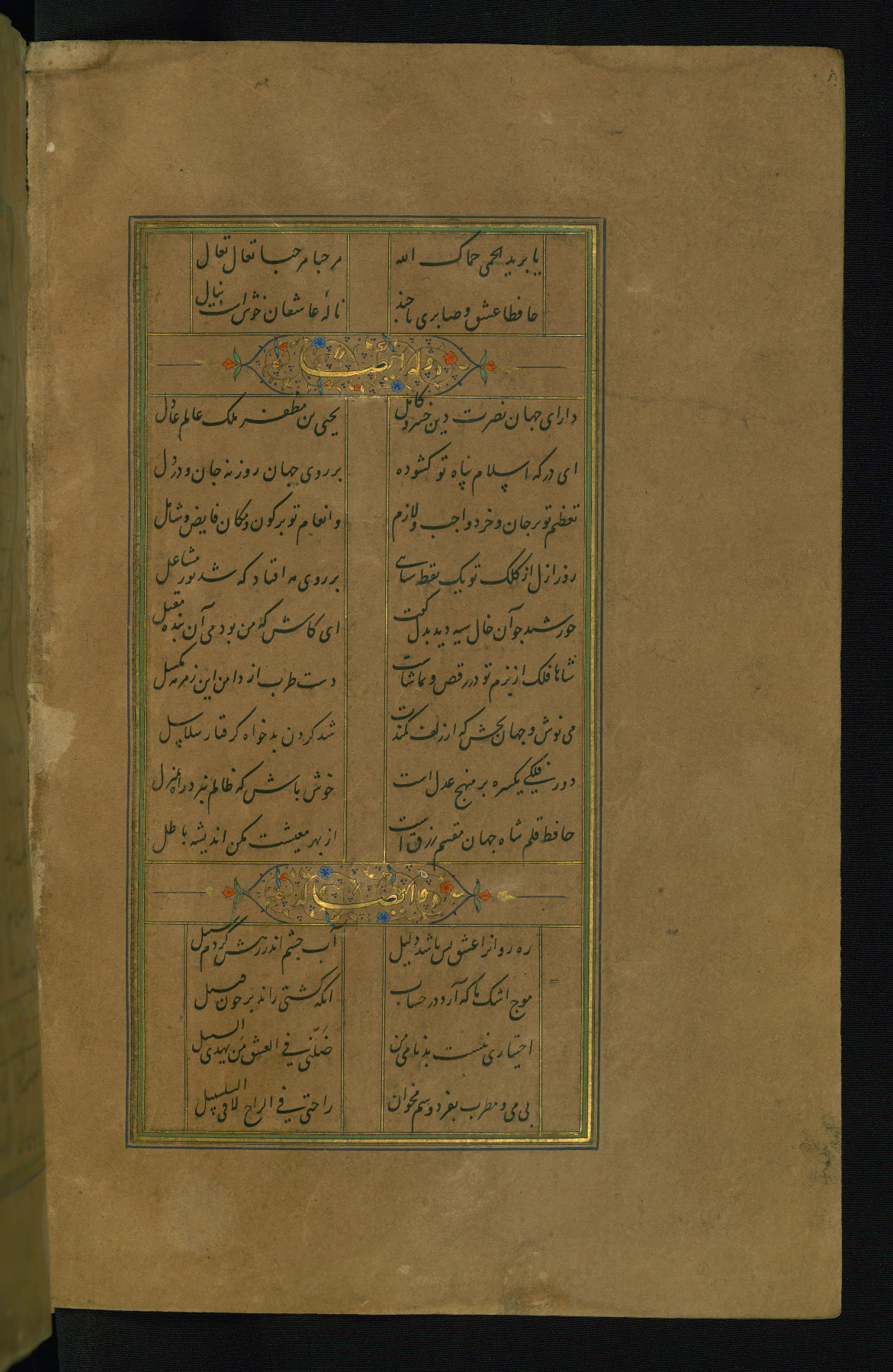 This is an illuminated and illustrated manuscript copy of the Collection of poems (dīvān) by Shams al-Dīn Muḥammad Ḥāfiz al-Shīrāzī (fl. eighth century AH / fourteenth CE). It was written in black nasta‘līq script with chapter/section headings in gold ink by Zayn al-‘Ābidīn ‘Abd al-Raḥmān al-Jāmī in 918 AH / 1512 CE in Safavid Iran. The manuscript opens with an illuminated medallion (fol. 1a), followed by a double-page illustrated frontispiece (fols. 1b-2a). The text begins with an incipit page with illuminated headpiece (fol. 2b). There are three additional illustrations (fols. 24a, 49b, and 87a). The red leather binding, which is not original and may be attributed to late twelfth-century AH / eighteenth CE or thirteenth-century AH / nineteenth CE Turkey, has a scalloped medallion with gold-tooled decoration and borders.