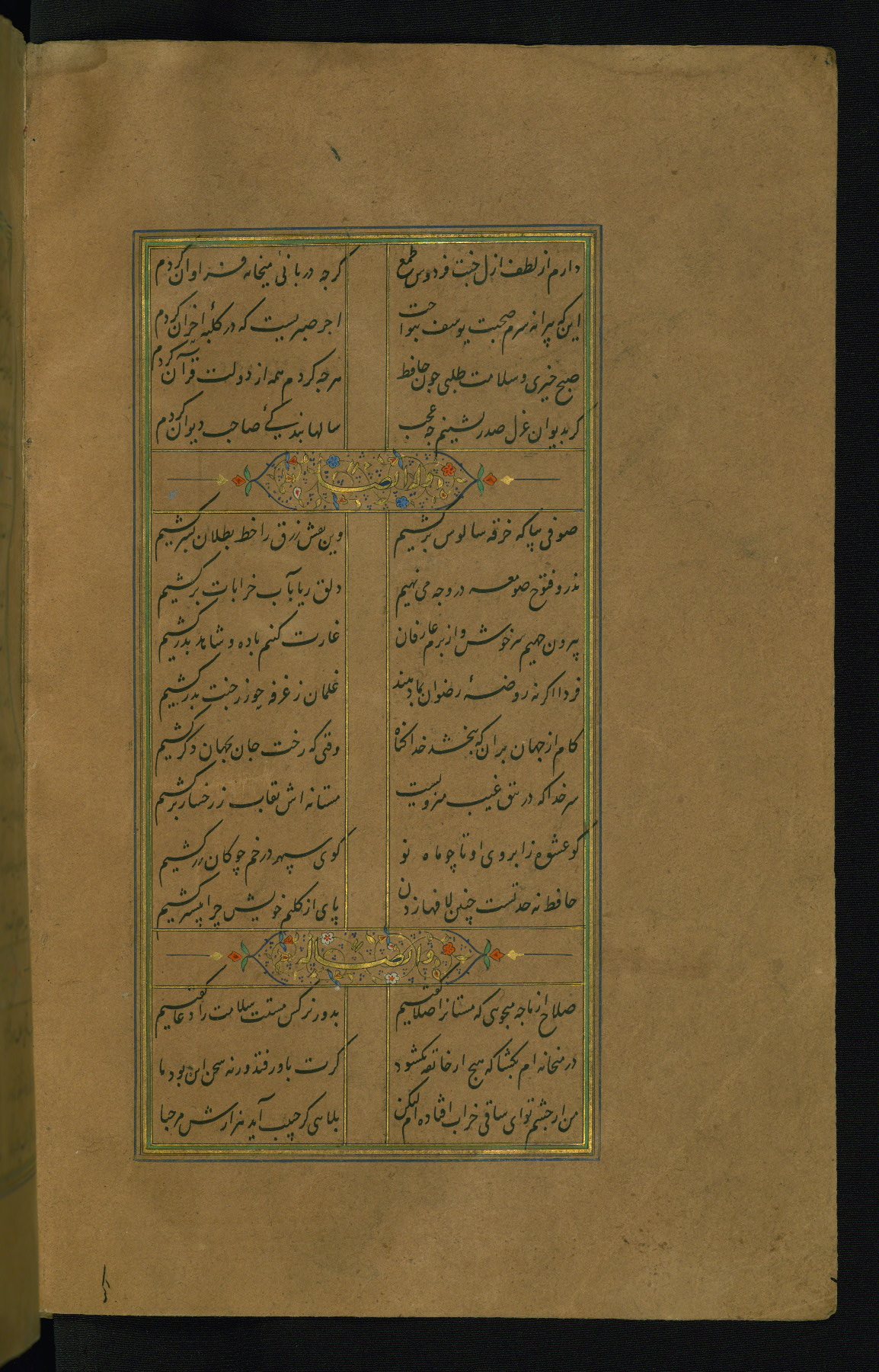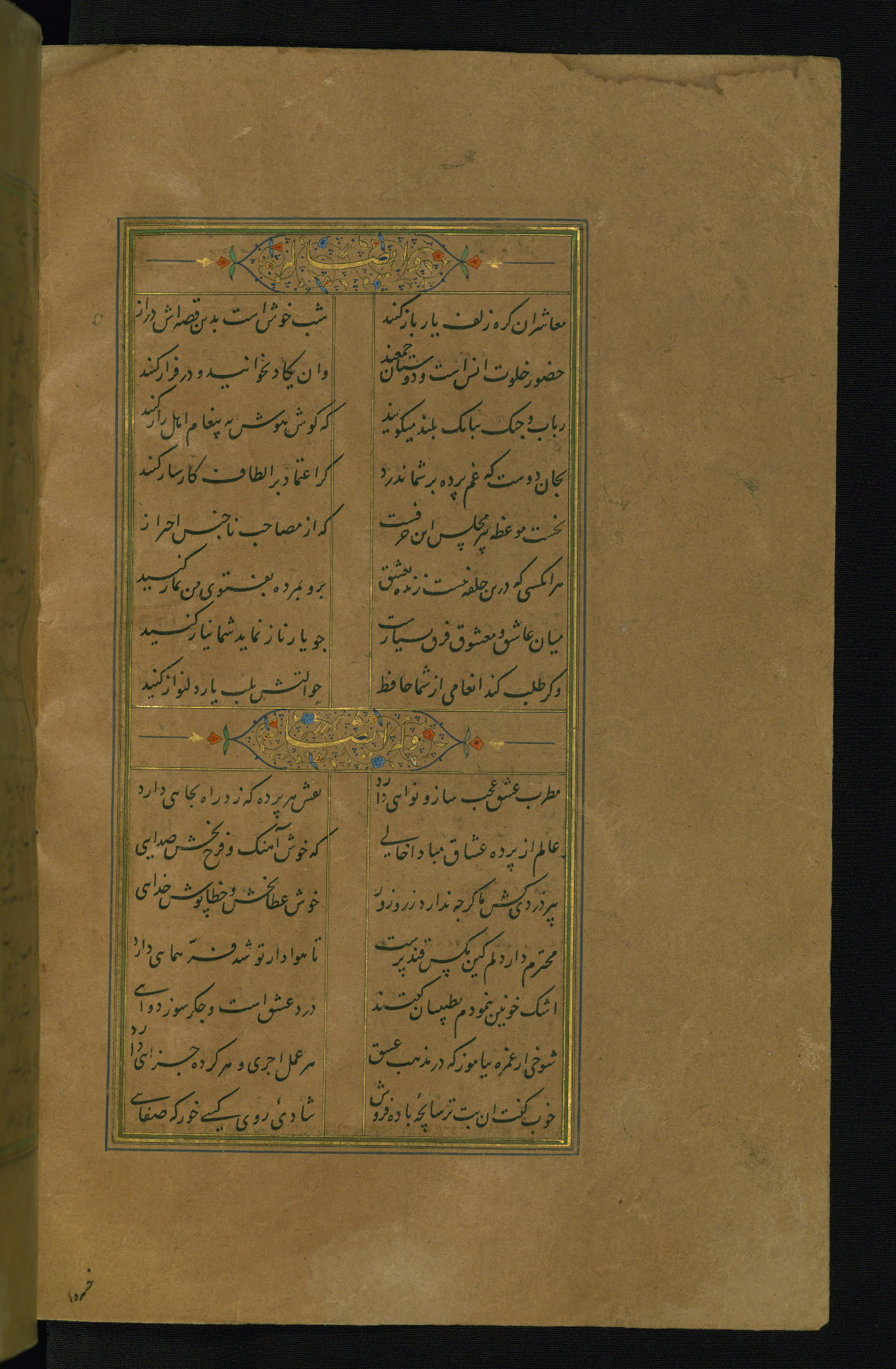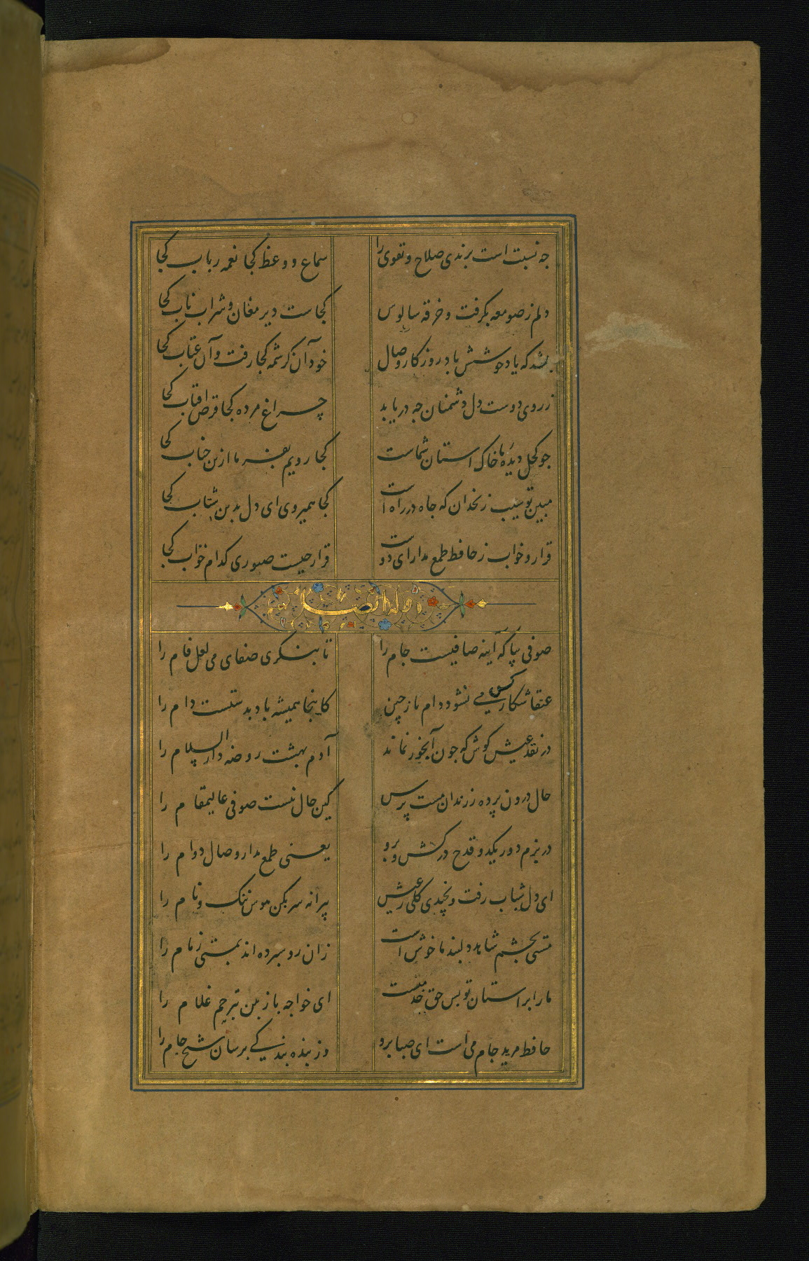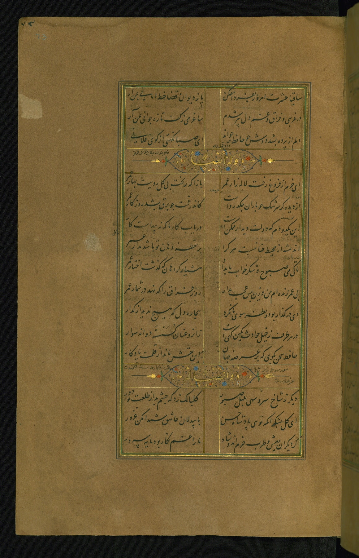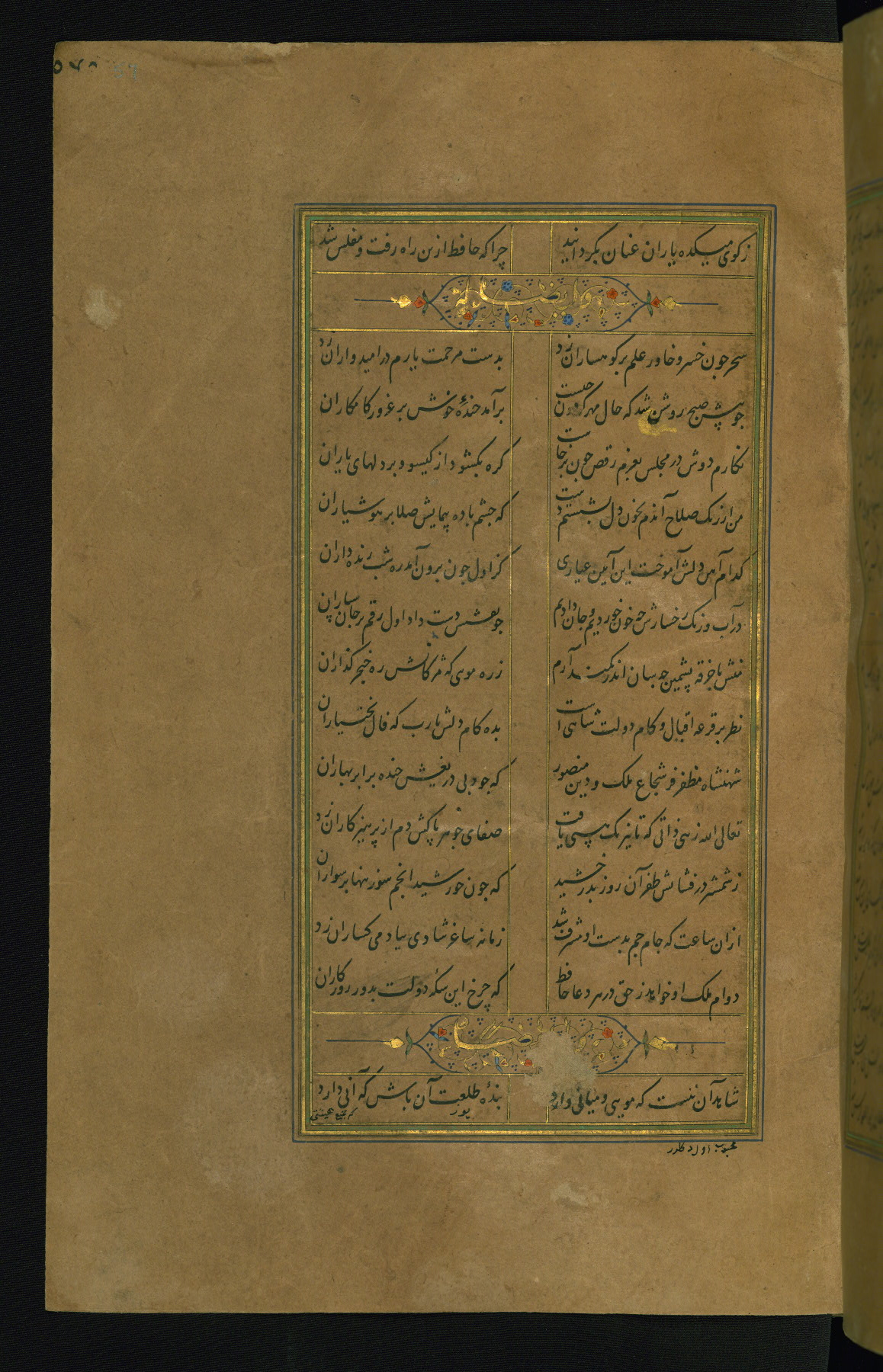 This is an illuminated and illustrated manuscript copy of the Collection of poems (dīvān) by Shams al-Dīn Muḥammad Ḥāfiz al-Shīrāzī (fl. eighth century AH / fourteenth CE). It was written in black nasta‘līq script with chapter/section headings in gold ink by Zayn al-‘Ābidīn ‘Abd al-Raḥmān al-Jāmī in 918 AH / 1512 CE in Safavid Iran. The manuscript opens with an illuminated medallion (fol. 1a), followed by a double-page illustrated frontispiece (fols. 1b-2a). The text begins with an incipit page with illuminated headpiece (fol. 2b). There are three additional illustrations (fols. 24a, 49b, and 87a). The red leather binding, which is not original and may be attributed to late twelfth-century AH / eighteenth CE or thirteenth-century AH / nineteenth CE Turkey, has a scalloped medallion with gold-tooled decoration and borders.