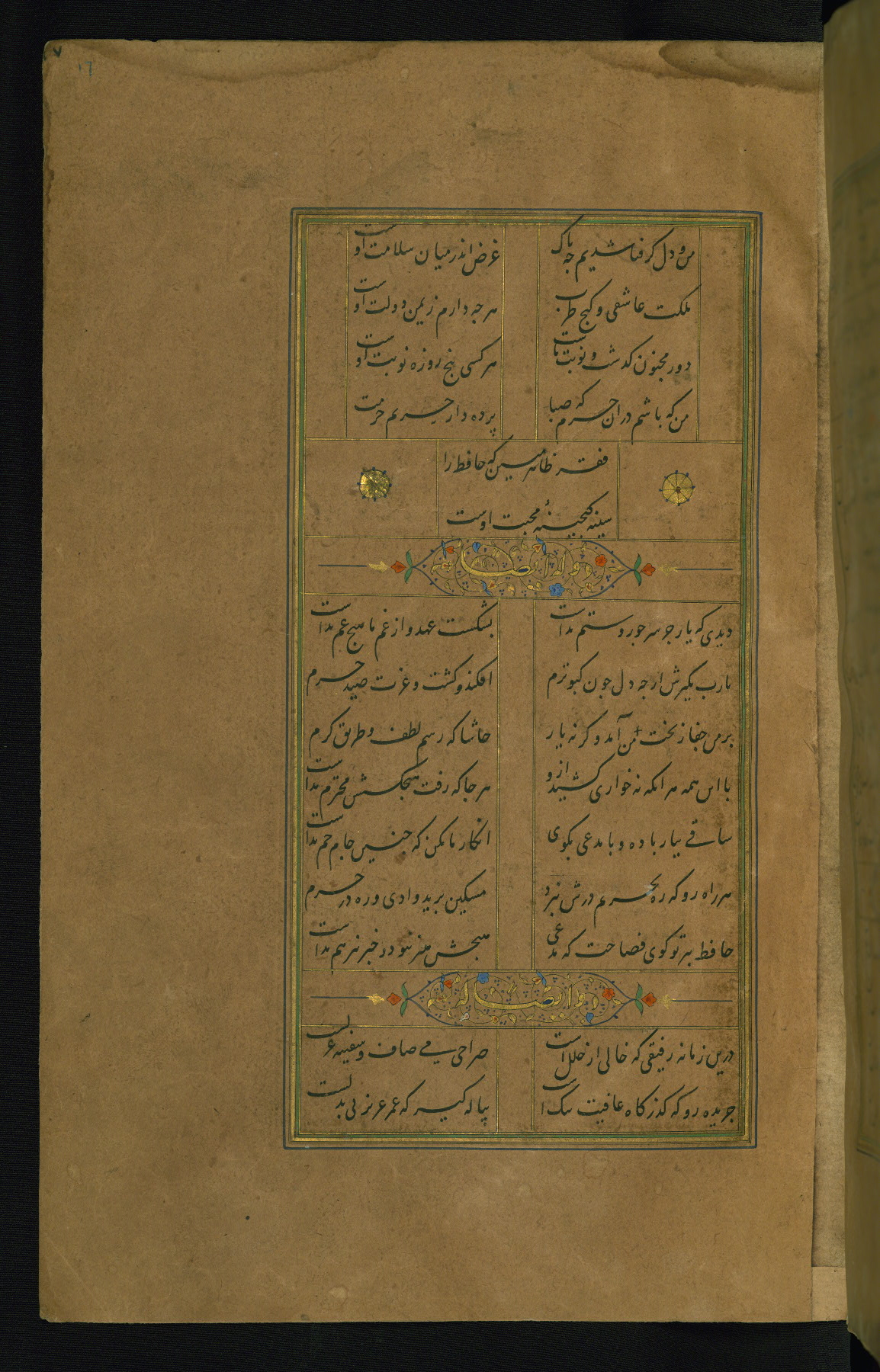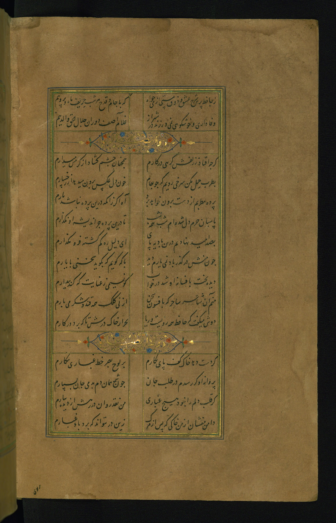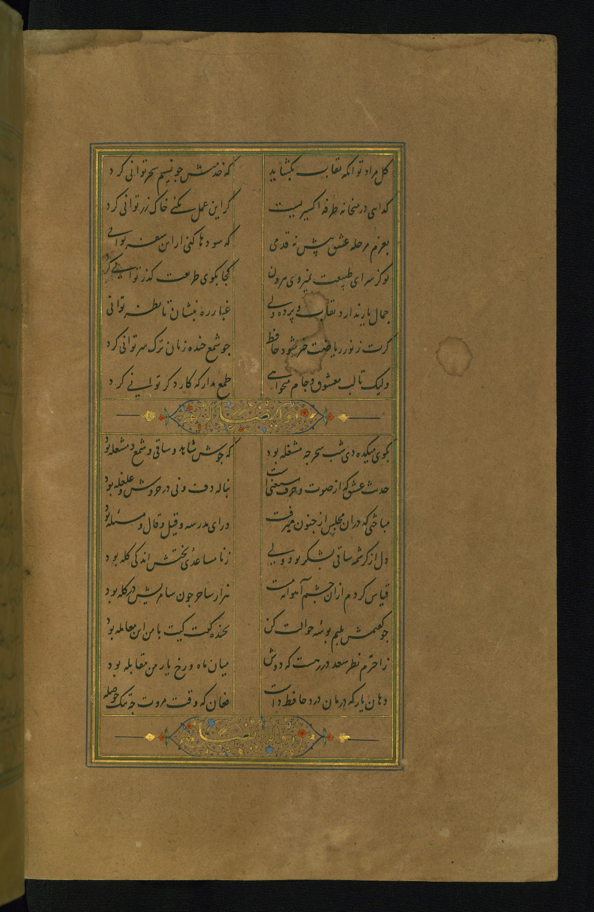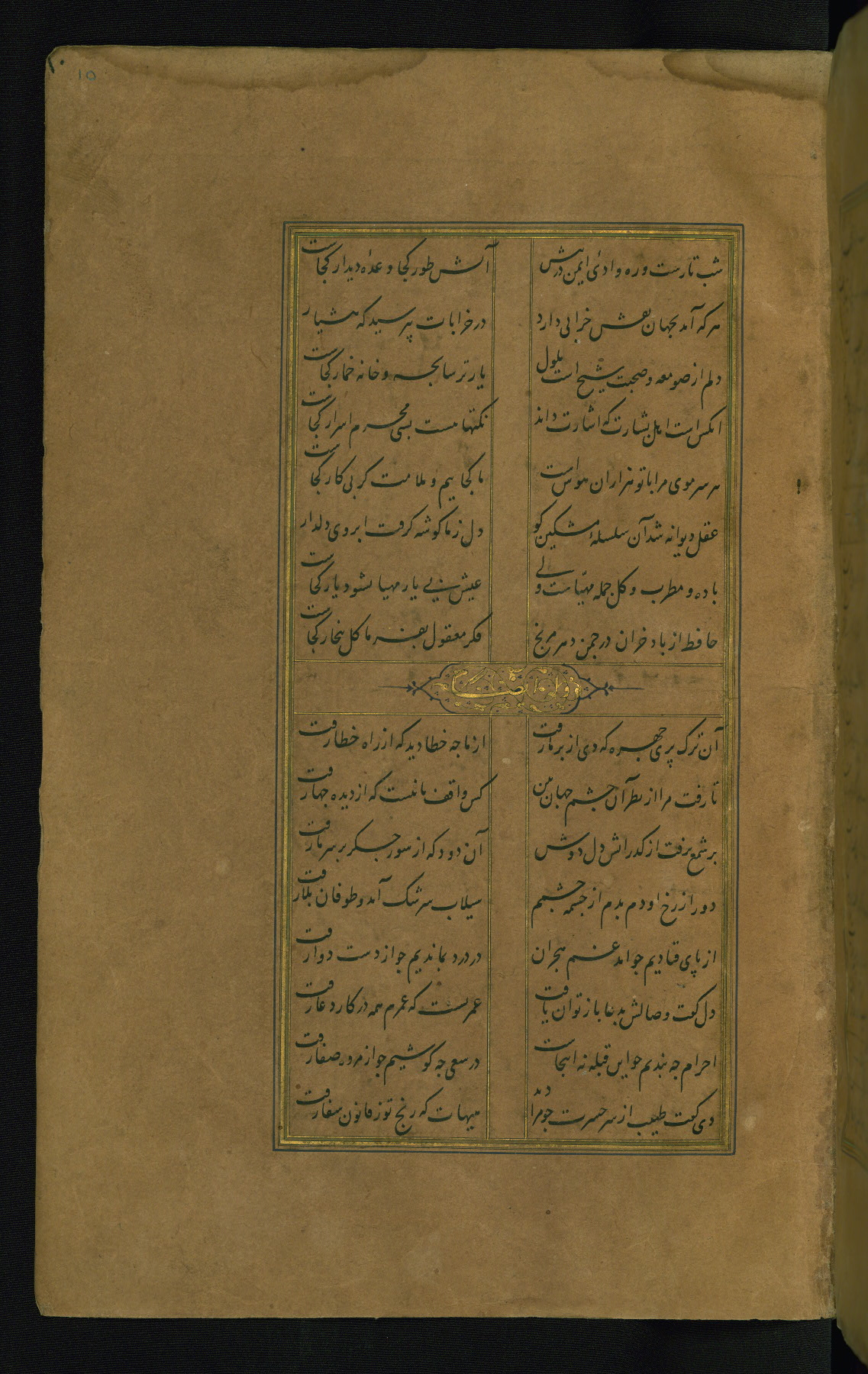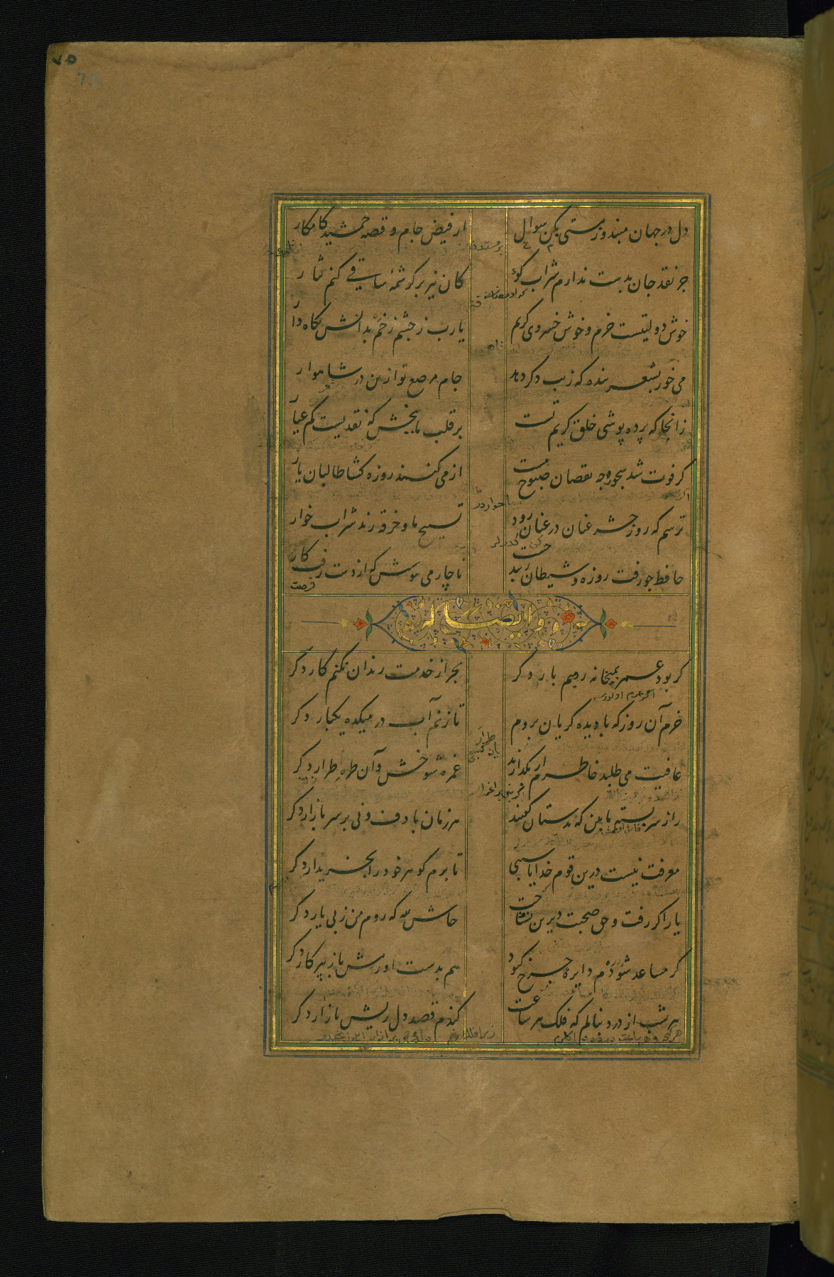 This is an illuminated and illustrated manuscript copy of the Collection of poems (dīvān) by Shams al-Dīn Muḥammad Ḥāfiz al-Shīrāzī (fl. eighth century AH / fourteenth CE). It was written in black nasta‘līq script with chapter/section headings in gold ink by Zayn al-‘Ābidīn ‘Abd al-Raḥmān al-Jāmī in 918 AH / 1512 CE in Safavid Iran. The manuscript opens with an illuminated medallion (fol. 1a), followed by a double-page illustrated frontispiece (fols. 1b-2a). The text begins with an incipit page with illuminated headpiece (fol. 2b). There are three additional illustrations (fols. 24a, 49b, and 87a). The red leather binding, which is not original and may be attributed to late twelfth-century AH / eighteenth CE or thirteenth-century AH / nineteenth CE Turkey, has a scalloped medallion with gold-tooled decoration and borders.