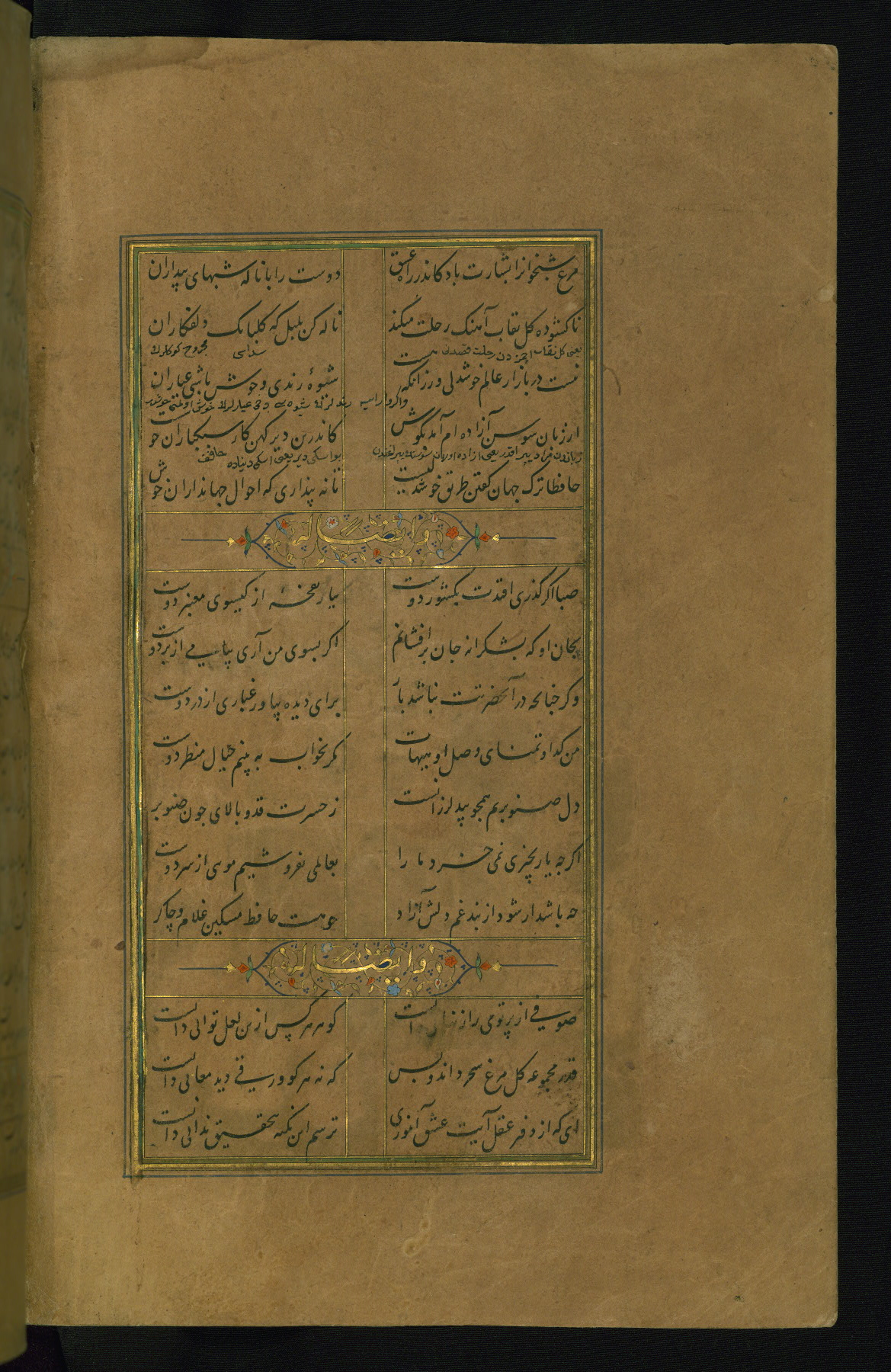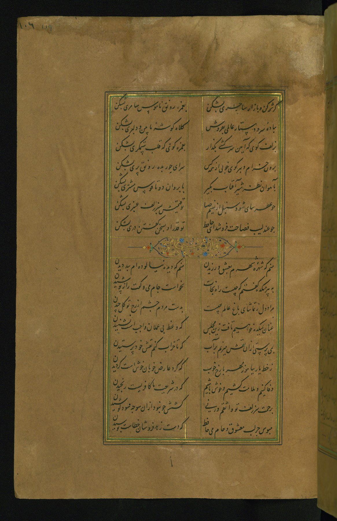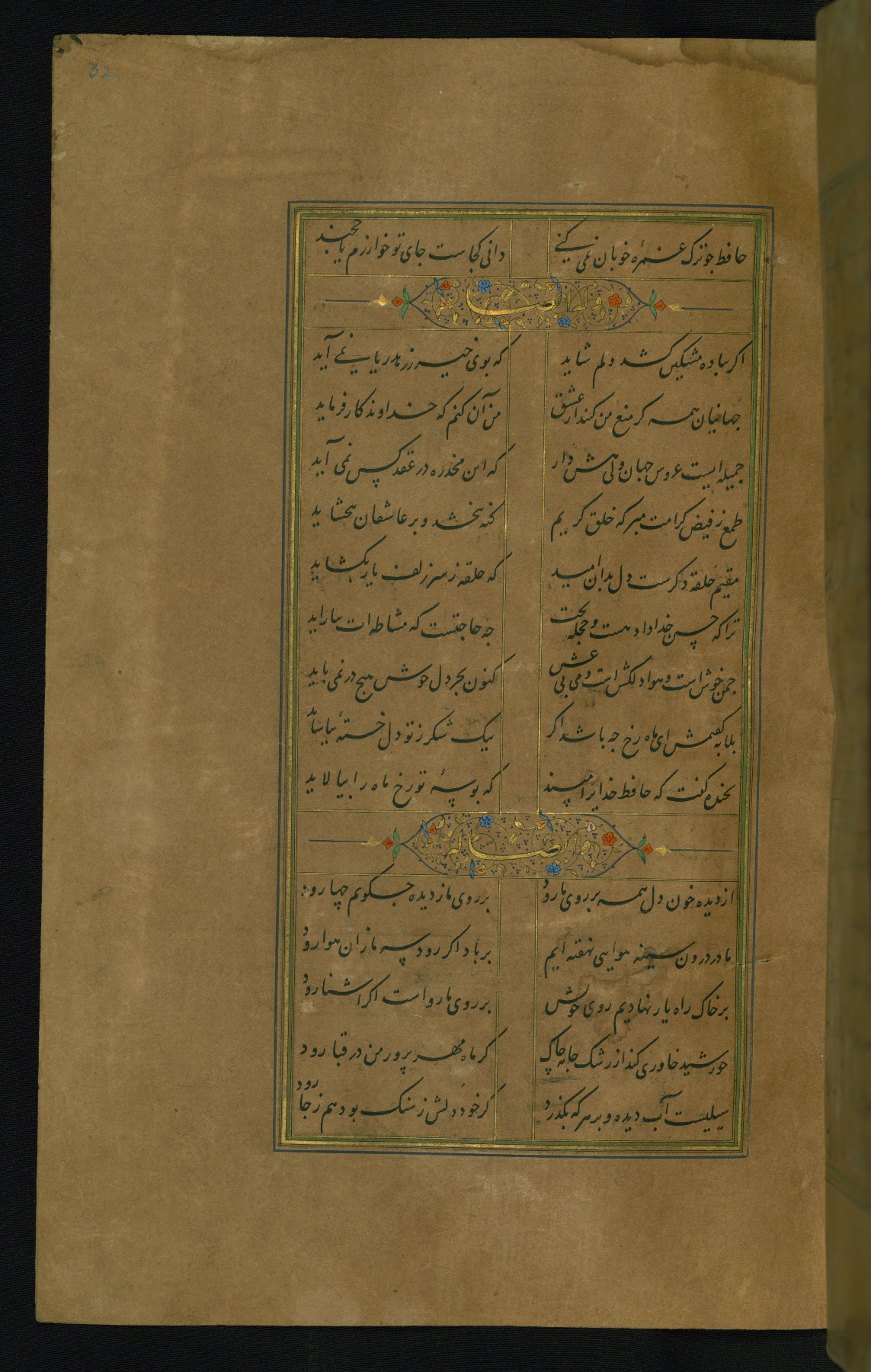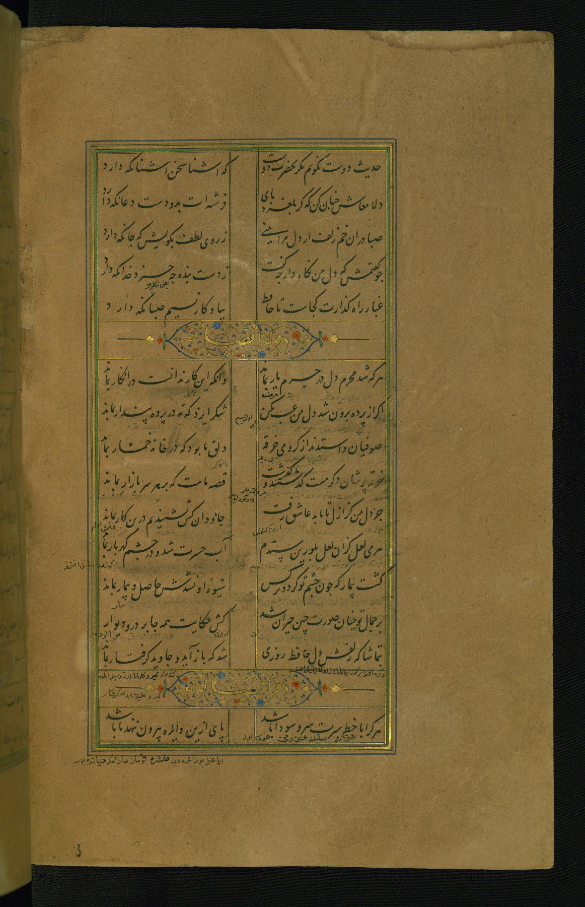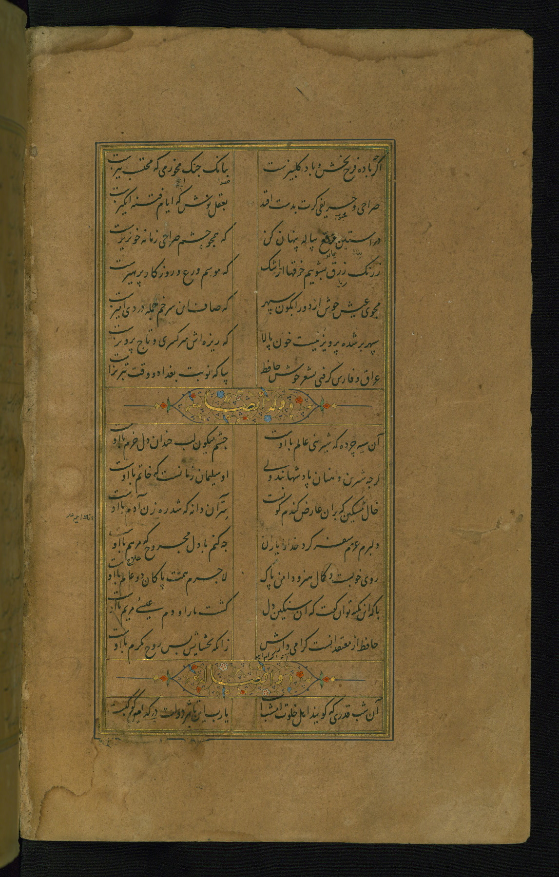 This is an illuminated and illustrated manuscript copy of the Collection of poems (dīvān) by Shams al-Dīn Muḥammad Ḥāfiz al-Shīrāzī (fl. eighth century AH / fourteenth CE). It was written in black nasta‘līq script with chapter/section headings in gold ink by Zayn al-‘Ābidīn ‘Abd al-Raḥmān al-Jāmī in 918 AH / 1512 CE in Safavid Iran. The manuscript opens with an illuminated medallion (fol. 1a), followed by a double-page illustrated frontispiece (fols. 1b-2a). The text begins with an incipit page with illuminated headpiece (fol. 2b). There are three additional illustrations (fols. 24a, 49b, and 87a). The red leather binding, which is not original and may be attributed to late twelfth-century AH / eighteenth CE or thirteenth-century AH / nineteenth CE Turkey, has a scalloped medallion with gold-tooled decoration and borders.