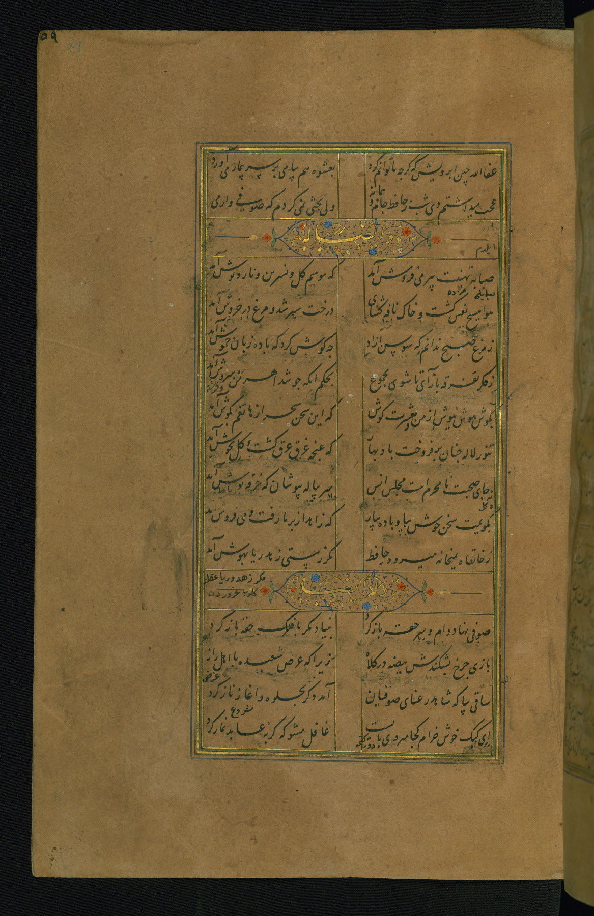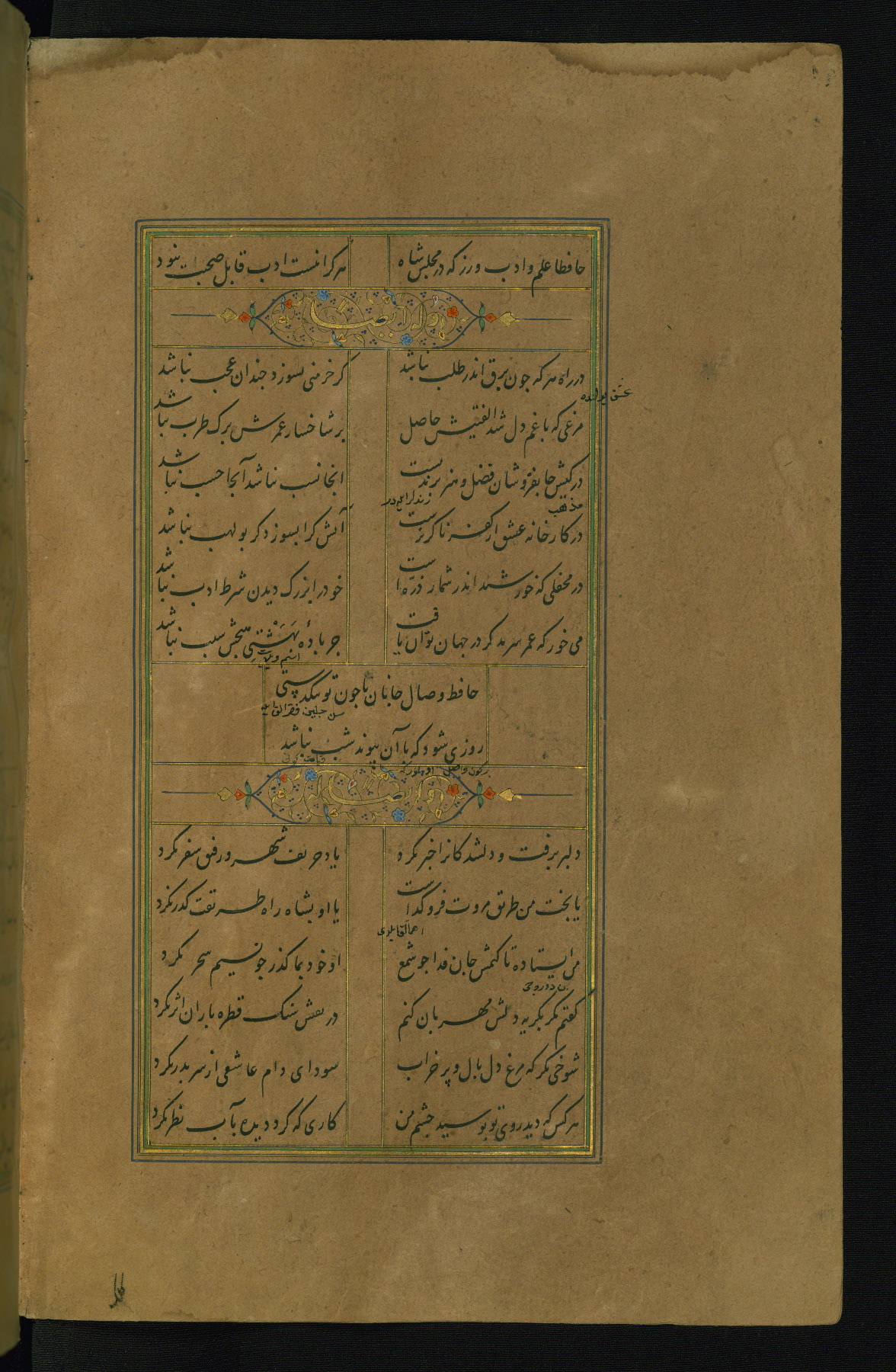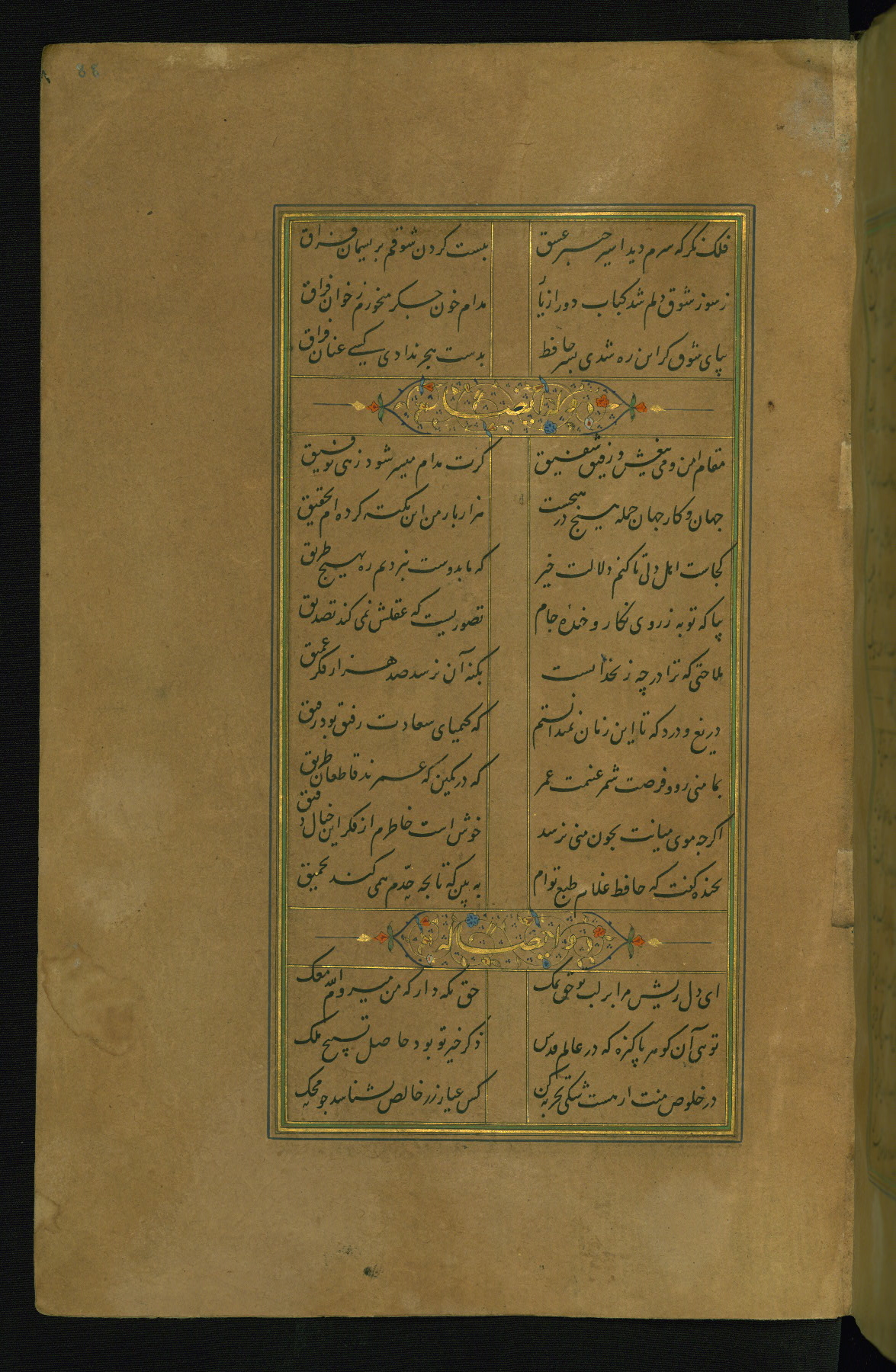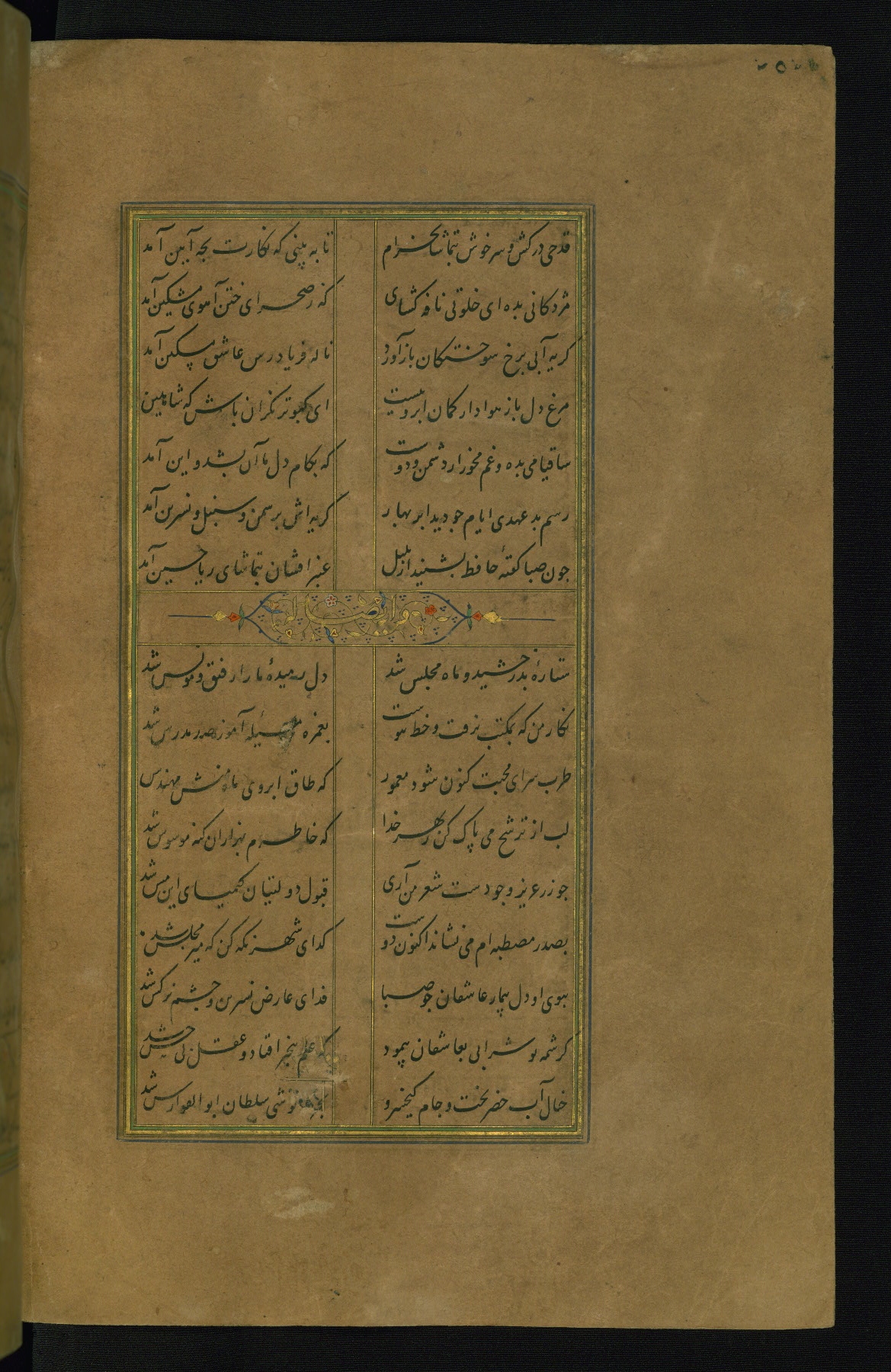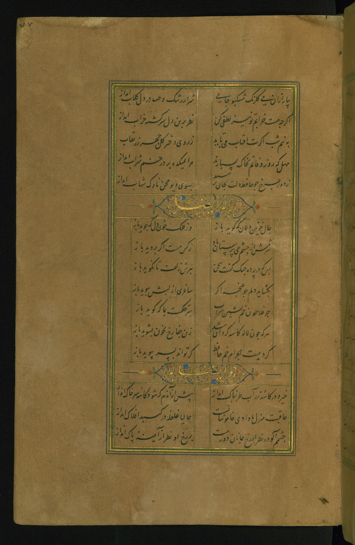 This is an illuminated and illustrated manuscript copy of the Collection of poems (dīvān) by Shams al-Dīn Muḥammad Ḥāfiz al-Shīrāzī (fl. eighth century AH / fourteenth CE). It was written in black nasta‘līq script with chapter/section headings in gold ink by Zayn al-‘Ābidīn ‘Abd al-Raḥmān al-Jāmī in 918 AH / 1512 CE in Safavid Iran. The manuscript opens with an illuminated medallion (fol. 1a), followed by a double-page illustrated frontispiece (fols. 1b-2a). The text begins with an incipit page with illuminated headpiece (fol. 2b). There are three additional illustrations (fols. 24a, 49b, and 87a). The red leather binding, which is not original and may be attributed to late twelfth-century AH / eighteenth CE or thirteenth-century AH / nineteenth CE Turkey, has a scalloped medallion with gold-tooled decoration and borders.