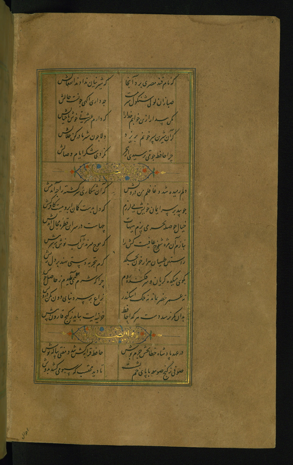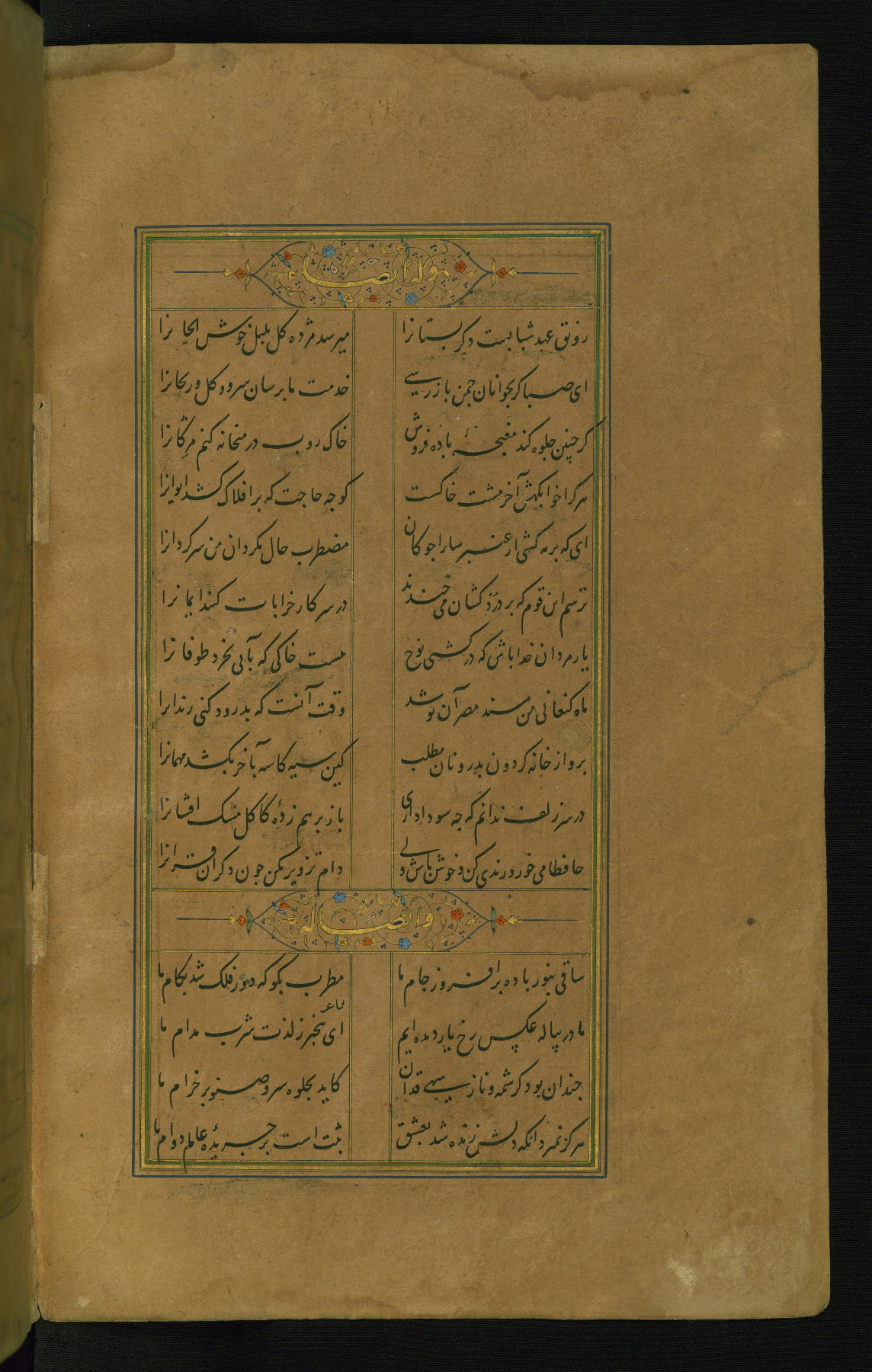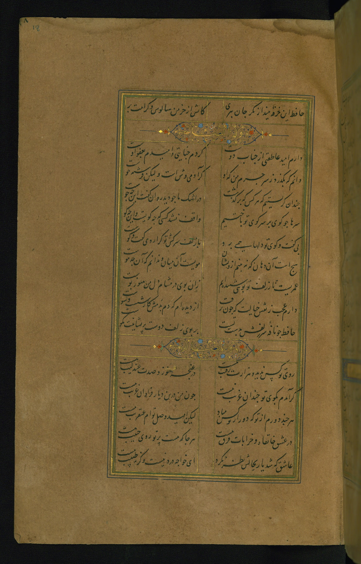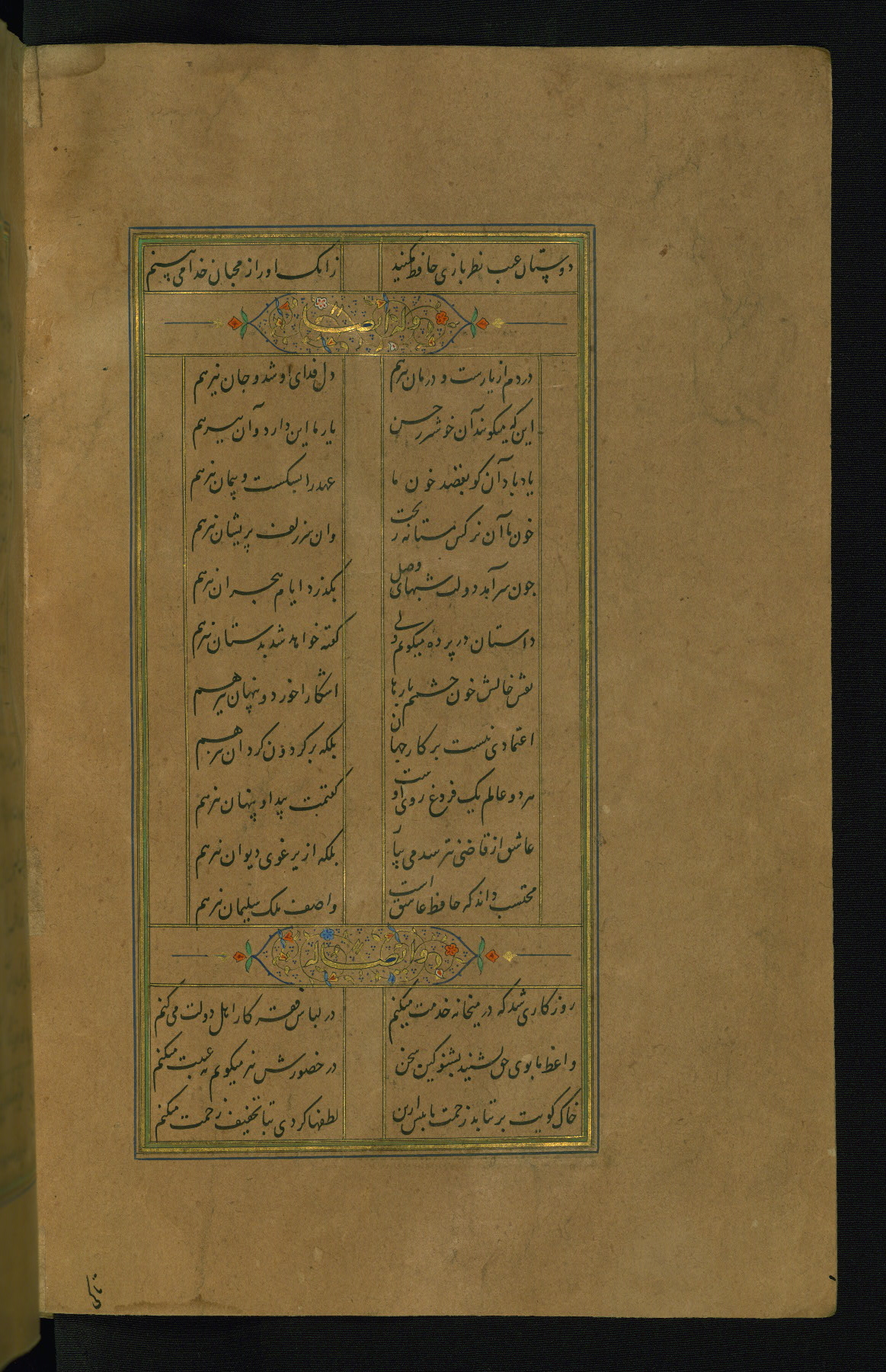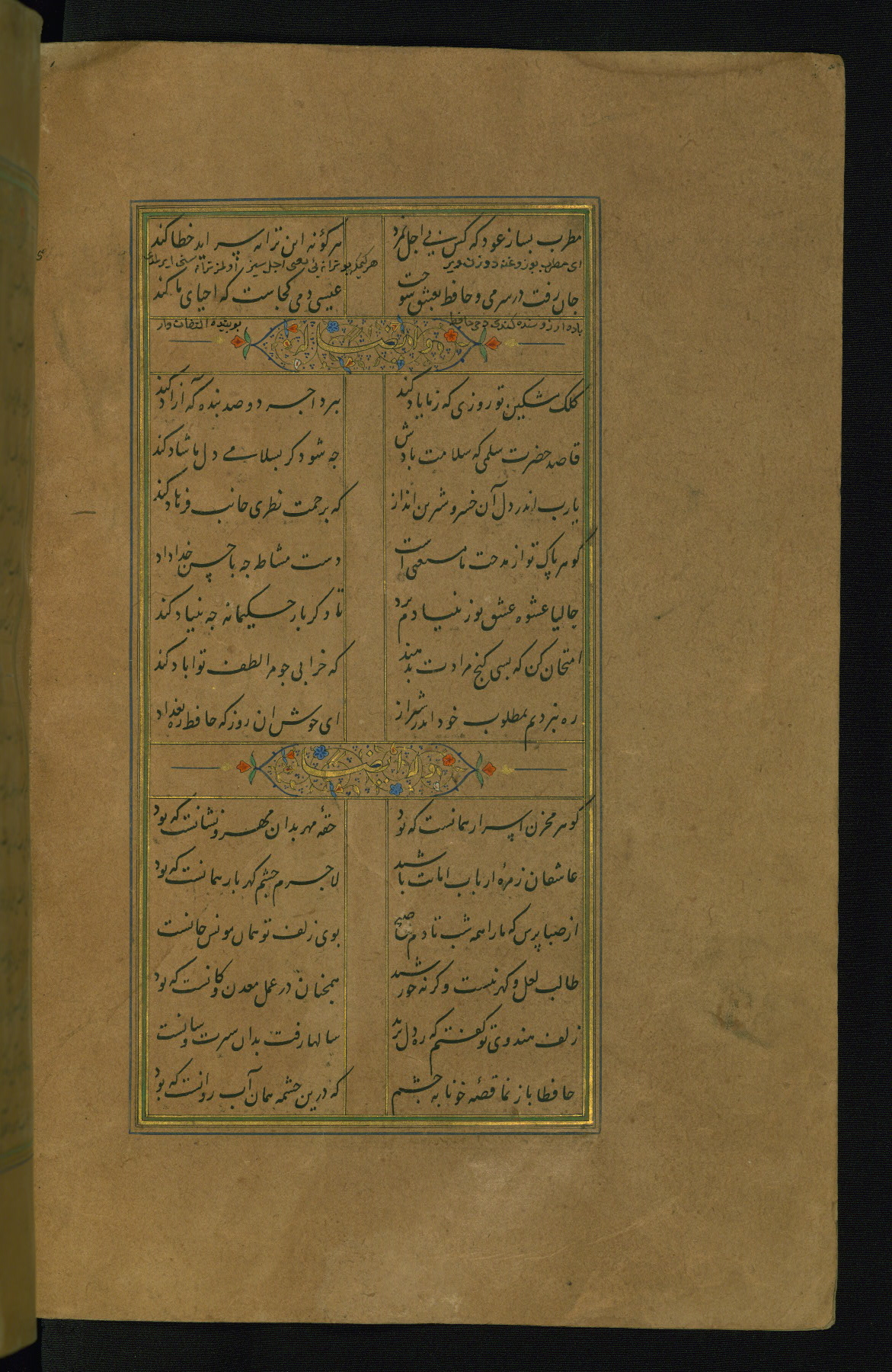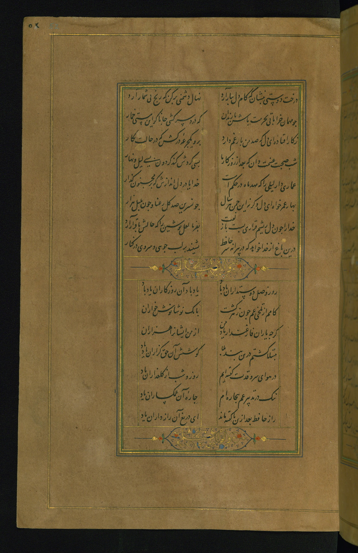 This is an illuminated and illustrated manuscript copy of the Collection of poems (dīvān) by Shams al-Dīn Muḥammad Ḥāfiz al-Shīrāzī (fl. eighth century AH / fourteenth CE). It was written in black nasta‘līq script with chapter/section headings in gold ink by Zayn al-‘Ābidīn ‘Abd al-Raḥmān al-Jāmī in 918 AH / 1512 CE in Safavid Iran. The manuscript opens with an illuminated medallion (fol. 1a), followed by a double-page illustrated frontispiece (fols. 1b-2a). The text begins with an incipit page with illuminated headpiece (fol. 2b). There are three additional illustrations (fols. 24a, 49b, and 87a). The red leather binding, which is not original and may be attributed to late twelfth-century AH / eighteenth CE or thirteenth-century AH / nineteenth CE Turkey, has a scalloped medallion with gold-tooled decoration and borders.