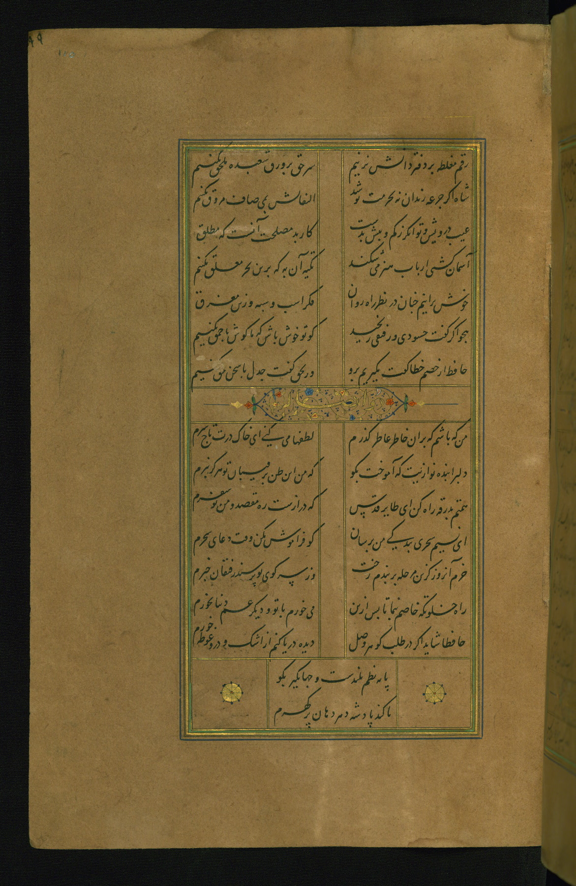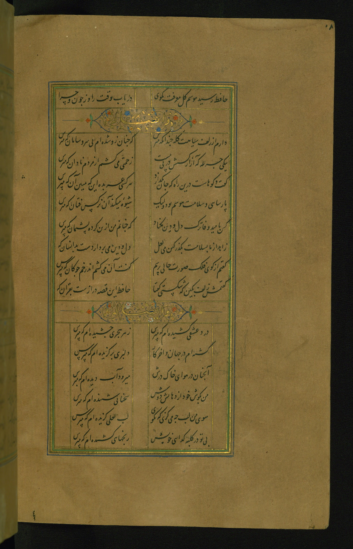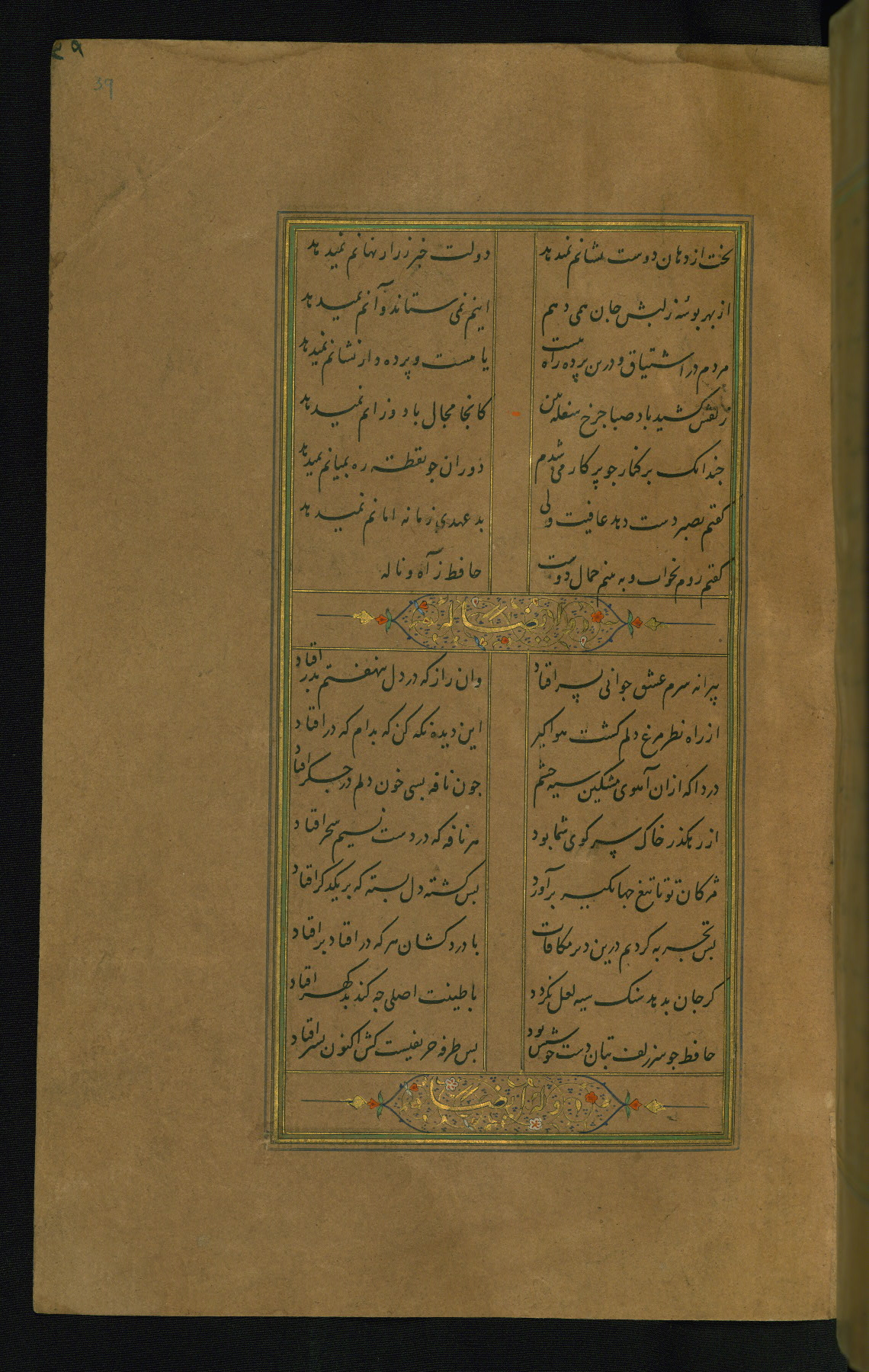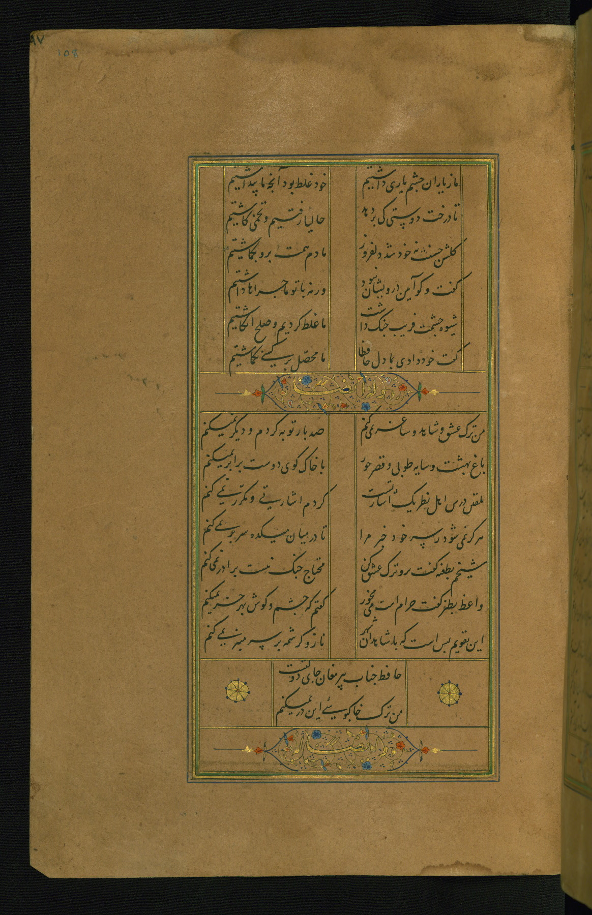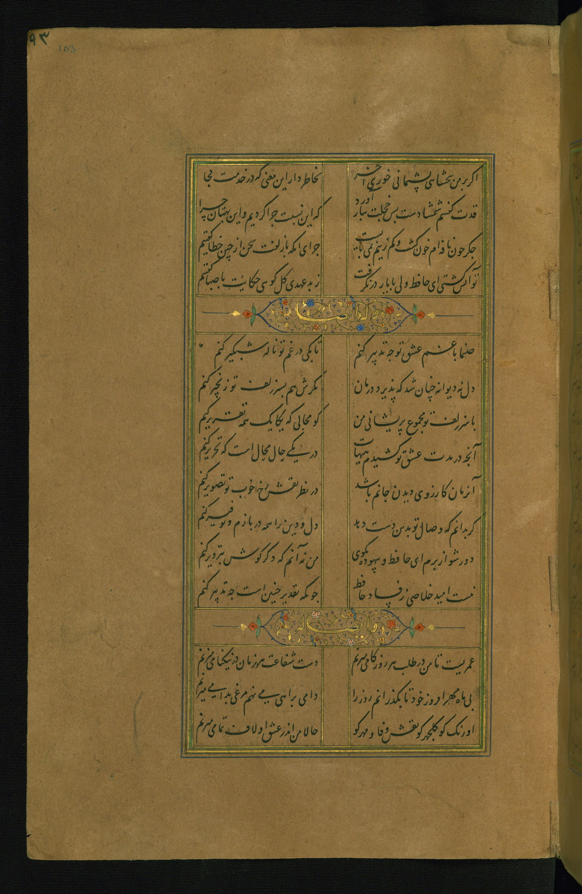 This is an illuminated and illustrated manuscript copy of the Collection of poems (dīvān) by Shams al-Dīn Muḥammad Ḥāfiz al-Shīrāzī (fl. eighth century AH / fourteenth CE). It was written in black nasta‘līq script with chapter/section headings in gold ink by Zayn al-‘Ābidīn ‘Abd al-Raḥmān al-Jāmī in 918 AH / 1512 CE in Safavid Iran. The manuscript opens with an illuminated medallion (fol. 1a), followed by a double-page illustrated frontispiece (fols. 1b-2a). The text begins with an incipit page with illuminated headpiece (fol. 2b). There are three additional illustrations (fols. 24a, 49b, and 87a). The red leather binding, which is not original and may be attributed to late twelfth-century AH / eighteenth CE or thirteenth-century AH / nineteenth CE Turkey, has a scalloped medallion with gold-tooled decoration and borders.