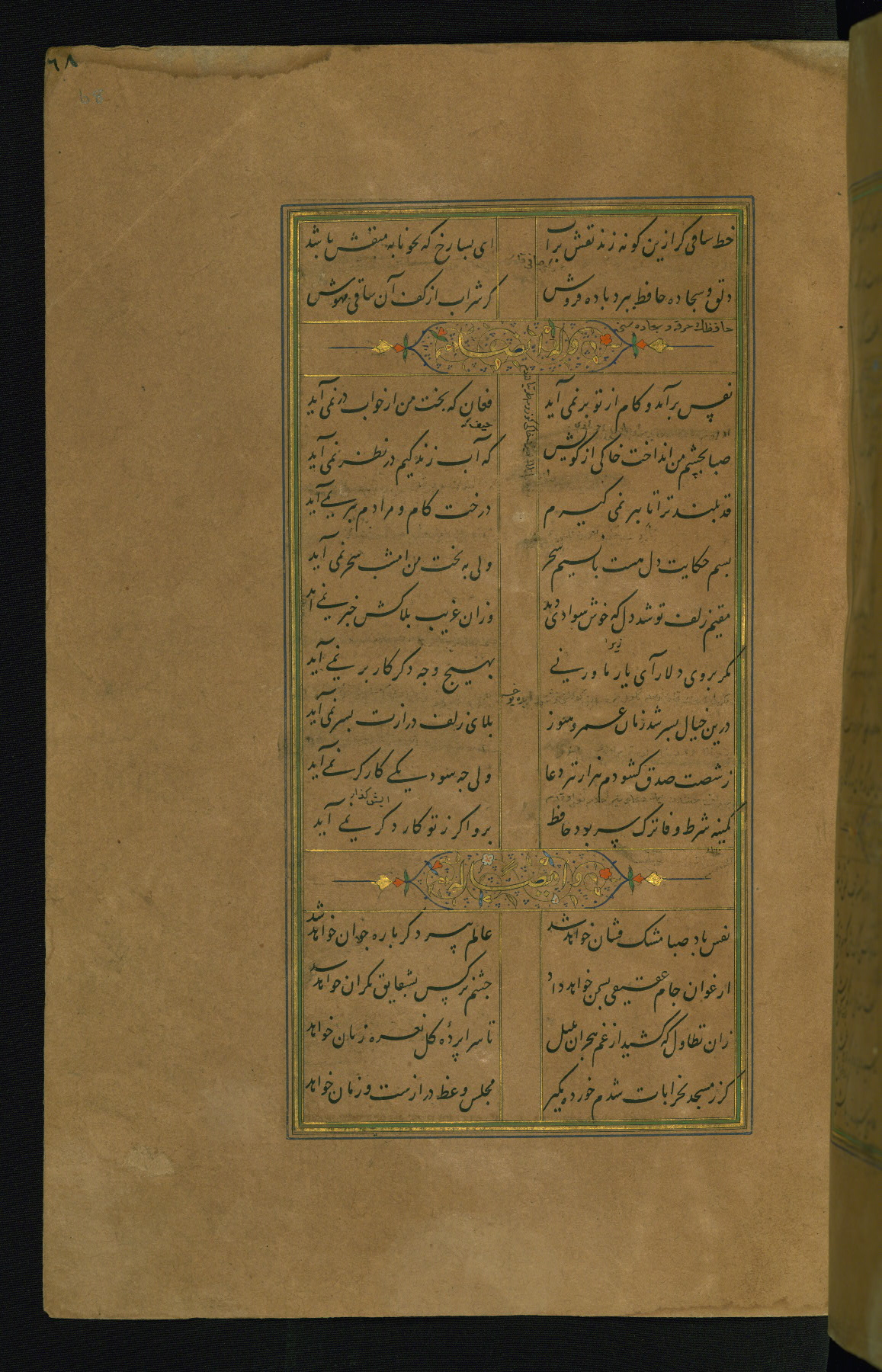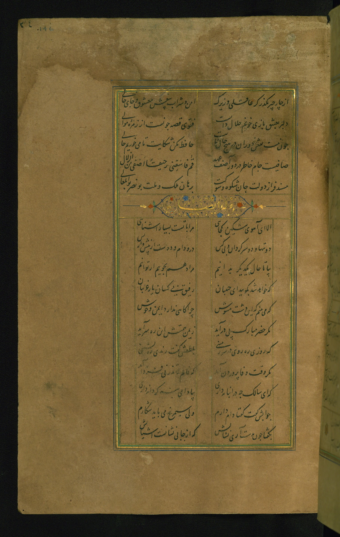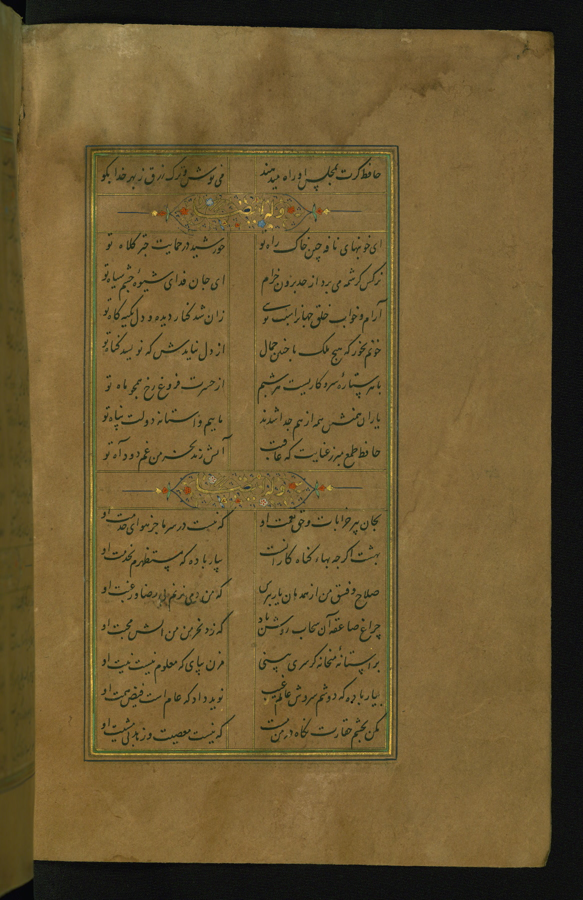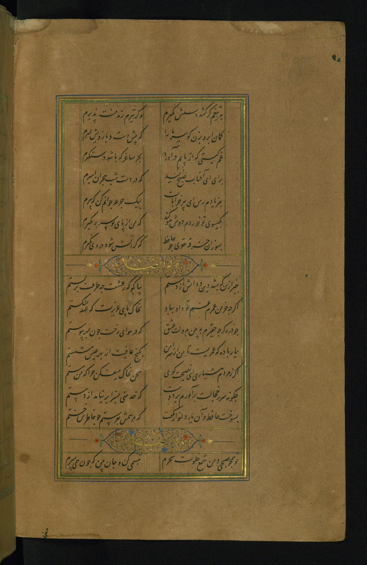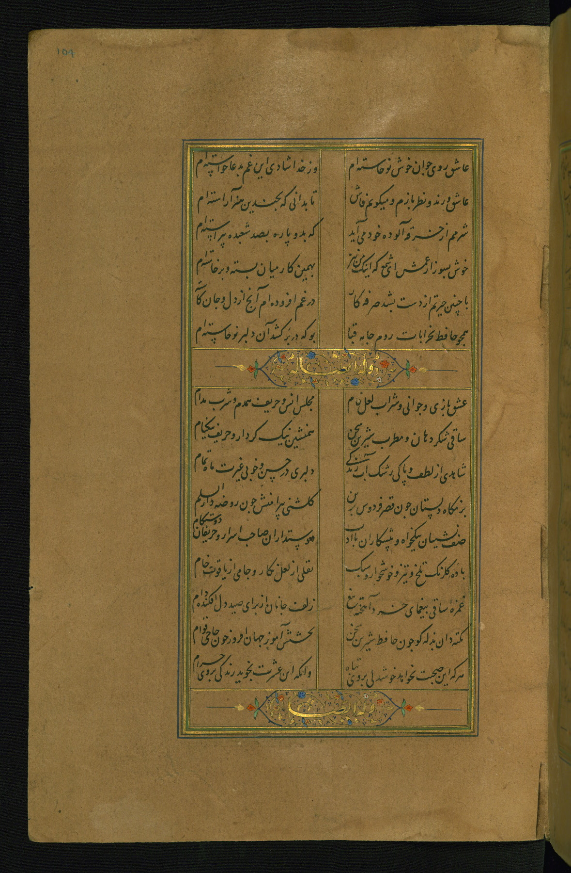 This is an illuminated and illustrated manuscript copy of the Collection of poems (dīvān) by Shams al-Dīn Muḥammad Ḥāfiz al-Shīrāzī (fl. eighth century AH / fourteenth CE). It was written in black nasta‘līq script with chapter/section headings in gold ink by Zayn al-‘Ābidīn ‘Abd al-Raḥmān al-Jāmī in 918 AH / 1512 CE in Safavid Iran. The manuscript opens with an illuminated medallion (fol. 1a), followed by a double-page illustrated frontispiece (fols. 1b-2a). The text begins with an incipit page with illuminated headpiece (fol. 2b). There are three additional illustrations (fols. 24a, 49b, and 87a). The red leather binding, which is not original and may be attributed to late twelfth-century AH / eighteenth CE or thirteenth-century AH / nineteenth CE Turkey, has a scalloped medallion with gold-tooled decoration and borders.
