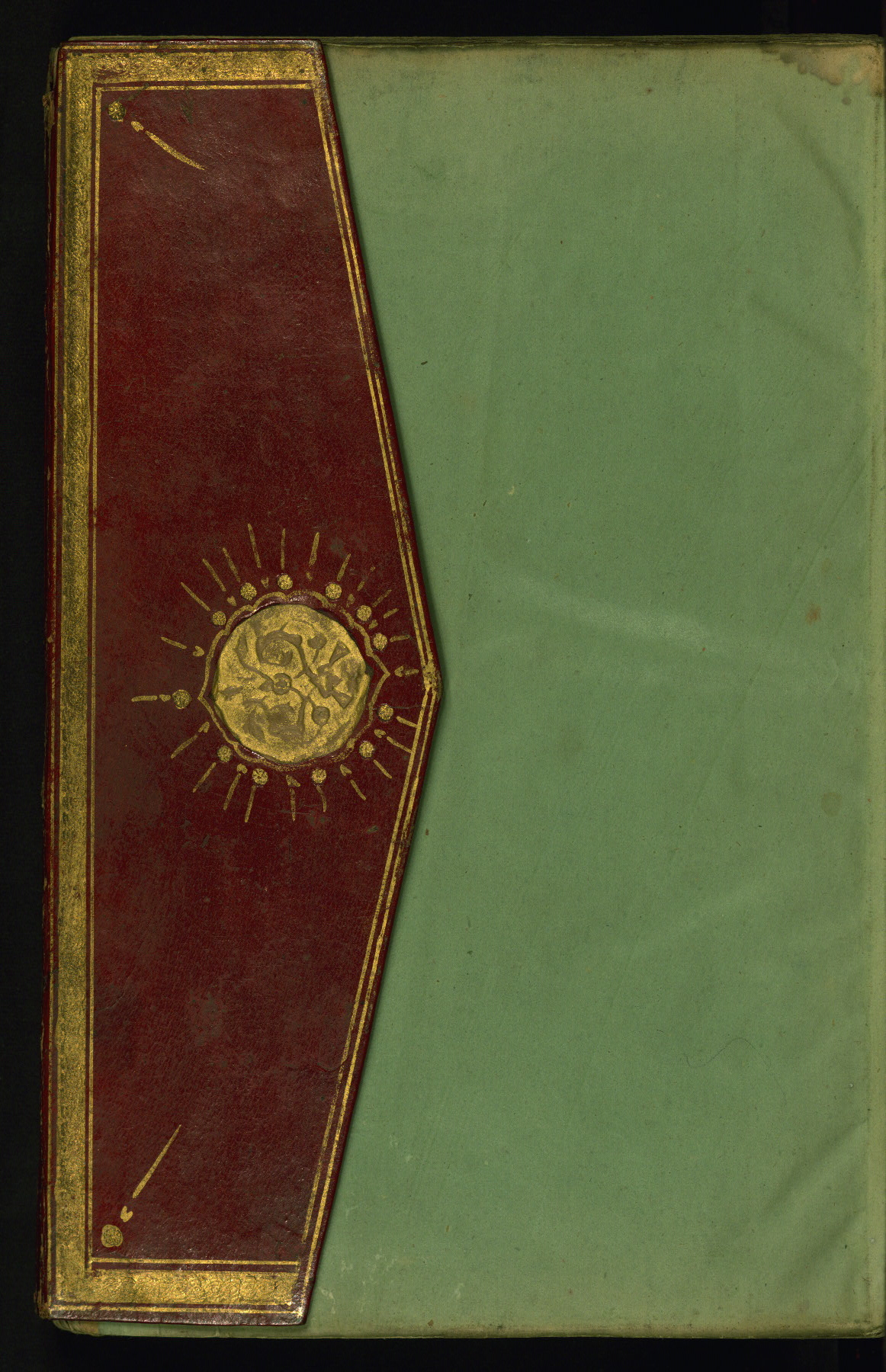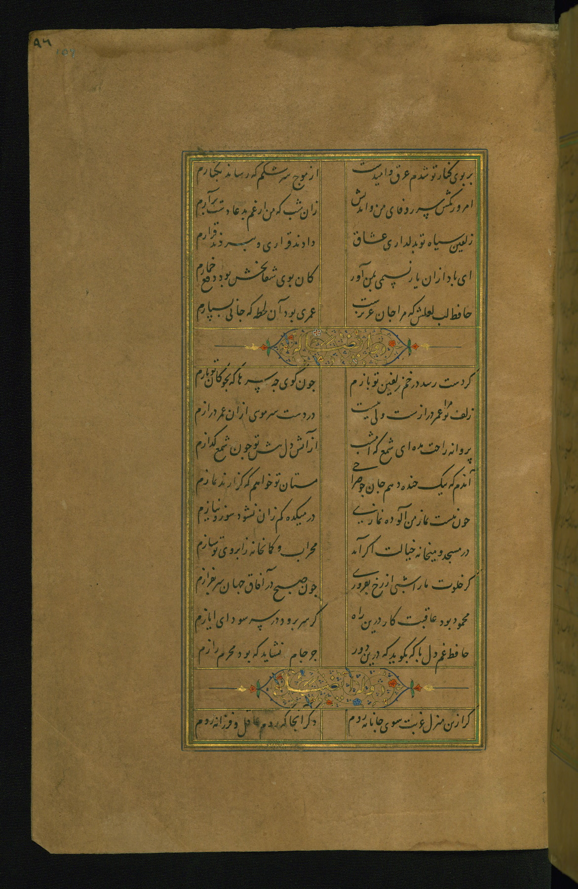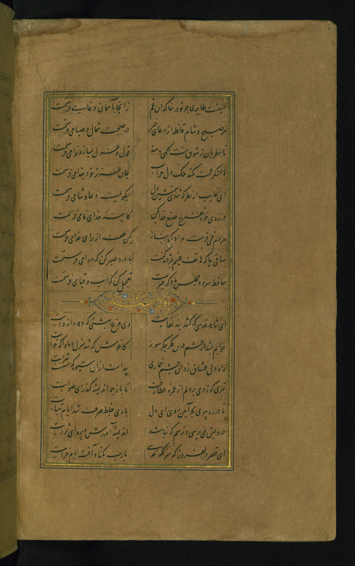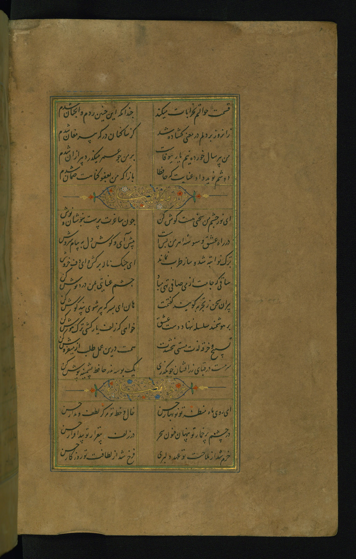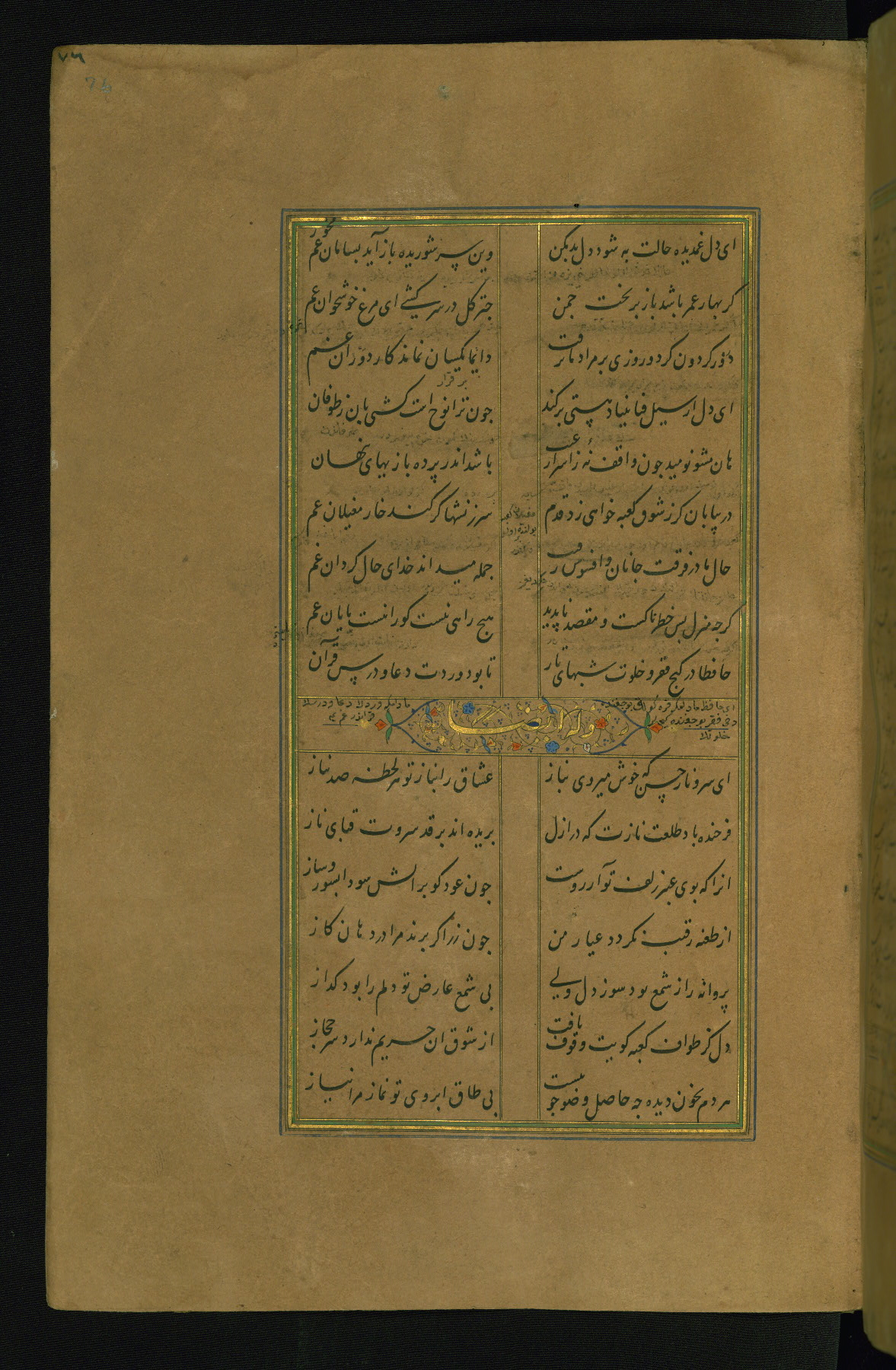 This is an illuminated and illustrated manuscript copy of the Collection of poems (dīvān) by Shams al-Dīn Muḥammad Ḥāfiz al-Shīrāzī (fl. eighth century AH / fourteenth CE). It was written in black nasta‘līq script with chapter/section headings in gold ink by Zayn al-‘Ābidīn ‘Abd al-Raḥmān al-Jāmī in 918 AH / 1512 CE in Safavid Iran. The manuscript opens with an illuminated medallion (fol. 1a), followed by a double-page illustrated frontispiece (fols. 1b-2a). The text begins with an incipit page with illuminated headpiece (fol. 2b). There are three additional illustrations (fols. 24a, 49b, and 87a). The red leather binding, which is not original and may be attributed to late twelfth-century AH / eighteenth CE or thirteenth-century AH / nineteenth CE Turkey, has a scalloped medallion with gold-tooled decoration and borders.