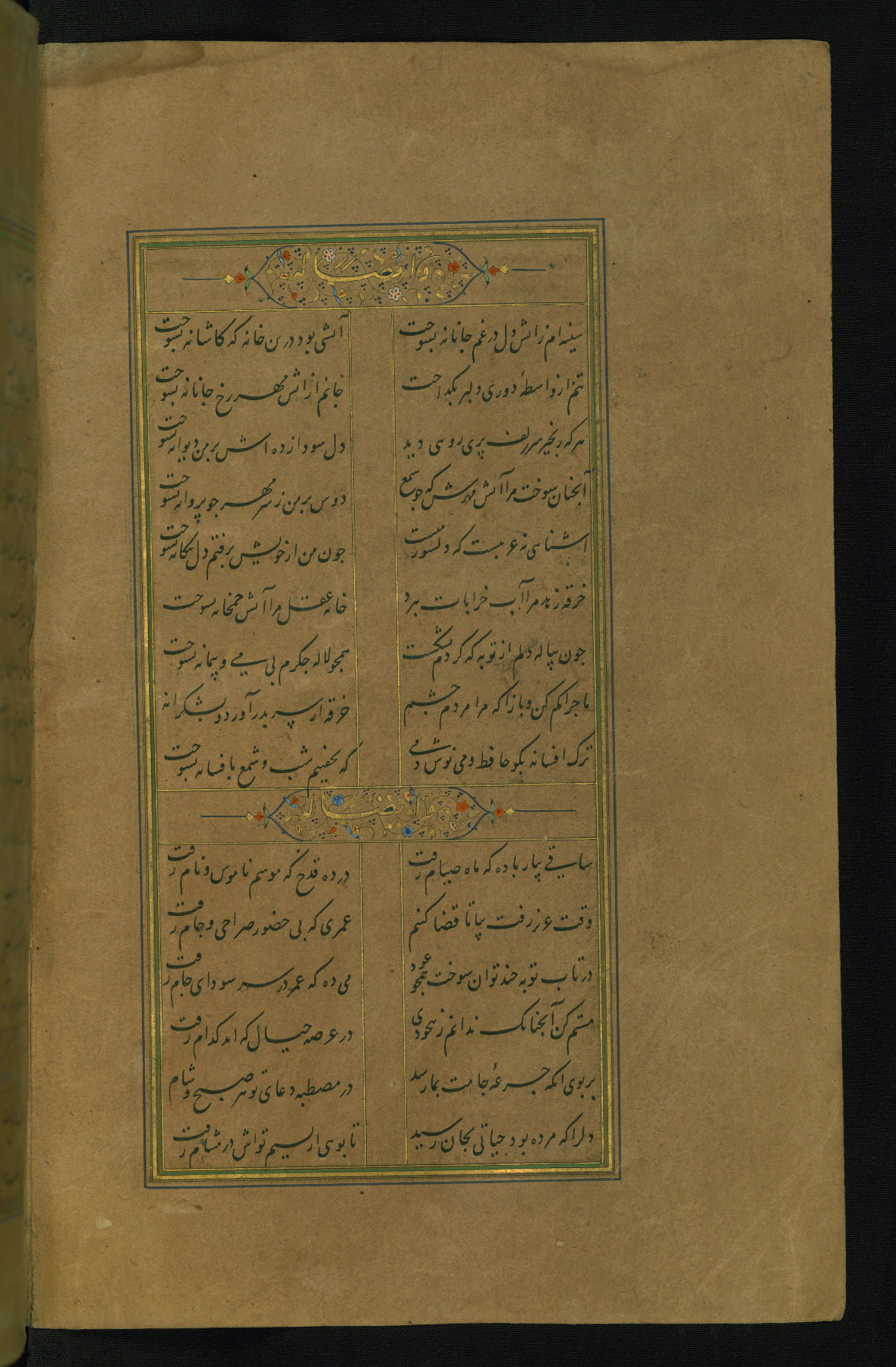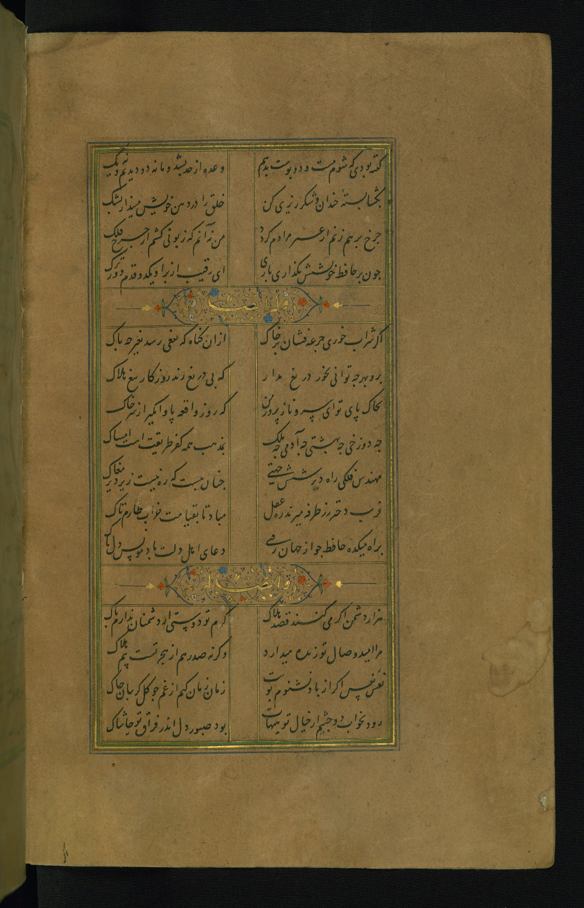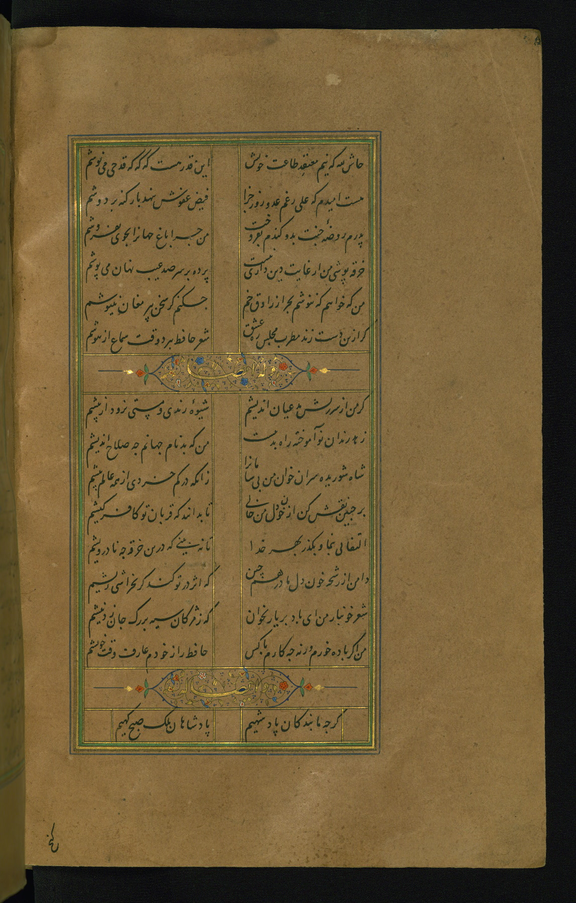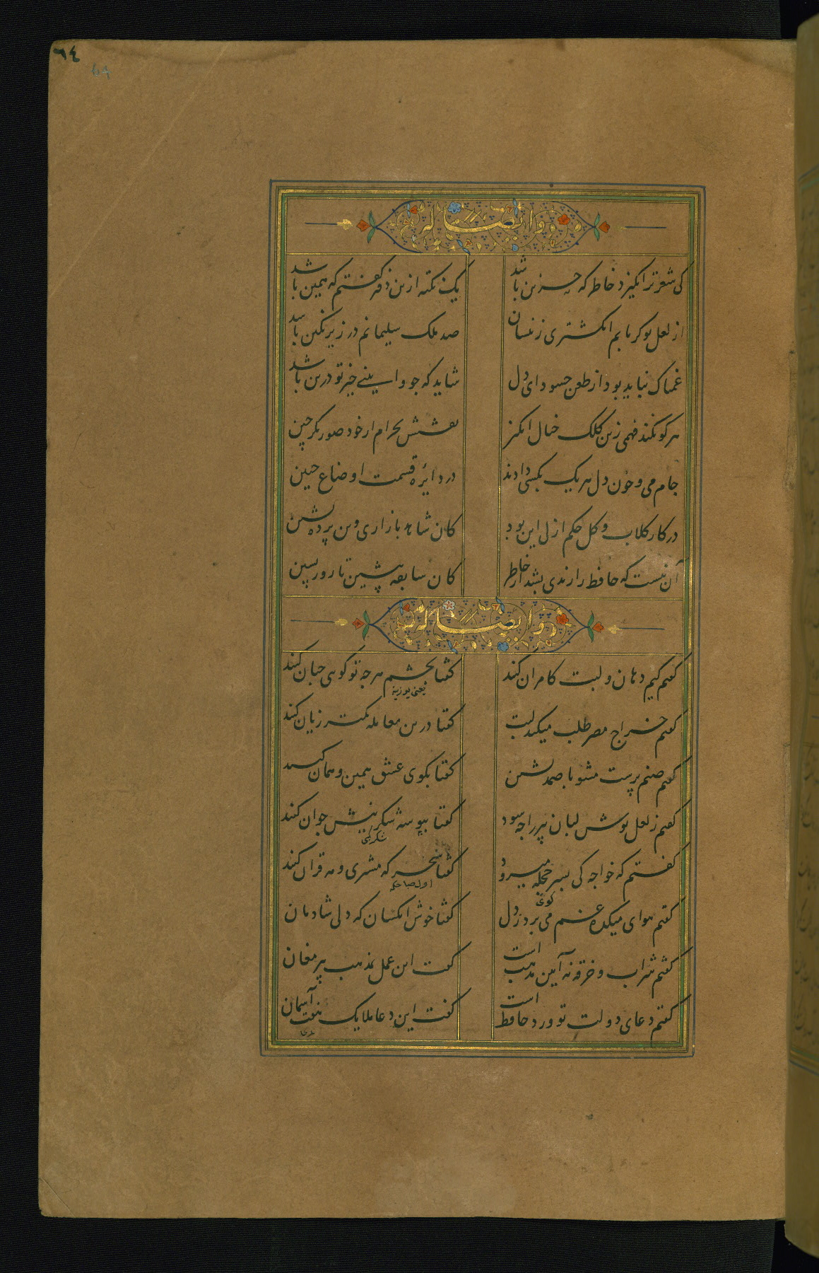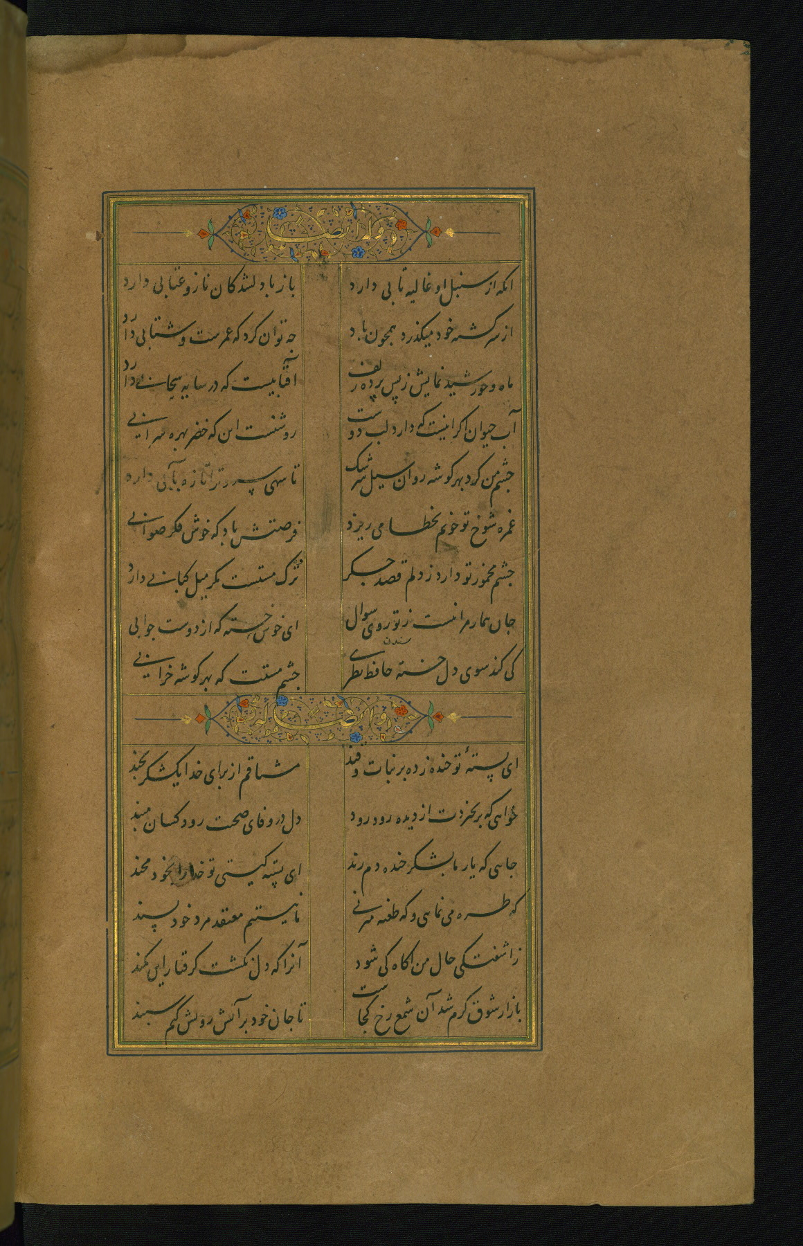 This is an illuminated and illustrated manuscript copy of the Collection of poems (dīvān) by Shams al-Dīn Muḥammad Ḥāfiz al-Shīrāzī (fl. eighth century AH / fourteenth CE). It was written in black nasta‘līq script with chapter/section headings in gold ink by Zayn al-‘Ābidīn ‘Abd al-Raḥmān al-Jāmī in 918 AH / 1512 CE in Safavid Iran. The manuscript opens with an illuminated medallion (fol. 1a), followed by a double-page illustrated frontispiece (fols. 1b-2a). The text begins with an incipit page with illuminated headpiece (fol. 2b). There are three additional illustrations (fols. 24a, 49b, and 87a). The red leather binding, which is not original and may be attributed to late twelfth-century AH / eighteenth CE or thirteenth-century AH / nineteenth CE Turkey, has a scalloped medallion with gold-tooled decoration and borders.