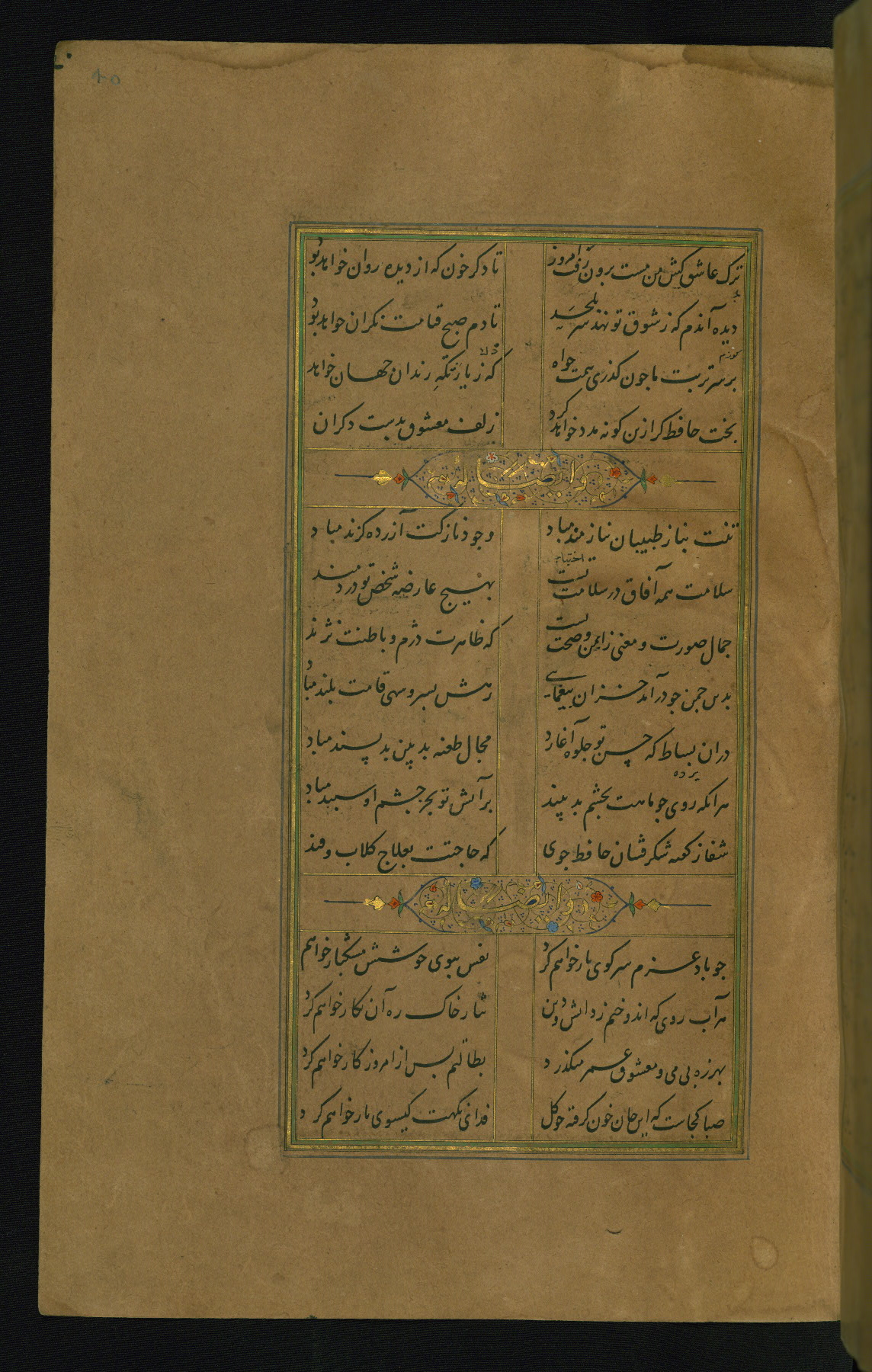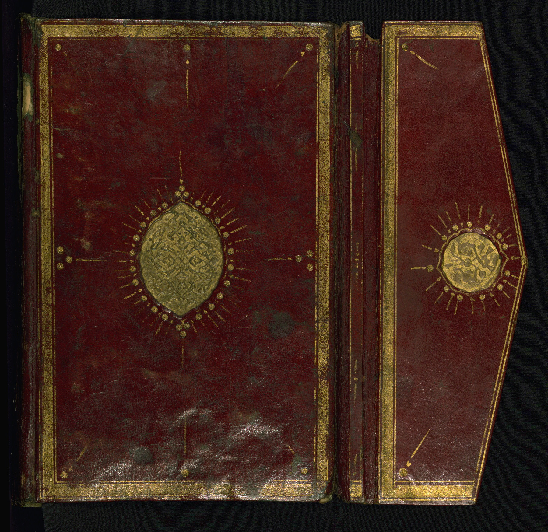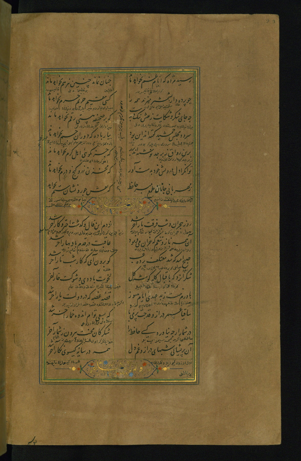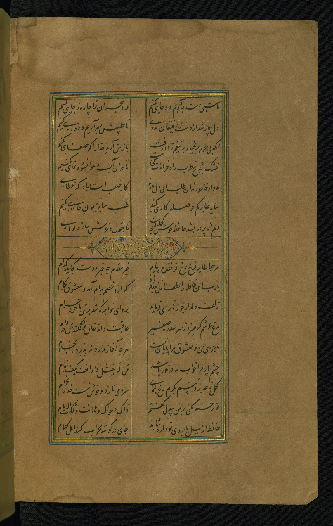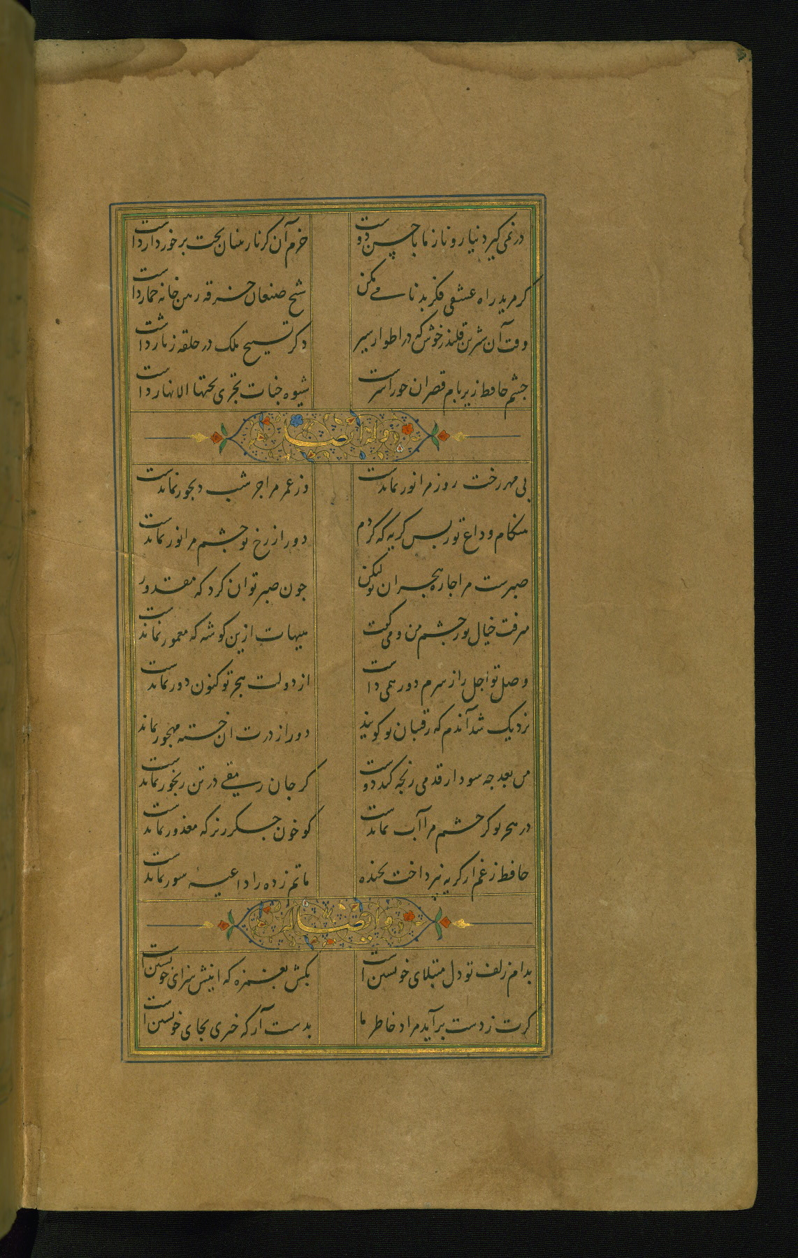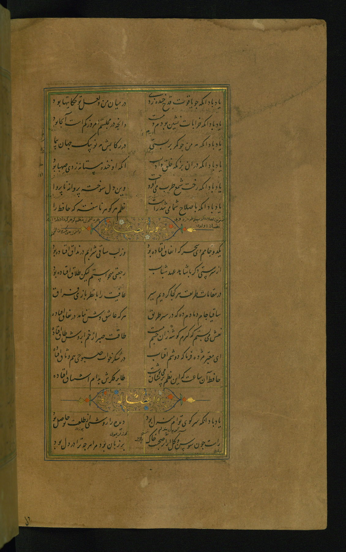 This is an illuminated and illustrated manuscript copy of the Collection of poems (dīvān) by Shams al-Dīn Muḥammad Ḥāfiz al-Shīrāzī (fl. eighth century AH / fourteenth CE). It was written in black nasta‘līq script with chapter/section headings in gold ink by Zayn al-‘Ābidīn ‘Abd al-Raḥmān al-Jāmī in 918 AH / 1512 CE in Safavid Iran. The manuscript opens with an illuminated medallion (fol. 1a), followed by a double-page illustrated frontispiece (fols. 1b-2a). The text begins with an incipit page with illuminated headpiece (fol. 2b). There are three additional illustrations (fols. 24a, 49b, and 87a). The red leather binding, which is not original and may be attributed to late twelfth-century AH / eighteenth CE or thirteenth-century AH / nineteenth CE Turkey, has a scalloped medallion with gold-tooled decoration and borders.