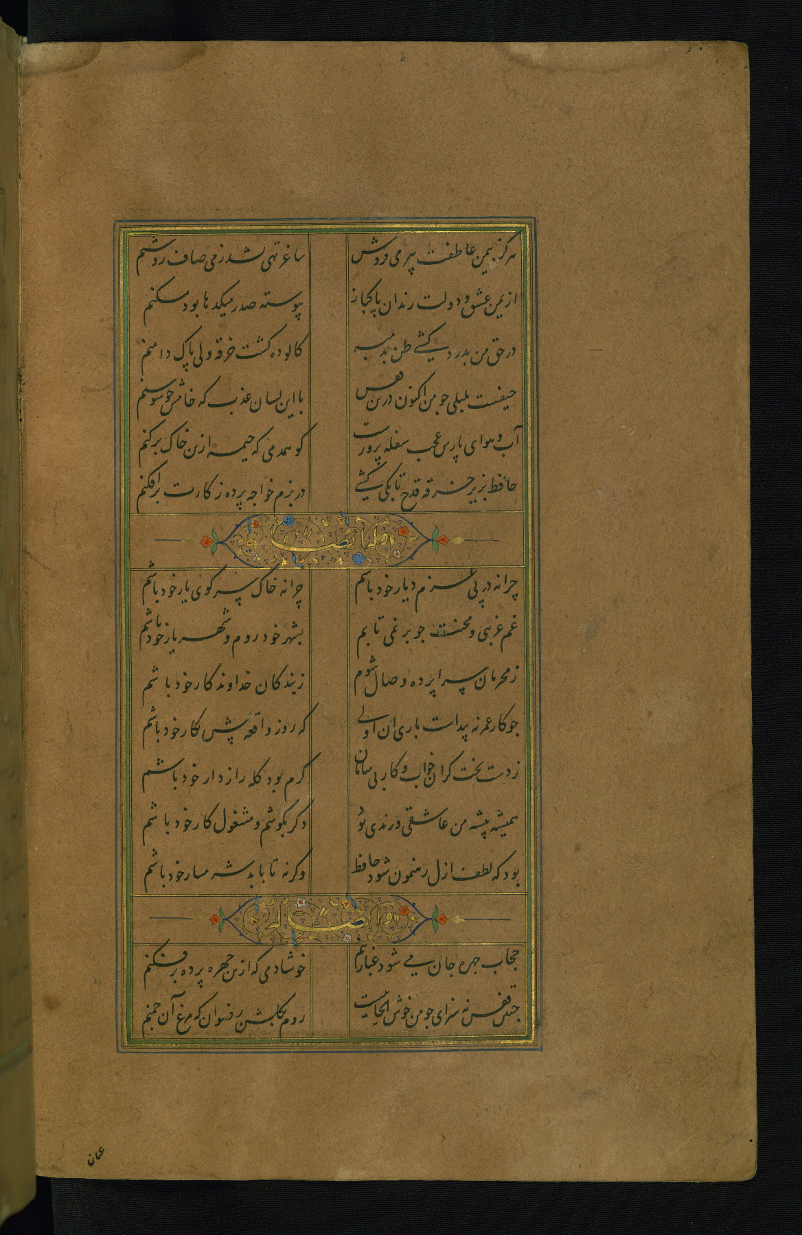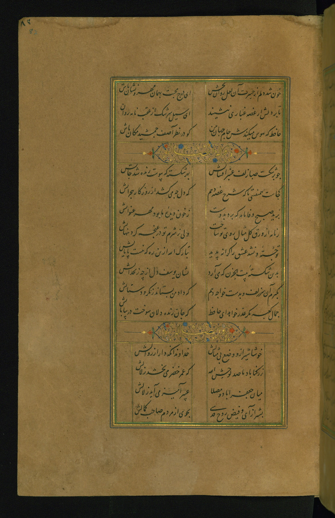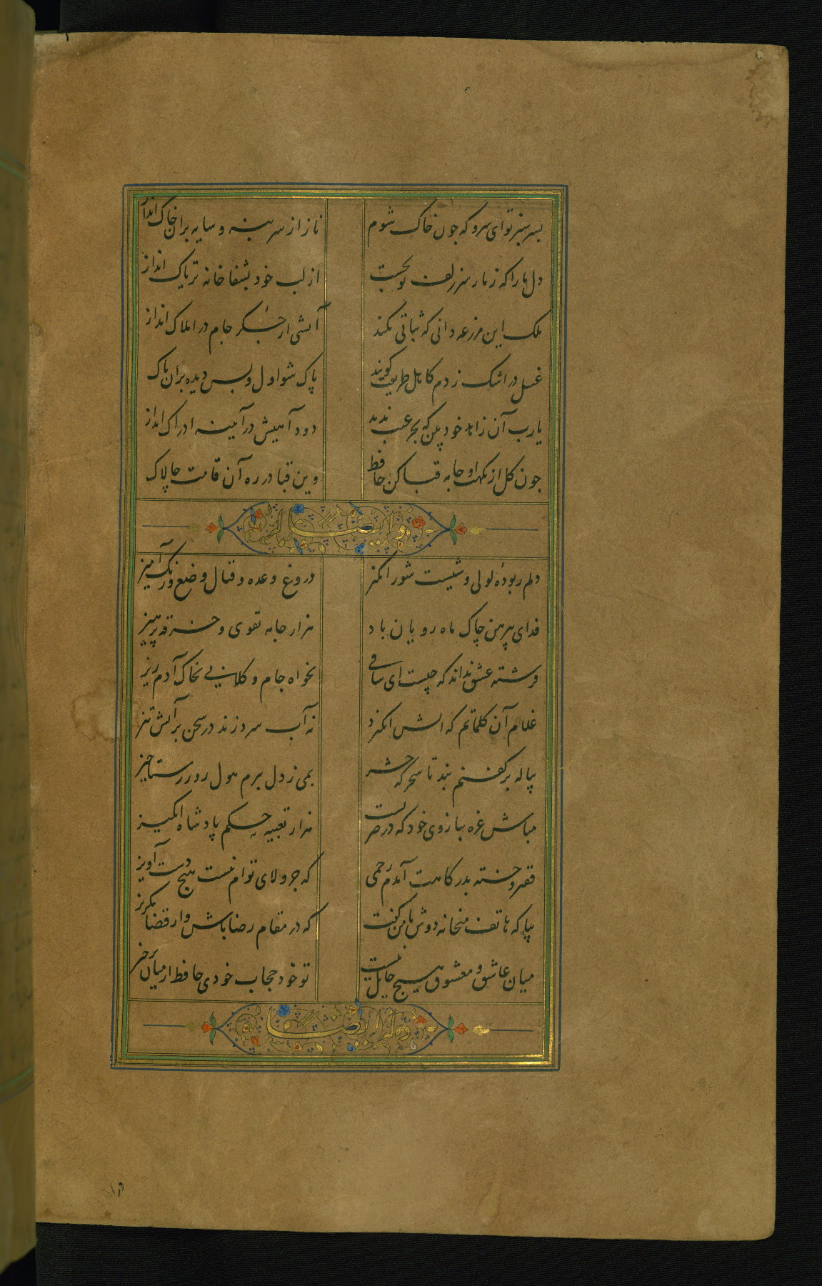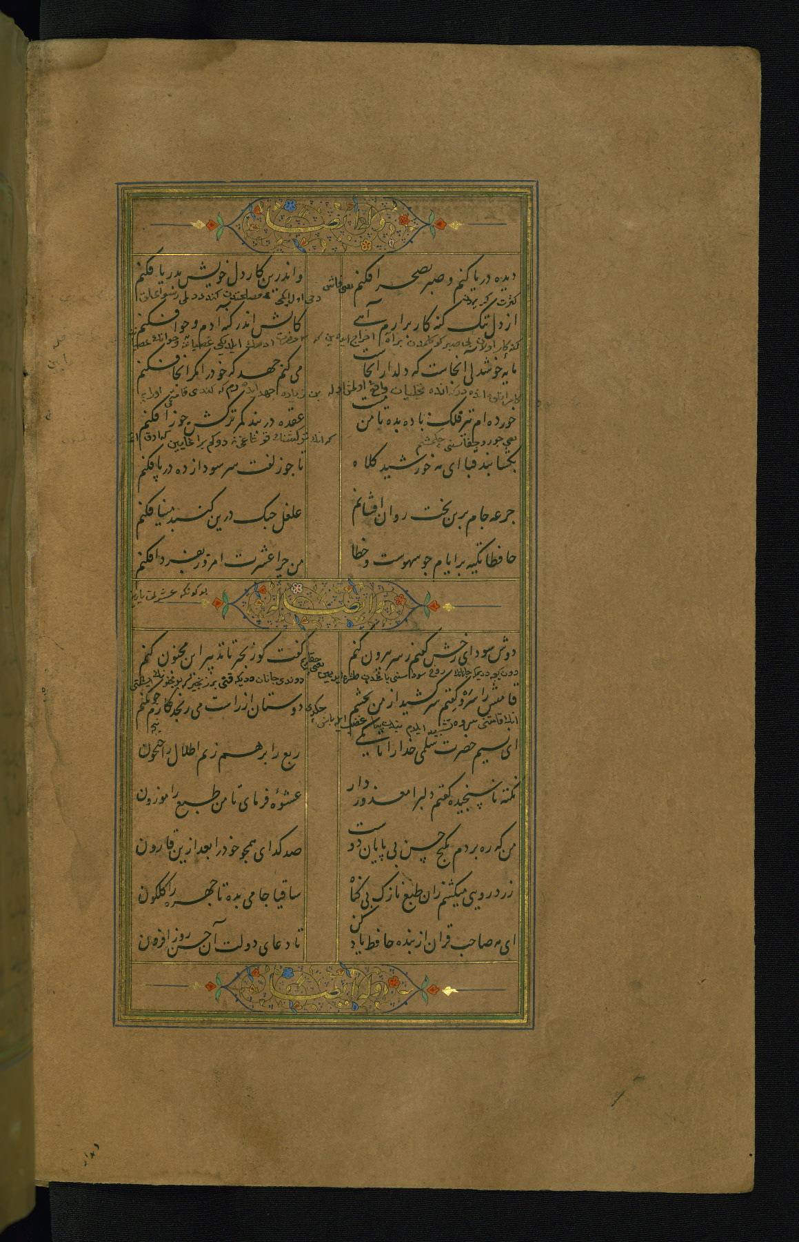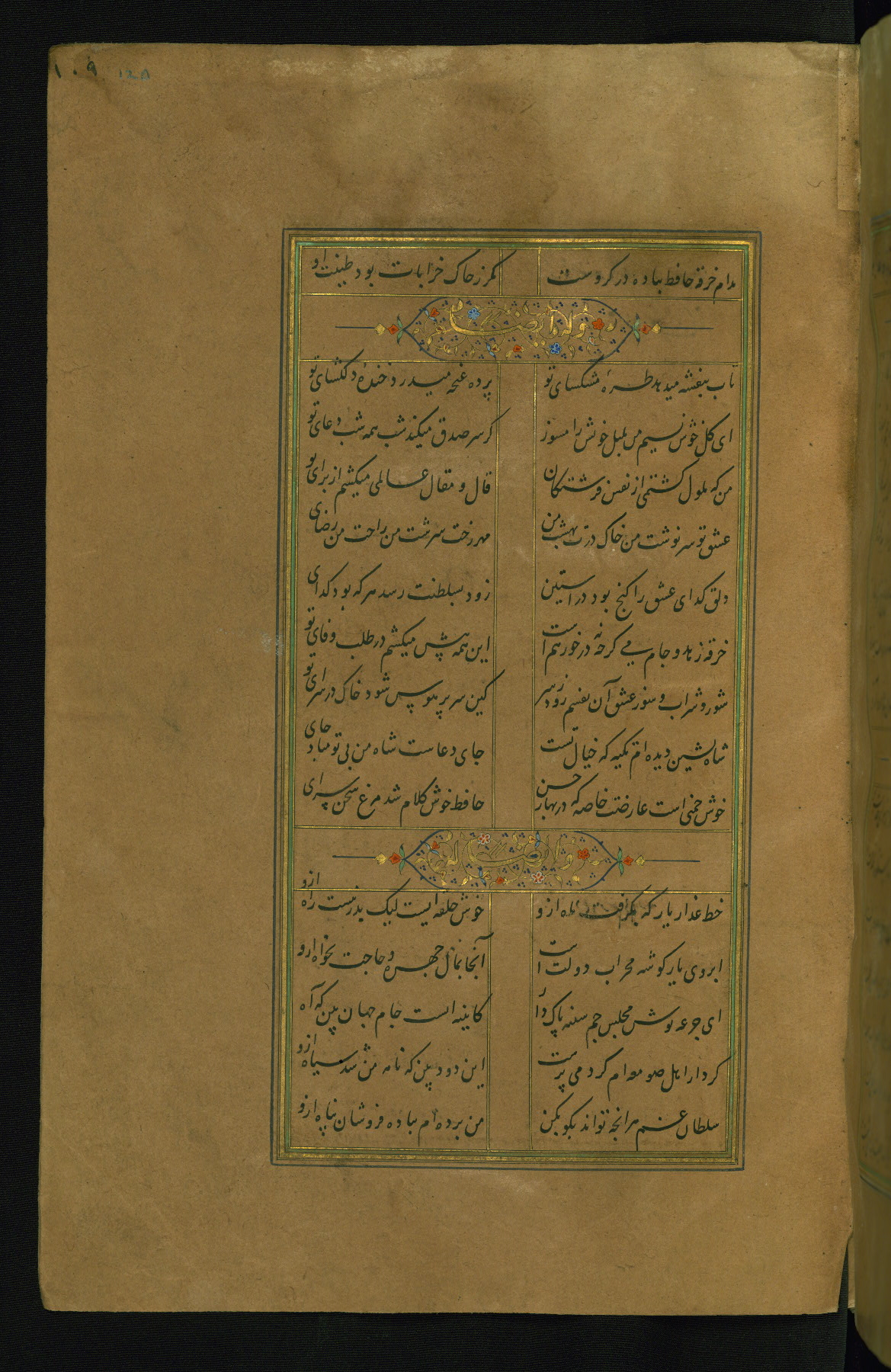 This is an illuminated and illustrated manuscript copy of the Collection of poems (dīvān) by Shams al-Dīn Muḥammad Ḥāfiz al-Shīrāzī (fl. eighth century AH / fourteenth CE). It was written in black nasta‘līq script with chapter/section headings in gold ink by Zayn al-‘Ābidīn ‘Abd al-Raḥmān al-Jāmī in 918 AH / 1512 CE in Safavid Iran. The manuscript opens with an illuminated medallion (fol. 1a), followed by a double-page illustrated frontispiece (fols. 1b-2a). The text begins with an incipit page with illuminated headpiece (fol. 2b). There are three additional illustrations (fols. 24a, 49b, and 87a). The red leather binding, which is not original and may be attributed to late twelfth-century AH / eighteenth CE or thirteenth-century AH / nineteenth CE Turkey, has a scalloped medallion with gold-tooled decoration and borders.