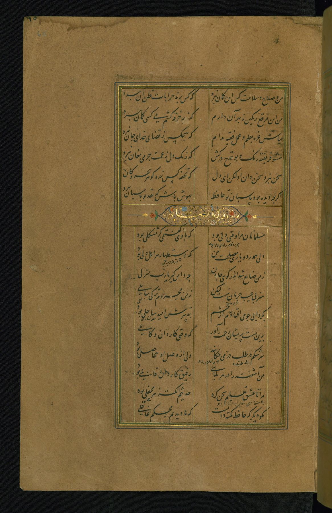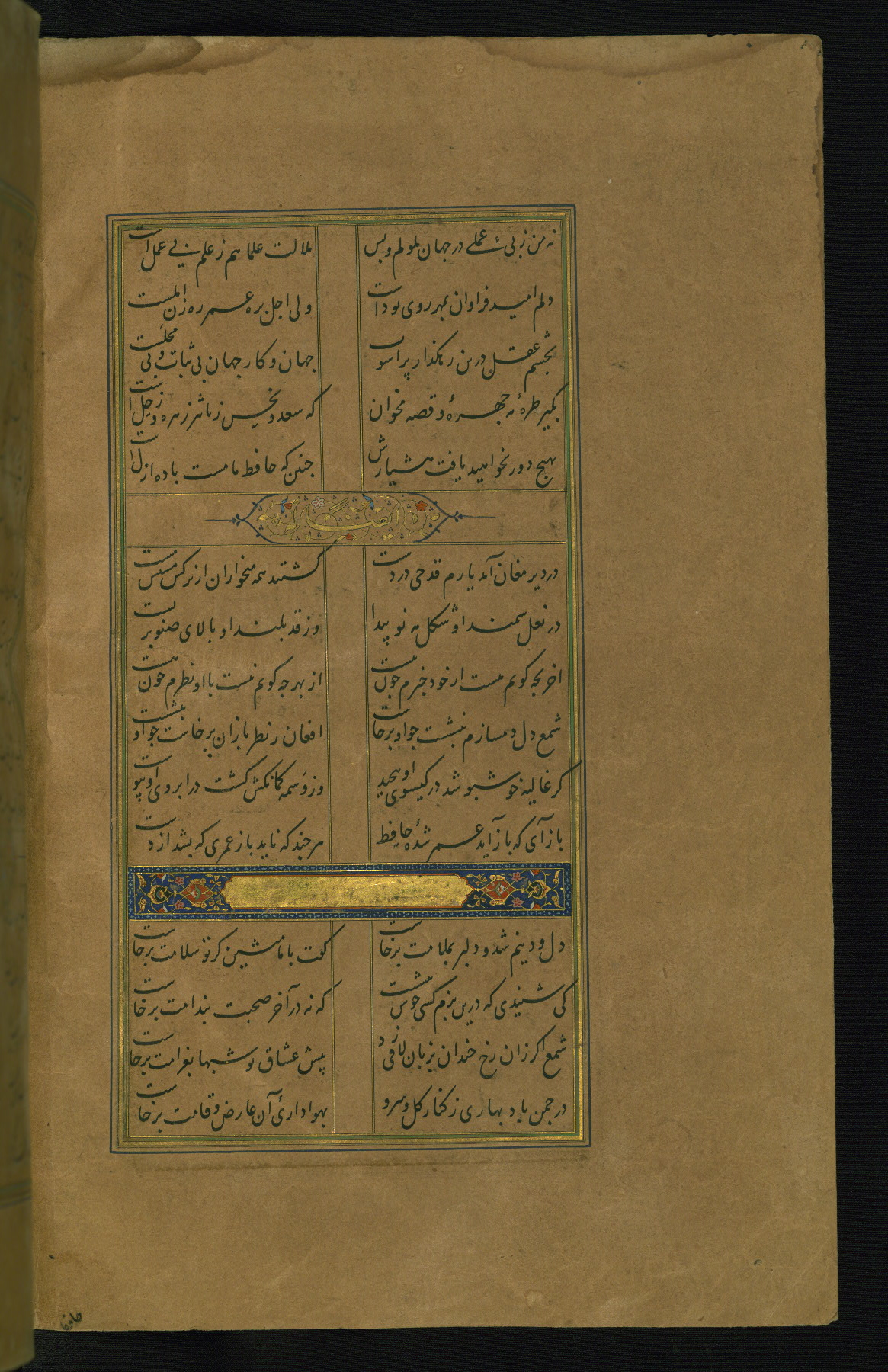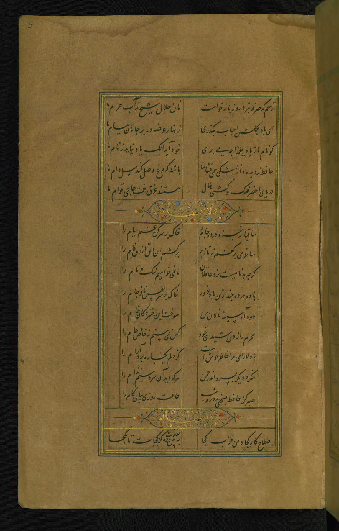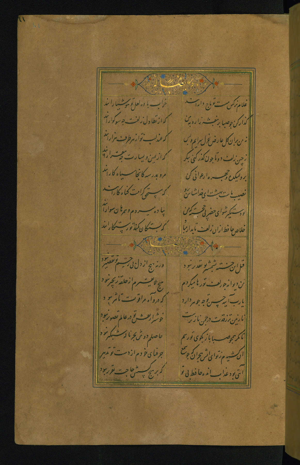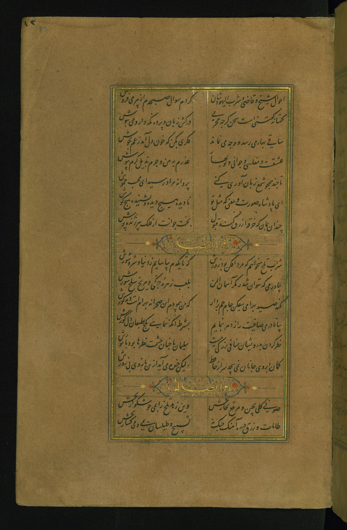 This is an illuminated and illustrated manuscript copy of the Collection of poems (dīvān) by Shams al-Dīn Muḥammad Ḥāfiz al-Shīrāzī (fl. eighth century AH / fourteenth CE). It was written in black nasta‘līq script with chapter/section headings in gold ink by Zayn al-‘Ābidīn ‘Abd al-Raḥmān al-Jāmī in 918 AH / 1512 CE in Safavid Iran. The manuscript opens with an illuminated medallion (fol. 1a), followed by a double-page illustrated frontispiece (fols. 1b-2a). The text begins with an incipit page with illuminated headpiece (fol. 2b). There are three additional illustrations (fols. 24a, 49b, and 87a). The red leather binding, which is not original and may be attributed to late twelfth-century AH / eighteenth CE or thirteenth-century AH / nineteenth CE Turkey, has a scalloped medallion with gold-tooled decoration and borders.