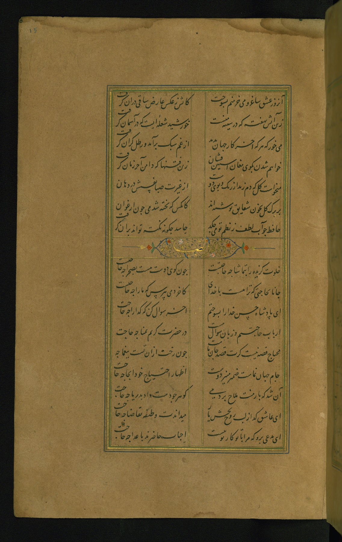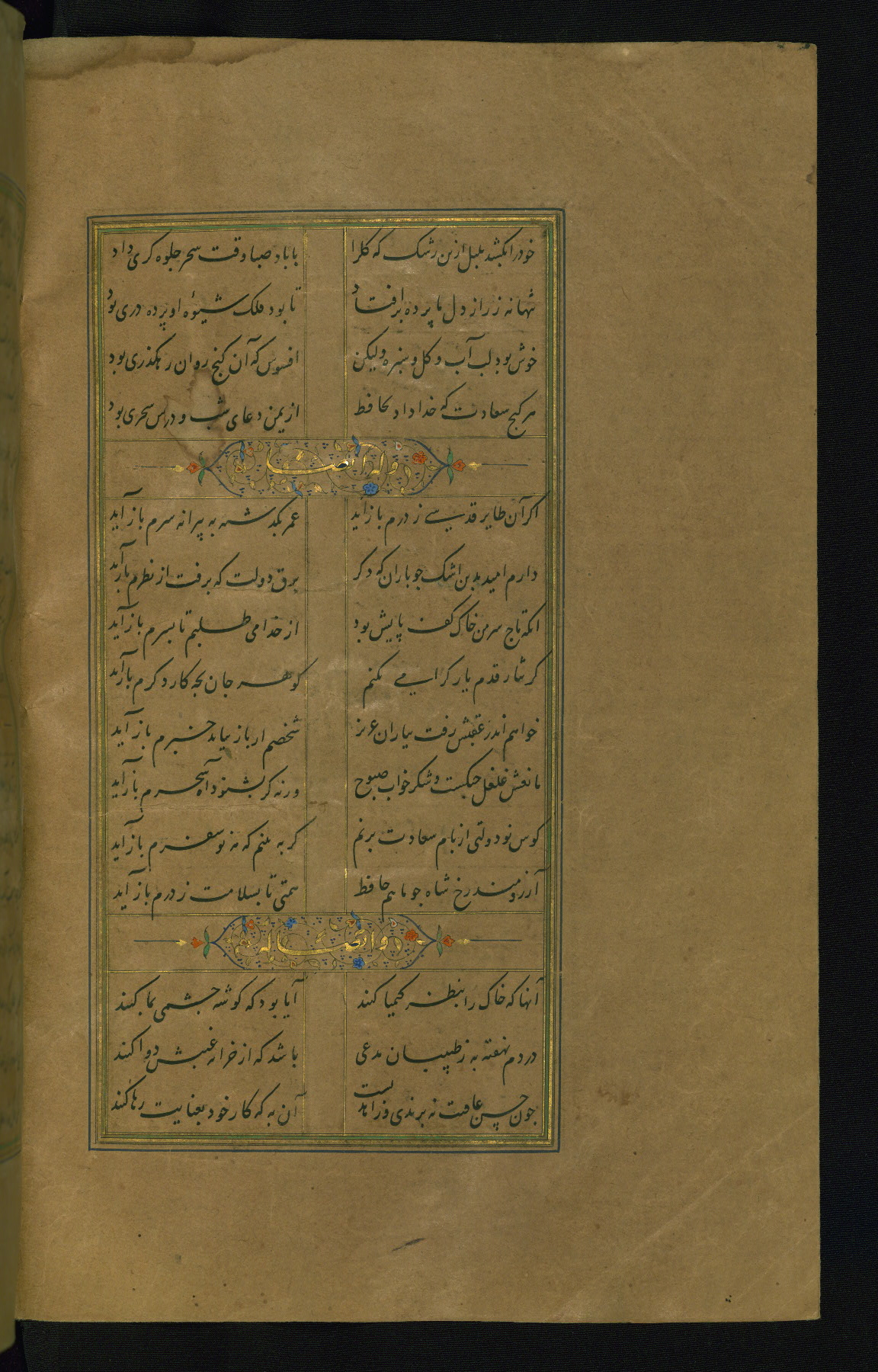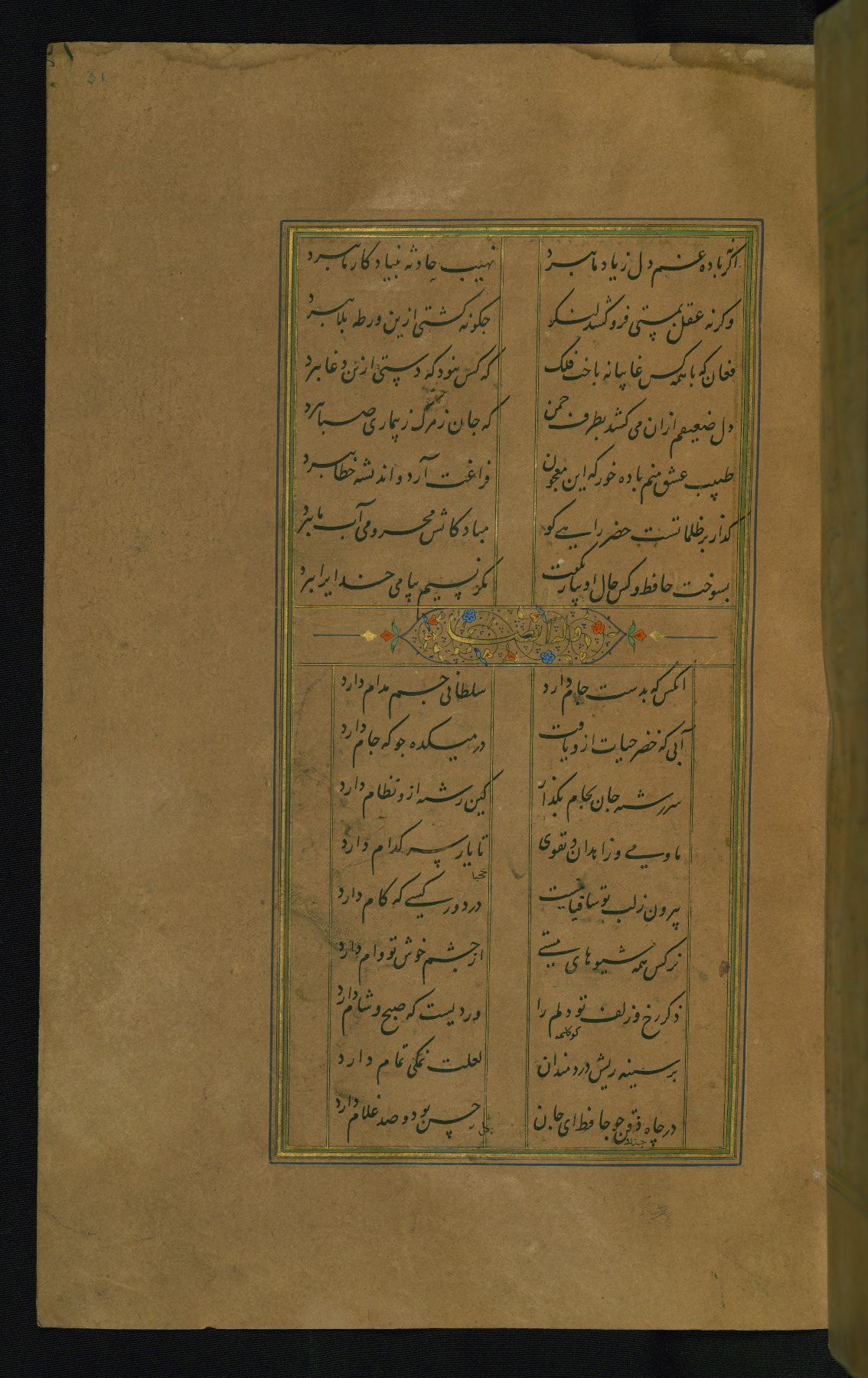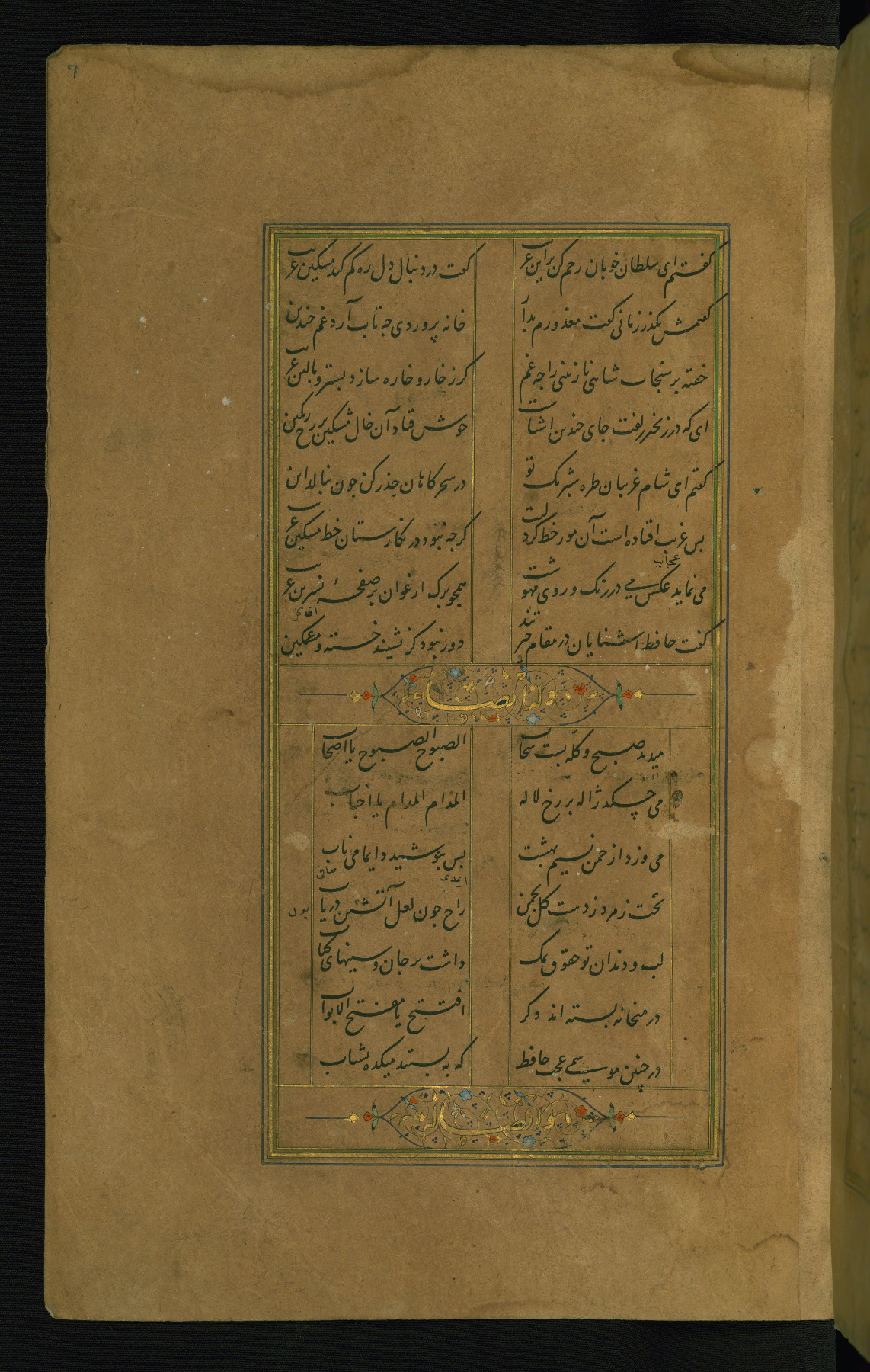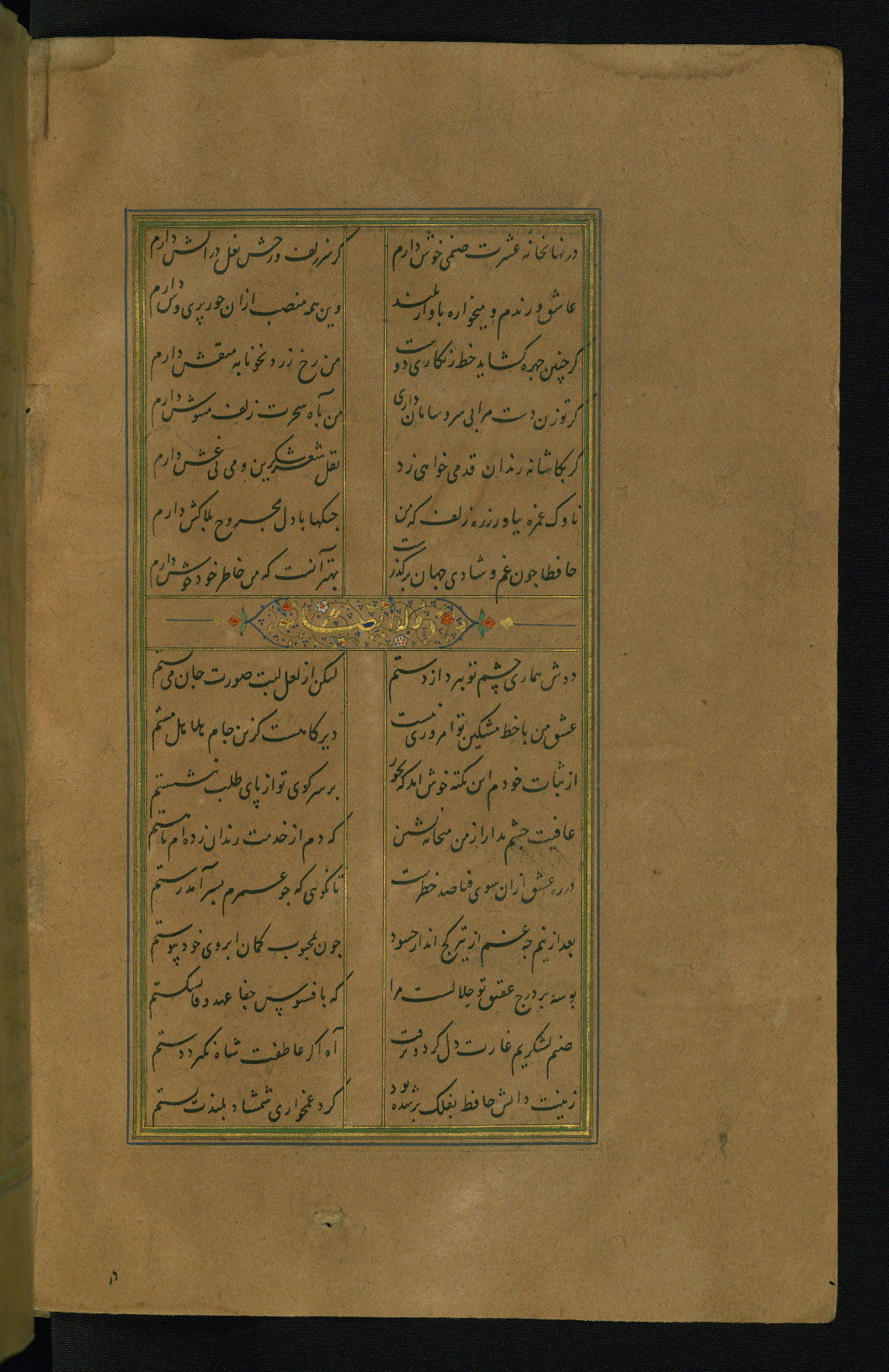 This is an illuminated and illustrated manuscript copy of the Collection of poems (dīvān) by Shams al-Dīn Muḥammad Ḥāfiz al-Shīrāzī (fl. eighth century AH / fourteenth CE). It was written in black nasta‘līq script with chapter/section headings in gold ink by Zayn al-‘Ābidīn ‘Abd al-Raḥmān al-Jāmī in 918 AH / 1512 CE in Safavid Iran. The manuscript opens with an illuminated medallion (fol. 1a), followed by a double-page illustrated frontispiece (fols. 1b-2a). The text begins with an incipit page with illuminated headpiece (fol. 2b). There are three additional illustrations (fols. 24a, 49b, and 87a). The red leather binding, which is not original and may be attributed to late twelfth-century AH / eighteenth CE or thirteenth-century AH / nineteenth CE Turkey, has a scalloped medallion with gold-tooled decoration and borders.
