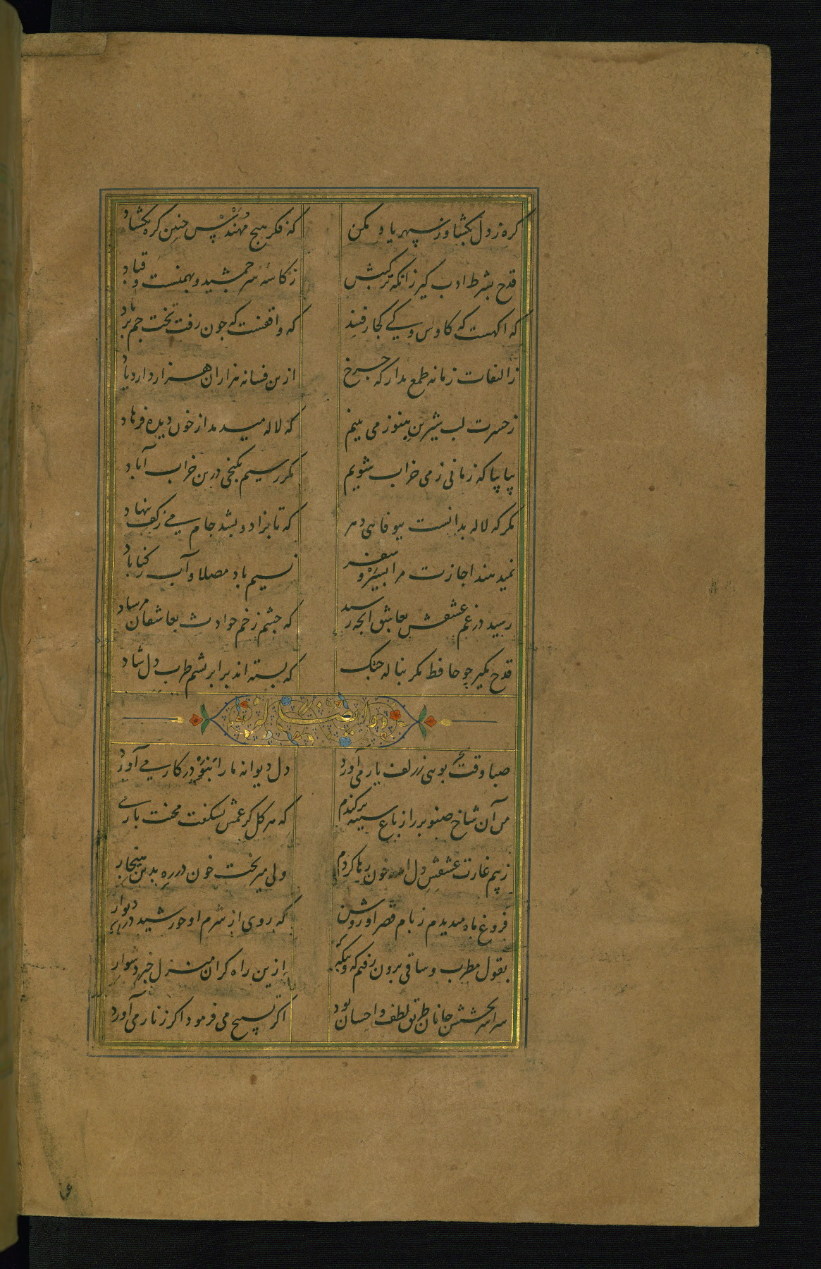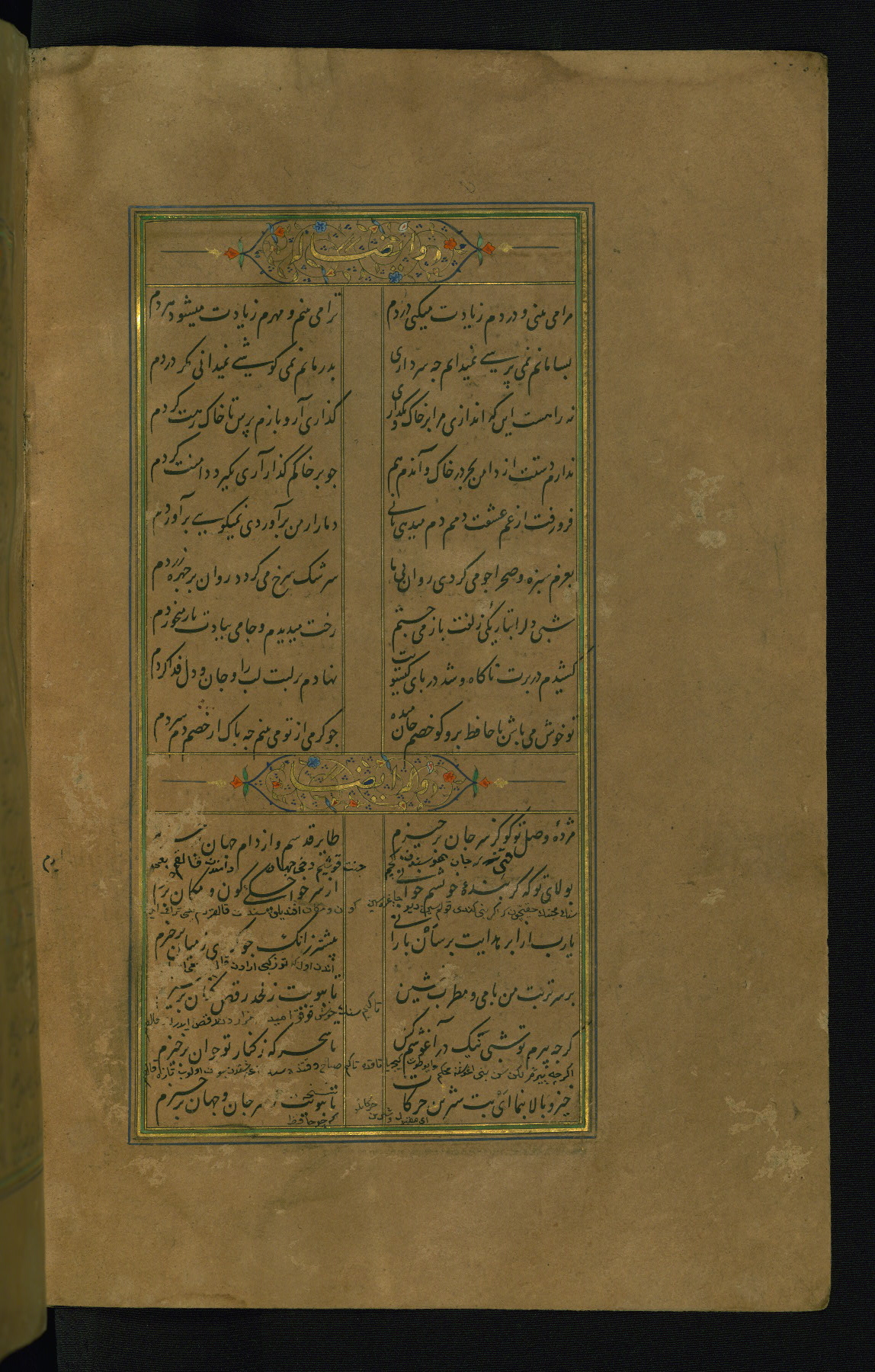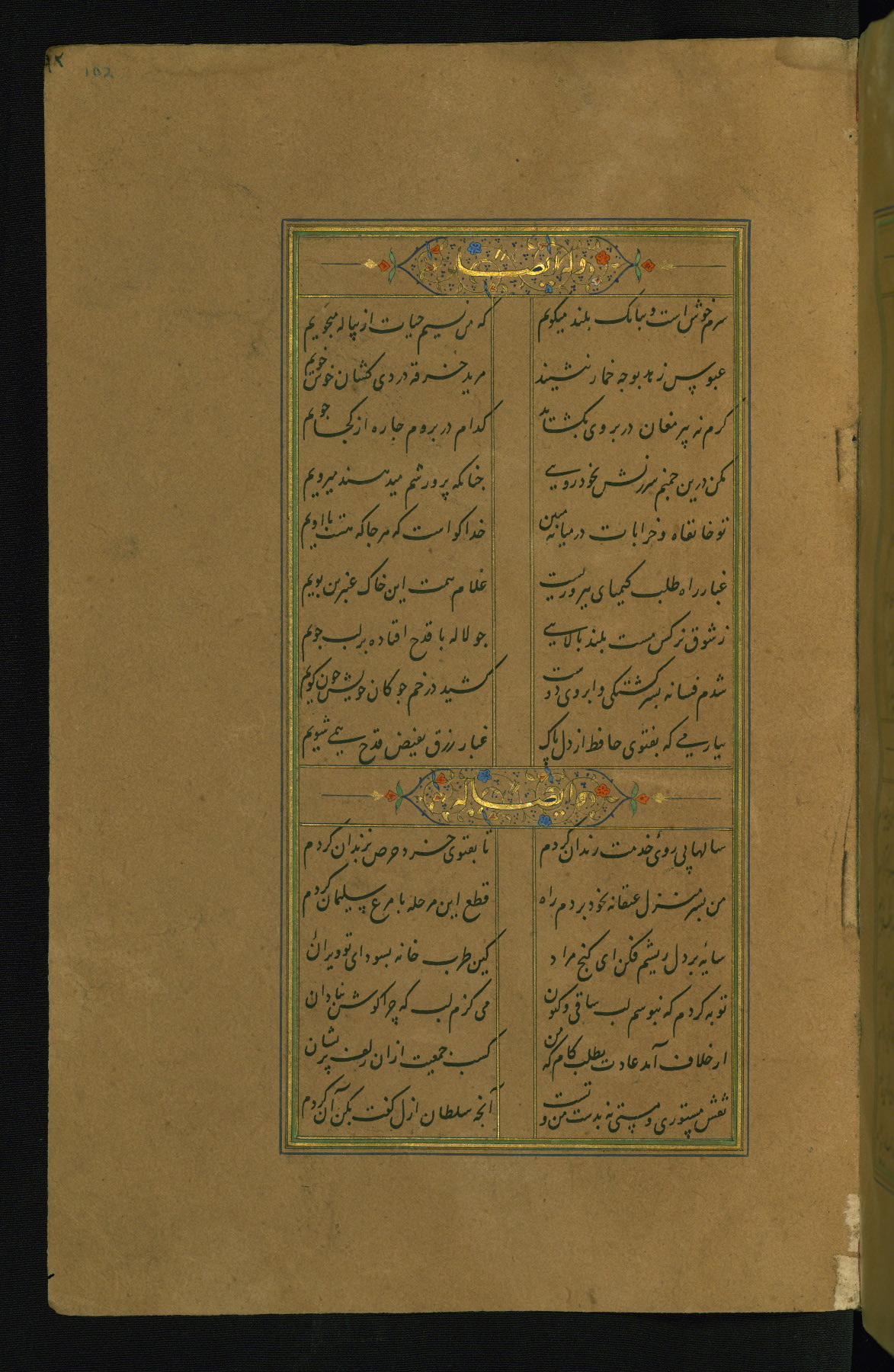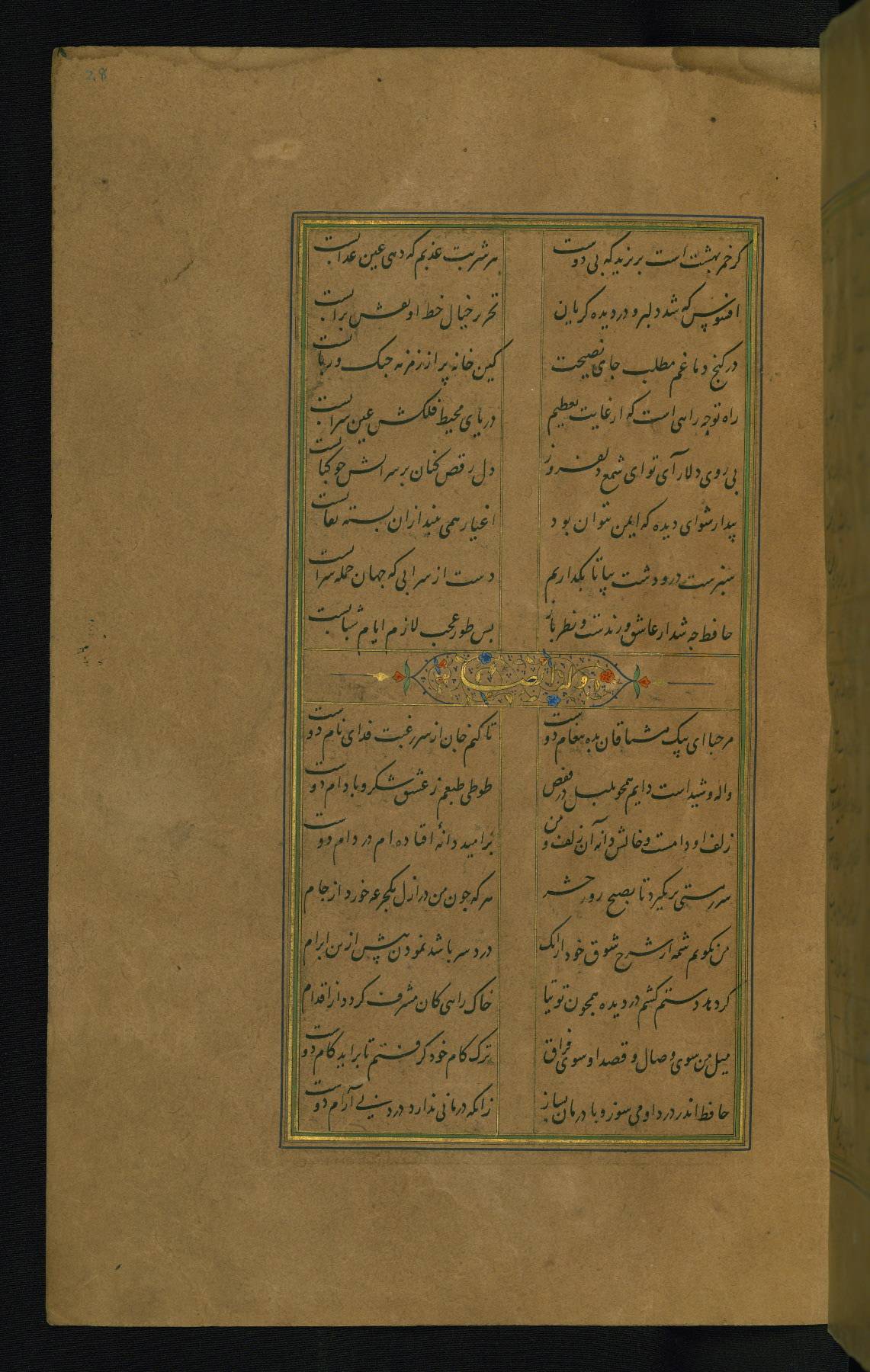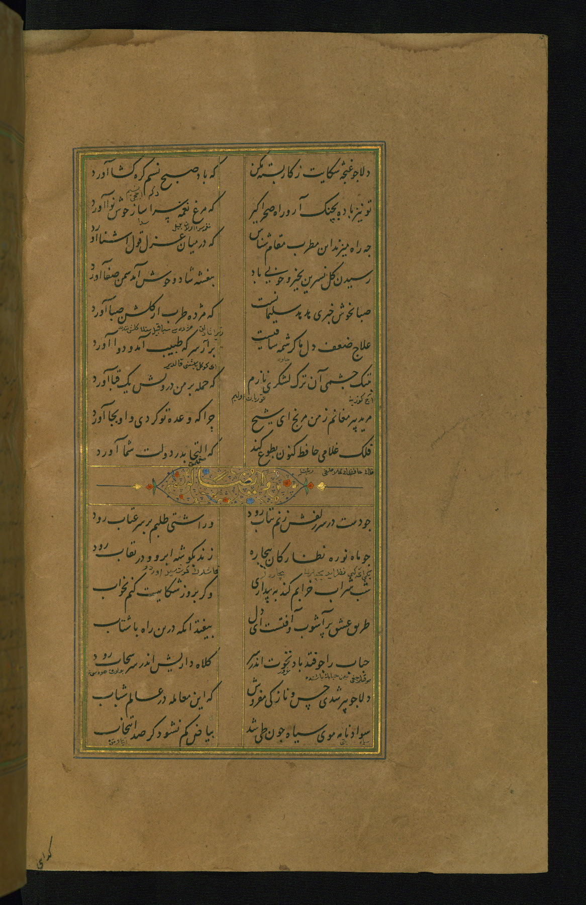 This is an illuminated and illustrated manuscript copy of the Collection of poems (dīvān) by Shams al-Dīn Muḥammad Ḥāfiz al-Shīrāzī (fl. eighth century AH / fourteenth CE). It was written in black nasta‘līq script with chapter/section headings in gold ink by Zayn al-‘Ābidīn ‘Abd al-Raḥmān al-Jāmī in 918 AH / 1512 CE in Safavid Iran. The manuscript opens with an illuminated medallion (fol. 1a), followed by a double-page illustrated frontispiece (fols. 1b-2a). The text begins with an incipit page with illuminated headpiece (fol. 2b). There are three additional illustrations (fols. 24a, 49b, and 87a). The red leather binding, which is not original and may be attributed to late twelfth-century AH / eighteenth CE or thirteenth-century AH / nineteenth CE Turkey, has a scalloped medallion with gold-tooled decoration and borders.