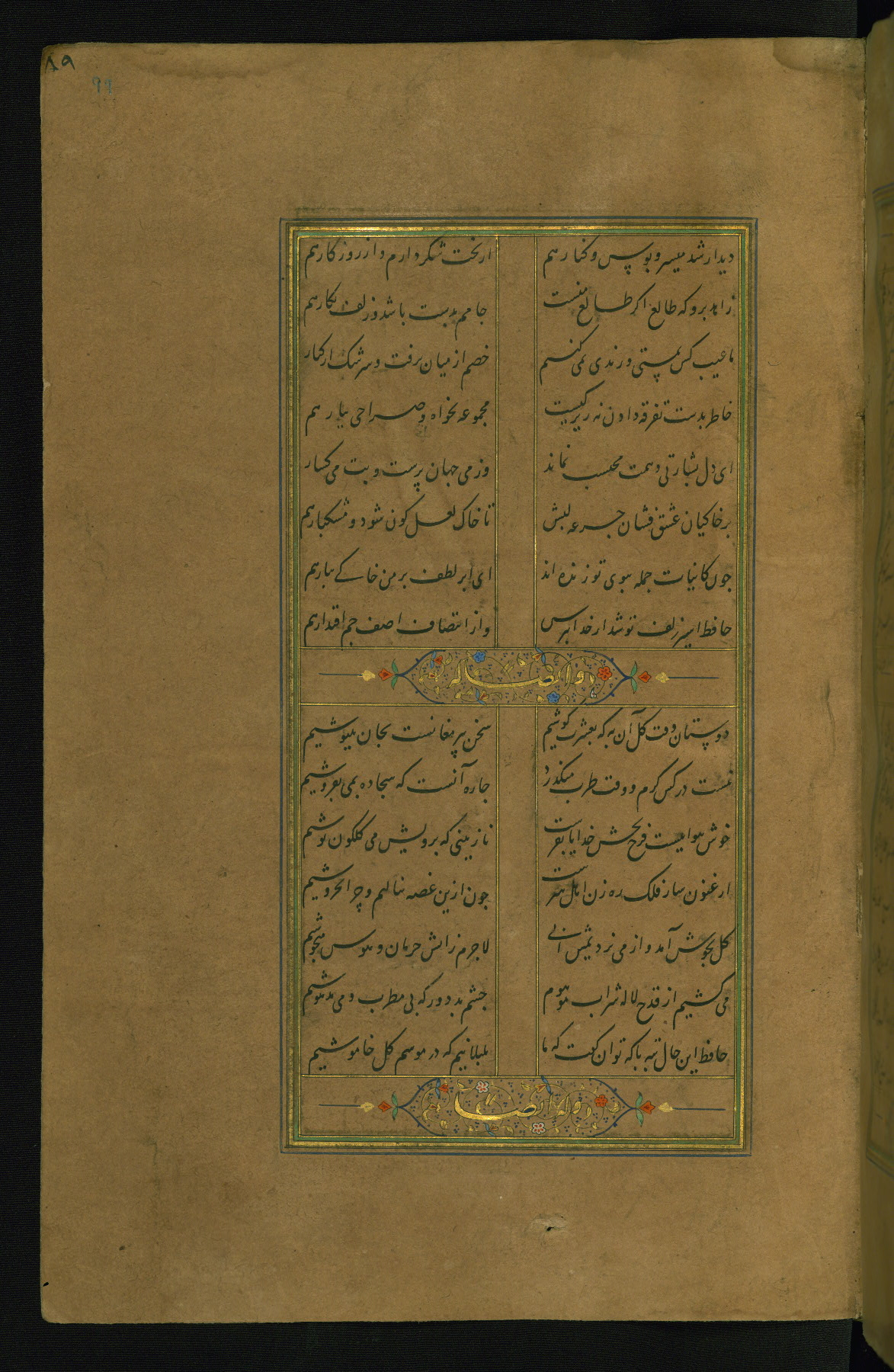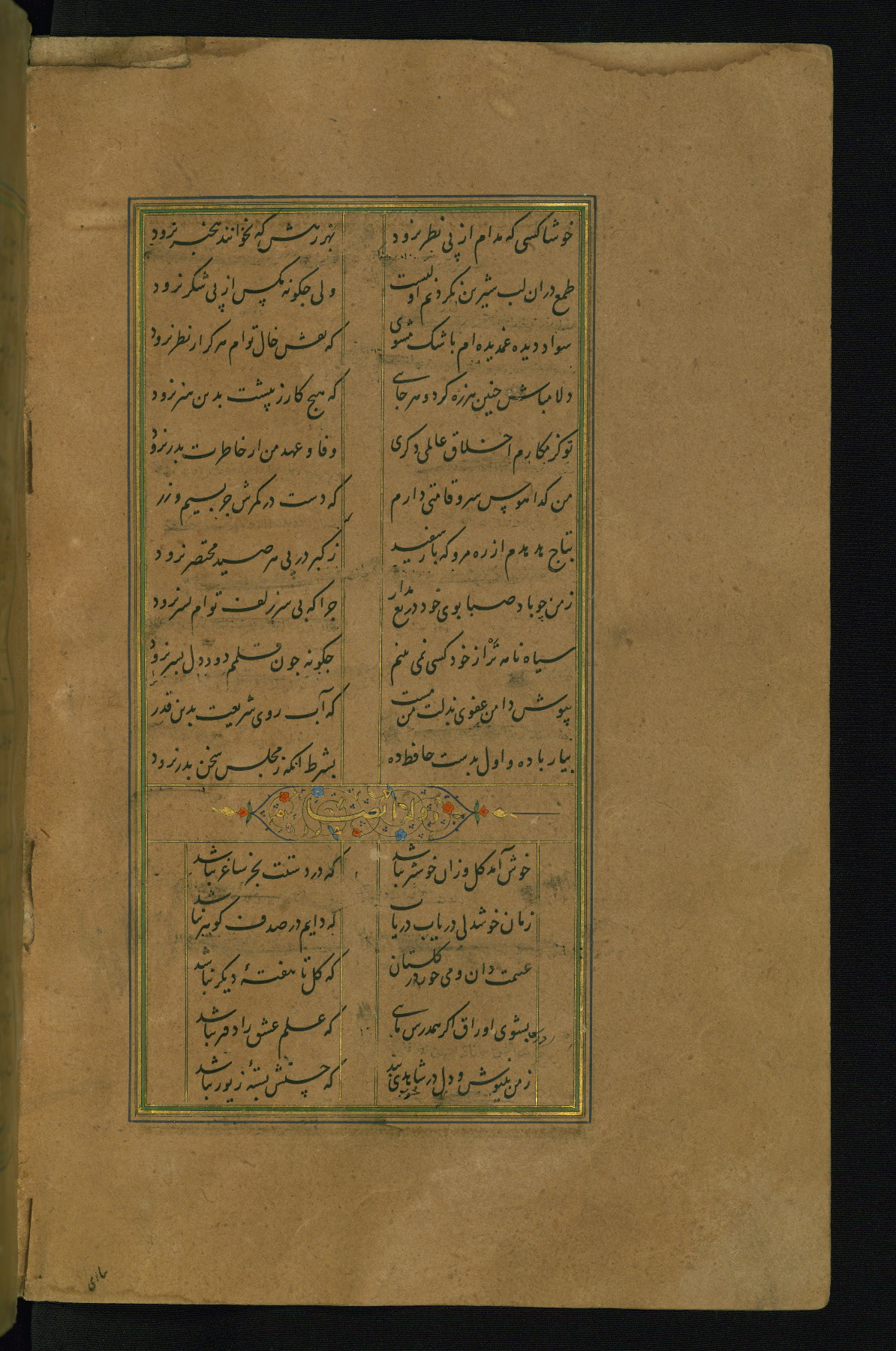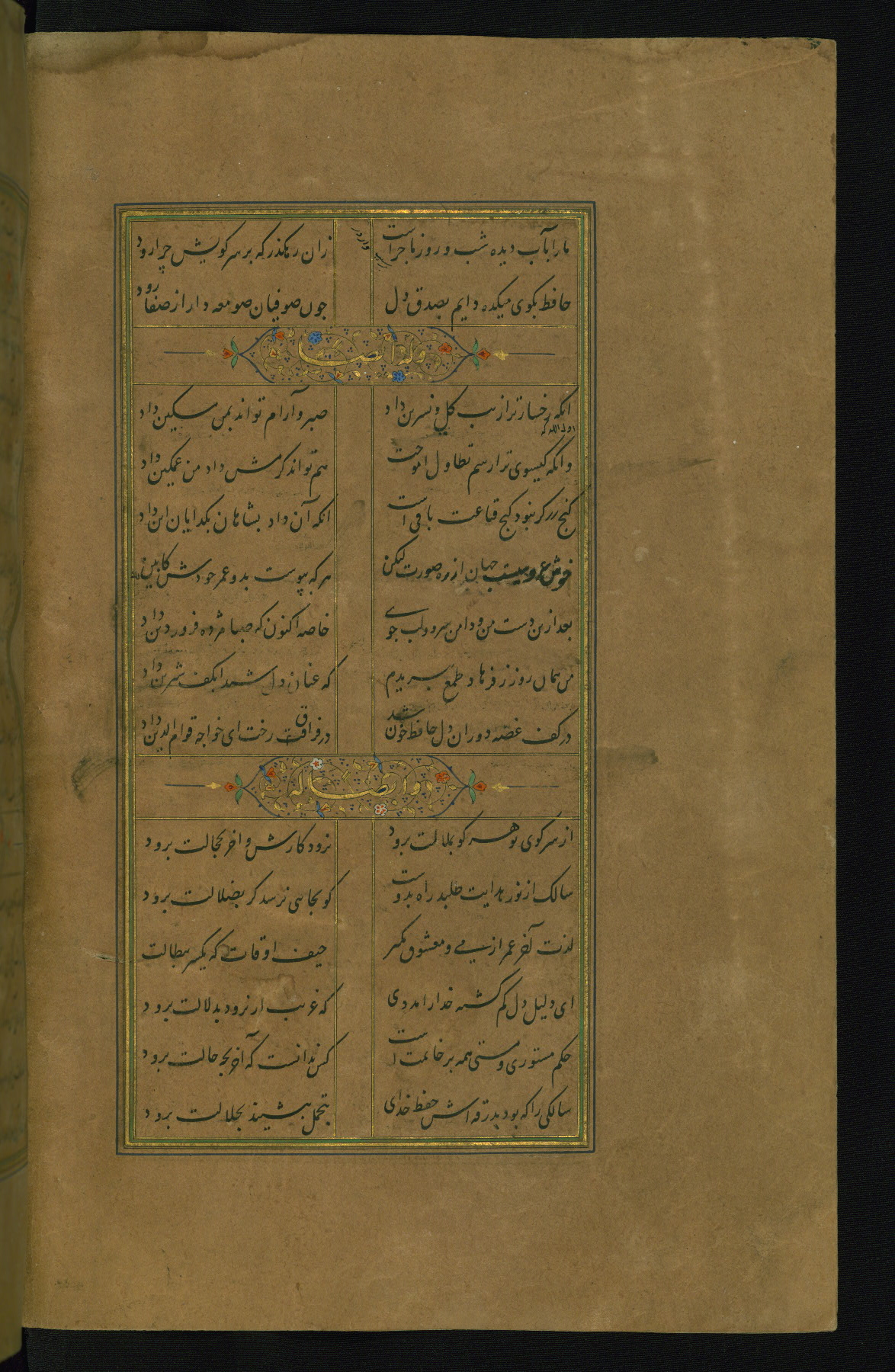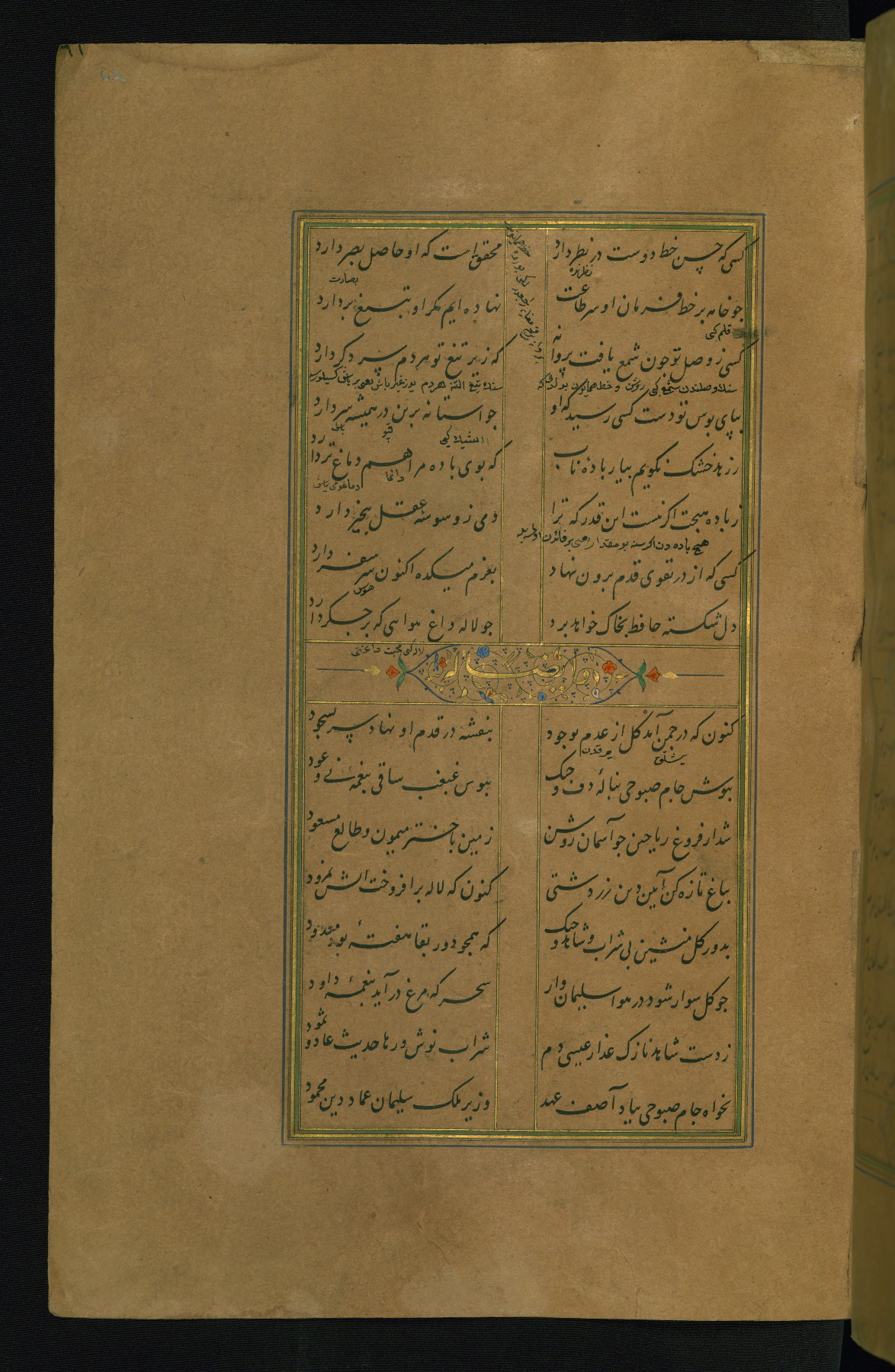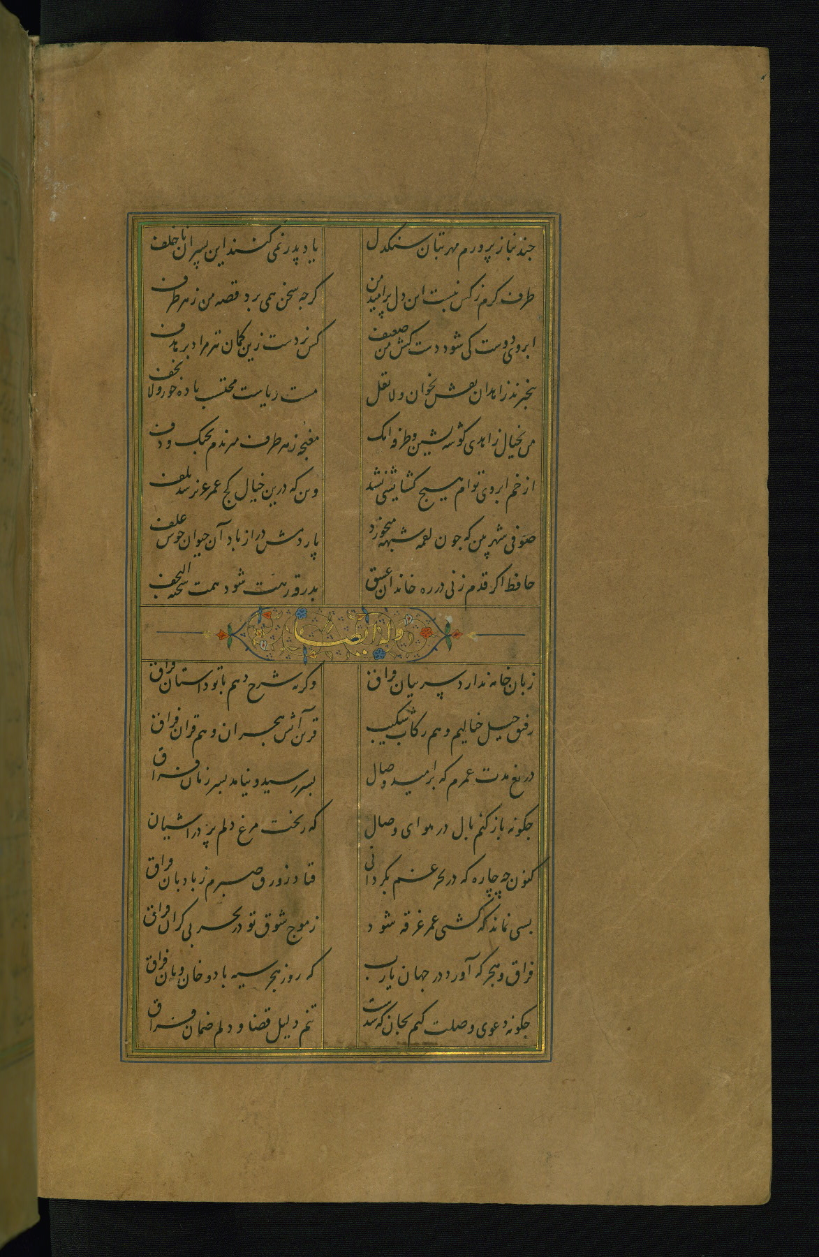 This is an illuminated and illustrated manuscript copy of the Collection of poems (dīvān) by Shams al-Dīn Muḥammad Ḥāfiz al-Shīrāzī (fl. eighth century AH / fourteenth CE). It was written in black nasta‘līq script with chapter/section headings in gold ink by Zayn al-‘Ābidīn ‘Abd al-Raḥmān al-Jāmī in 918 AH / 1512 CE in Safavid Iran. The manuscript opens with an illuminated medallion (fol. 1a), followed by a double-page illustrated frontispiece (fols. 1b-2a). The text begins with an incipit page with illuminated headpiece (fol. 2b). There are three additional illustrations (fols. 24a, 49b, and 87a). The red leather binding, which is not original and may be attributed to late twelfth-century AH / eighteenth CE or thirteenth-century AH / nineteenth CE Turkey, has a scalloped medallion with gold-tooled decoration and borders.