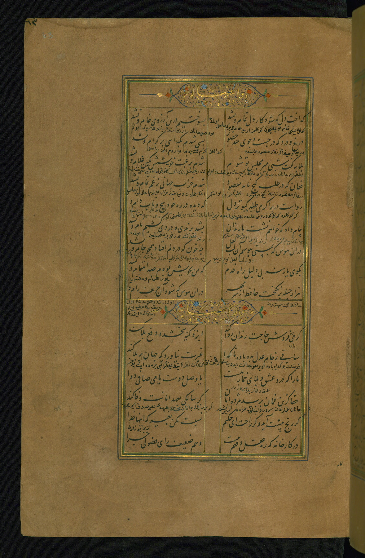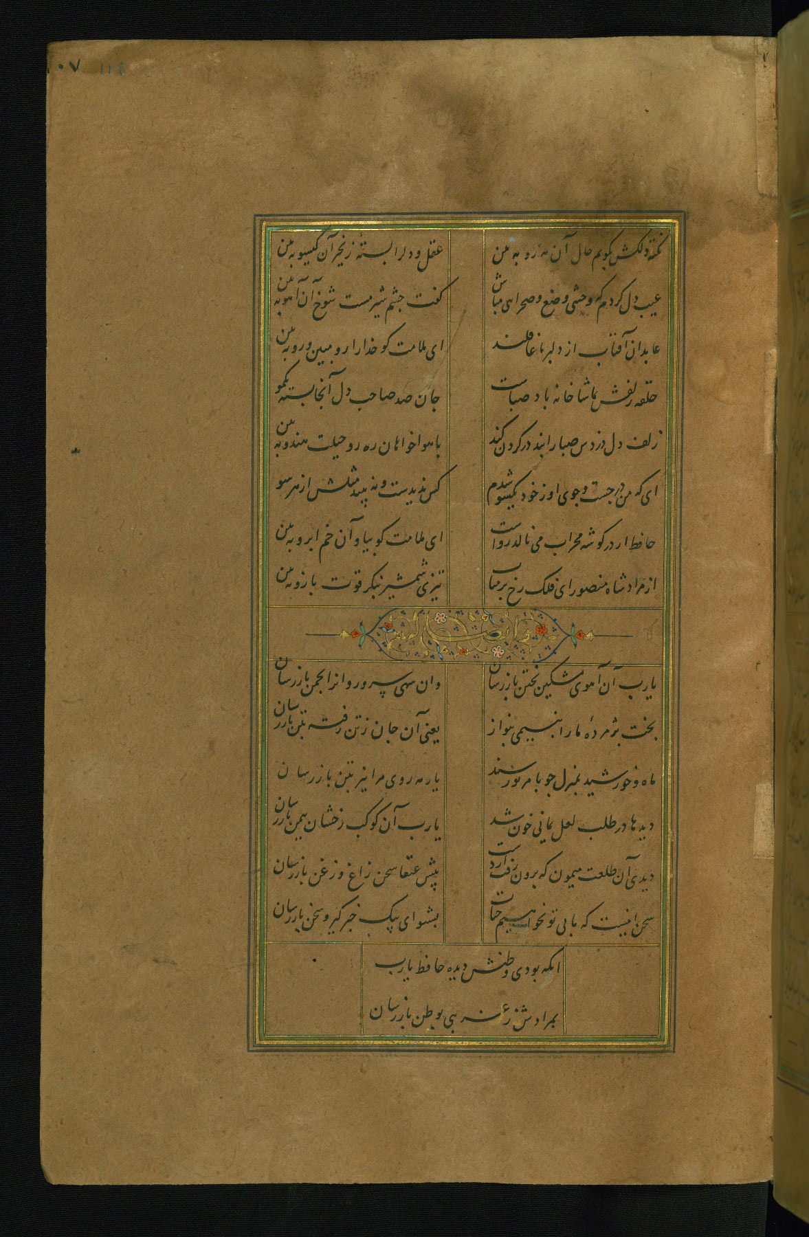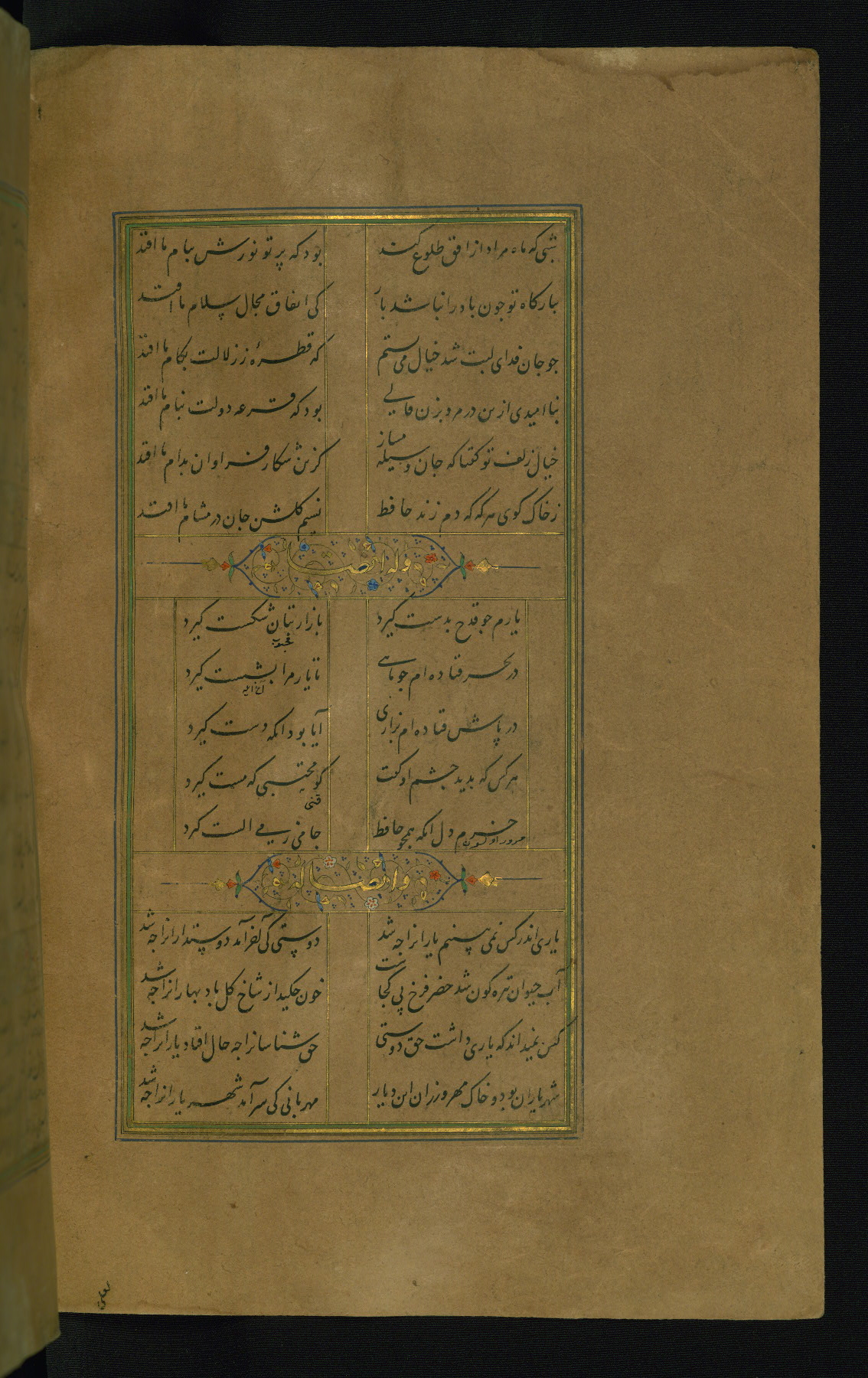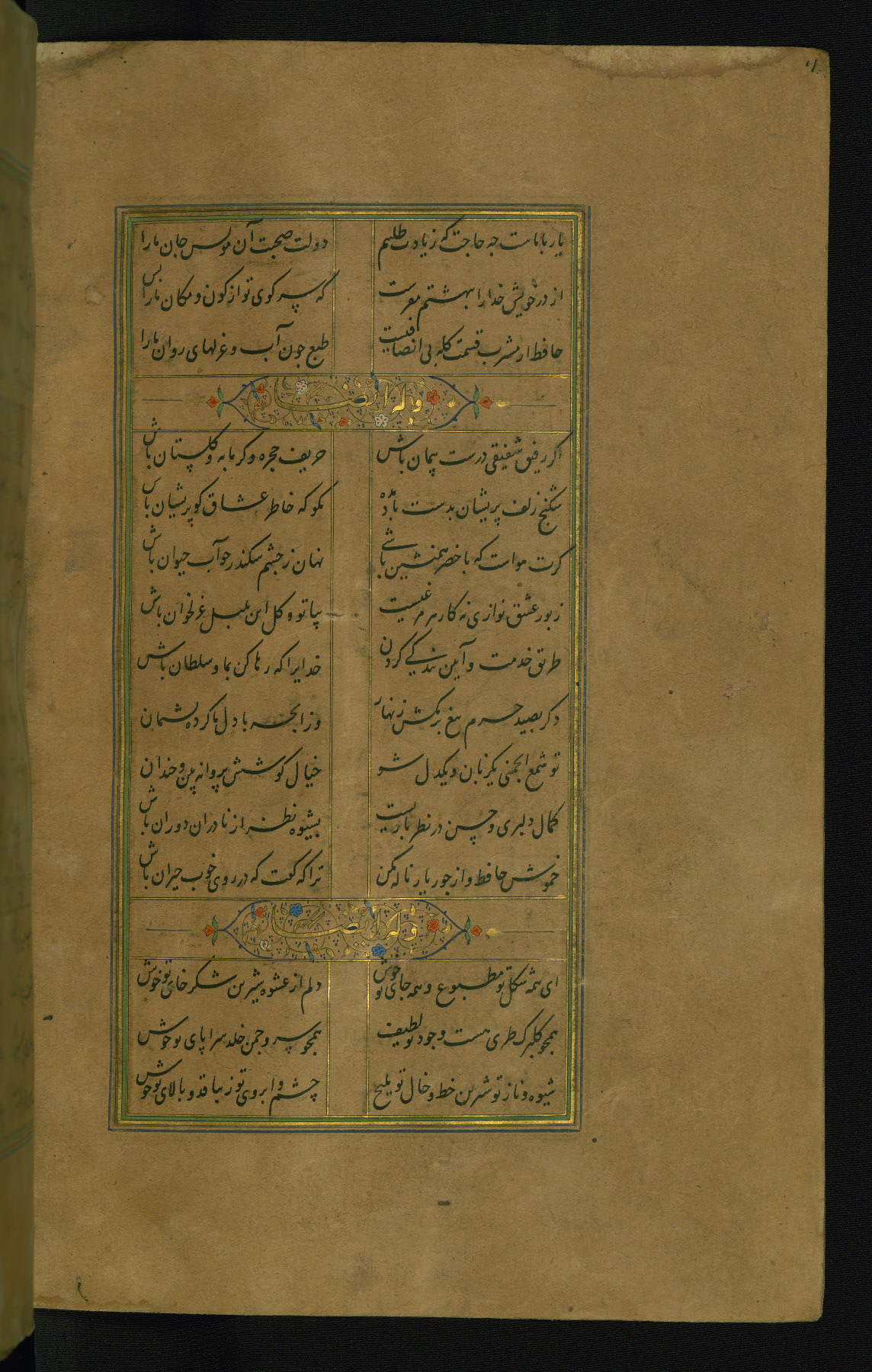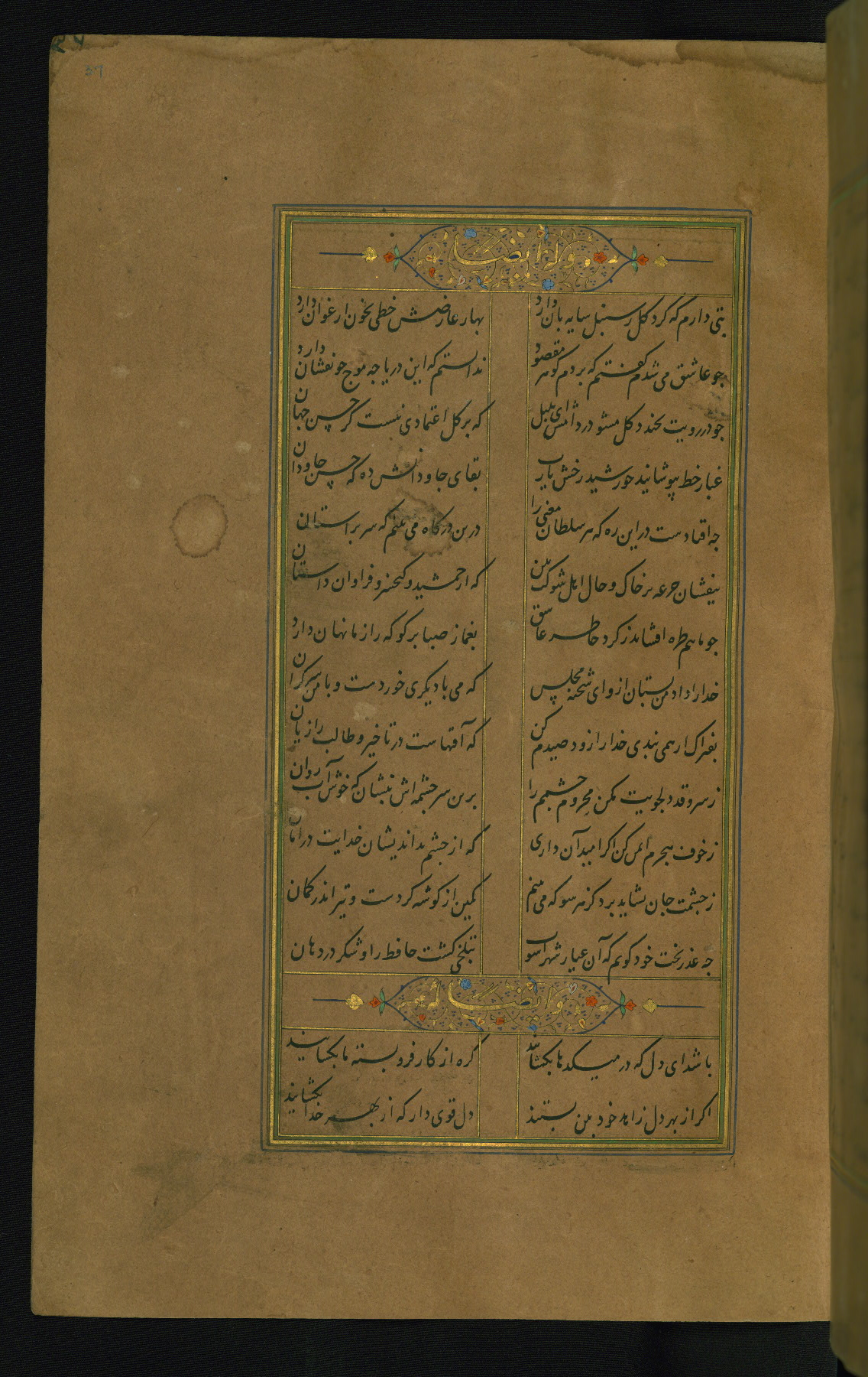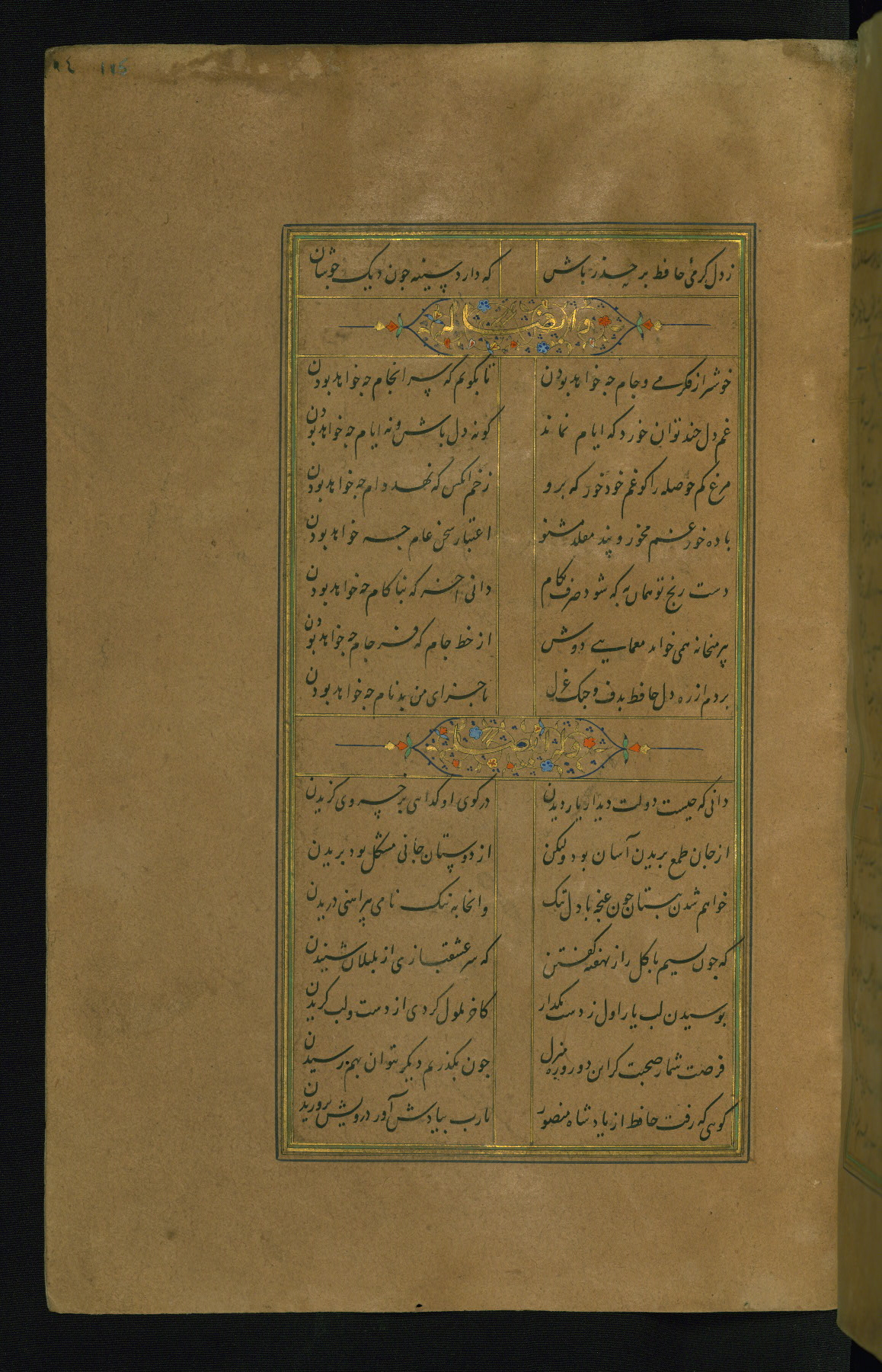This is an illuminated and illustrated manuscript copy of the Collection of poems (dīvān) by Shams al-Dīn Muḥammad Ḥāfiz al-Shīrāzī (fl. eighth century AH / fourteenth CE). It was written in black nasta‘līq script with chapter/section headings in gold ink by Zayn al-‘Ābidīn ‘Abd al-Raḥmān al-Jāmī in 918 AH / 1512 CE in Safavid Iran. The manuscript opens with an illuminated medallion (fol. 1a), followed by a double-page illustrated frontispiece (fols. 1b-2a). The text begins with an incipit page with illuminated headpiece (fol. 2b). There are three additional illustrations (fols. 24a, 49b, and 87a). The red leather binding, which is not original and may be attributed to late twelfth-century AH / eighteenth CE or thirteenth-century AH / nineteenth CE Turkey, has a scalloped medallion with gold-tooled decoration and borders.