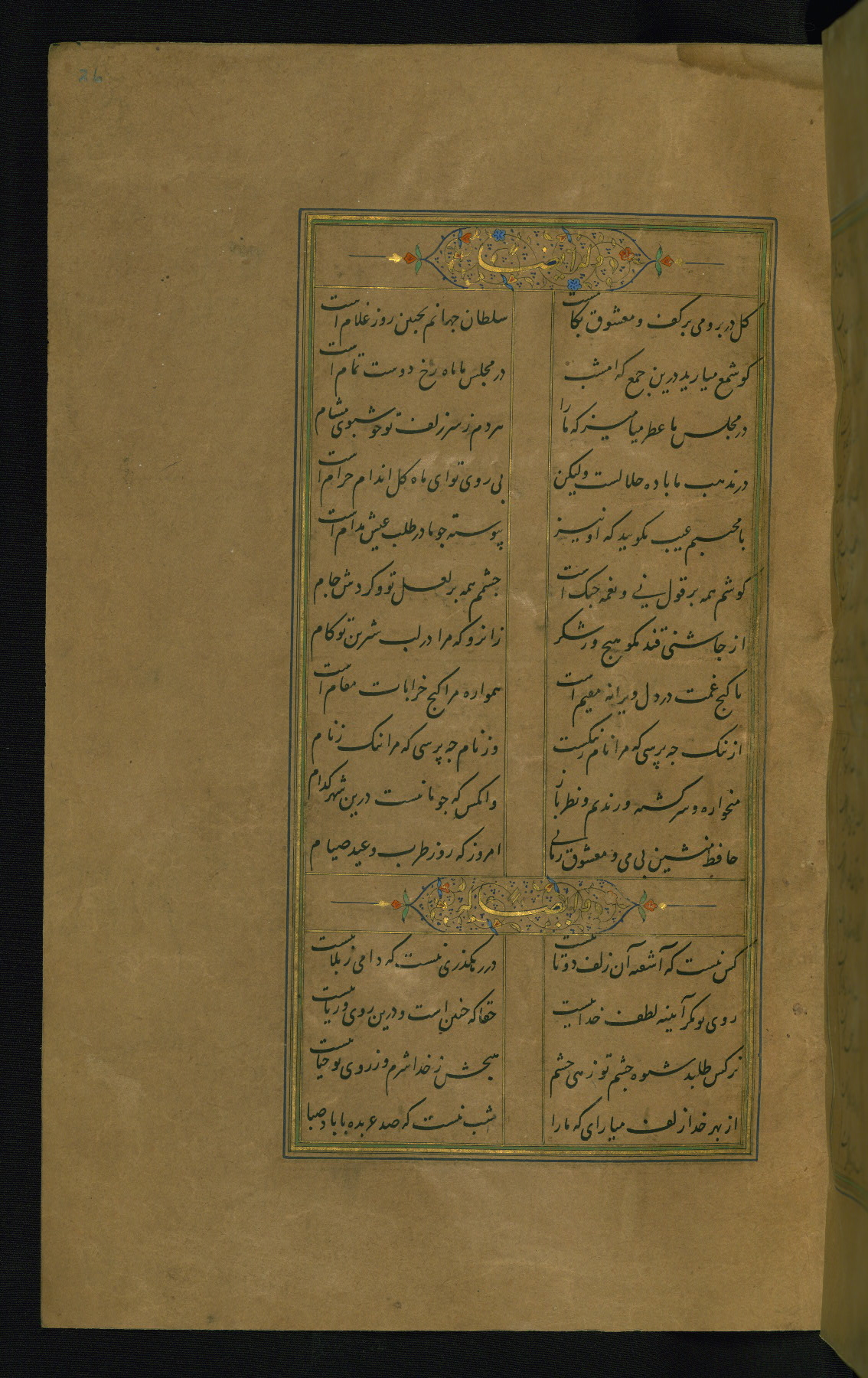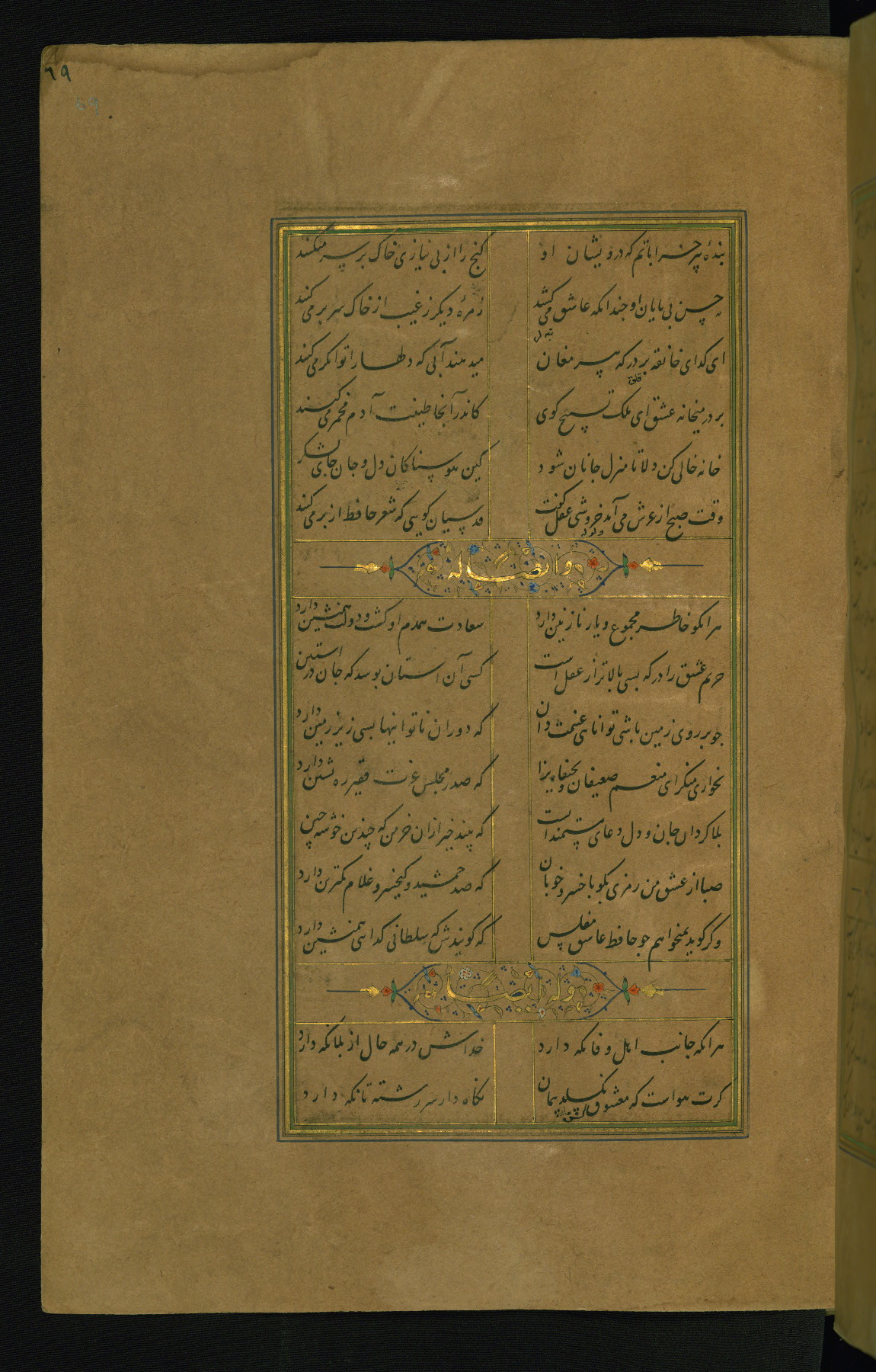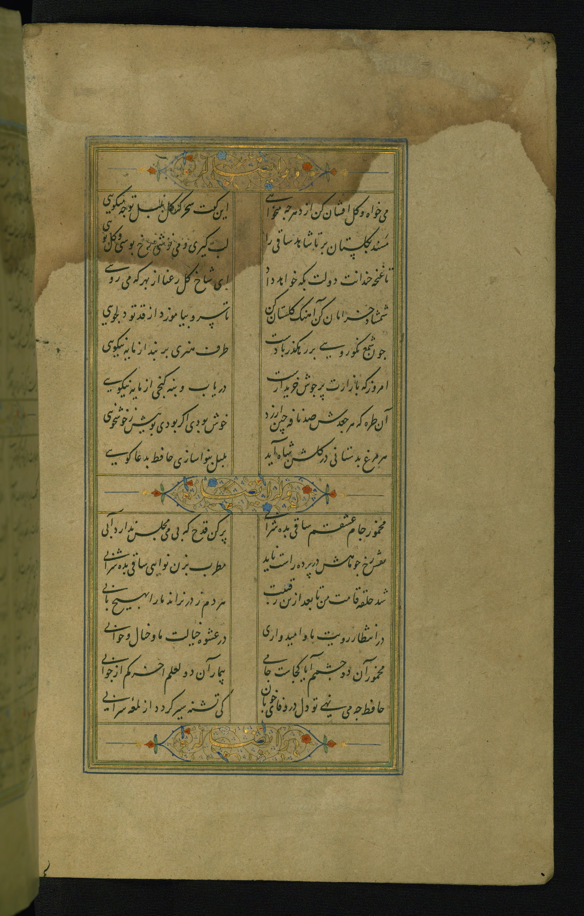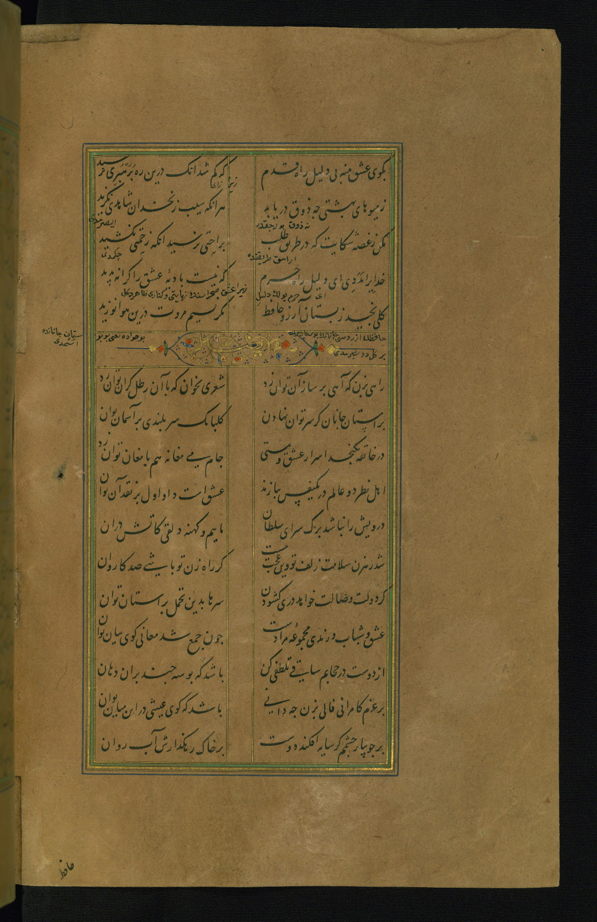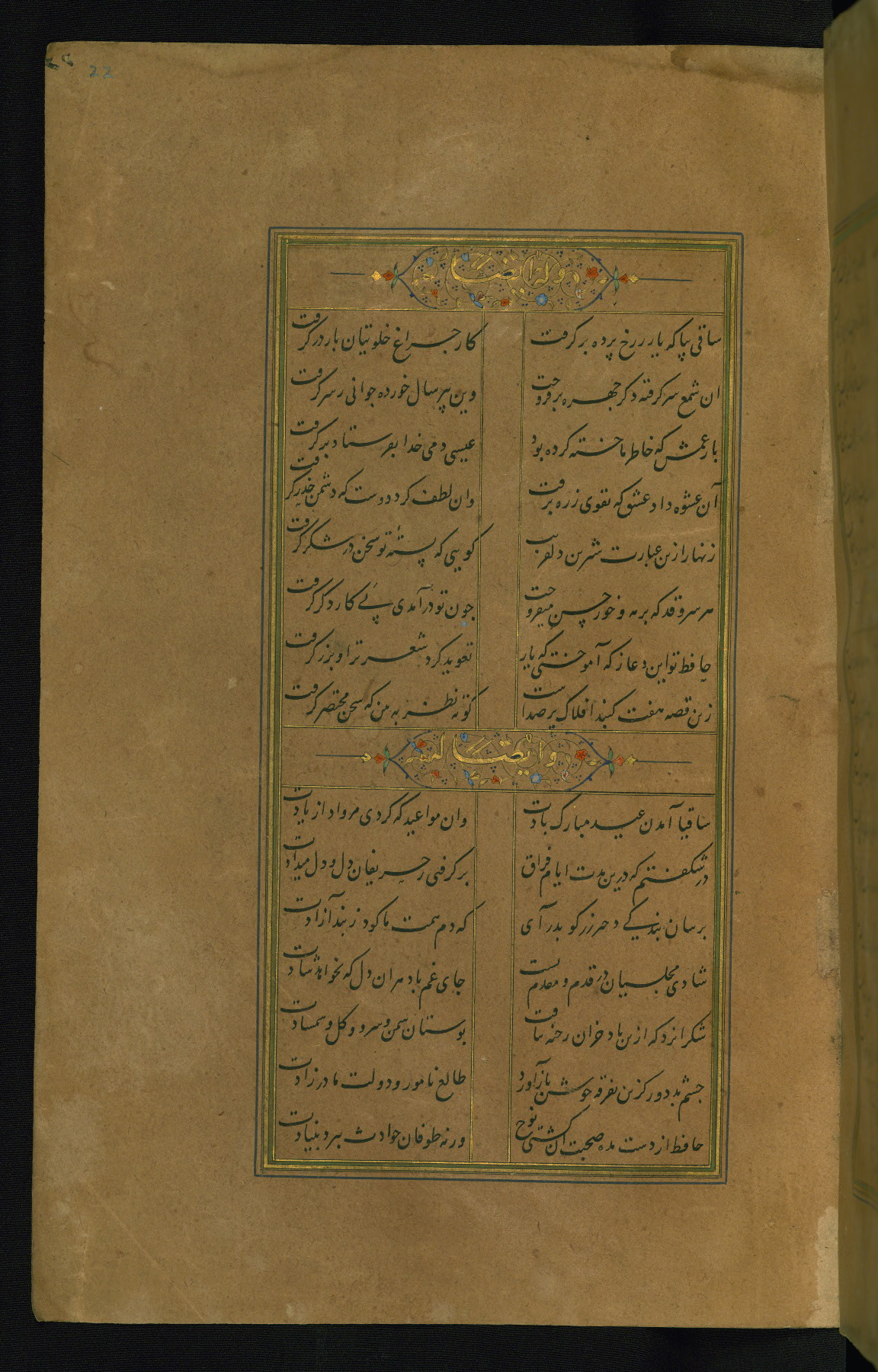 This is an illuminated and illustrated manuscript copy of the Collection of poems (dīvān) by Shams al-Dīn Muḥammad Ḥāfiz al-Shīrāzī (fl. eighth century AH / fourteenth CE). It was written in black nasta‘līq script with chapter/section headings in gold ink by Zayn al-‘Ābidīn ‘Abd al-Raḥmān al-Jāmī in 918 AH / 1512 CE in Safavid Iran. The manuscript opens with an illuminated medallion (fol. 1a), followed by a double-page illustrated frontispiece (fols. 1b-2a). The text begins with an incipit page with illuminated headpiece (fol. 2b). There are three additional illustrations (fols. 24a, 49b, and 87a). The red leather binding, which is not original and may be attributed to late twelfth-century AH / eighteenth CE or thirteenth-century AH / nineteenth CE Turkey, has a scalloped medallion with gold-tooled decoration and borders.