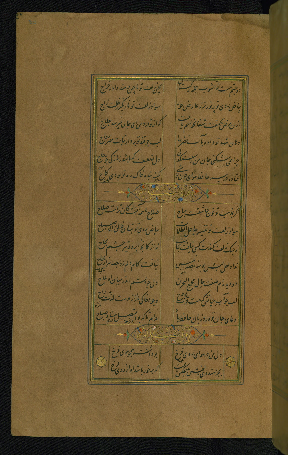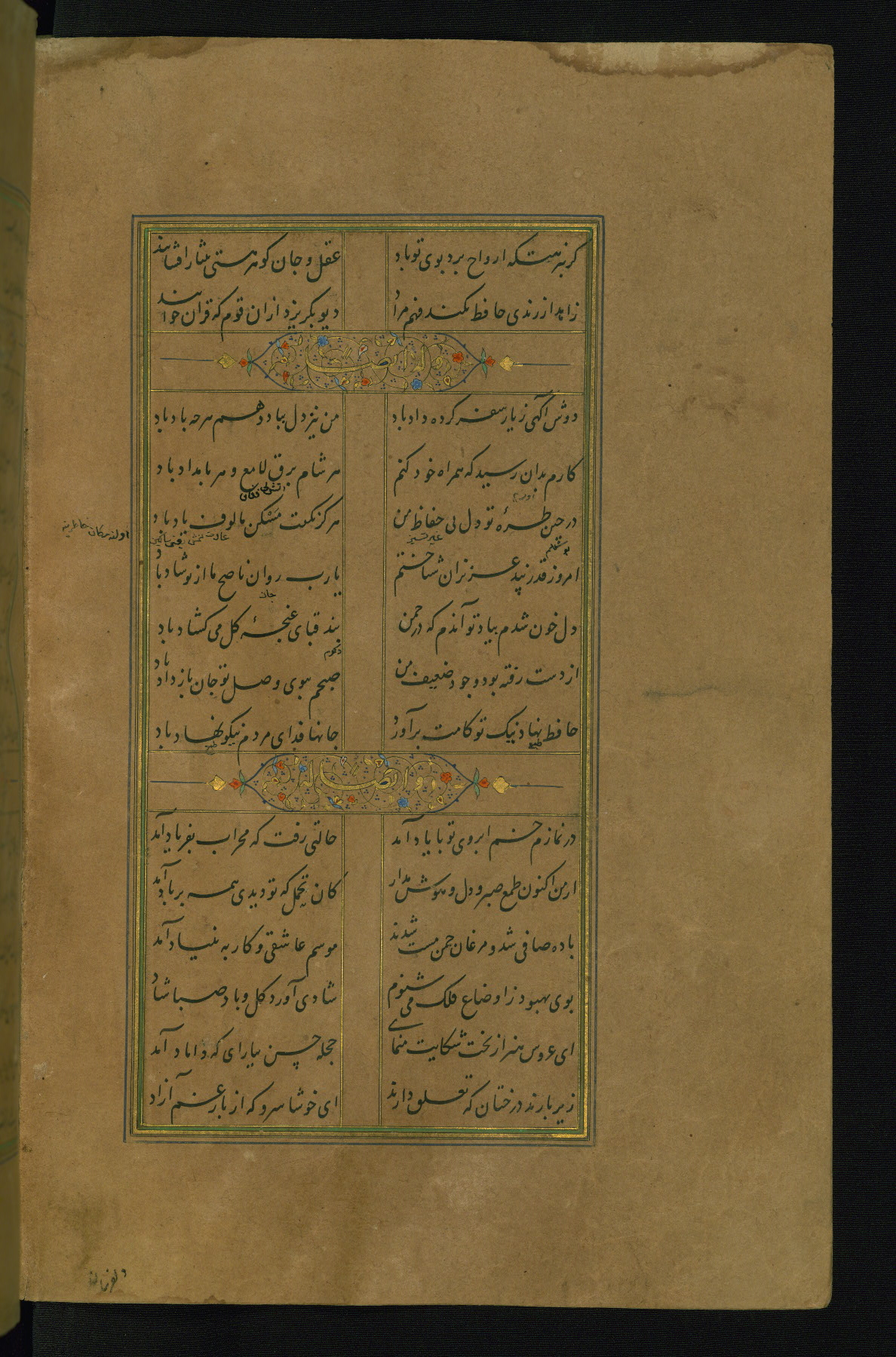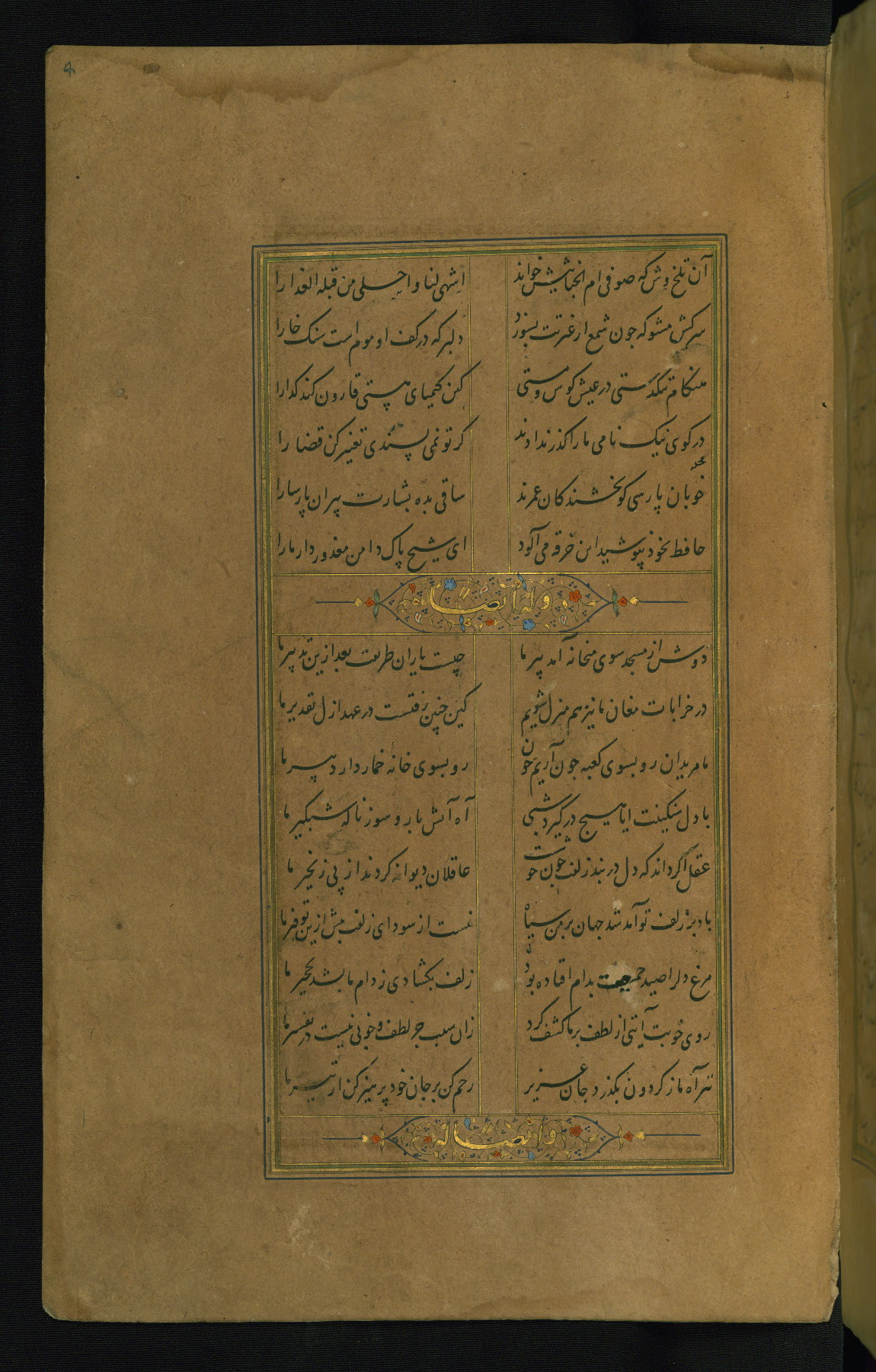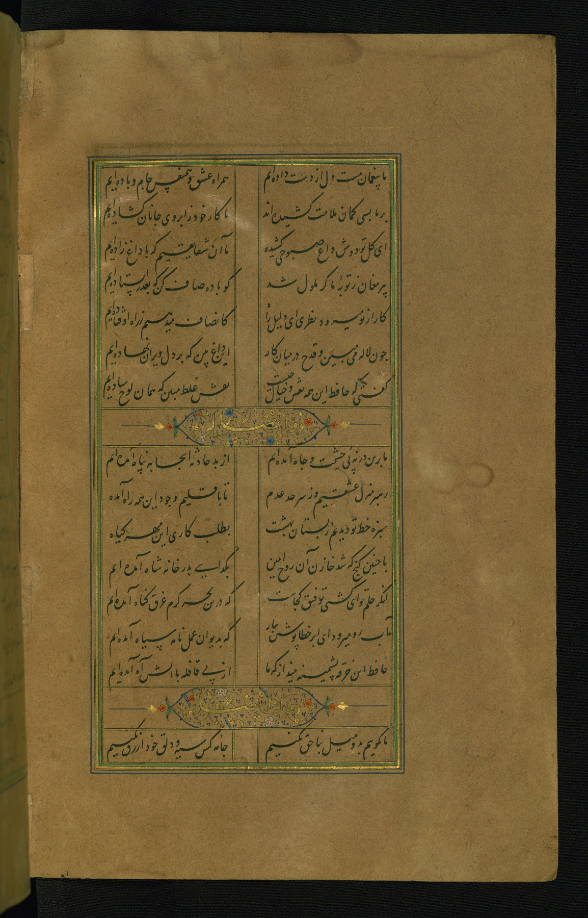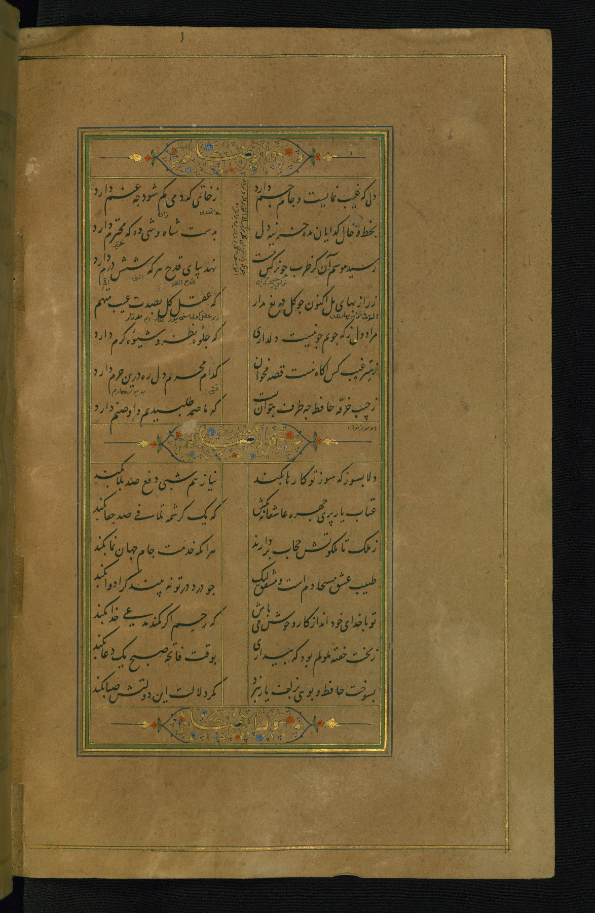 This is an illuminated and illustrated manuscript copy of the Collection of poems (dīvān) by Shams al-Dīn Muḥammad Ḥāfiz al-Shīrāzī (fl. eighth century AH / fourteenth CE). It was written in black nasta‘līq script with chapter/section headings in gold ink by Zayn al-‘Ābidīn ‘Abd al-Raḥmān al-Jāmī in 918 AH / 1512 CE in Safavid Iran. The manuscript opens with an illuminated medallion (fol. 1a), followed by a double-page illustrated frontispiece (fols. 1b-2a). The text begins with an incipit page with illuminated headpiece (fol. 2b). There are three additional illustrations (fols. 24a, 49b, and 87a). The red leather binding, which is not original and may be attributed to late twelfth-century AH / eighteenth CE or thirteenth-century AH / nineteenth CE Turkey, has a scalloped medallion with gold-tooled decoration and borders.