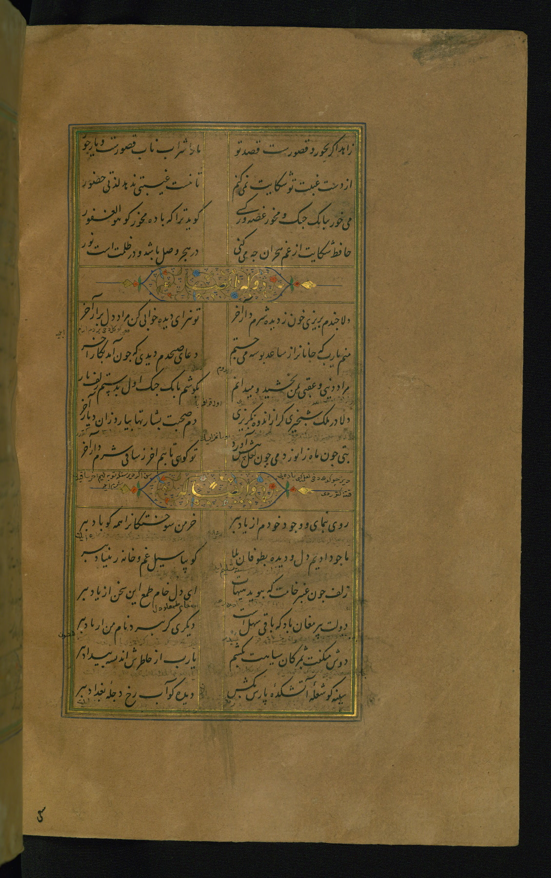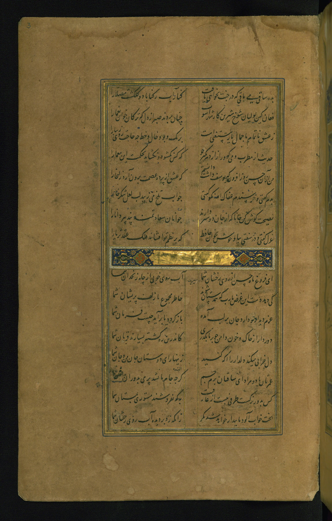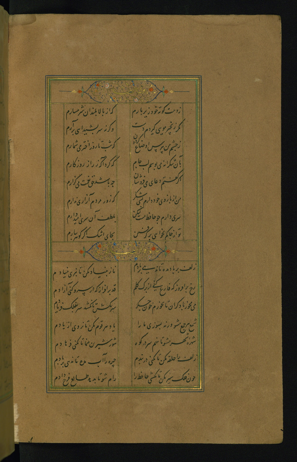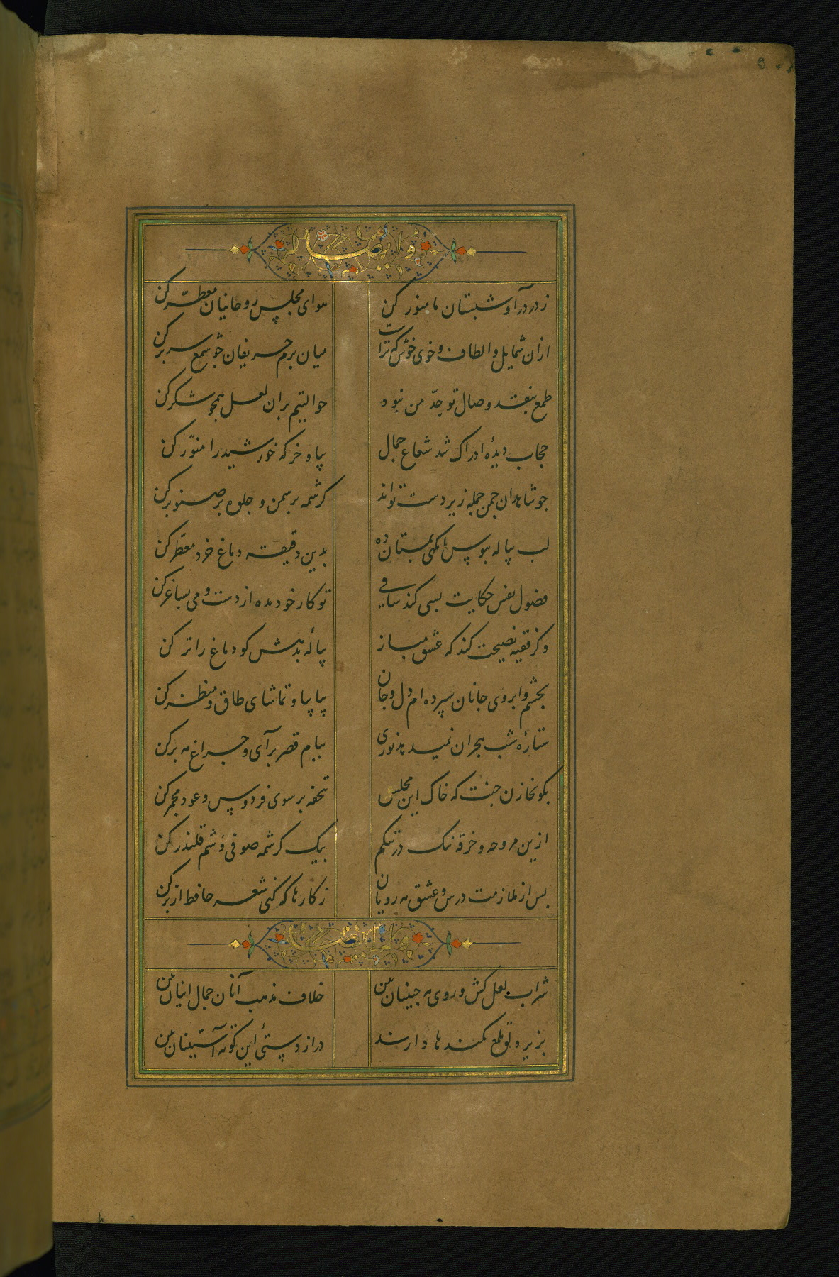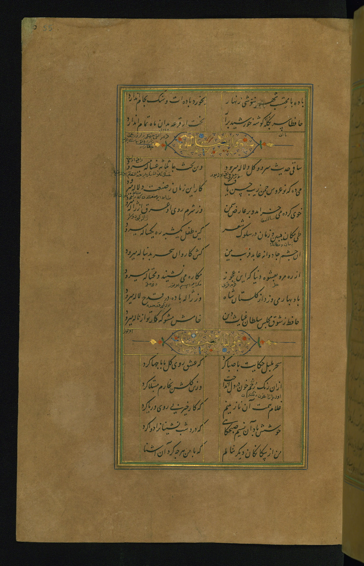 This is an illuminated and illustrated manuscript copy of the Collection of poems (dīvān) by Shams al-Dīn Muḥammad Ḥāfiz al-Shīrāzī (fl. eighth century AH / fourteenth CE). It was written in black nasta‘līq script with chapter/section headings in gold ink by Zayn al-‘Ābidīn ‘Abd al-Raḥmān al-Jāmī in 918 AH / 1512 CE in Safavid Iran. The manuscript opens with an illuminated medallion (fol. 1a), followed by a double-page illustrated frontispiece (fols. 1b-2a). The text begins with an incipit page with illuminated headpiece (fol. 2b). There are three additional illustrations (fols. 24a, 49b, and 87a). The red leather binding, which is not original and may be attributed to late twelfth-century AH / eighteenth CE or thirteenth-century AH / nineteenth CE Turkey, has a scalloped medallion with gold-tooled decoration and borders.
