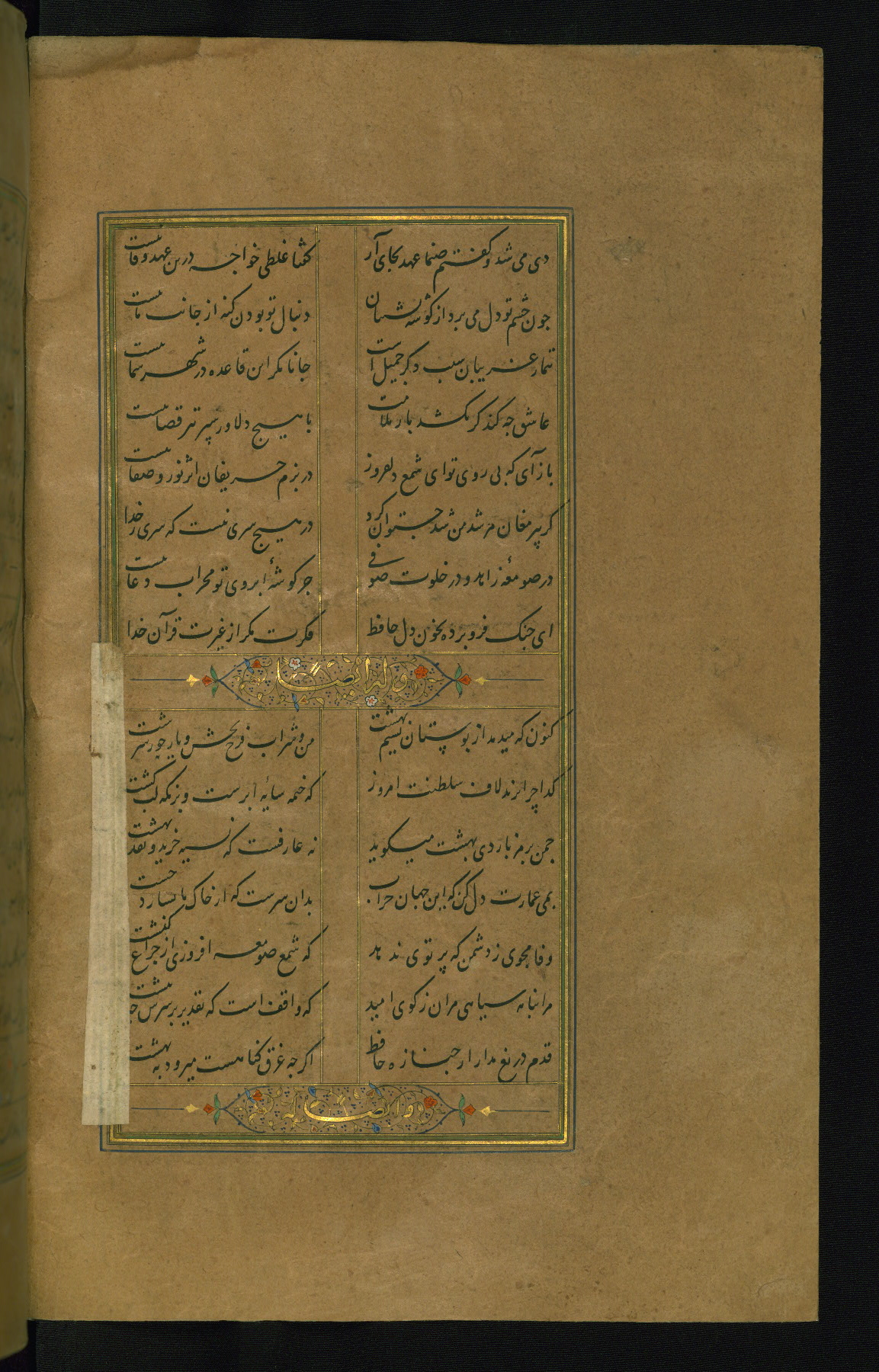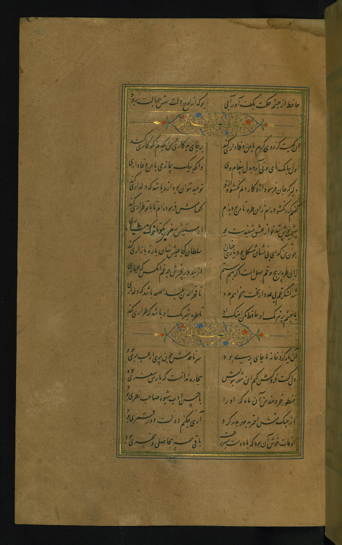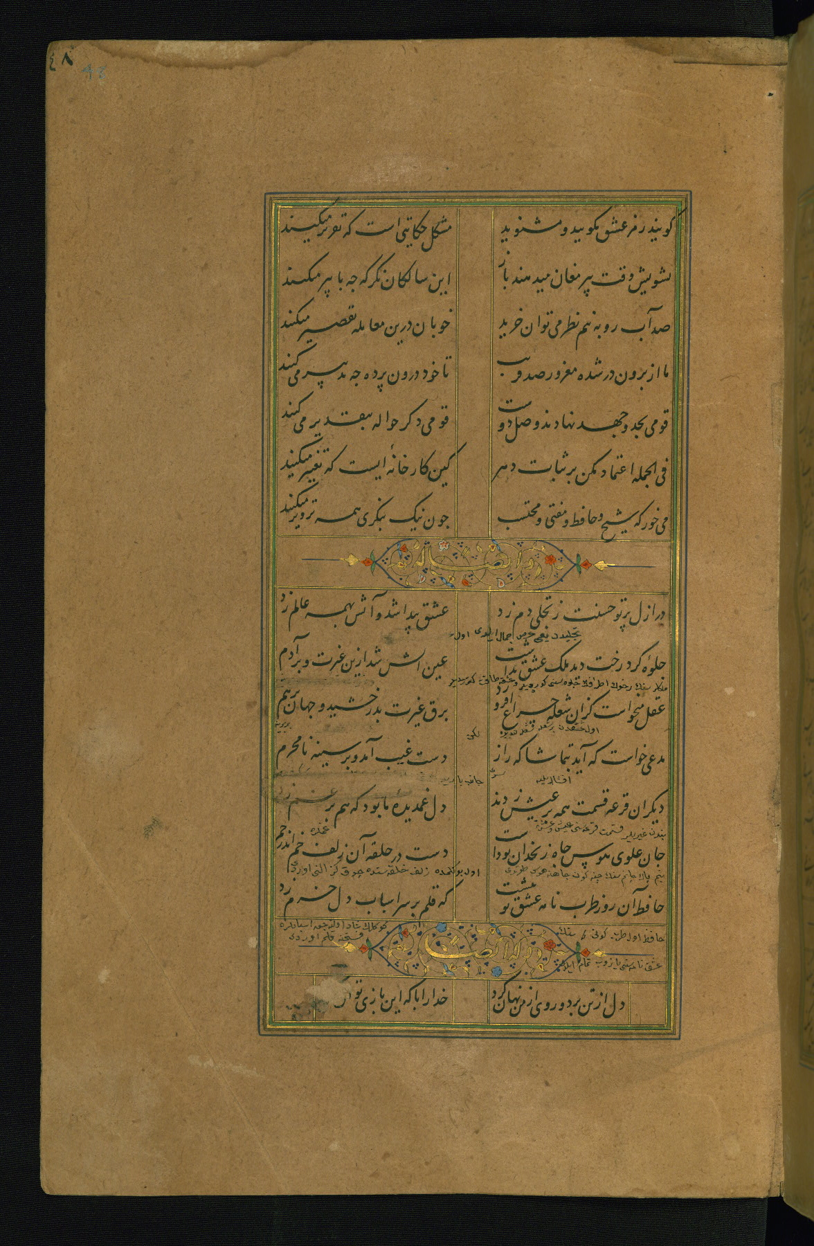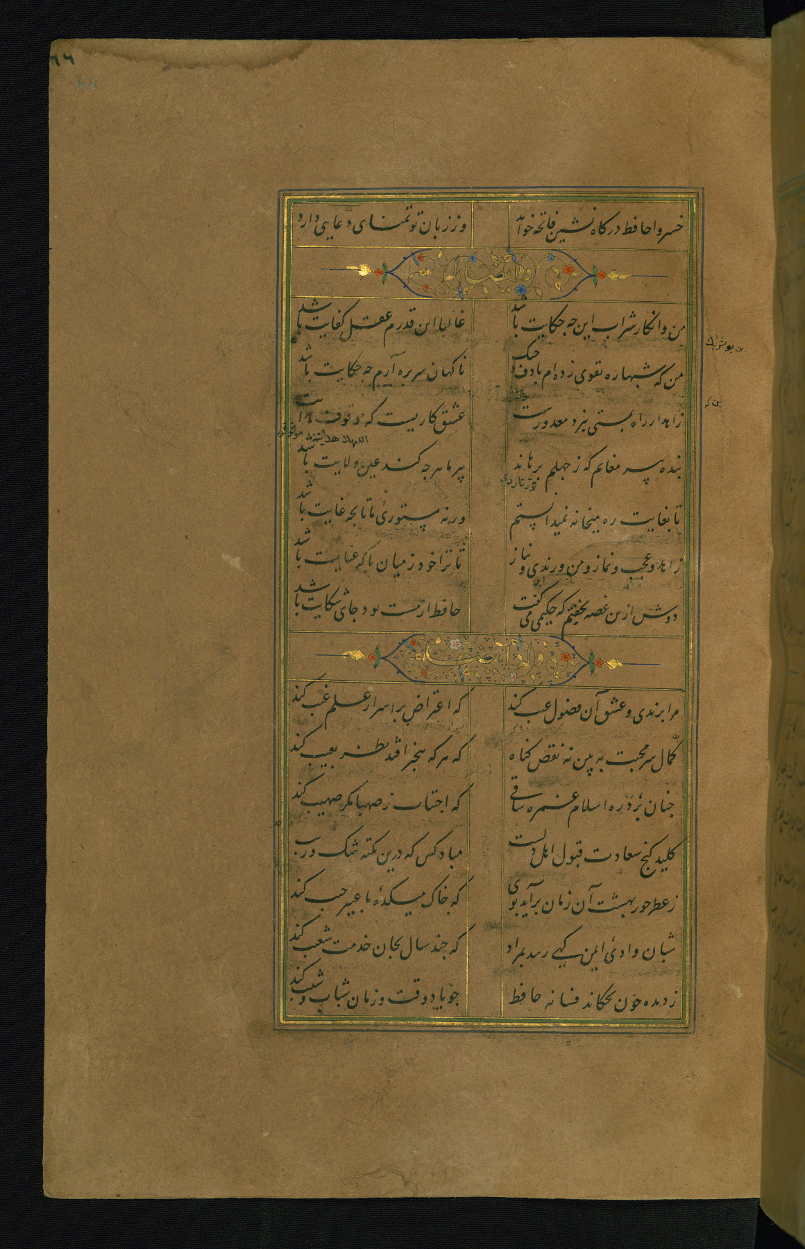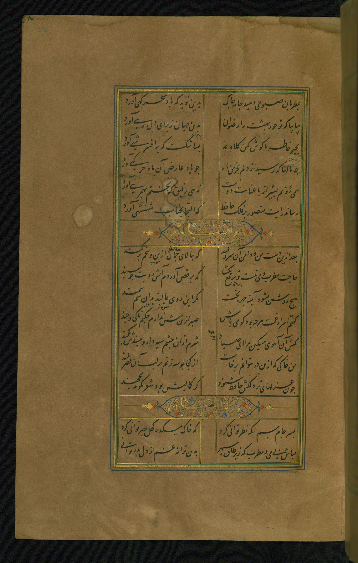 This is an illuminated and illustrated manuscript copy of the Collection of poems (dīvān) by Shams al-Dīn Muḥammad Ḥāfiz al-Shīrāzī (fl. eighth century AH / fourteenth CE). It was written in black nasta‘līq script with chapter/section headings in gold ink by Zayn al-‘Ābidīn ‘Abd al-Raḥmān al-Jāmī in 918 AH / 1512 CE in Safavid Iran. The manuscript opens with an illuminated medallion (fol. 1a), followed by a double-page illustrated frontispiece (fols. 1b-2a). The text begins with an incipit page with illuminated headpiece (fol. 2b). There are three additional illustrations (fols. 24a, 49b, and 87a). The red leather binding, which is not original and may be attributed to late twelfth-century AH / eighteenth CE or thirteenth-century AH / nineteenth CE Turkey, has a scalloped medallion with gold-tooled decoration and borders.