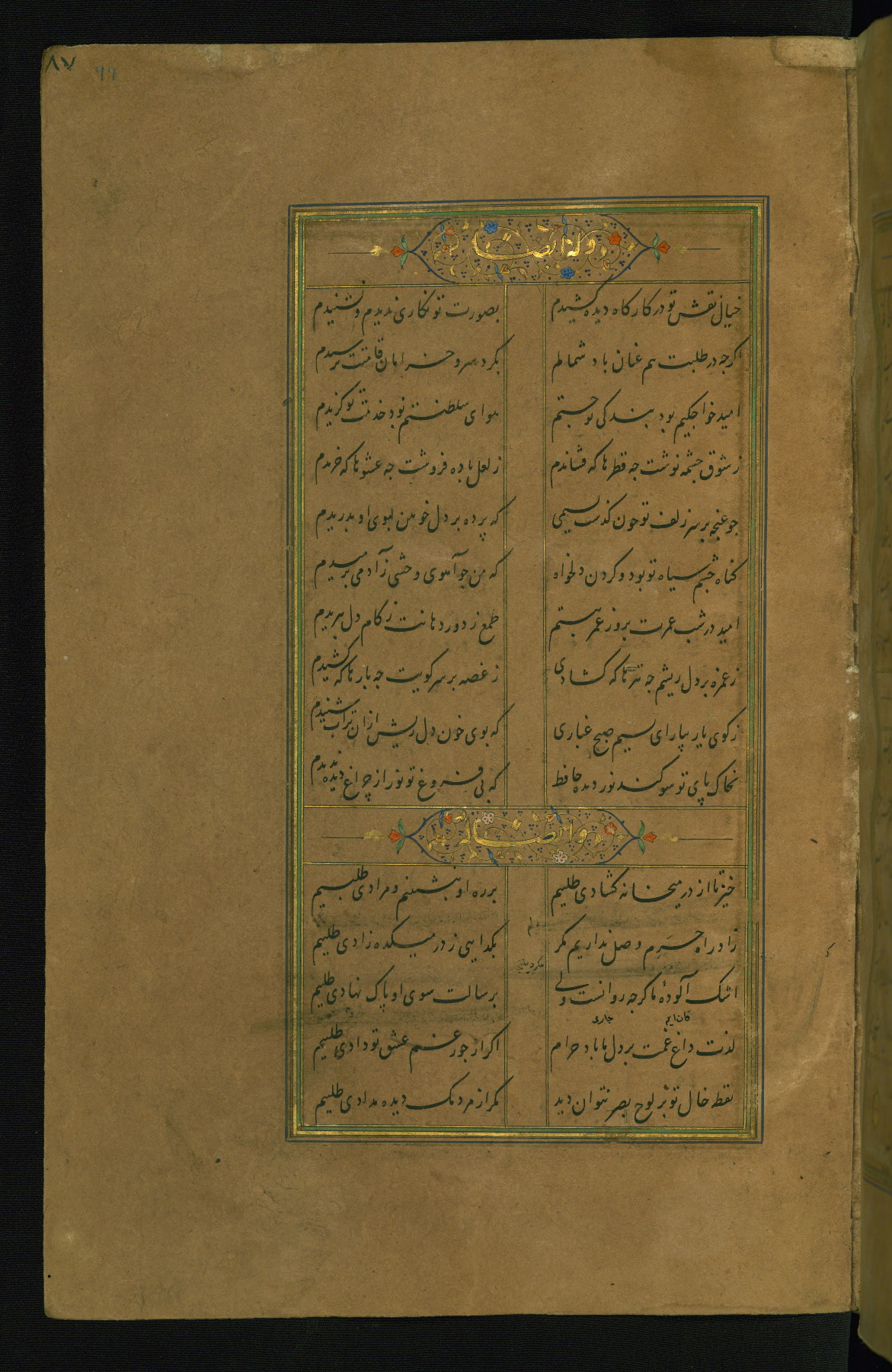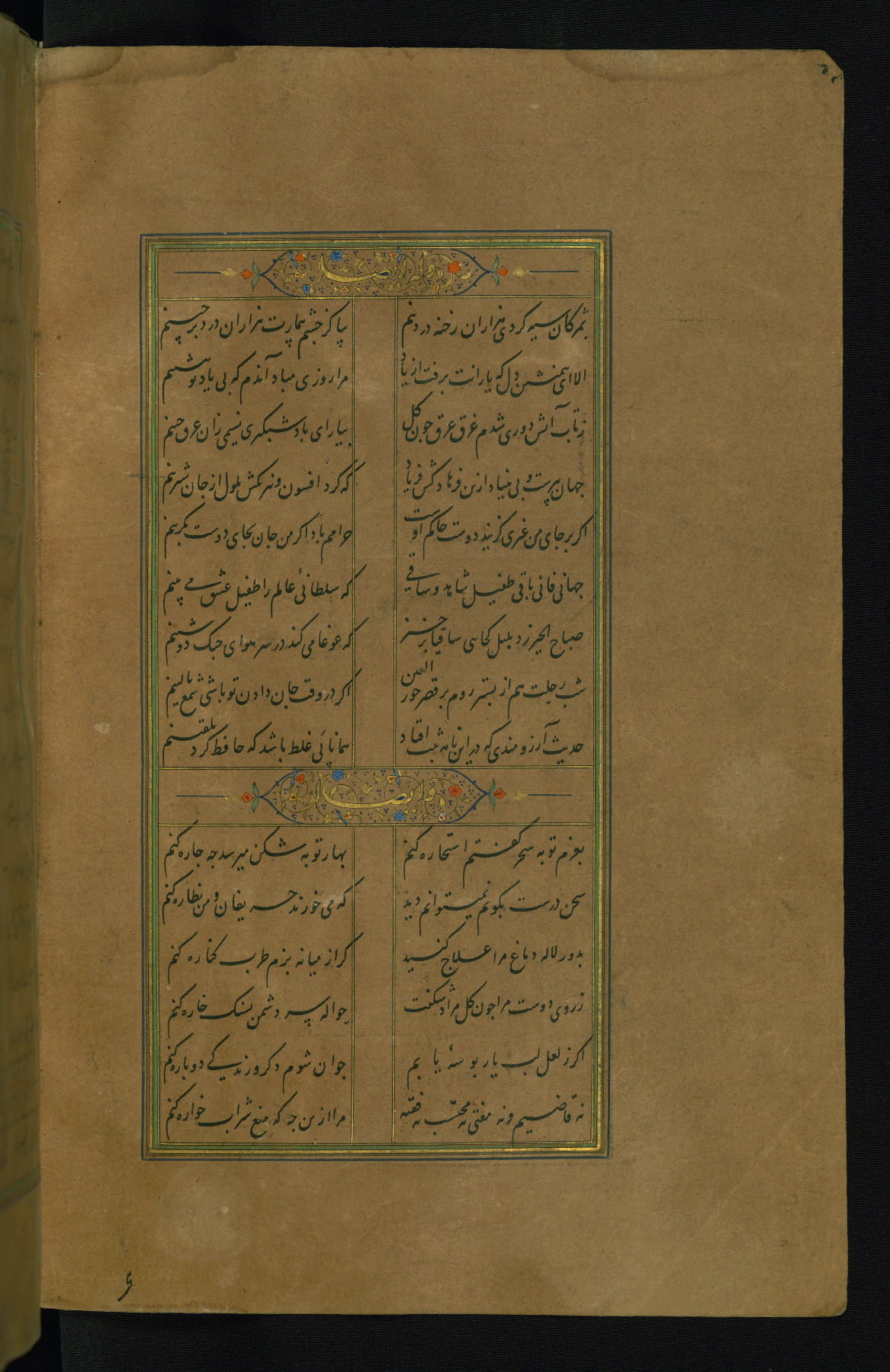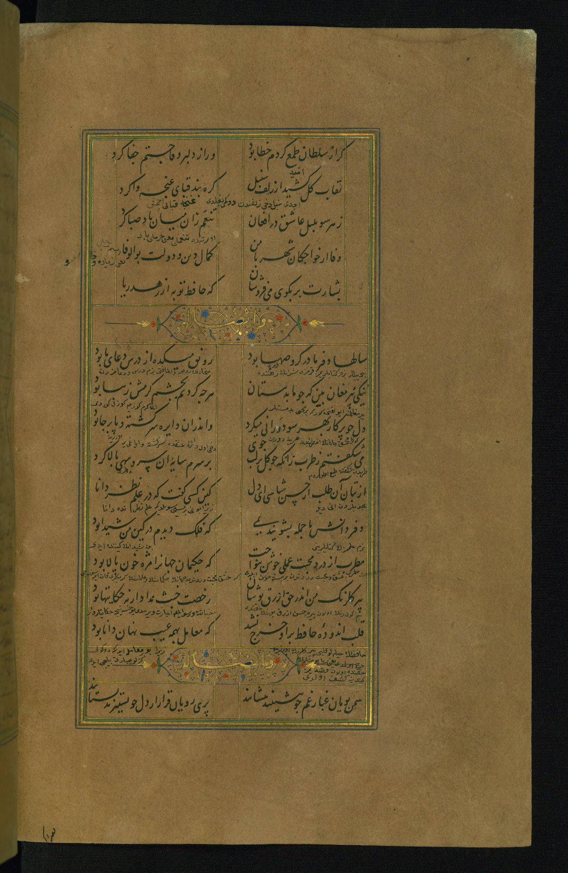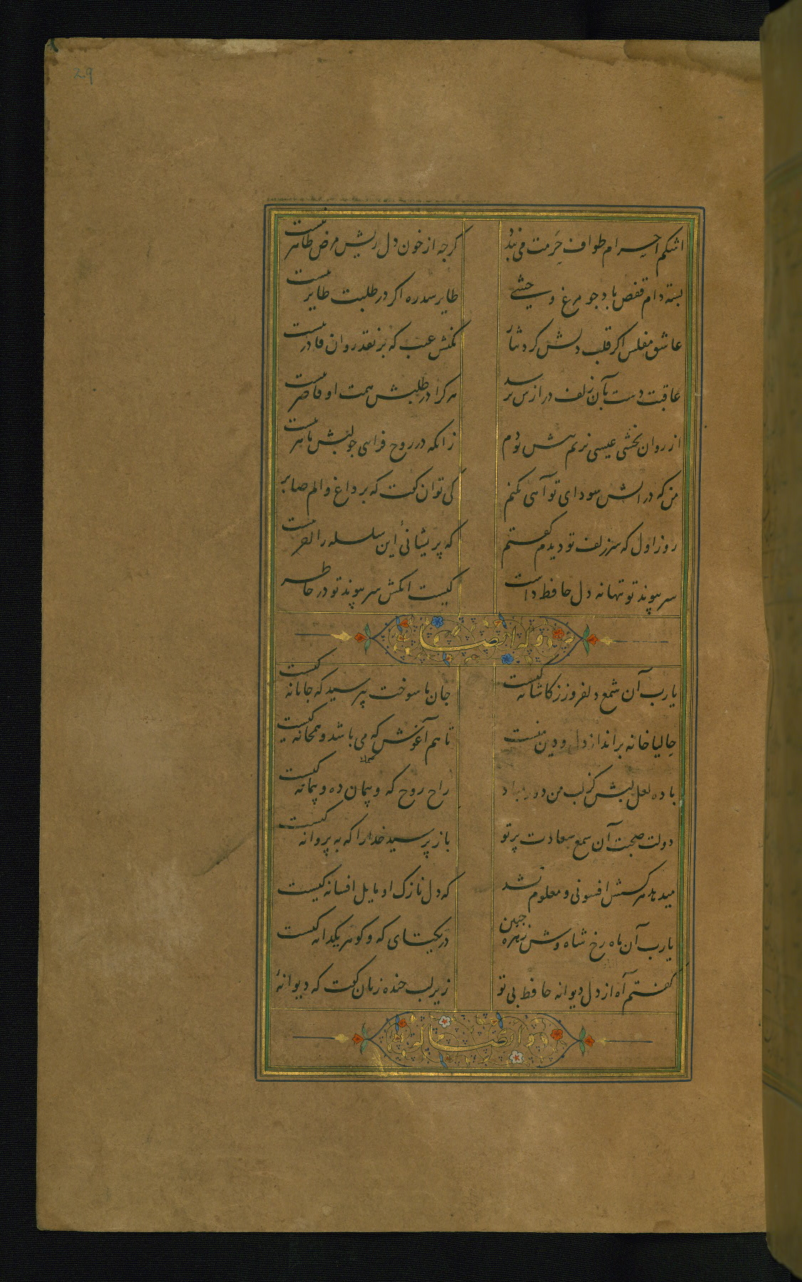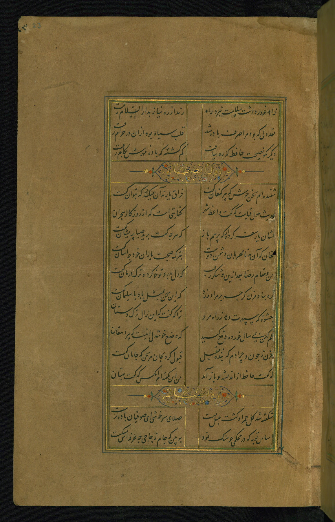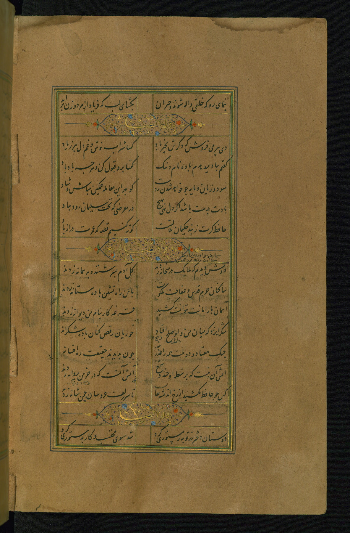 This is an illuminated and illustrated manuscript copy of the Collection of poems (dīvān) by Shams al-Dīn Muḥammad Ḥāfiz al-Shīrāzī (fl. eighth century AH / fourteenth CE). It was written in black nasta‘līq script with chapter/section headings in gold ink by Zayn al-‘Ābidīn ‘Abd al-Raḥmān al-Jāmī in 918 AH / 1512 CE in Safavid Iran. The manuscript opens with an illuminated medallion (fol. 1a), followed by a double-page illustrated frontispiece (fols. 1b-2a). The text begins with an incipit page with illuminated headpiece (fol. 2b). There are three additional illustrations (fols. 24a, 49b, and 87a). The red leather binding, which is not original and may be attributed to late twelfth-century AH / eighteenth CE or thirteenth-century AH / nineteenth CE Turkey, has a scalloped medallion with gold-tooled decoration and borders.