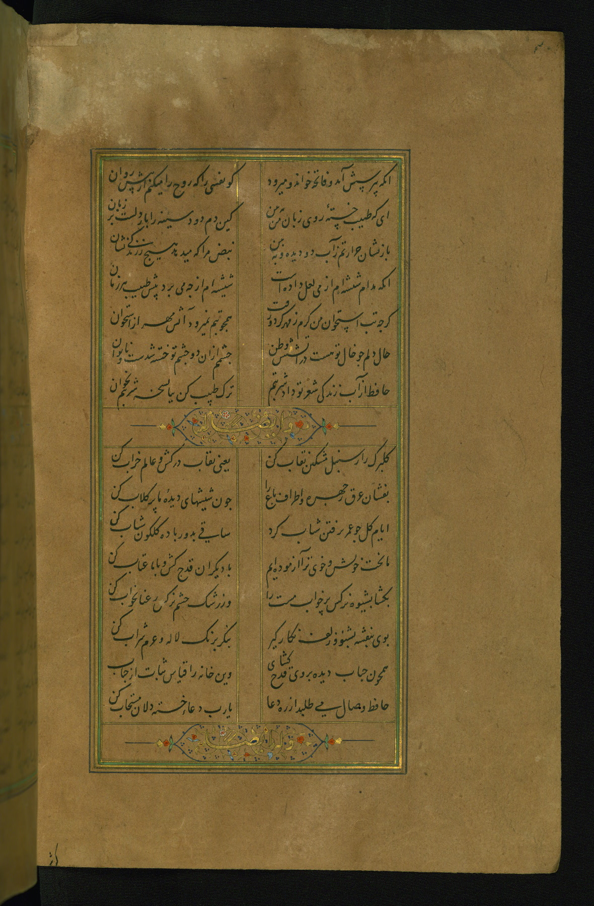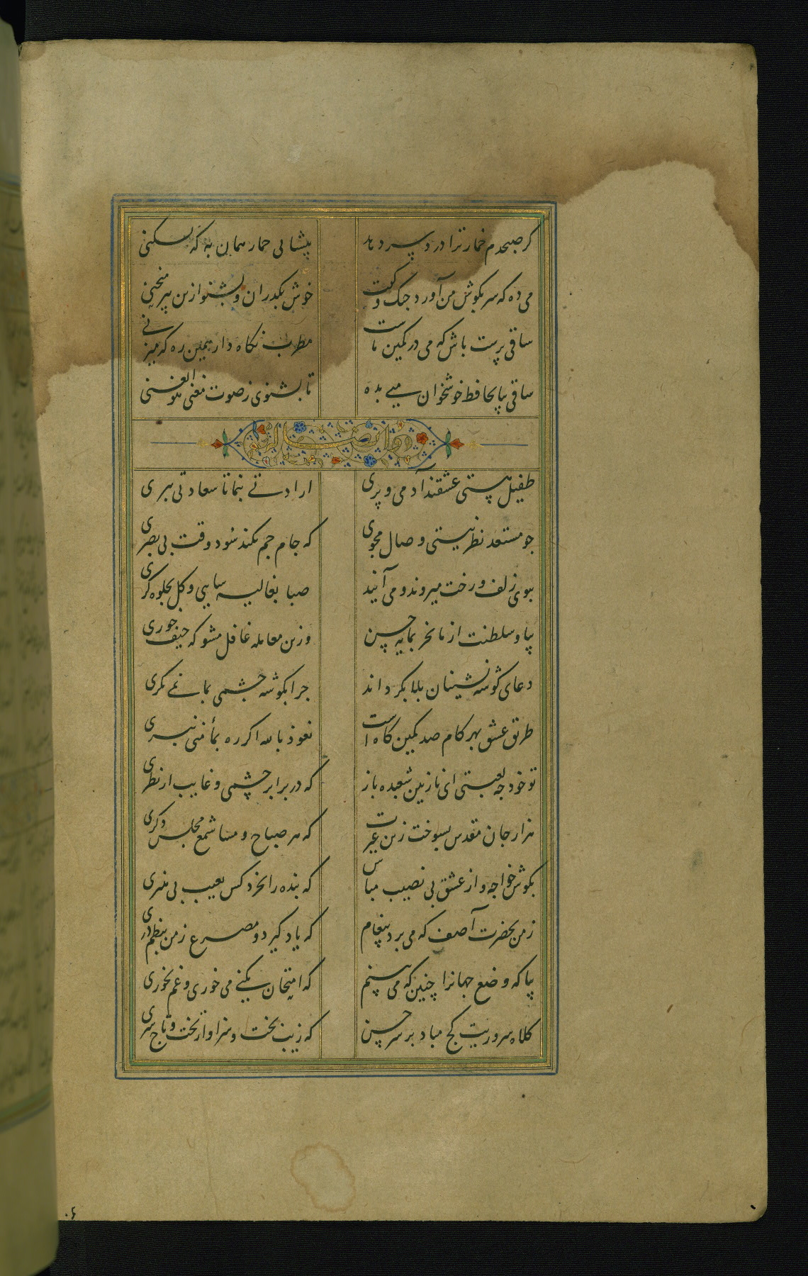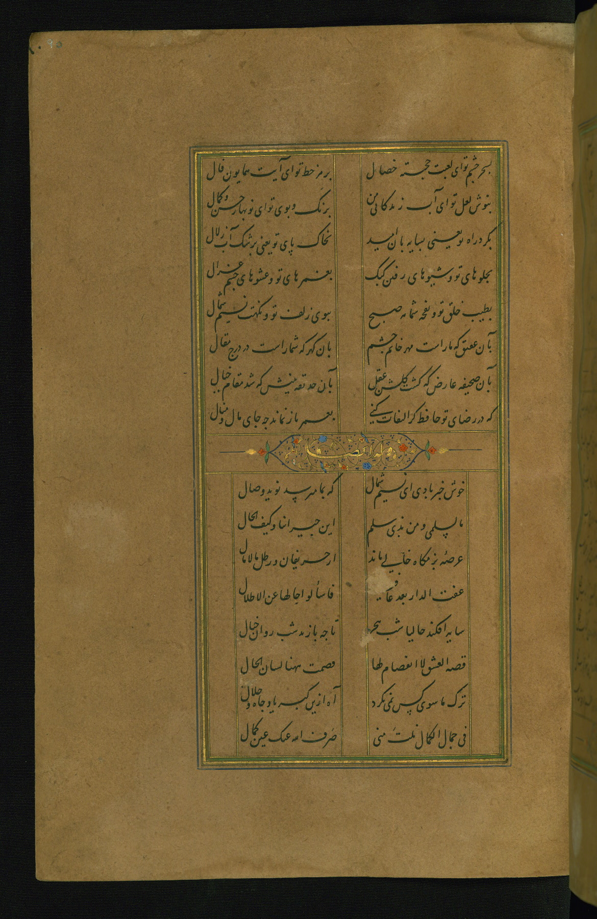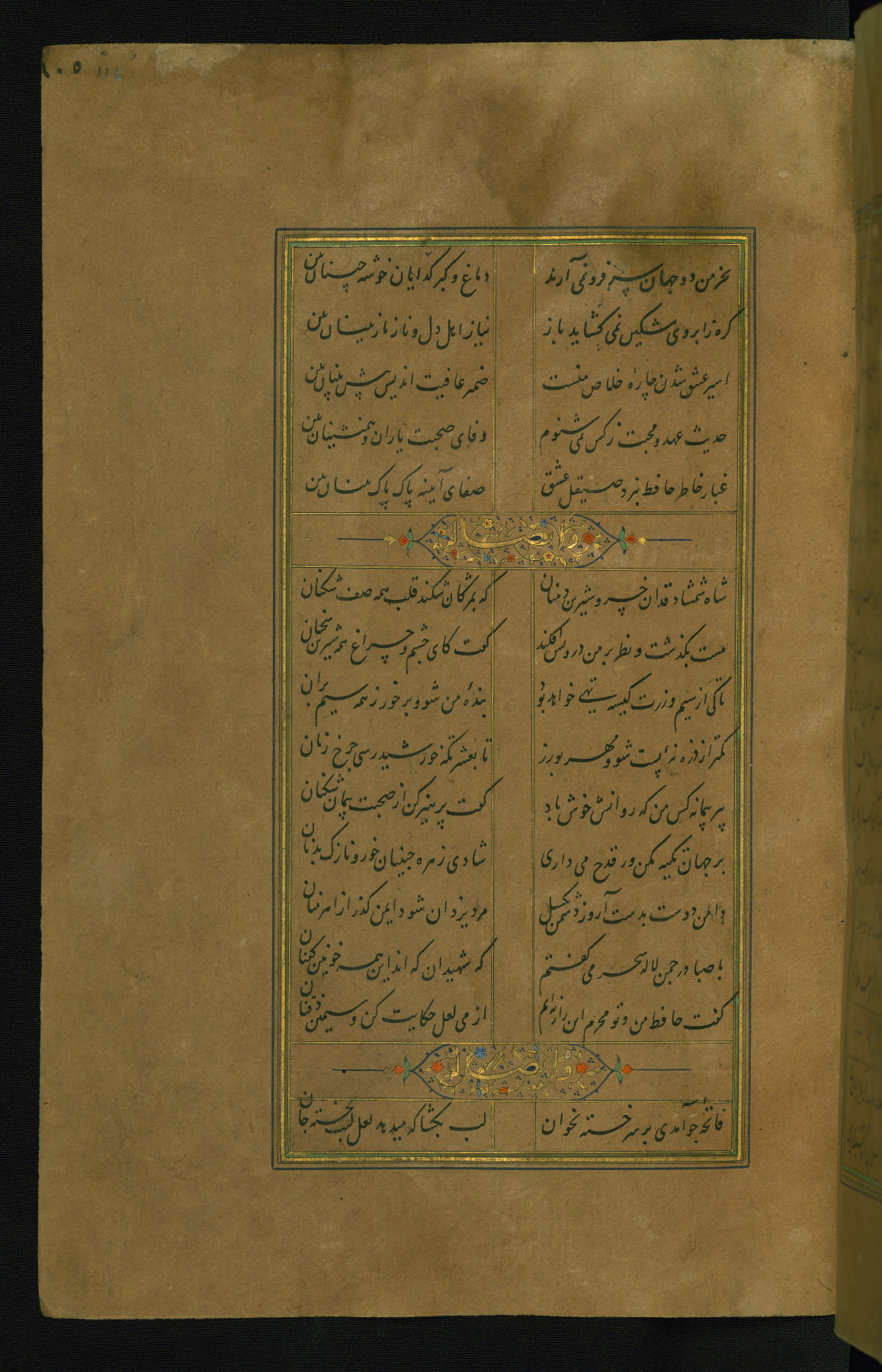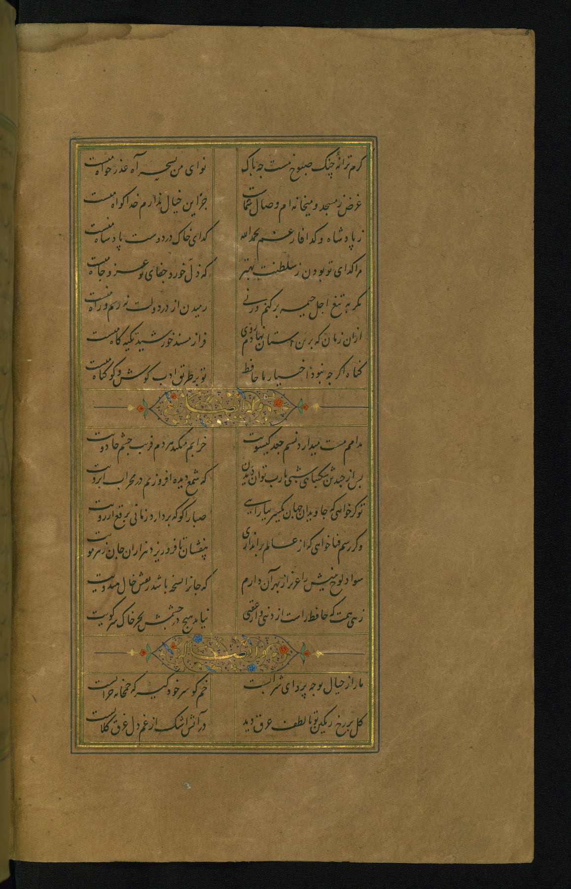 This is an illuminated and illustrated manuscript copy of the Collection of poems (dīvān) by Shams al-Dīn Muḥammad Ḥāfiz al-Shīrāzī (fl. eighth century AH / fourteenth CE). It was written in black nasta‘līq script with chapter/section headings in gold ink by Zayn al-‘Ābidīn ‘Abd al-Raḥmān al-Jāmī in 918 AH / 1512 CE in Safavid Iran. The manuscript opens with an illuminated medallion (fol. 1a), followed by a double-page illustrated frontispiece (fols. 1b-2a). The text begins with an incipit page with illuminated headpiece (fol. 2b). There are three additional illustrations (fols. 24a, 49b, and 87a). The red leather binding, which is not original and may be attributed to late twelfth-century AH / eighteenth CE or thirteenth-century AH / nineteenth CE Turkey, has a scalloped medallion with gold-tooled decoration and borders.