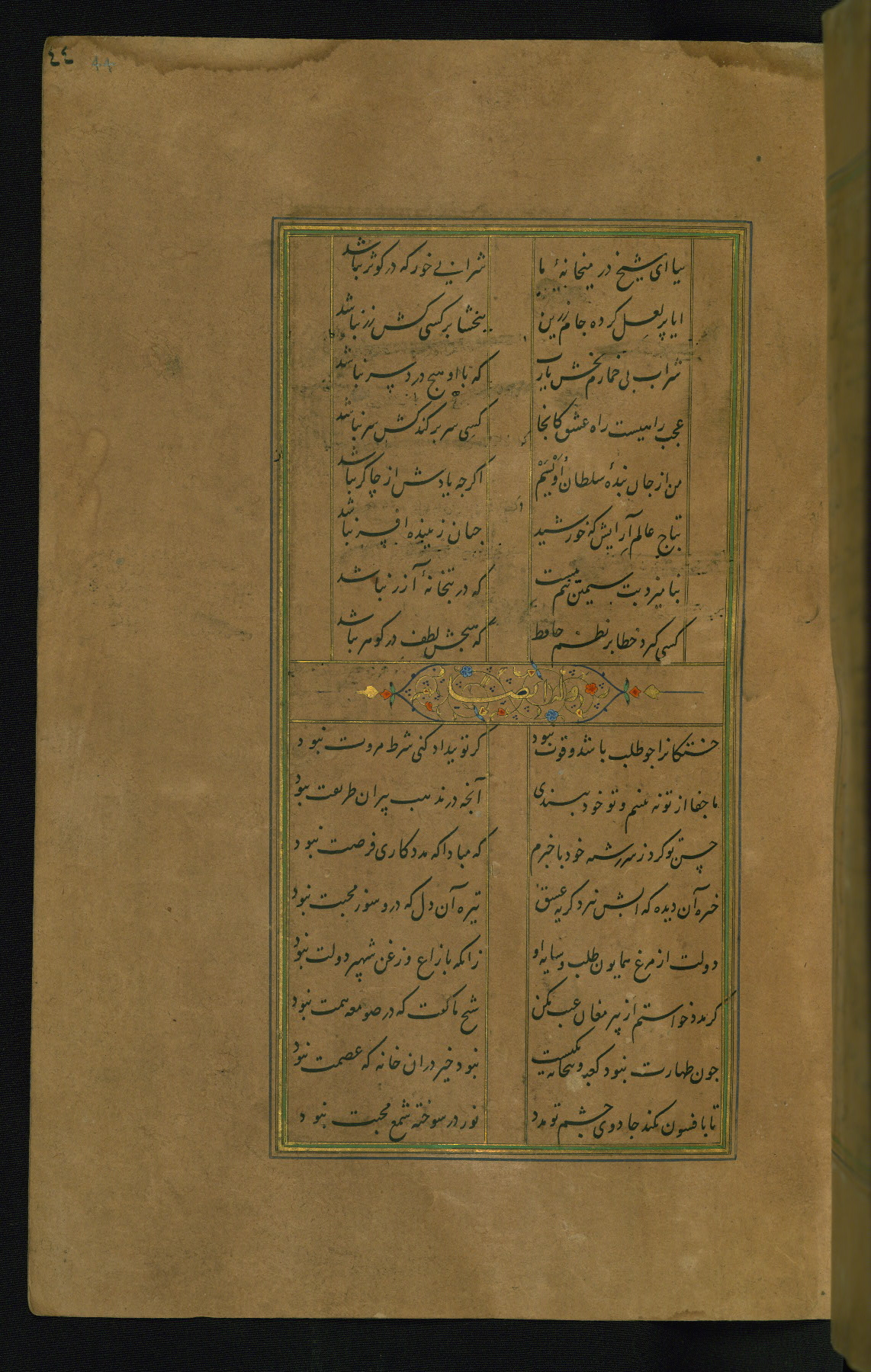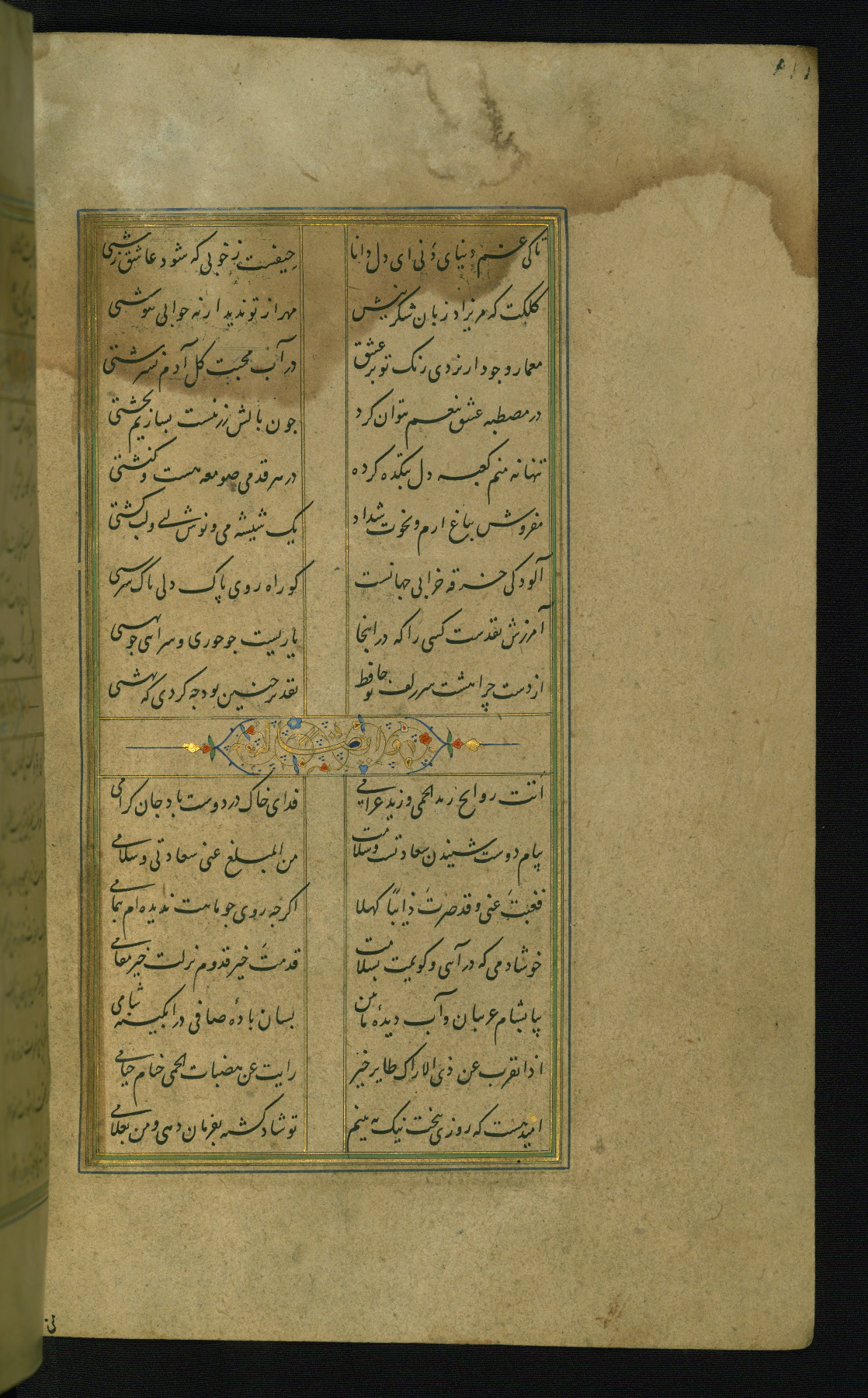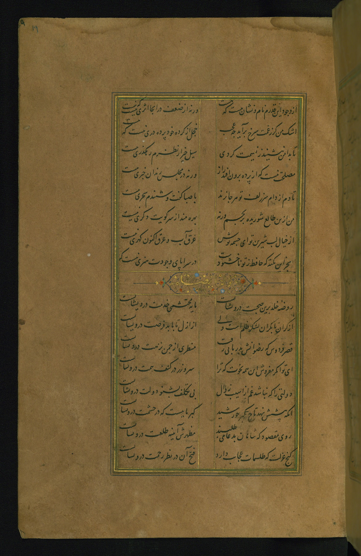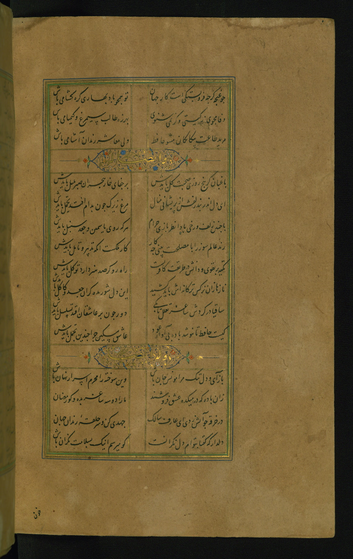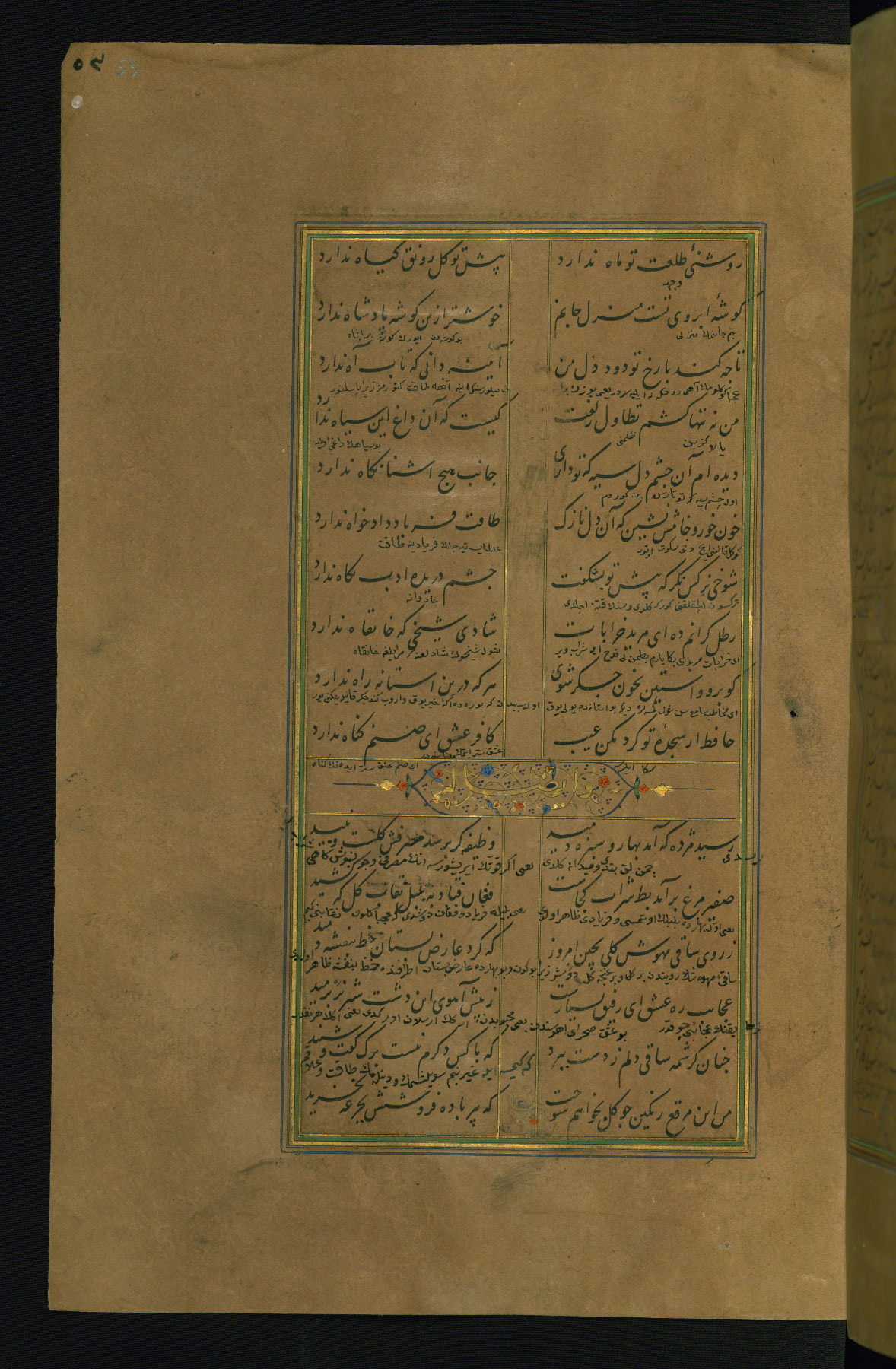 This is an illuminated and illustrated manuscript copy of the Collection of poems (dīvān) by Shams al-Dīn Muḥammad Ḥāfiz al-Shīrāzī (fl. eighth century AH / fourteenth CE). It was written in black nasta‘līq script with chapter/section headings in gold ink by Zayn al-‘Ābidīn ‘Abd al-Raḥmān al-Jāmī in 918 AH / 1512 CE in Safavid Iran. The manuscript opens with an illuminated medallion (fol. 1a), followed by a double-page illustrated frontispiece (fols. 1b-2a). The text begins with an incipit page with illuminated headpiece (fol. 2b). There are three additional illustrations (fols. 24a, 49b, and 87a). The red leather binding, which is not original and may be attributed to late twelfth-century AH / eighteenth CE or thirteenth-century AH / nineteenth CE Turkey, has a scalloped medallion with gold-tooled decoration and borders.
