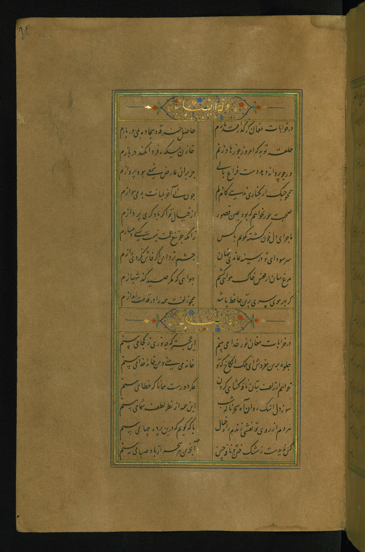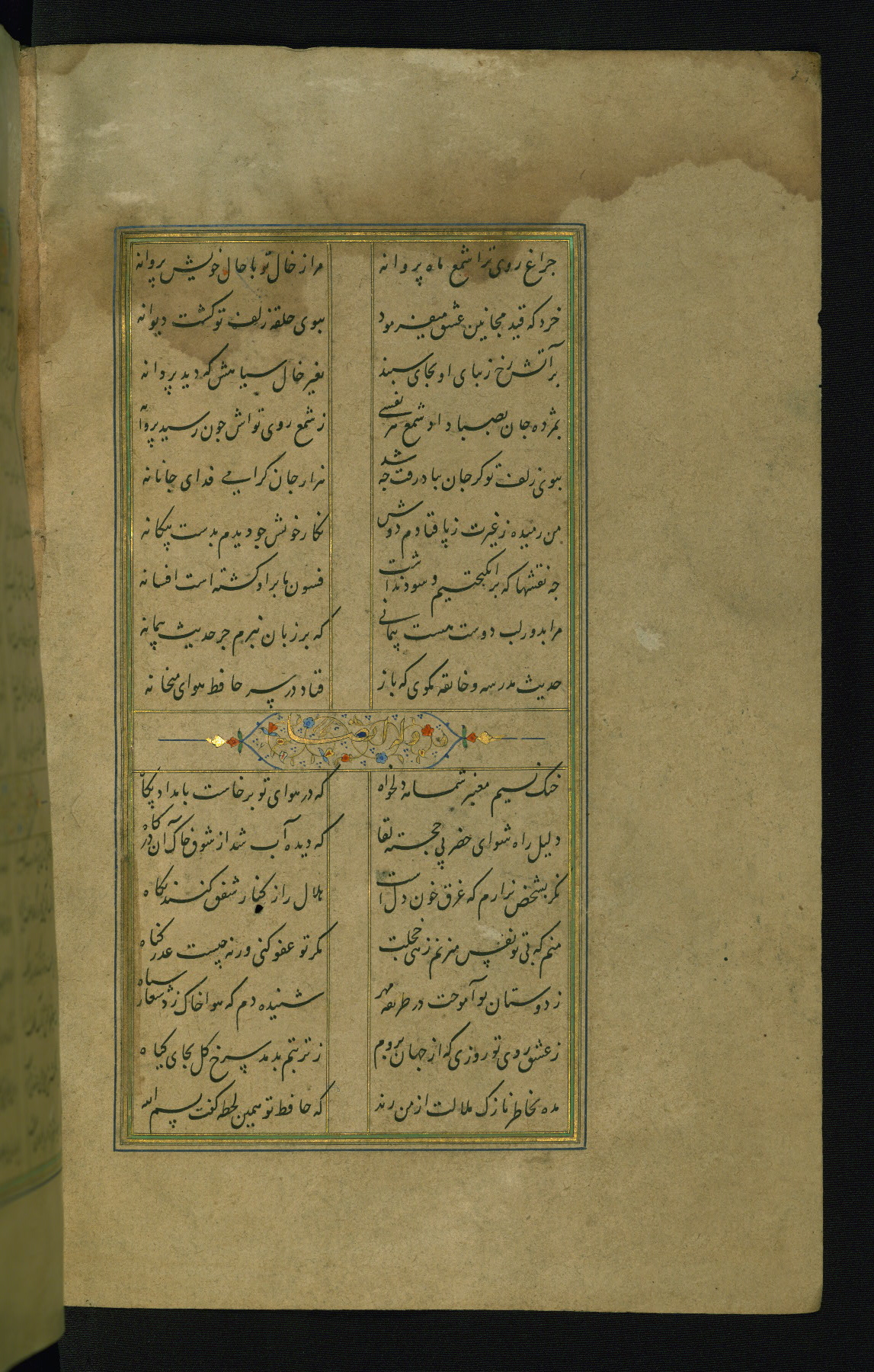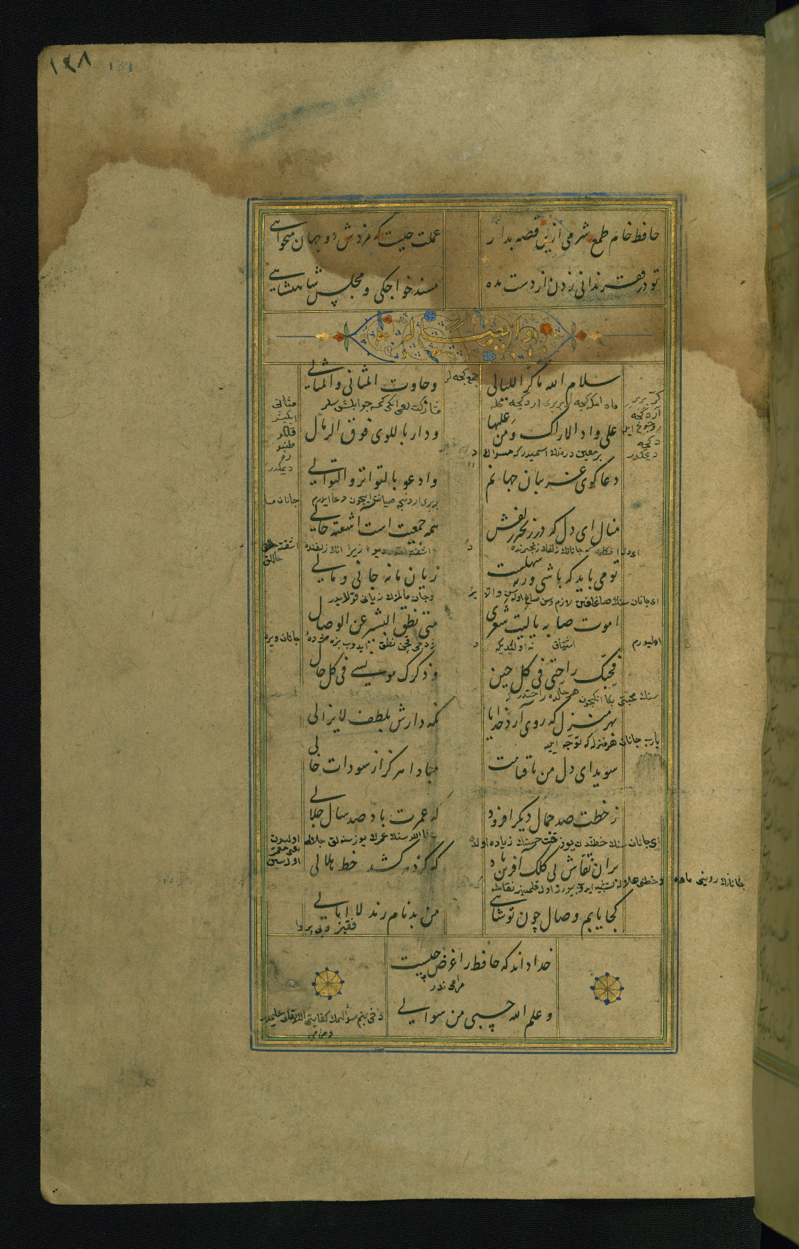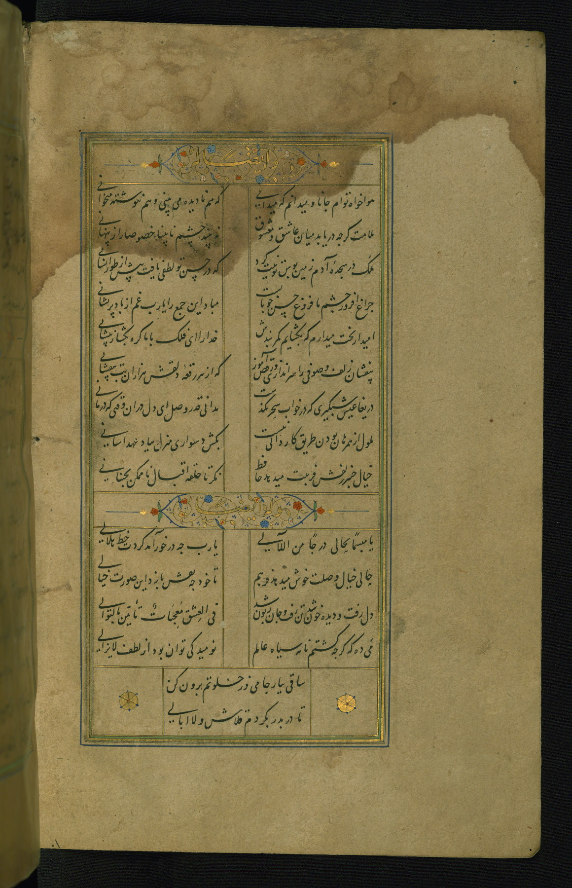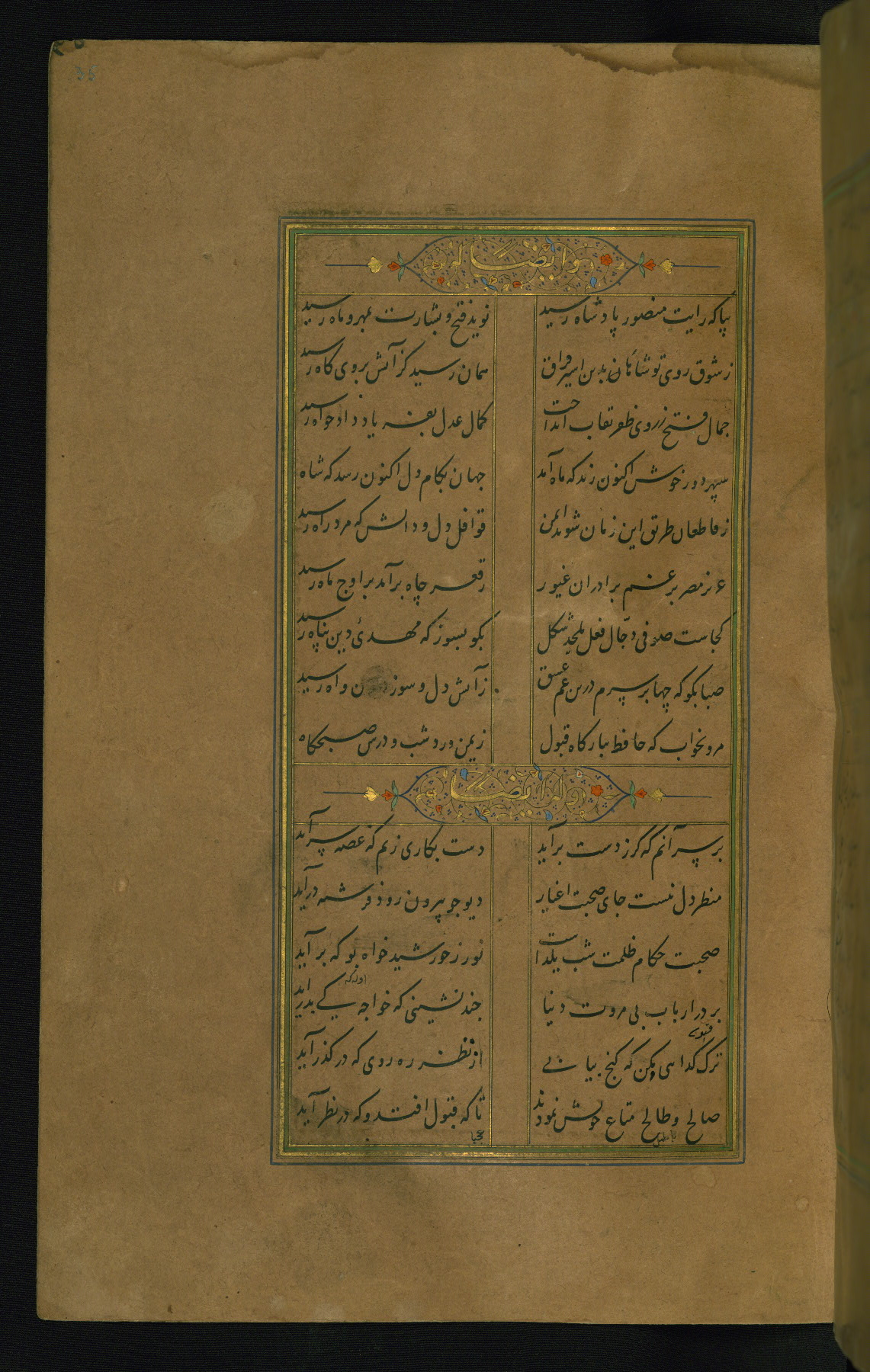 This is an illuminated and illustrated manuscript copy of the Collection of poems (dīvān) by Shams al-Dīn Muḥammad Ḥāfiz al-Shīrāzī (fl. eighth century AH / fourteenth CE). It was written in black nasta‘līq script with chapter/section headings in gold ink by Zayn al-‘Ābidīn ‘Abd al-Raḥmān al-Jāmī in 918 AH / 1512 CE in Safavid Iran. The manuscript opens with an illuminated medallion (fol. 1a), followed by a double-page illustrated frontispiece (fols. 1b-2a). The text begins with an incipit page with illuminated headpiece (fol. 2b). There are three additional illustrations (fols. 24a, 49b, and 87a). The red leather binding, which is not original and may be attributed to late twelfth-century AH / eighteenth CE or thirteenth-century AH / nineteenth CE Turkey, has a scalloped medallion with gold-tooled decoration and borders.