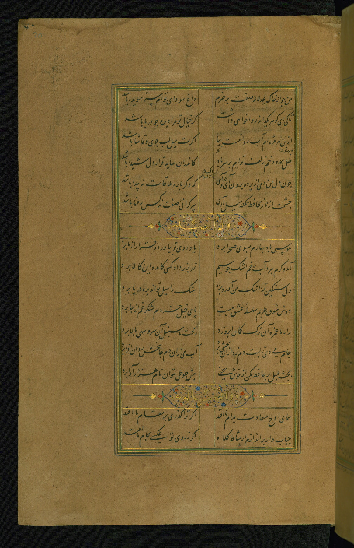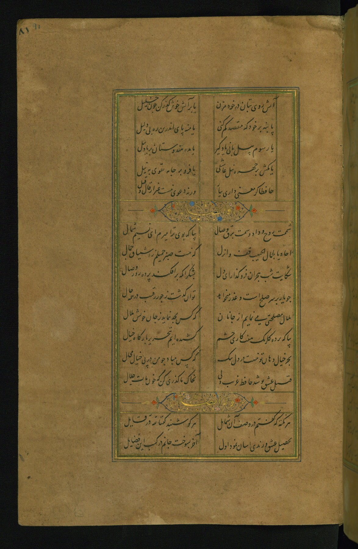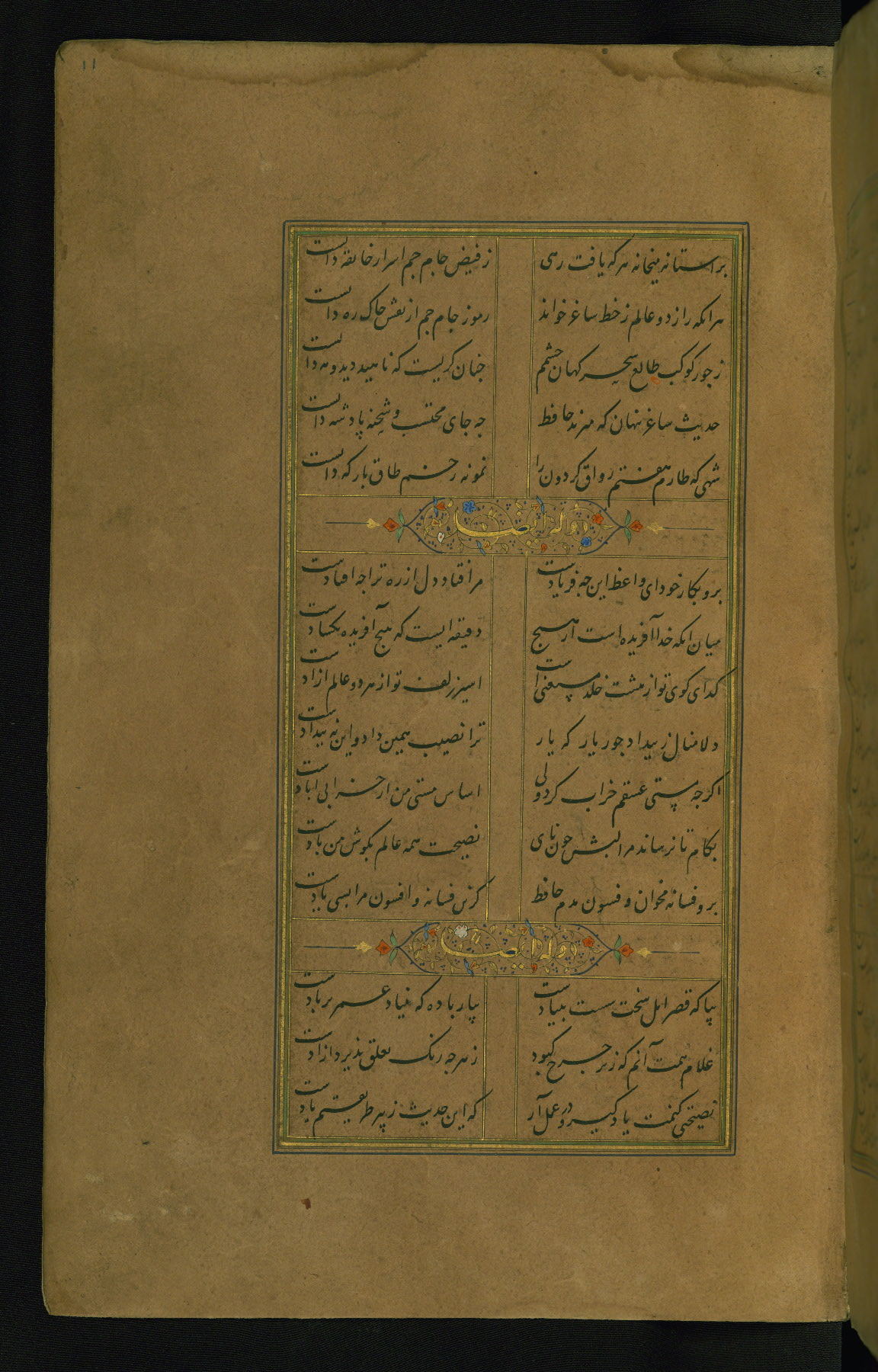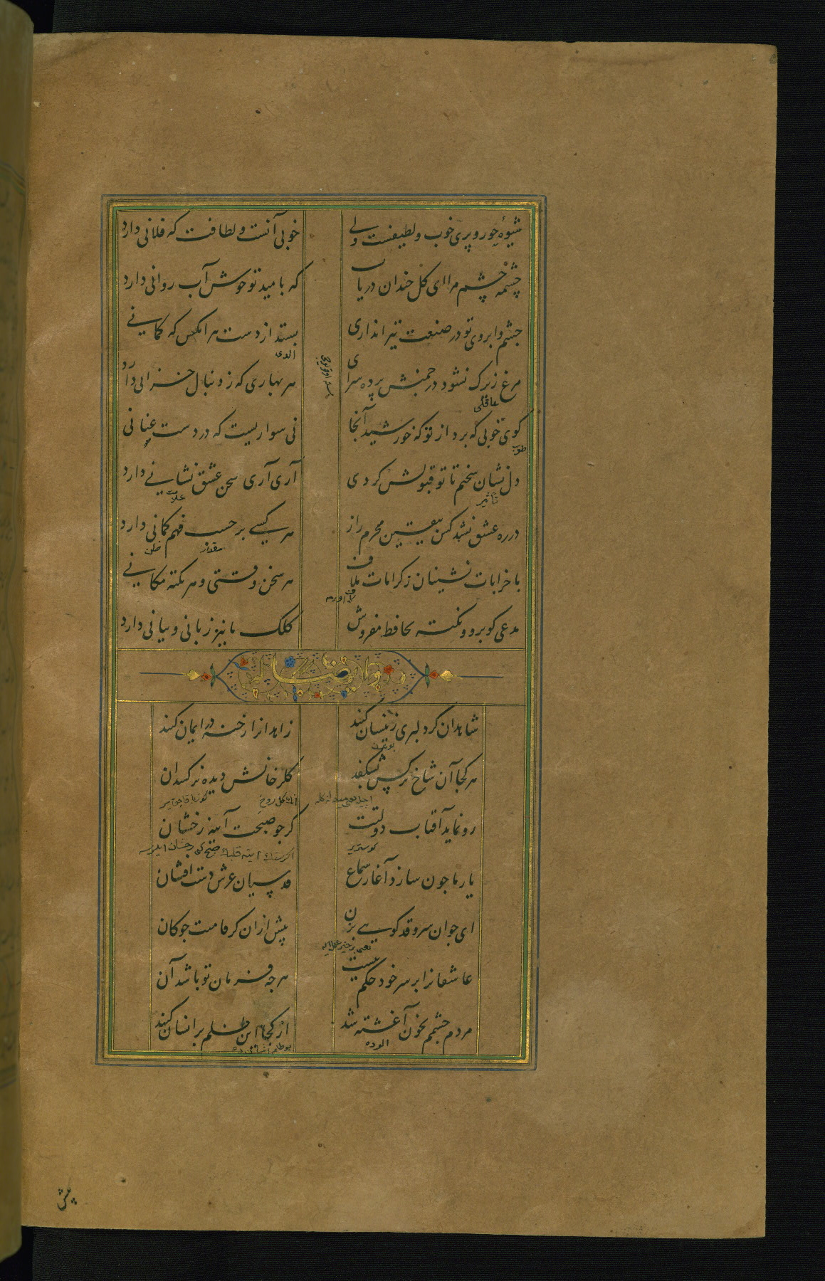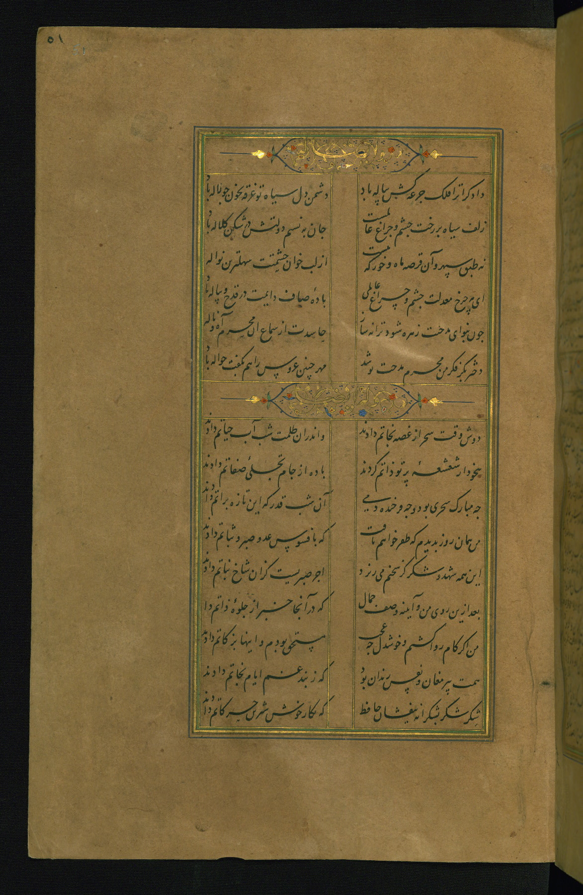 This is an illuminated and illustrated manuscript copy of the Collection of poems (dīvān) by Shams al-Dīn Muḥammad Ḥāfiz al-Shīrāzī (fl. eighth century AH / fourteenth CE). It was written in black nasta‘līq script with chapter/section headings in gold ink by Zayn al-‘Ābidīn ‘Abd al-Raḥmān al-Jāmī in 918 AH / 1512 CE in Safavid Iran. The manuscript opens with an illuminated medallion (fol. 1a), followed by a double-page illustrated frontispiece (fols. 1b-2a). The text begins with an incipit page with illuminated headpiece (fol. 2b). There are three additional illustrations (fols. 24a, 49b, and 87a). The red leather binding, which is not original and may be attributed to late twelfth-century AH / eighteenth CE or thirteenth-century AH / nineteenth CE Turkey, has a scalloped medallion with gold-tooled decoration and borders.