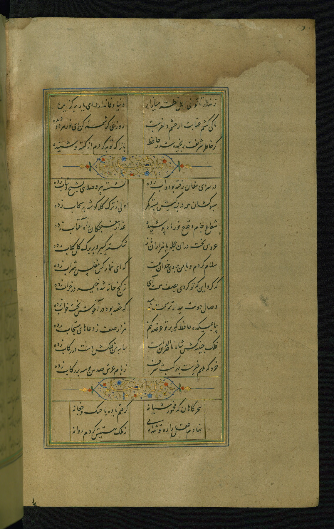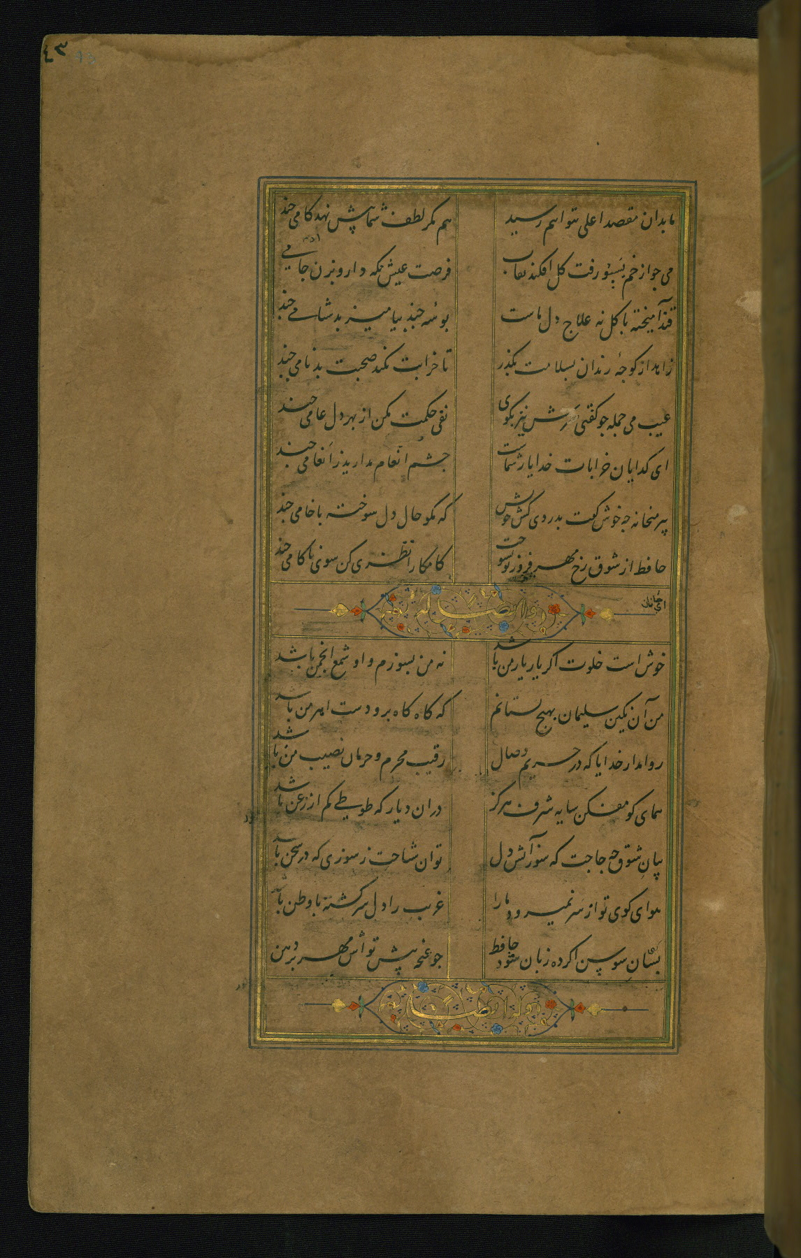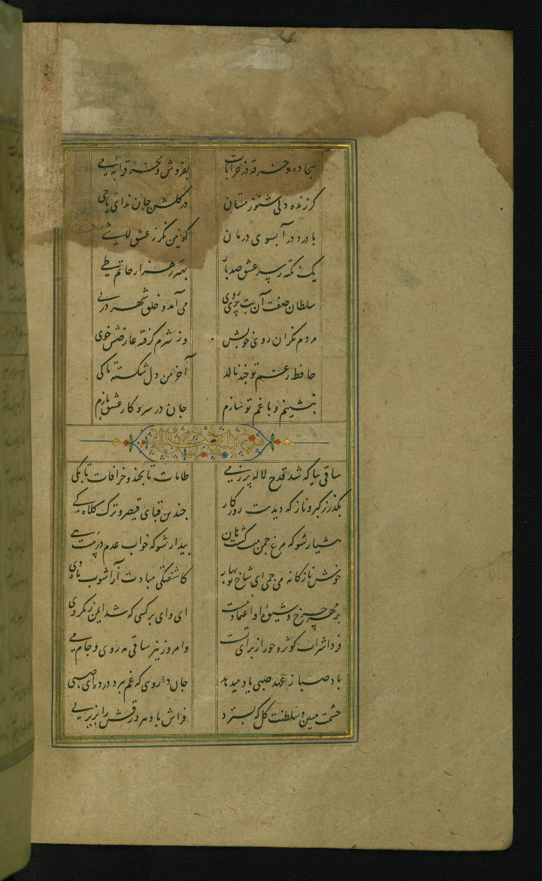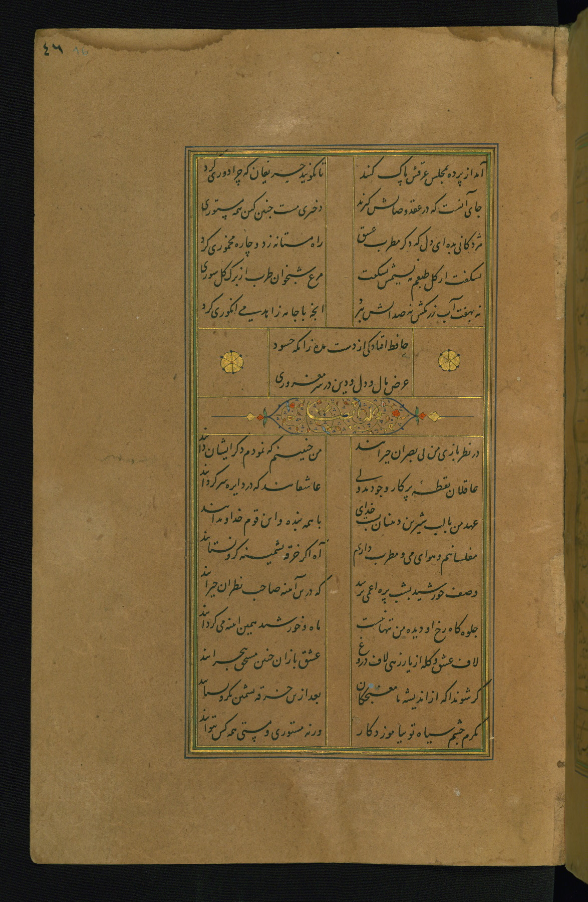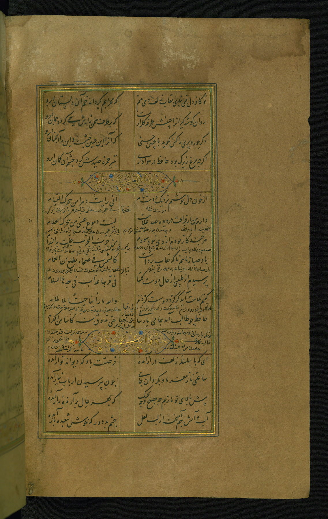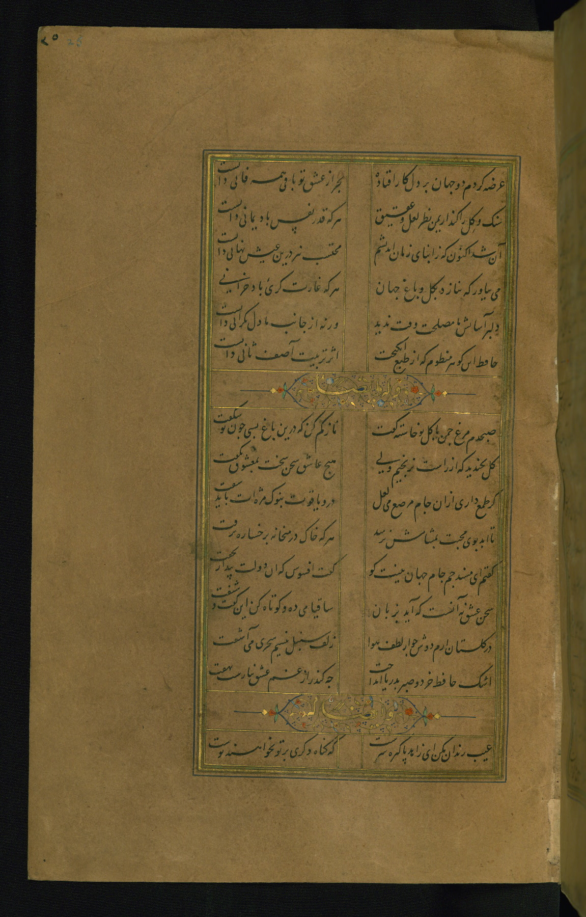 This is an illuminated and illustrated manuscript copy of the Collection of poems (dīvān) by Shams al-Dīn Muḥammad Ḥāfiz al-Shīrāzī (fl. eighth century AH / fourteenth CE). It was written in black nasta‘līq script with chapter/section headings in gold ink by Zayn al-‘Ābidīn ‘Abd al-Raḥmān al-Jāmī in 918 AH / 1512 CE in Safavid Iran. The manuscript opens with an illuminated medallion (fol. 1a), followed by a double-page illustrated frontispiece (fols. 1b-2a). The text begins with an incipit page with illuminated headpiece (fol. 2b). There are three additional illustrations (fols. 24a, 49b, and 87a). The red leather binding, which is not original and may be attributed to late twelfth-century AH / eighteenth CE or thirteenth-century AH / nineteenth CE Turkey, has a scalloped medallion with gold-tooled decoration and borders.