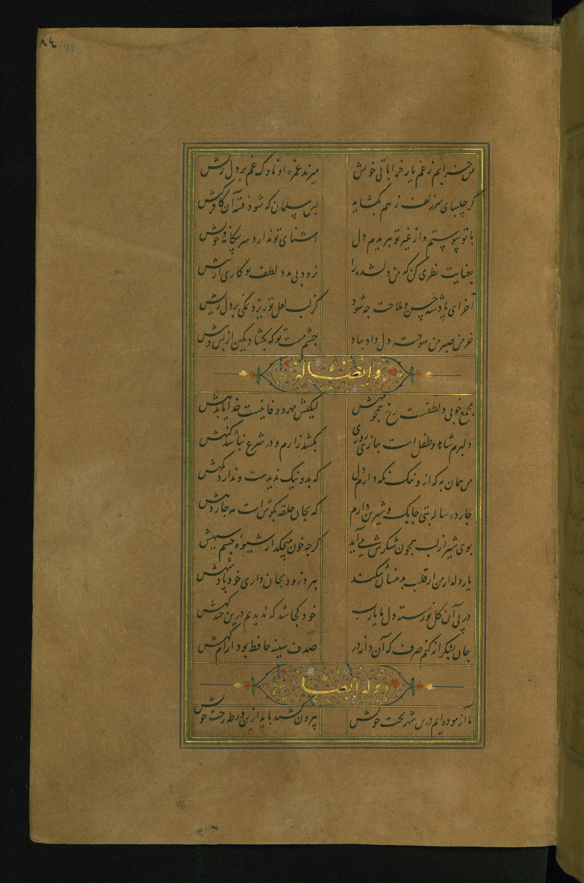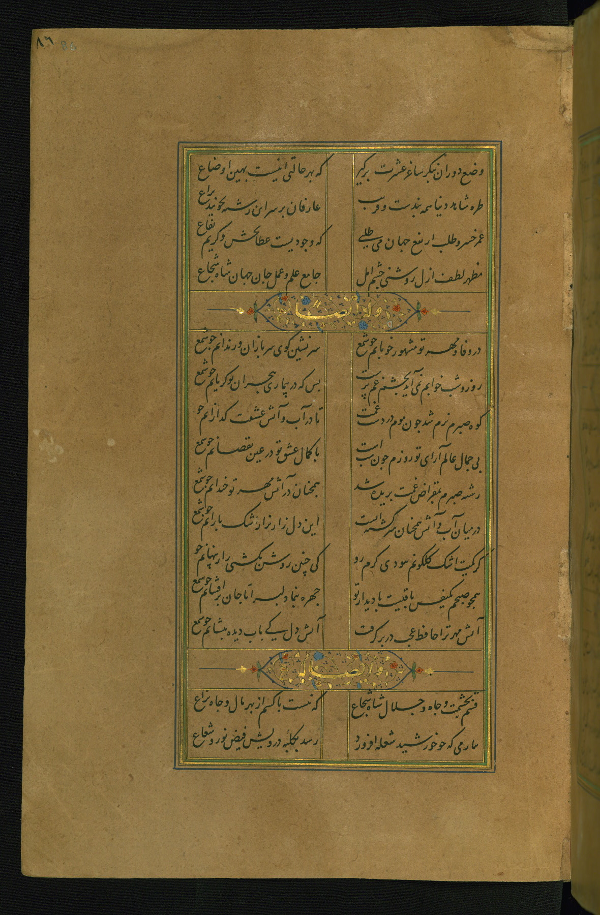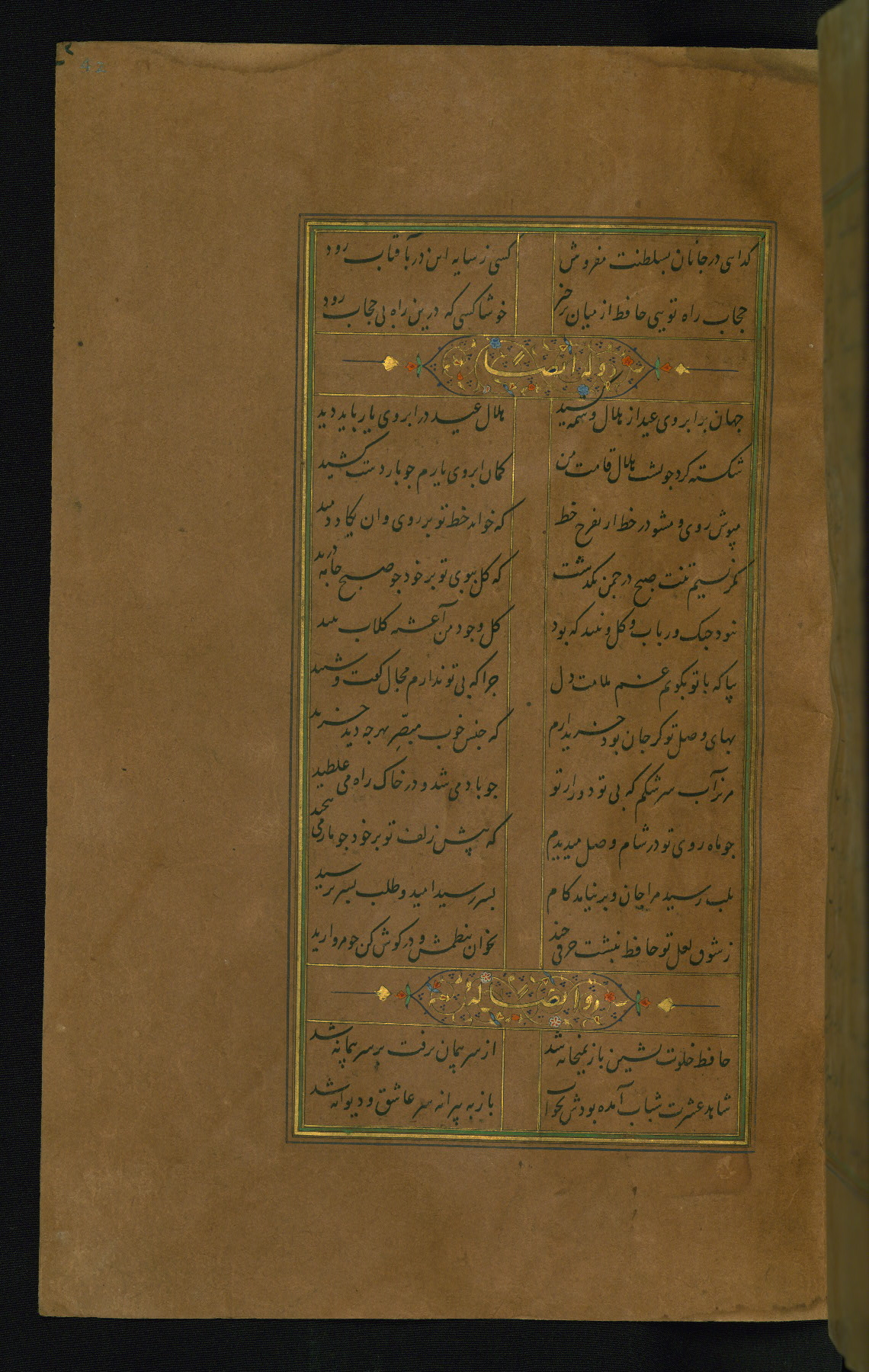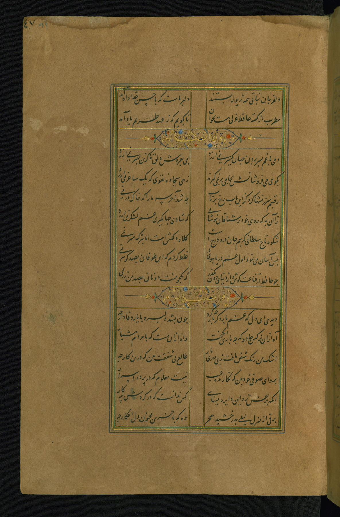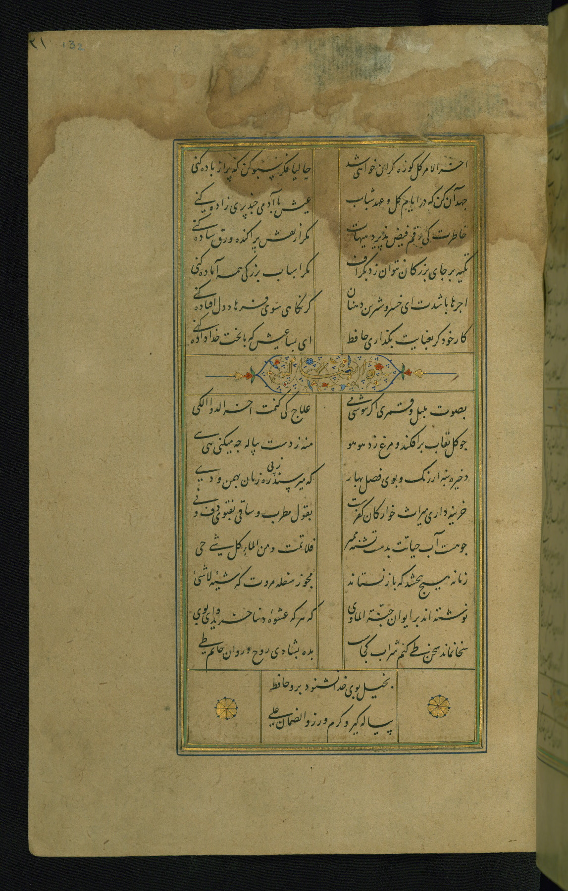 This is an illuminated and illustrated manuscript copy of the Collection of poems (dīvān) by Shams al-Dīn Muḥammad Ḥāfiz al-Shīrāzī (fl. eighth century AH / fourteenth CE). It was written in black nasta‘līq script with chapter/section headings in gold ink by Zayn al-‘Ābidīn ‘Abd al-Raḥmān al-Jāmī in 918 AH / 1512 CE in Safavid Iran. The manuscript opens with an illuminated medallion (fol. 1a), followed by a double-page illustrated frontispiece (fols. 1b-2a). The text begins with an incipit page with illuminated headpiece (fol. 2b). There are three additional illustrations (fols. 24a, 49b, and 87a). The red leather binding, which is not original and may be attributed to late twelfth-century AH / eighteenth CE or thirteenth-century AH / nineteenth CE Turkey, has a scalloped medallion with gold-tooled decoration and borders.
