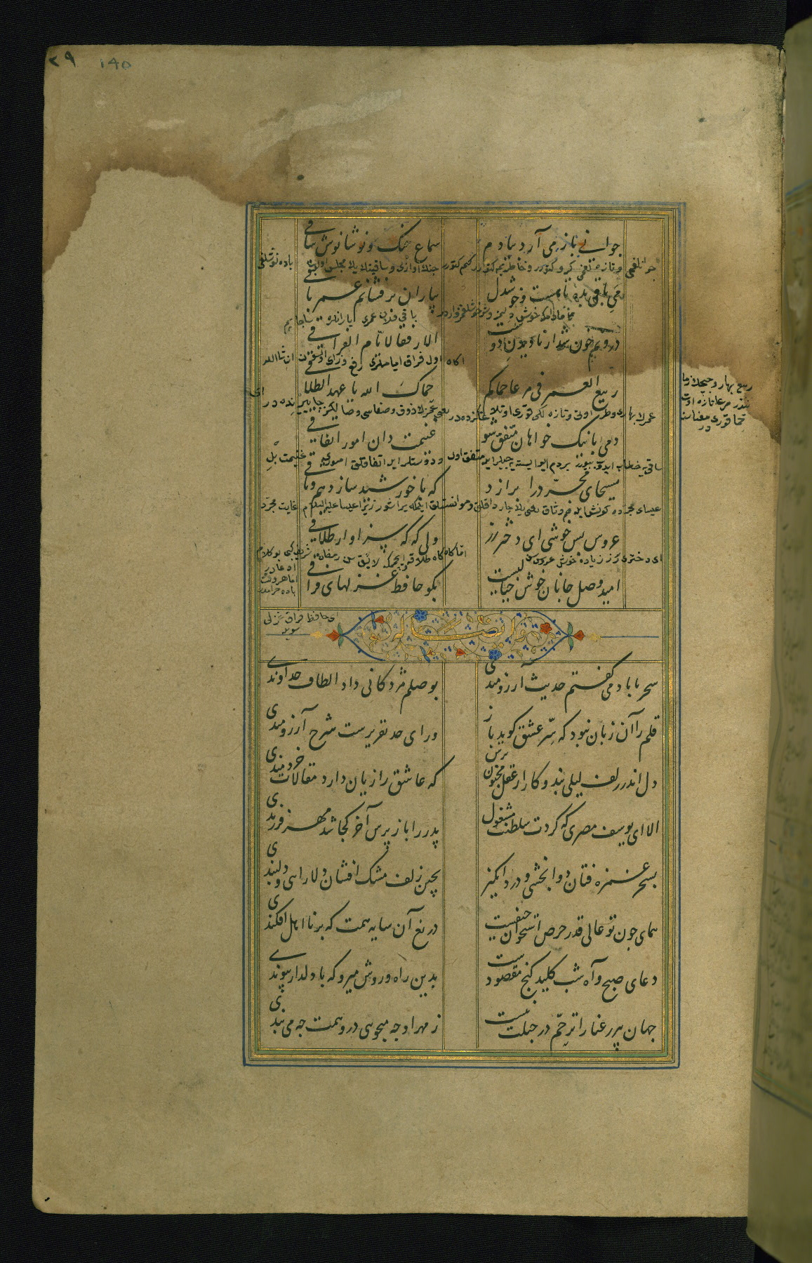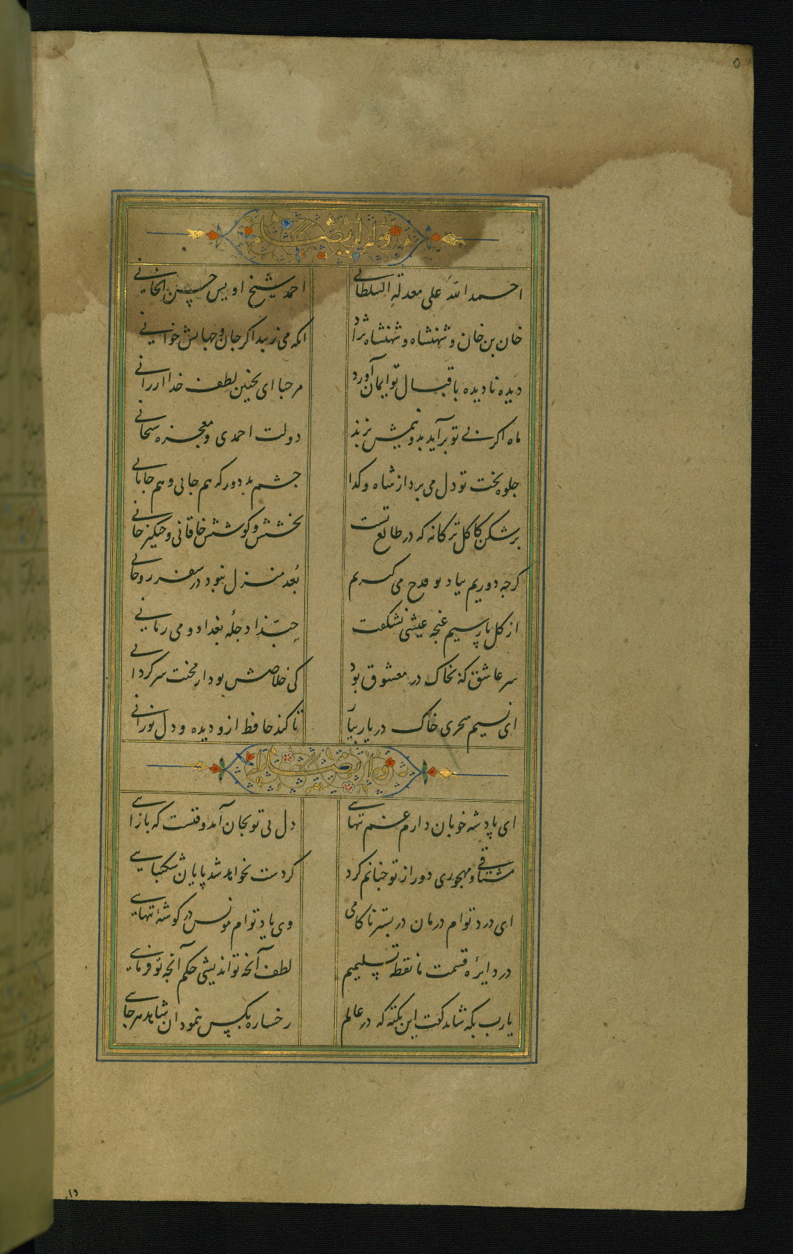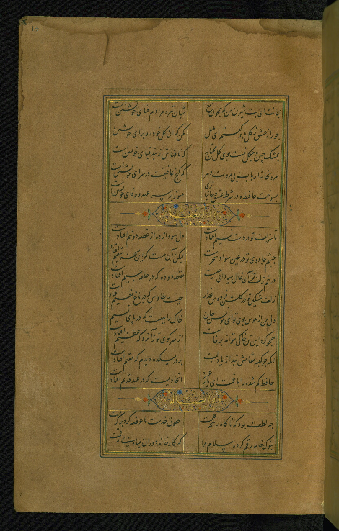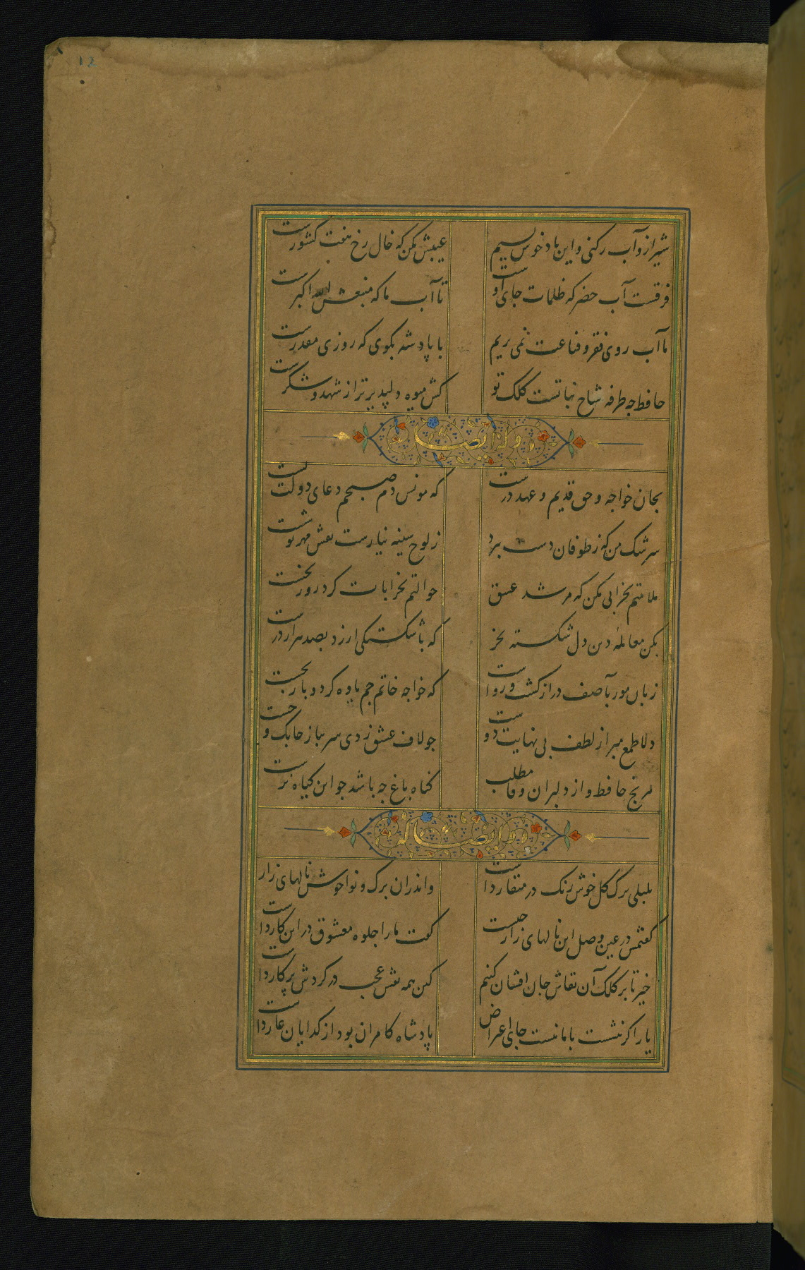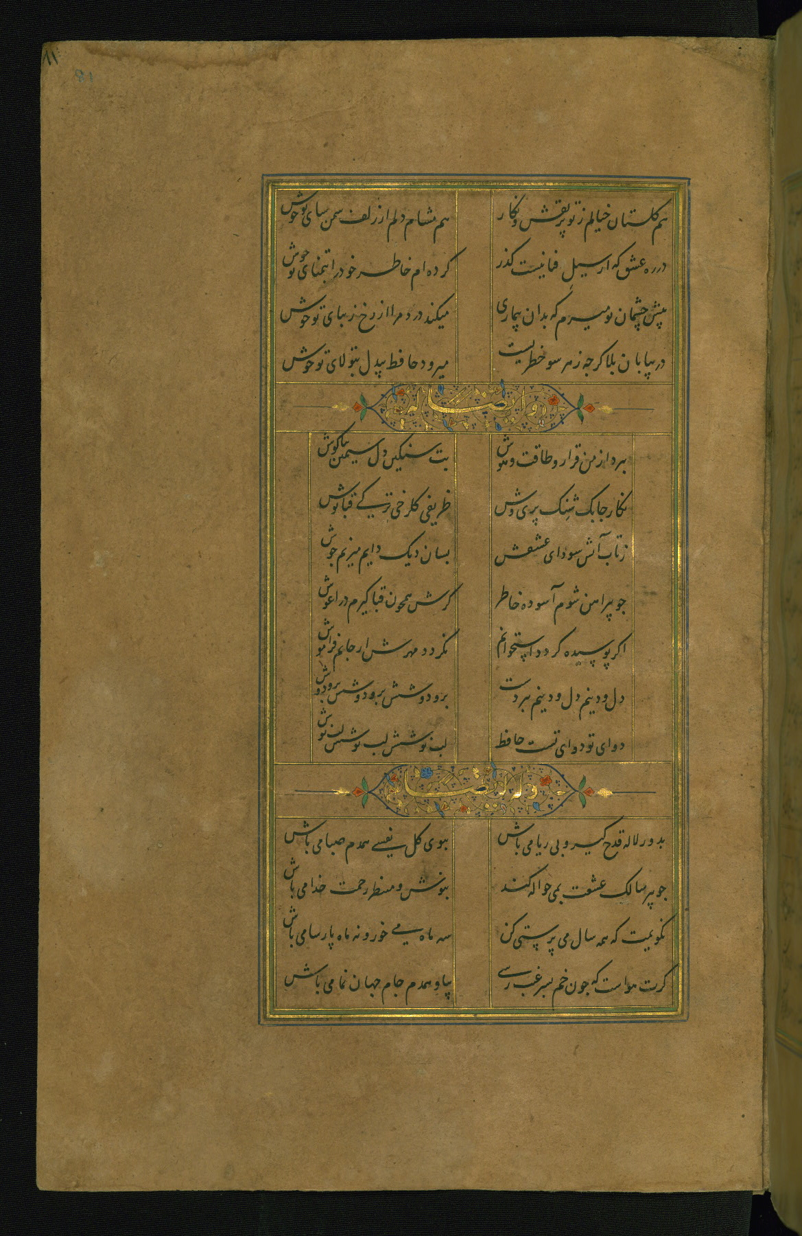 This is an illuminated and illustrated manuscript copy of the Collection of poems (dīvān) by Shams al-Dīn Muḥammad Ḥāfiz al-Shīrāzī (fl. eighth century AH / fourteenth CE). It was written in black nasta‘līq script with chapter/section headings in gold ink by Zayn al-‘Ābidīn ‘Abd al-Raḥmān al-Jāmī in 918 AH / 1512 CE in Safavid Iran. The manuscript opens with an illuminated medallion (fol. 1a), followed by a double-page illustrated frontispiece (fols. 1b-2a). The text begins with an incipit page with illuminated headpiece (fol. 2b). There are three additional illustrations (fols. 24a, 49b, and 87a). The red leather binding, which is not original and may be attributed to late twelfth-century AH / eighteenth CE or thirteenth-century AH / nineteenth CE Turkey, has a scalloped medallion with gold-tooled decoration and borders.