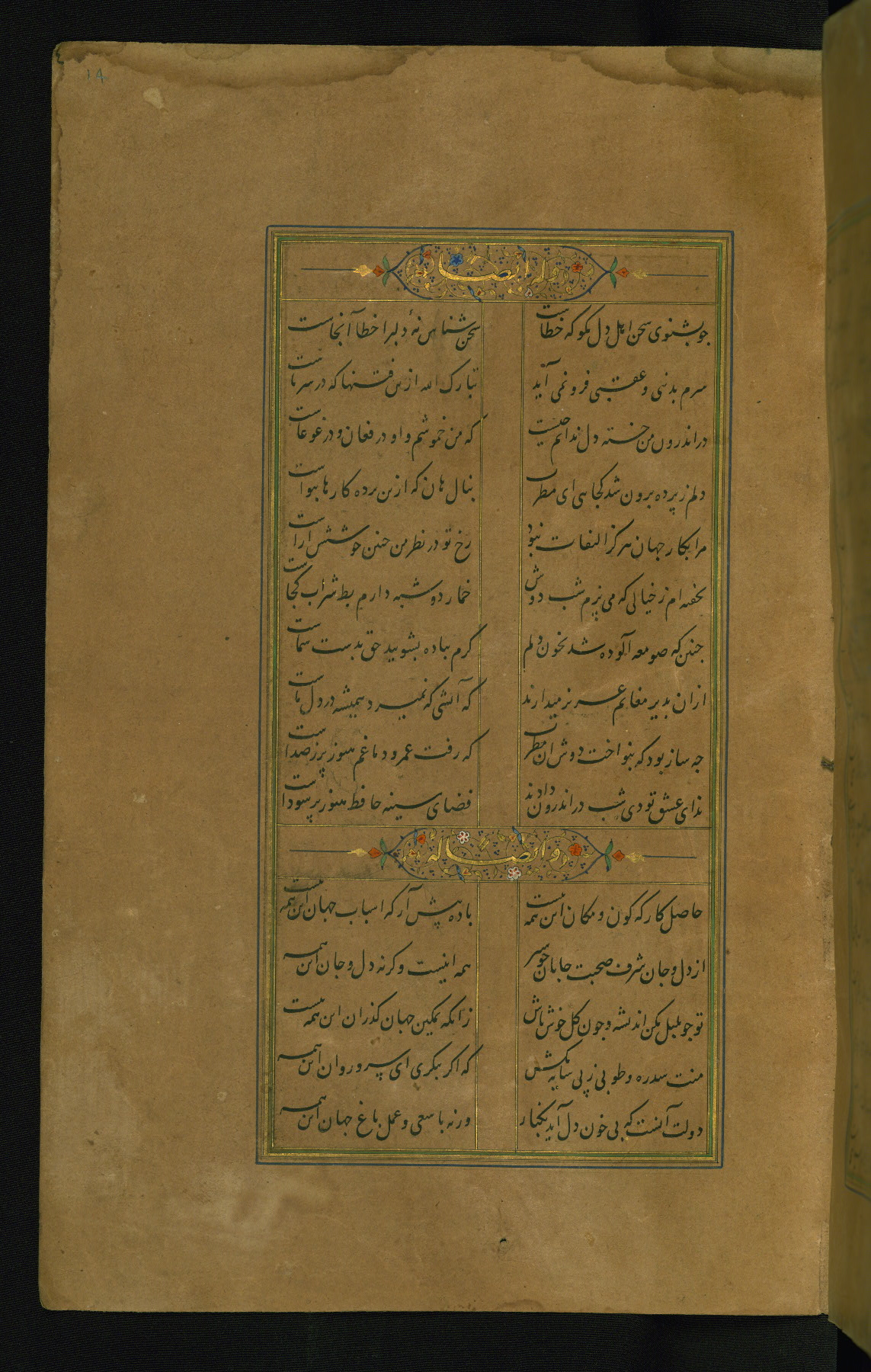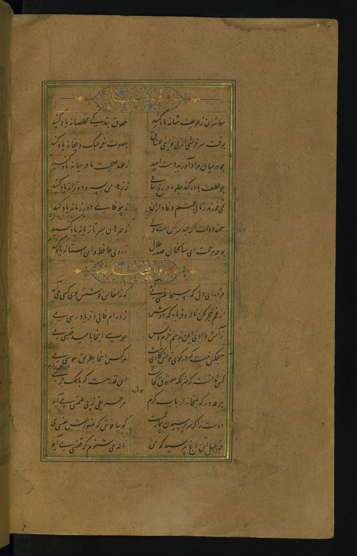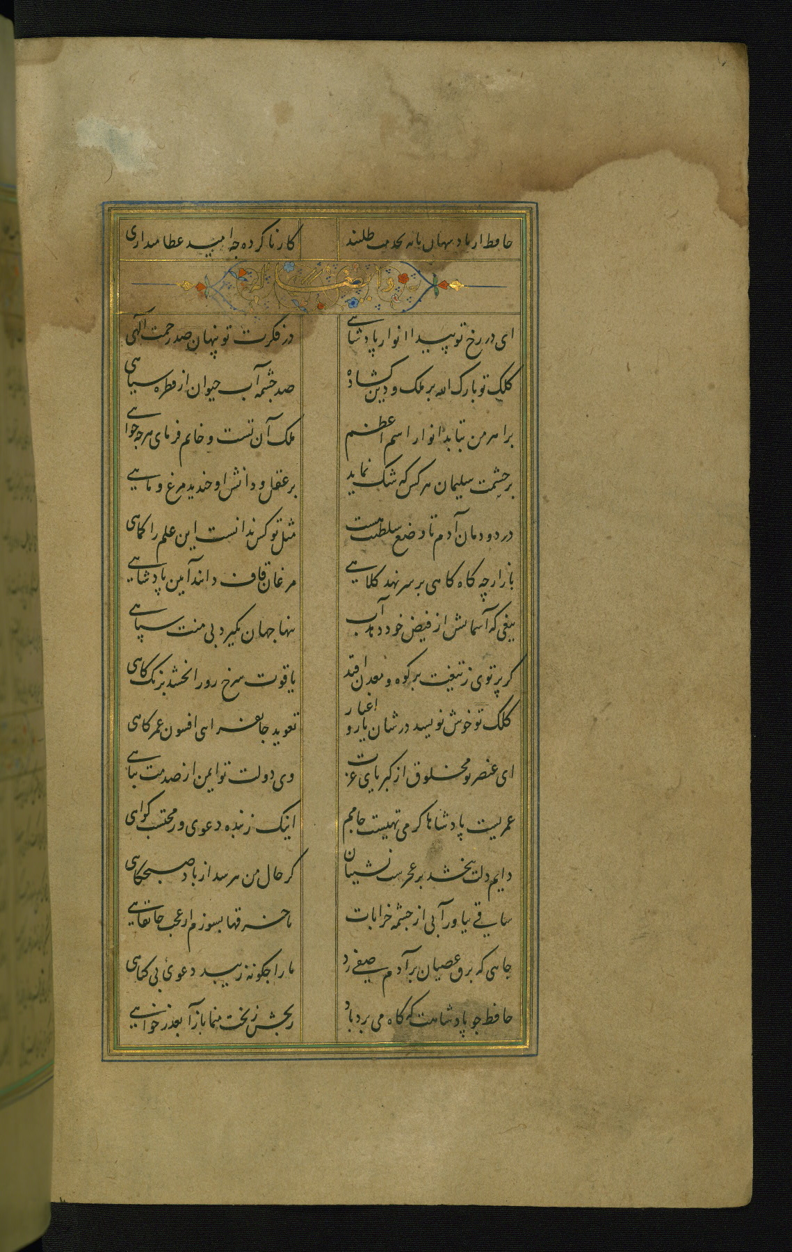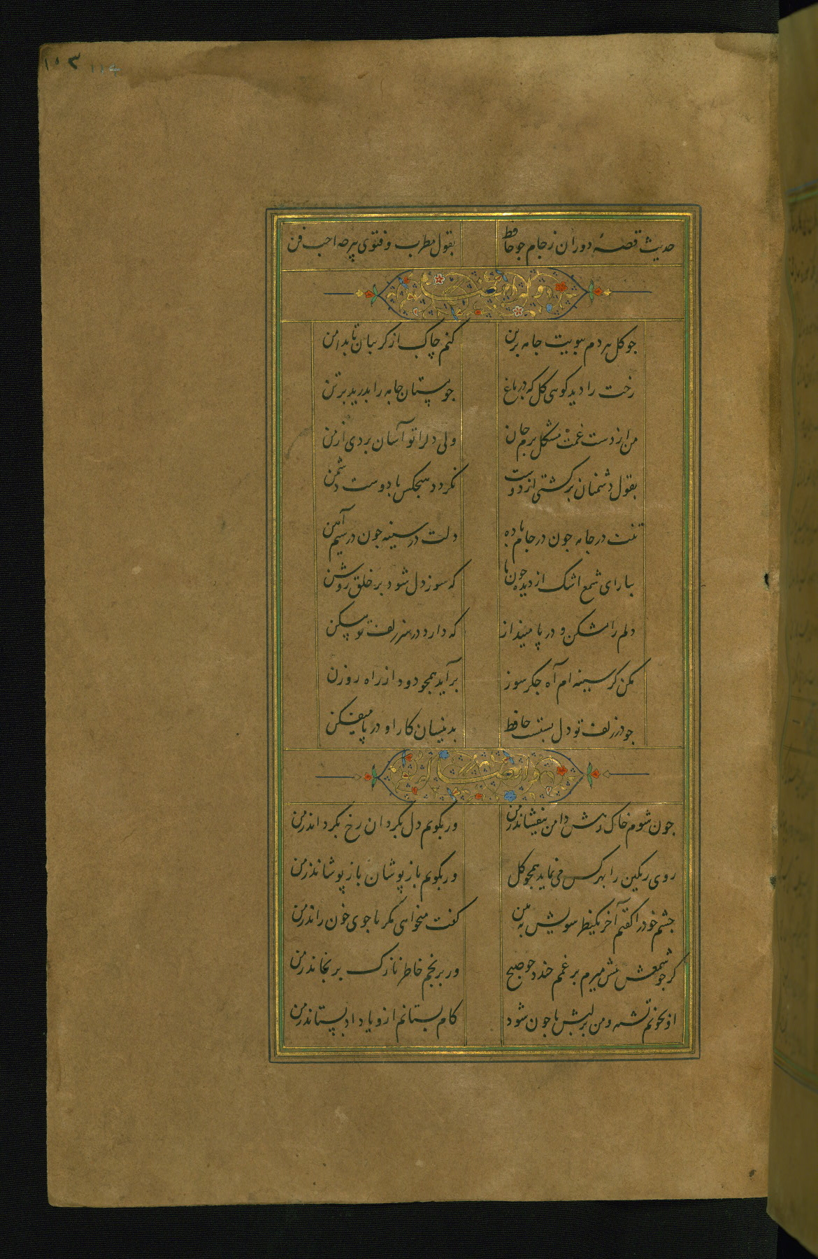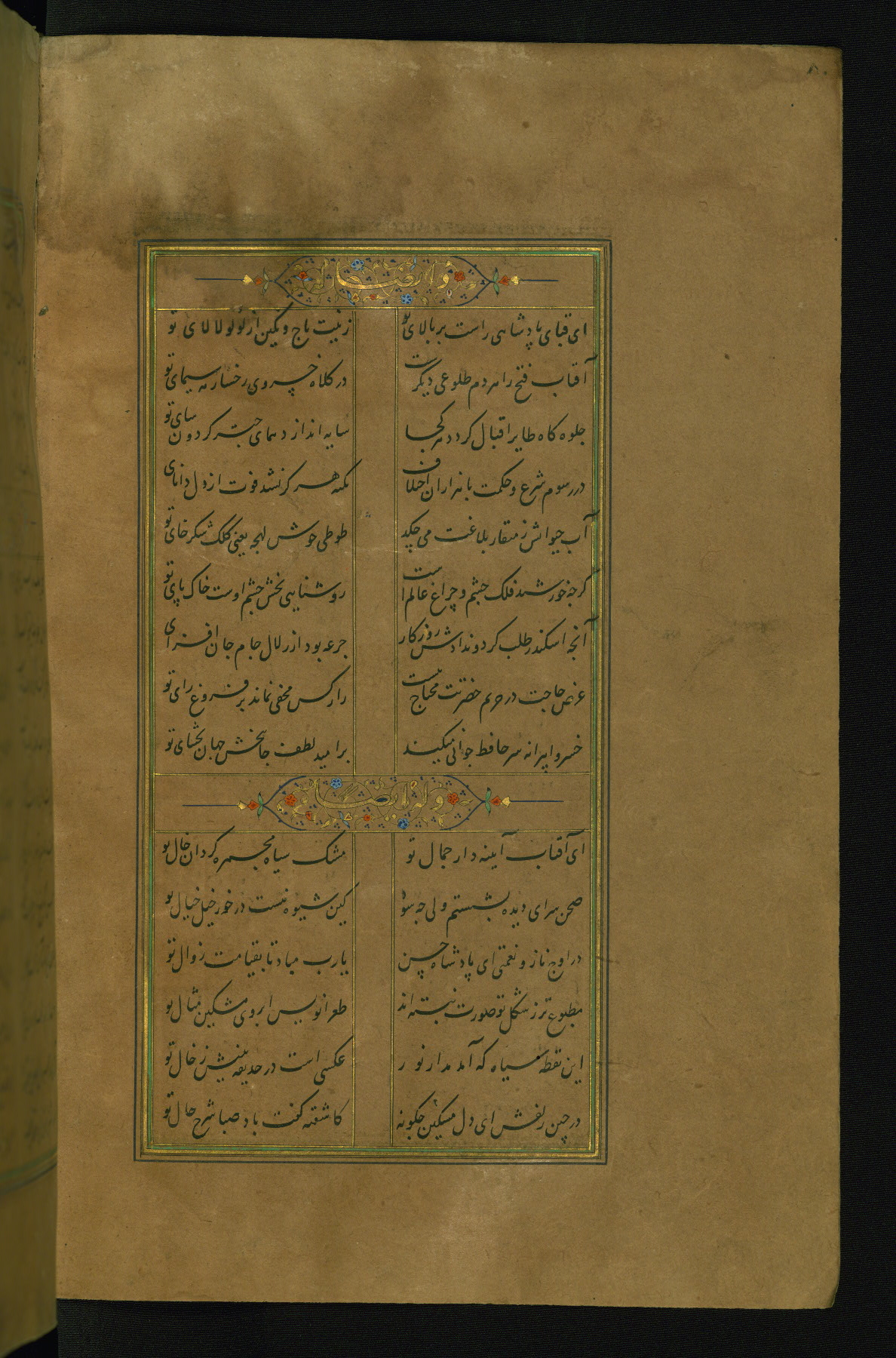 This is an illuminated and illustrated manuscript copy of the Collection of poems (dīvān) by Shams al-Dīn Muḥammad Ḥāfiz al-Shīrāzī (fl. eighth century AH / fourteenth CE). It was written in black nasta‘līq script with chapter/section headings in gold ink by Zayn al-‘Ābidīn ‘Abd al-Raḥmān al-Jāmī in 918 AH / 1512 CE in Safavid Iran. The manuscript opens with an illuminated medallion (fol. 1a), followed by a double-page illustrated frontispiece (fols. 1b-2a). The text begins with an incipit page with illuminated headpiece (fol. 2b). There are three additional illustrations (fols. 24a, 49b, and 87a). The red leather binding, which is not original and may be attributed to late twelfth-century AH / eighteenth CE or thirteenth-century AH / nineteenth CE Turkey, has a scalloped medallion with gold-tooled decoration and borders.