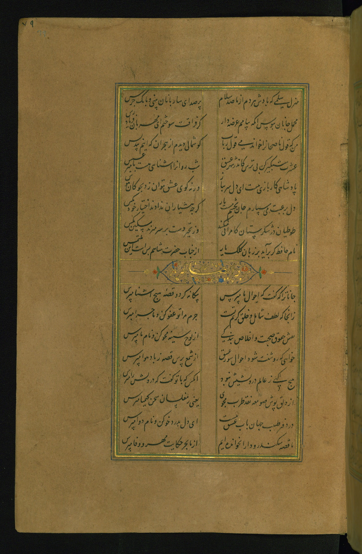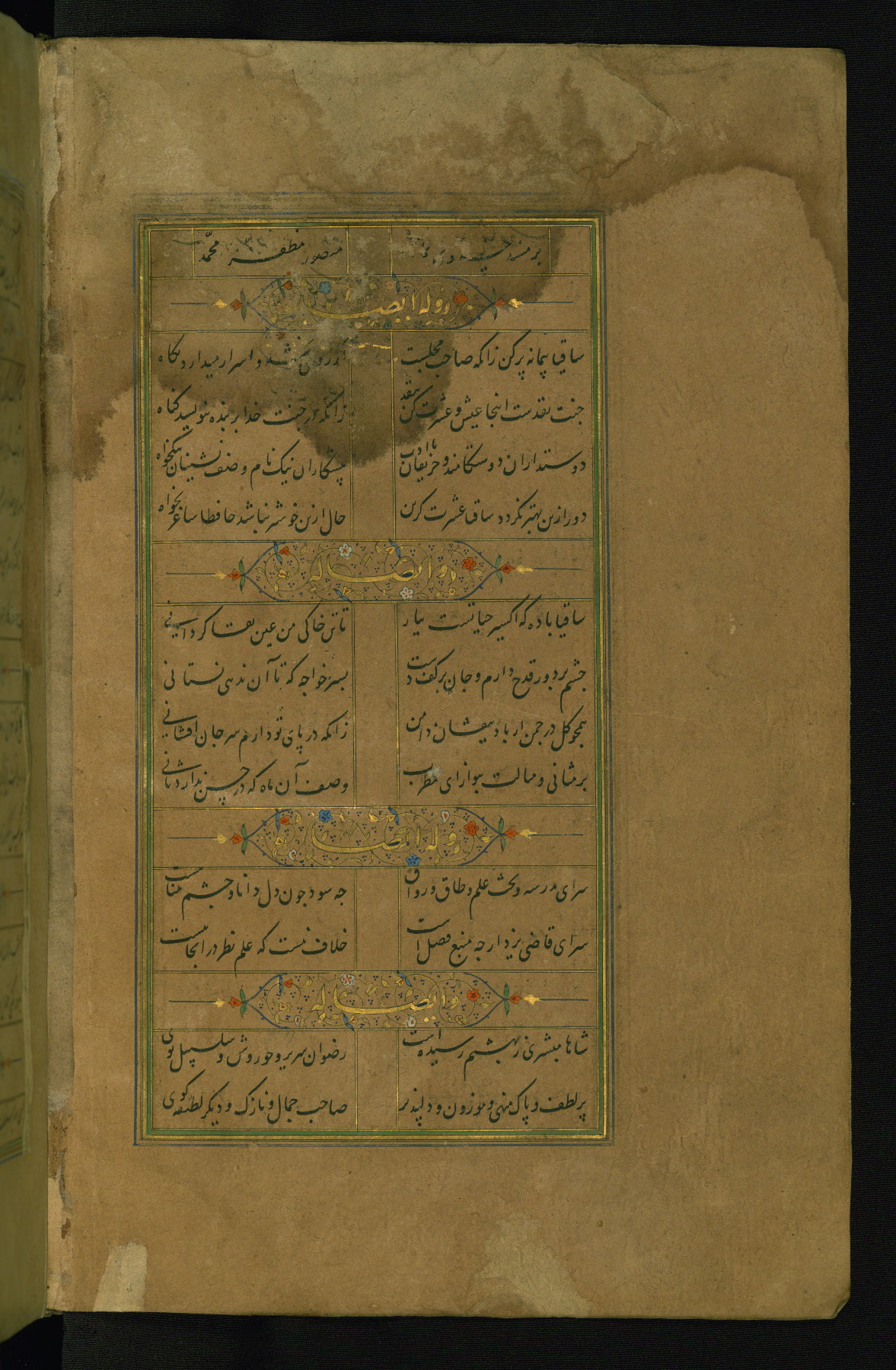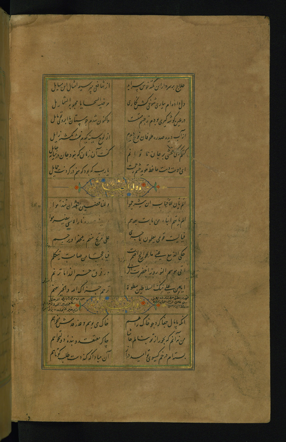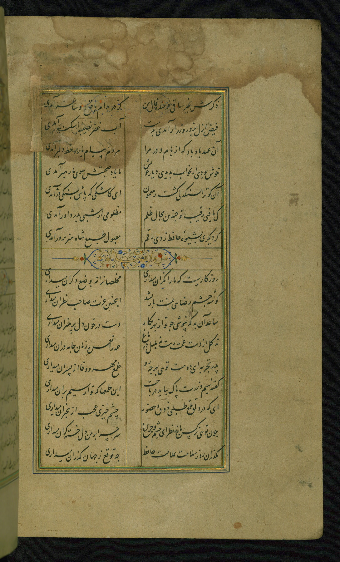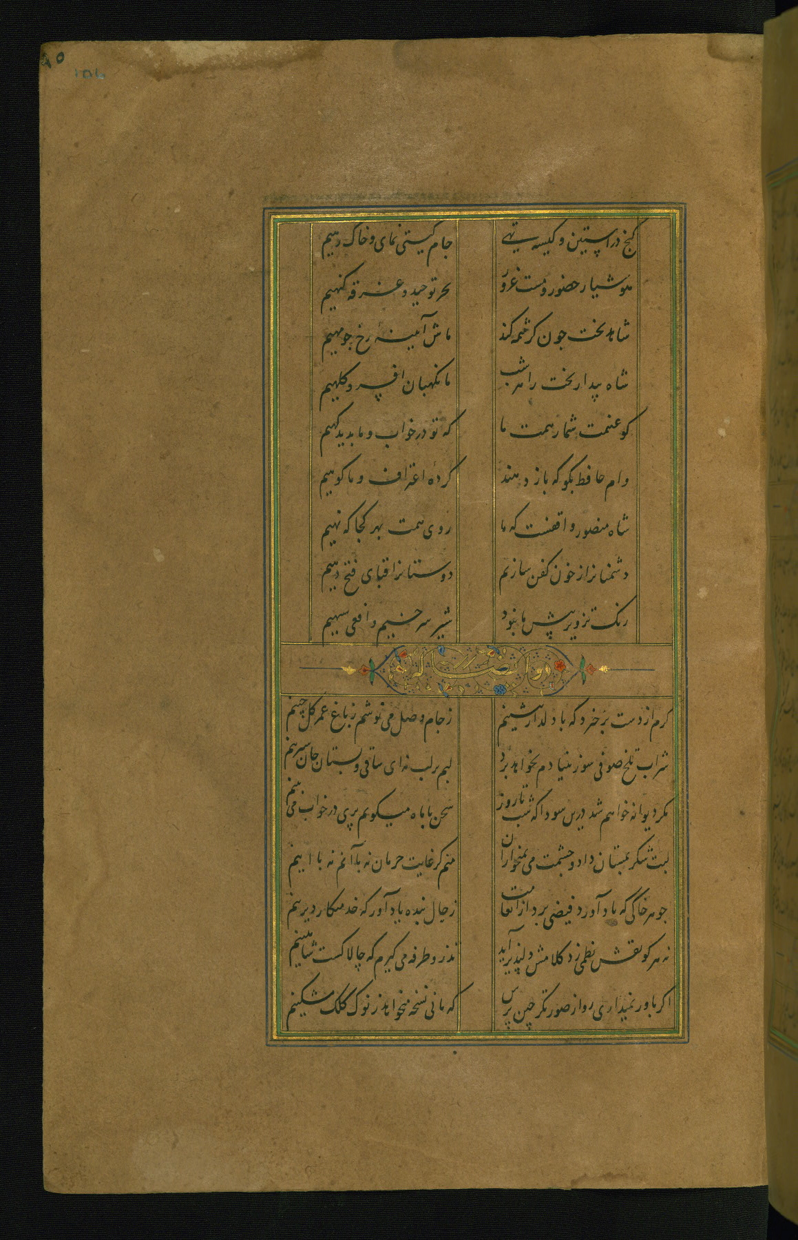 This is an illuminated and illustrated manuscript copy of the Collection of poems (dīvān) by Shams al-Dīn Muḥammad Ḥāfiz al-Shīrāzī (fl. eighth century AH / fourteenth CE). It was written in black nasta‘līq script with chapter/section headings in gold ink by Zayn al-‘Ābidīn ‘Abd al-Raḥmān al-Jāmī in 918 AH / 1512 CE in Safavid Iran. The manuscript opens with an illuminated medallion (fol. 1a), followed by a double-page illustrated frontispiece (fols. 1b-2a). The text begins with an incipit page with illuminated headpiece (fol. 2b). There are three additional illustrations (fols. 24a, 49b, and 87a). The red leather binding, which is not original and may be attributed to late twelfth-century AH / eighteenth CE or thirteenth-century AH / nineteenth CE Turkey, has a scalloped medallion with gold-tooled decoration and borders.
