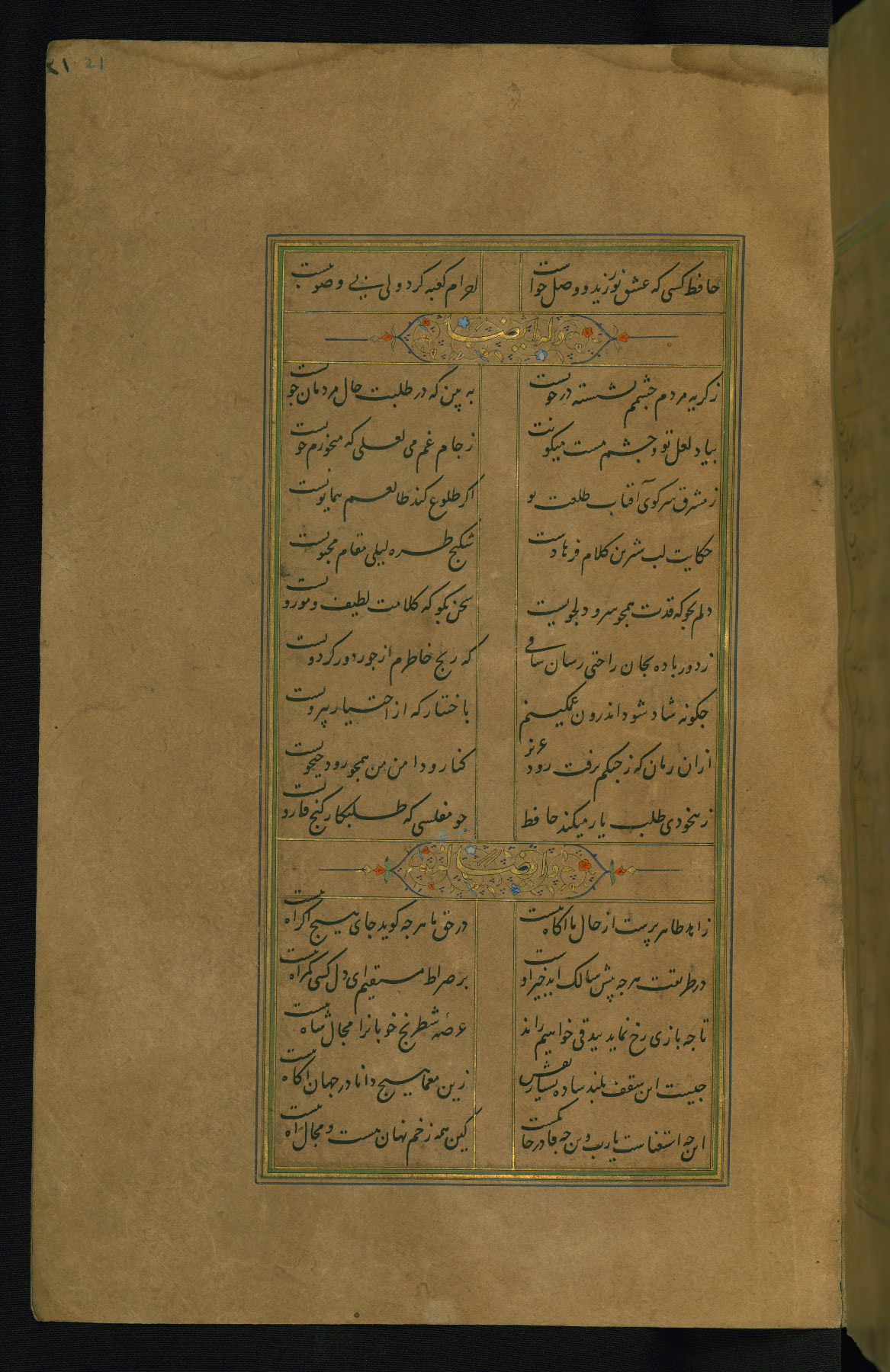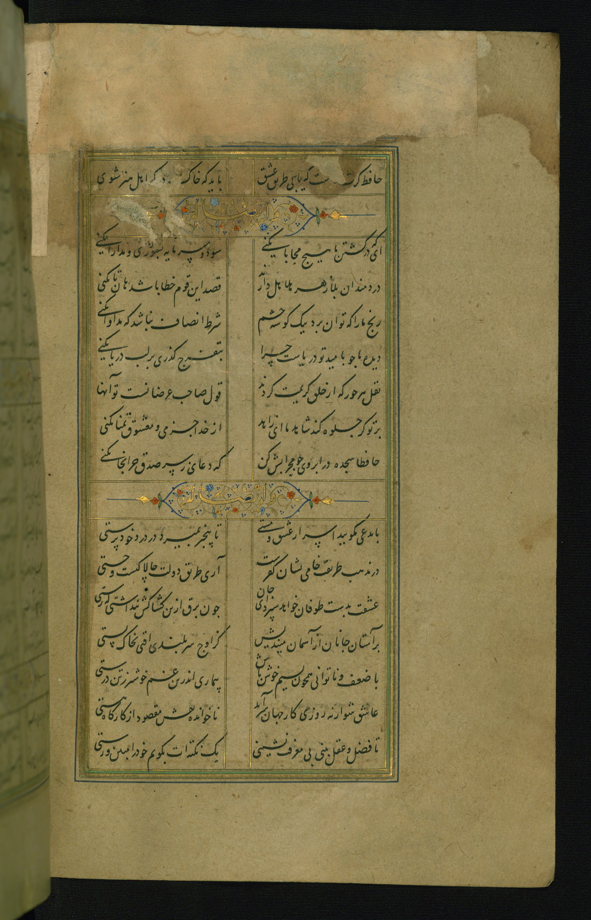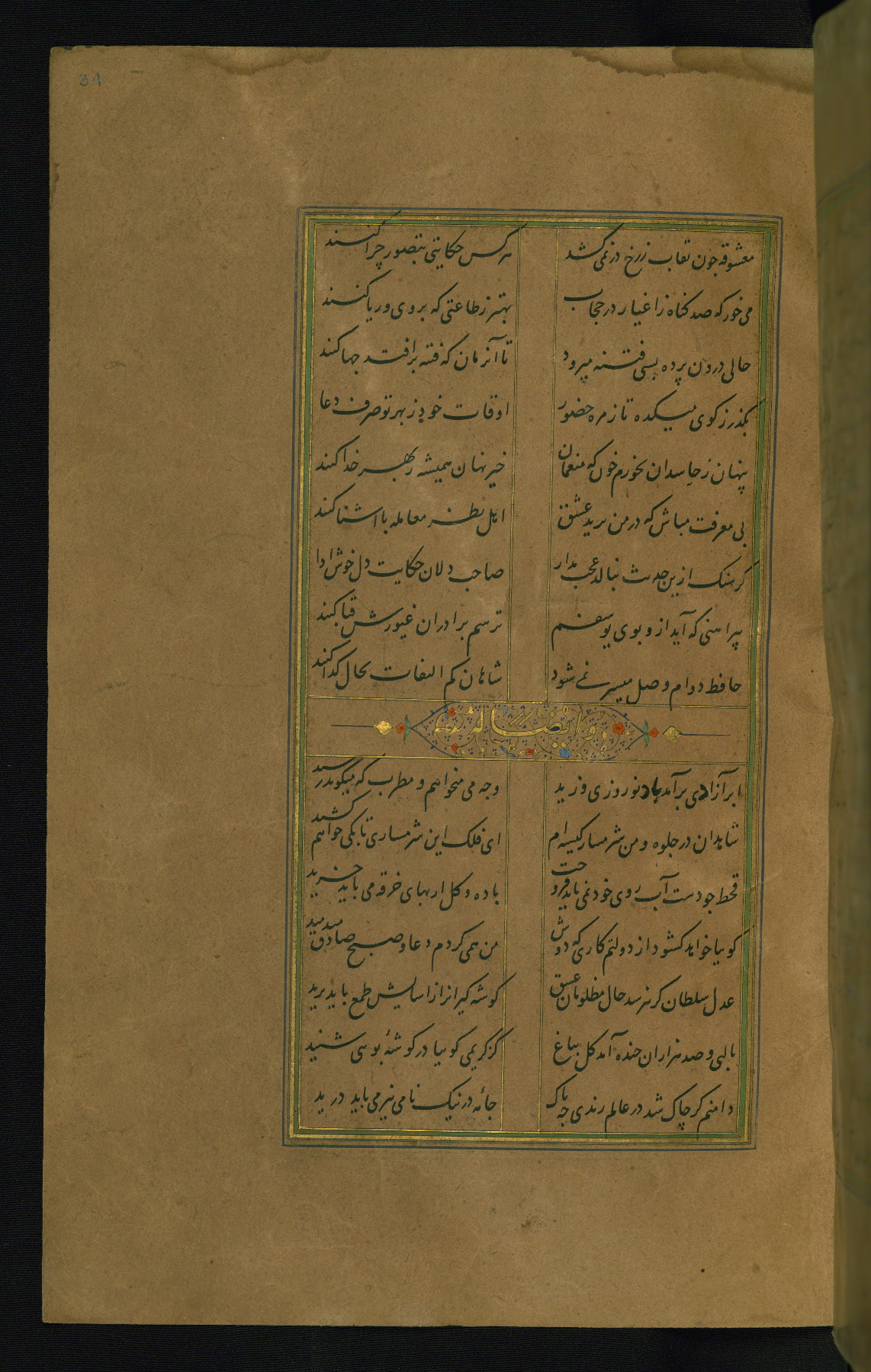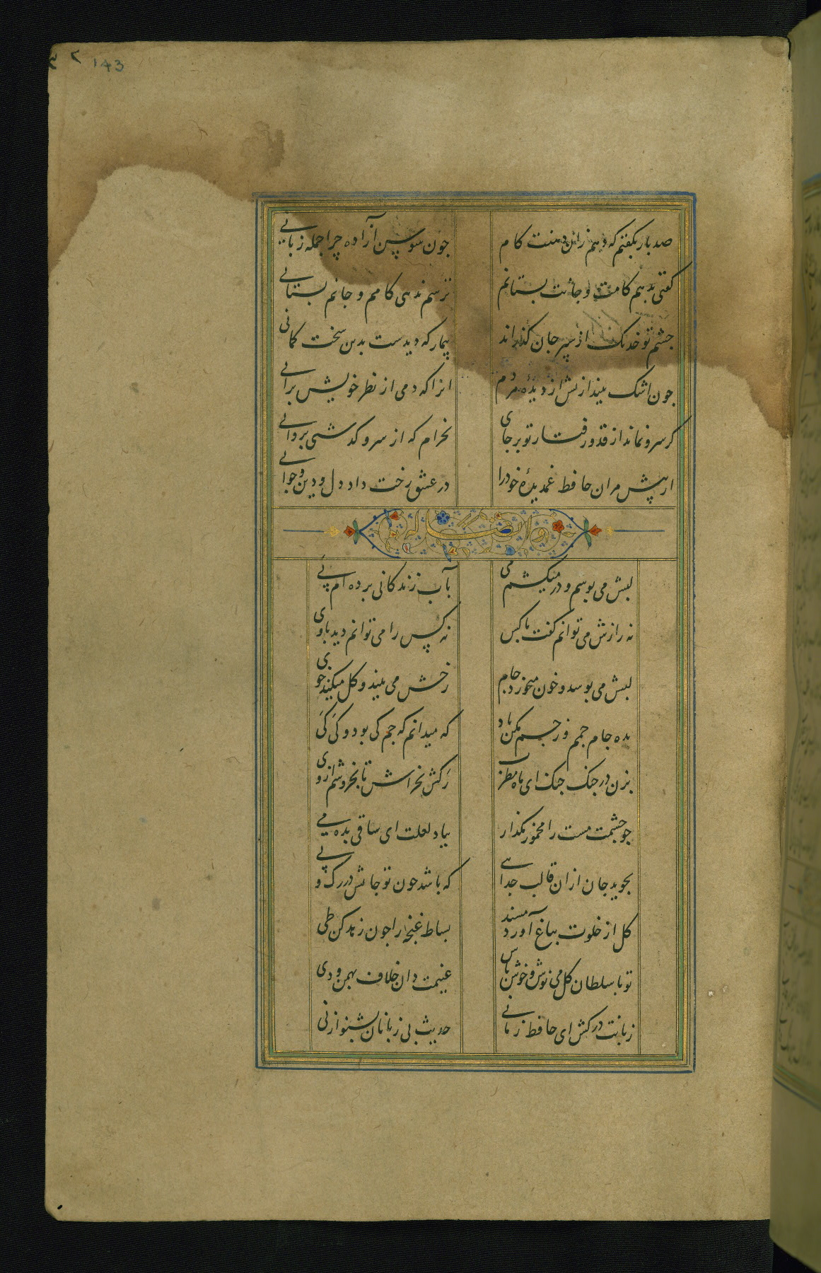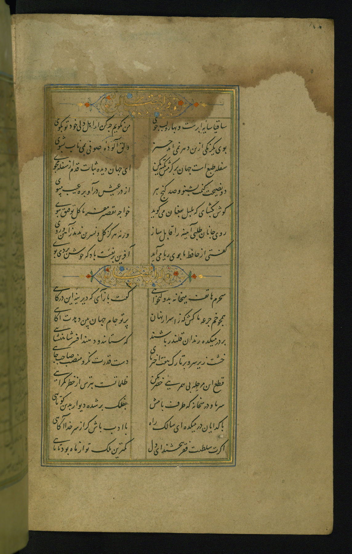 This is an illuminated and illustrated manuscript copy of the Collection of poems (dīvān) by Shams al-Dīn Muḥammad Ḥāfiz al-Shīrāzī (fl. eighth century AH / fourteenth CE). It was written in black nasta‘līq script with chapter/section headings in gold ink by Zayn al-‘Ābidīn ‘Abd al-Raḥmān al-Jāmī in 918 AH / 1512 CE in Safavid Iran. The manuscript opens with an illuminated medallion (fol. 1a), followed by a double-page illustrated frontispiece (fols. 1b-2a). The text begins with an incipit page with illuminated headpiece (fol. 2b). There are three additional illustrations (fols. 24a, 49b, and 87a). The red leather binding, which is not original and may be attributed to late twelfth-century AH / eighteenth CE or thirteenth-century AH / nineteenth CE Turkey, has a scalloped medallion with gold-tooled decoration and borders.