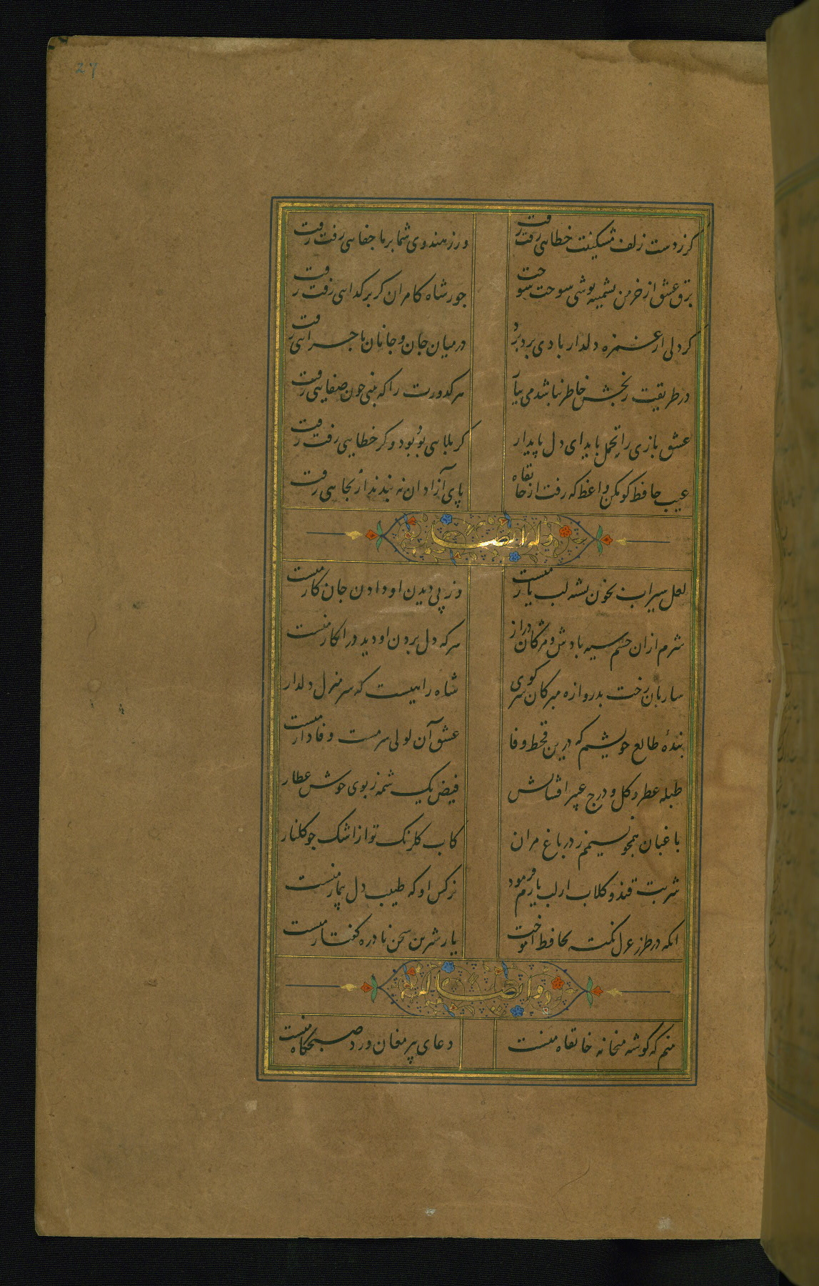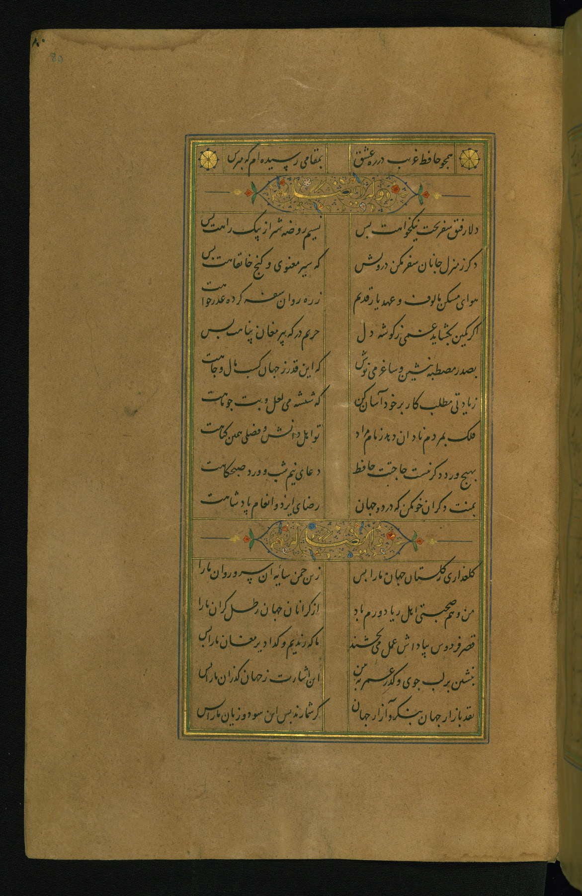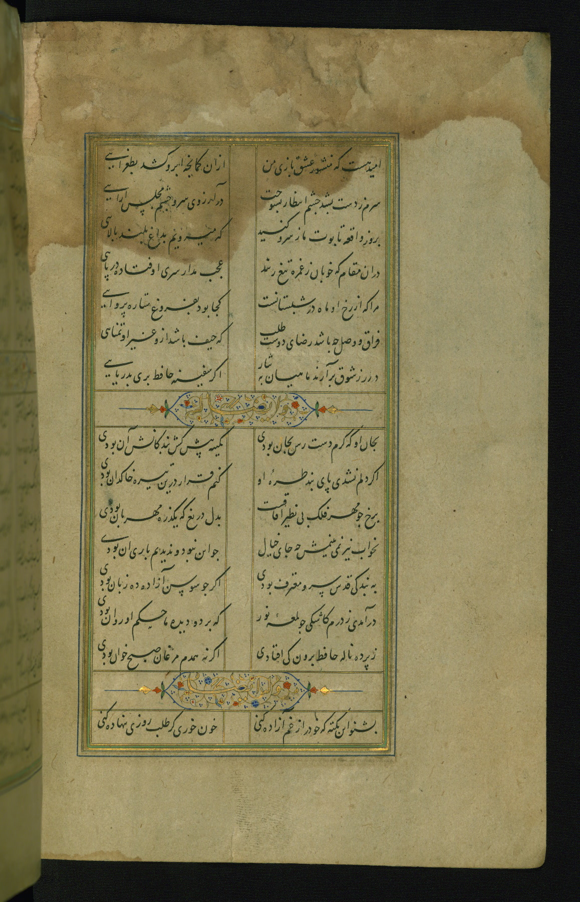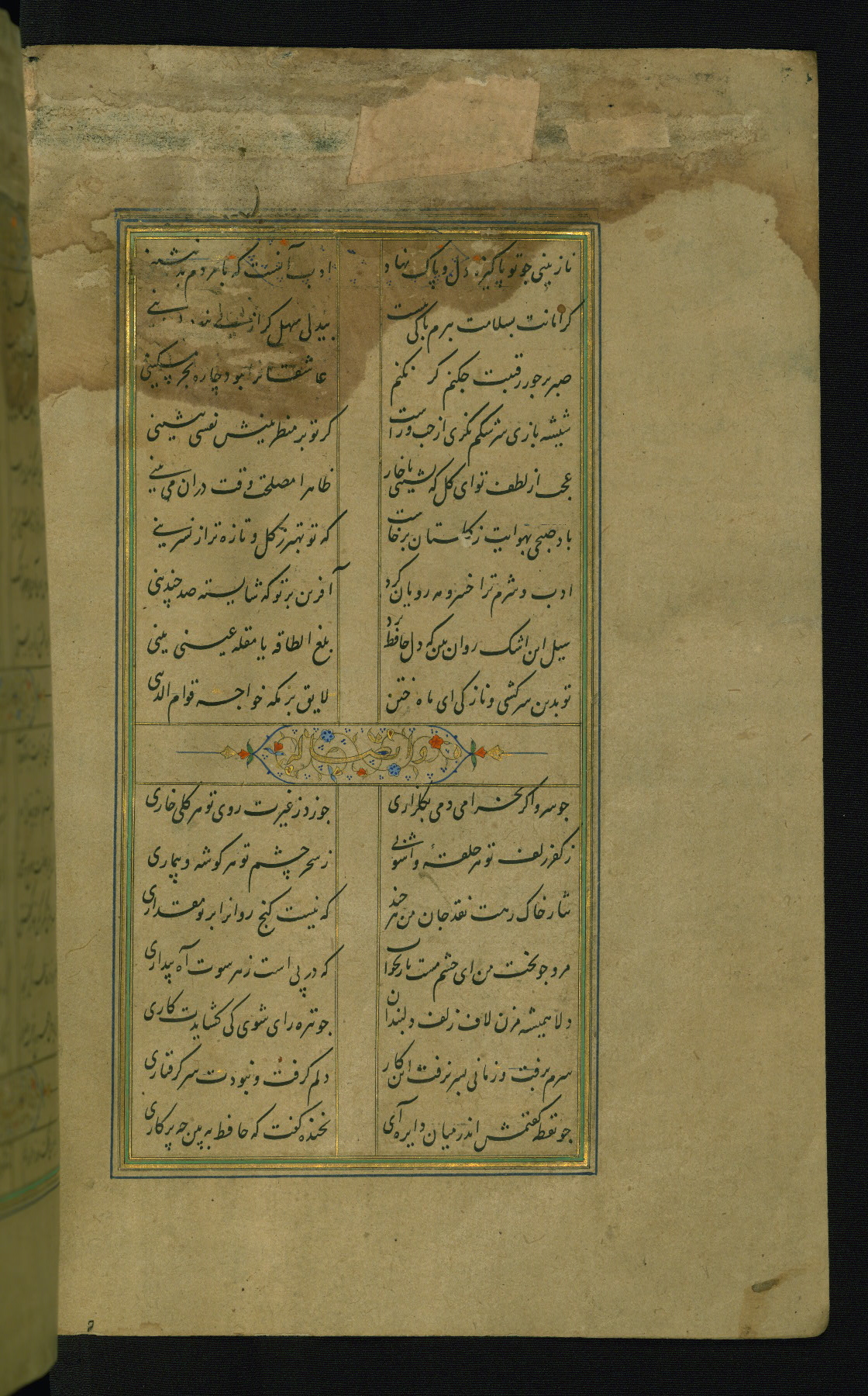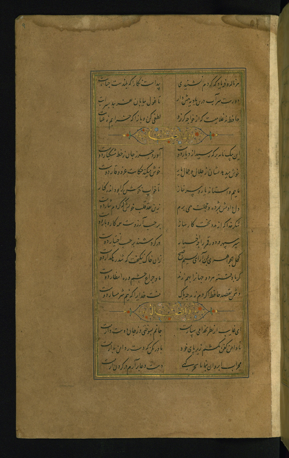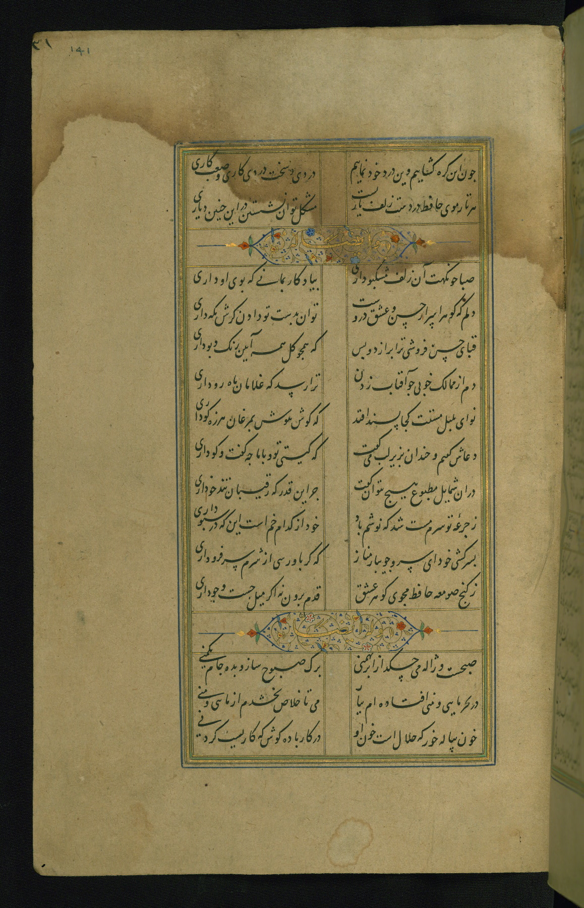 This is an illuminated and illustrated manuscript copy of the Collection of poems (dīvān) by Shams al-Dīn Muḥammad Ḥāfiz al-Shīrāzī (fl. eighth century AH / fourteenth CE). It was written in black nasta‘līq script with chapter/section headings in gold ink by Zayn al-‘Ābidīn ‘Abd al-Raḥmān al-Jāmī in 918 AH / 1512 CE in Safavid Iran. The manuscript opens with an illuminated medallion (fol. 1a), followed by a double-page illustrated frontispiece (fols. 1b-2a). The text begins with an incipit page with illuminated headpiece (fol. 2b). There are three additional illustrations (fols. 24a, 49b, and 87a). The red leather binding, which is not original and may be attributed to late twelfth-century AH / eighteenth CE or thirteenth-century AH / nineteenth CE Turkey, has a scalloped medallion with gold-tooled decoration and borders.