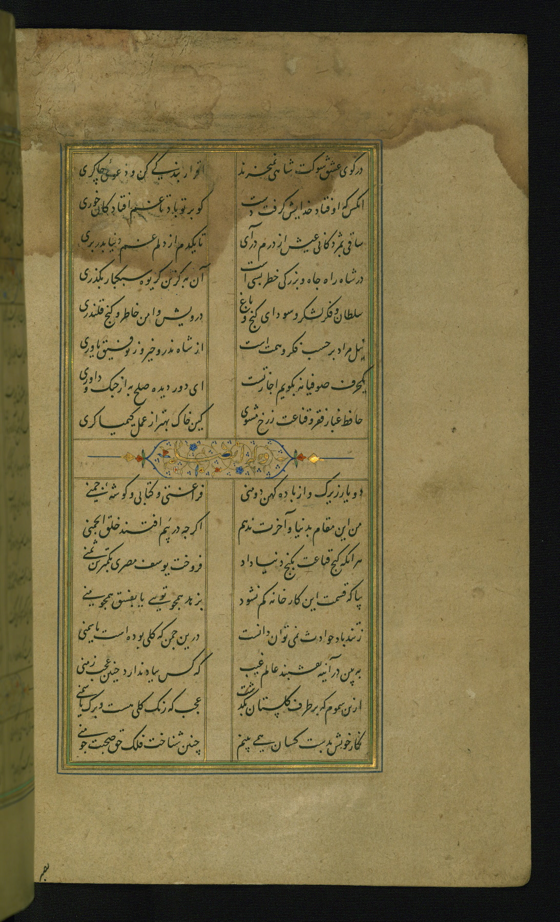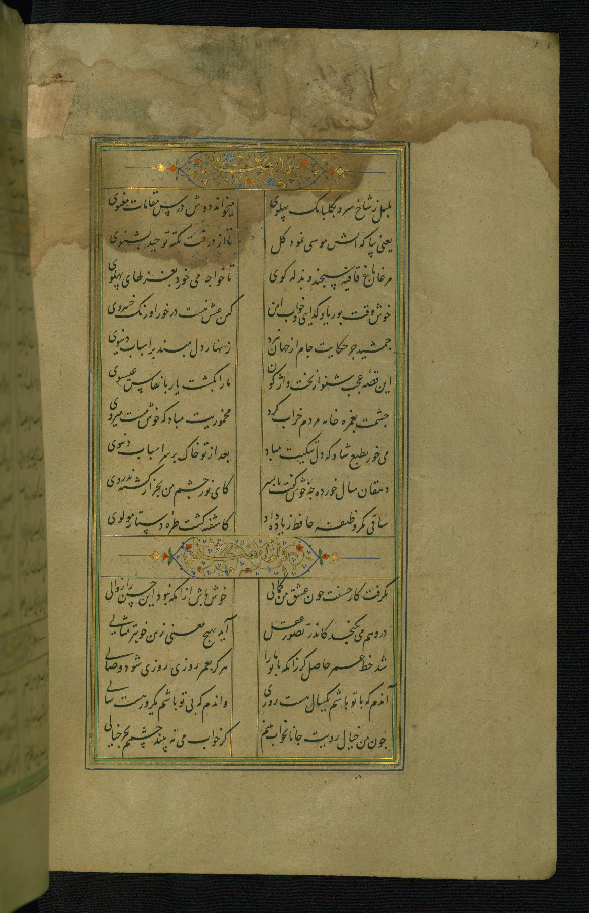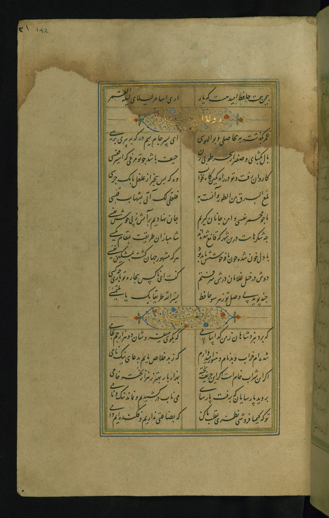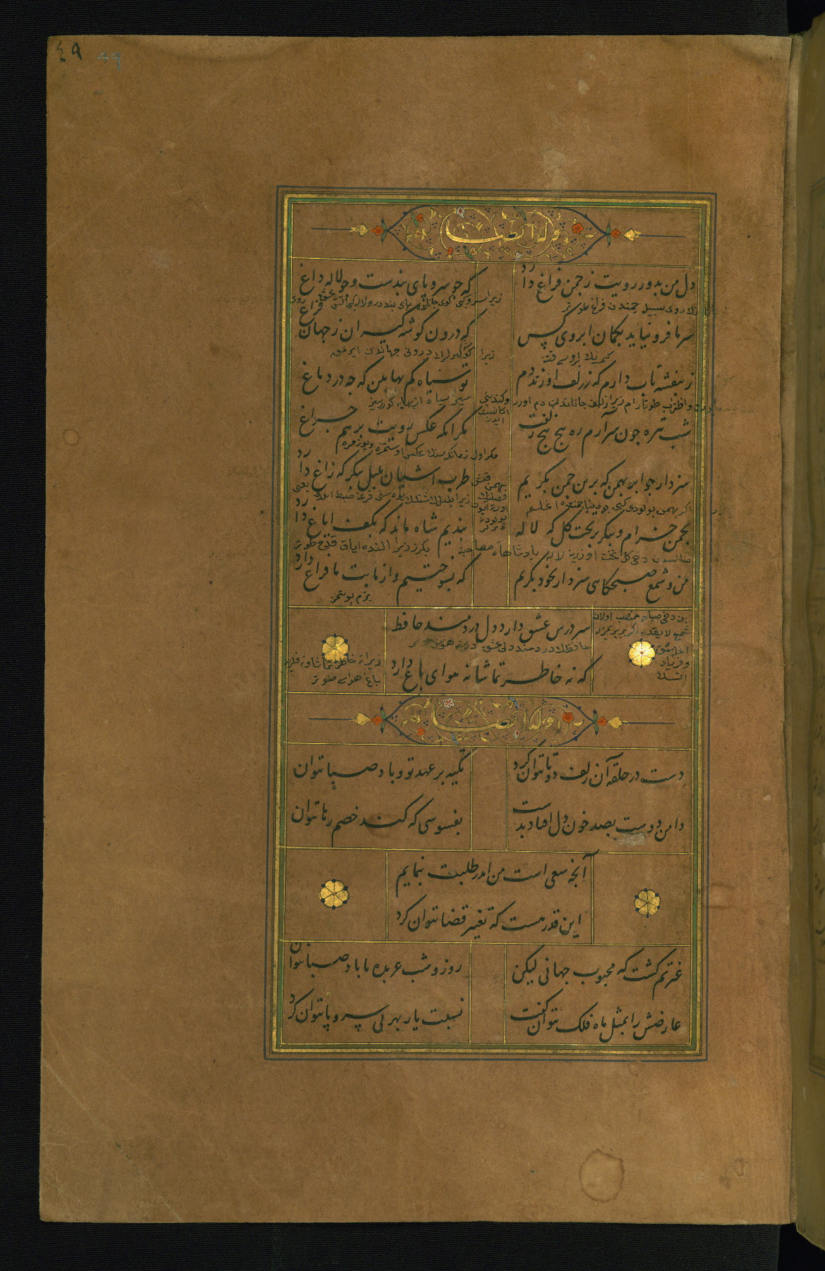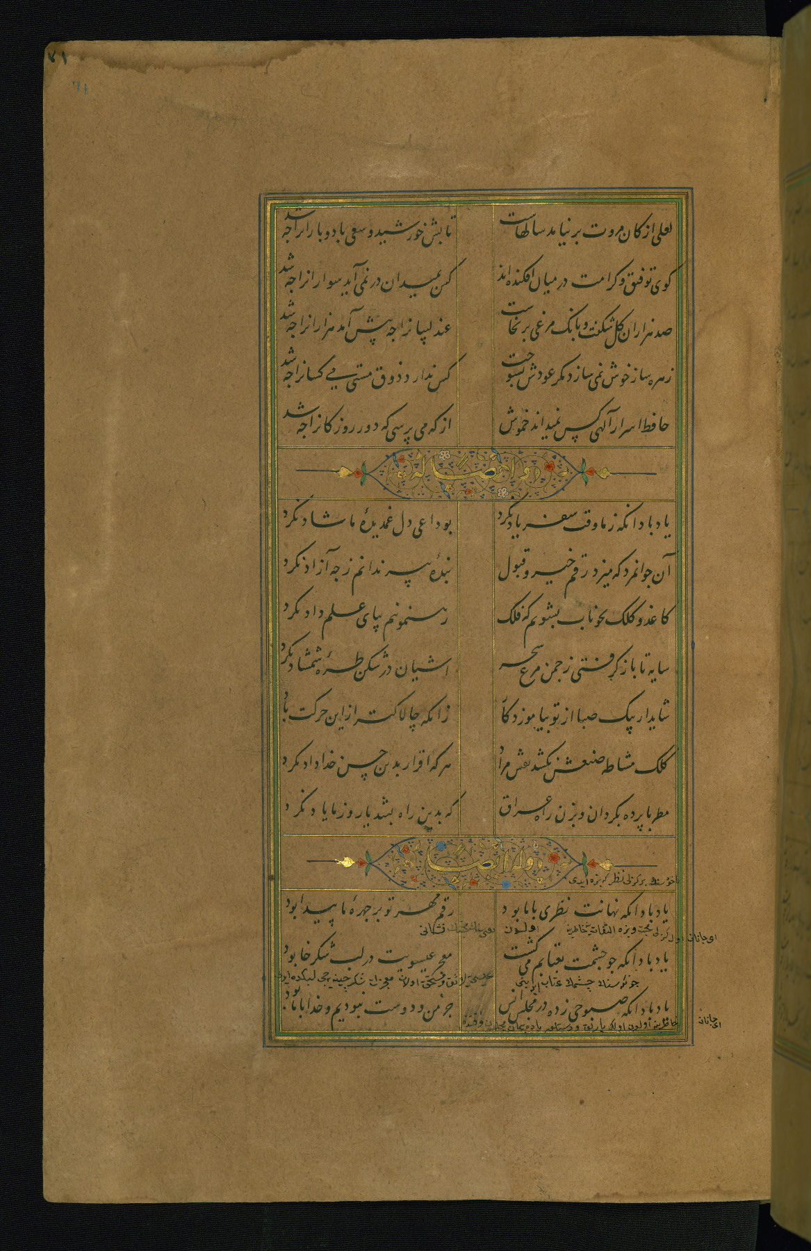 This is an illuminated and illustrated manuscript copy of the Collection of poems (dīvān) by Shams al-Dīn Muḥammad Ḥāfiz al-Shīrāzī (fl. eighth century AH / fourteenth CE). It was written in black nasta‘līq script with chapter/section headings in gold ink by Zayn al-‘Ābidīn ‘Abd al-Raḥmān al-Jāmī in 918 AH / 1512 CE in Safavid Iran. The manuscript opens with an illuminated medallion (fol. 1a), followed by a double-page illustrated frontispiece (fols. 1b-2a). The text begins with an incipit page with illuminated headpiece (fol. 2b). There are three additional illustrations (fols. 24a, 49b, and 87a). The red leather binding, which is not original and may be attributed to late twelfth-century AH / eighteenth CE or thirteenth-century AH / nineteenth CE Turkey, has a scalloped medallion with gold-tooled decoration and borders.