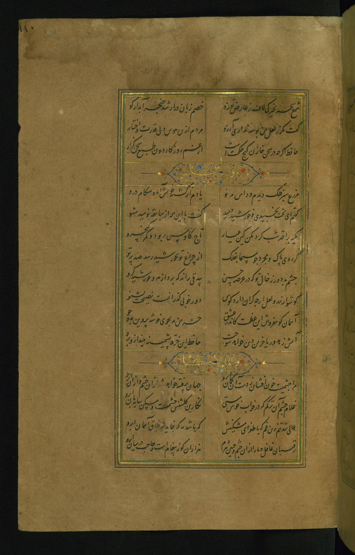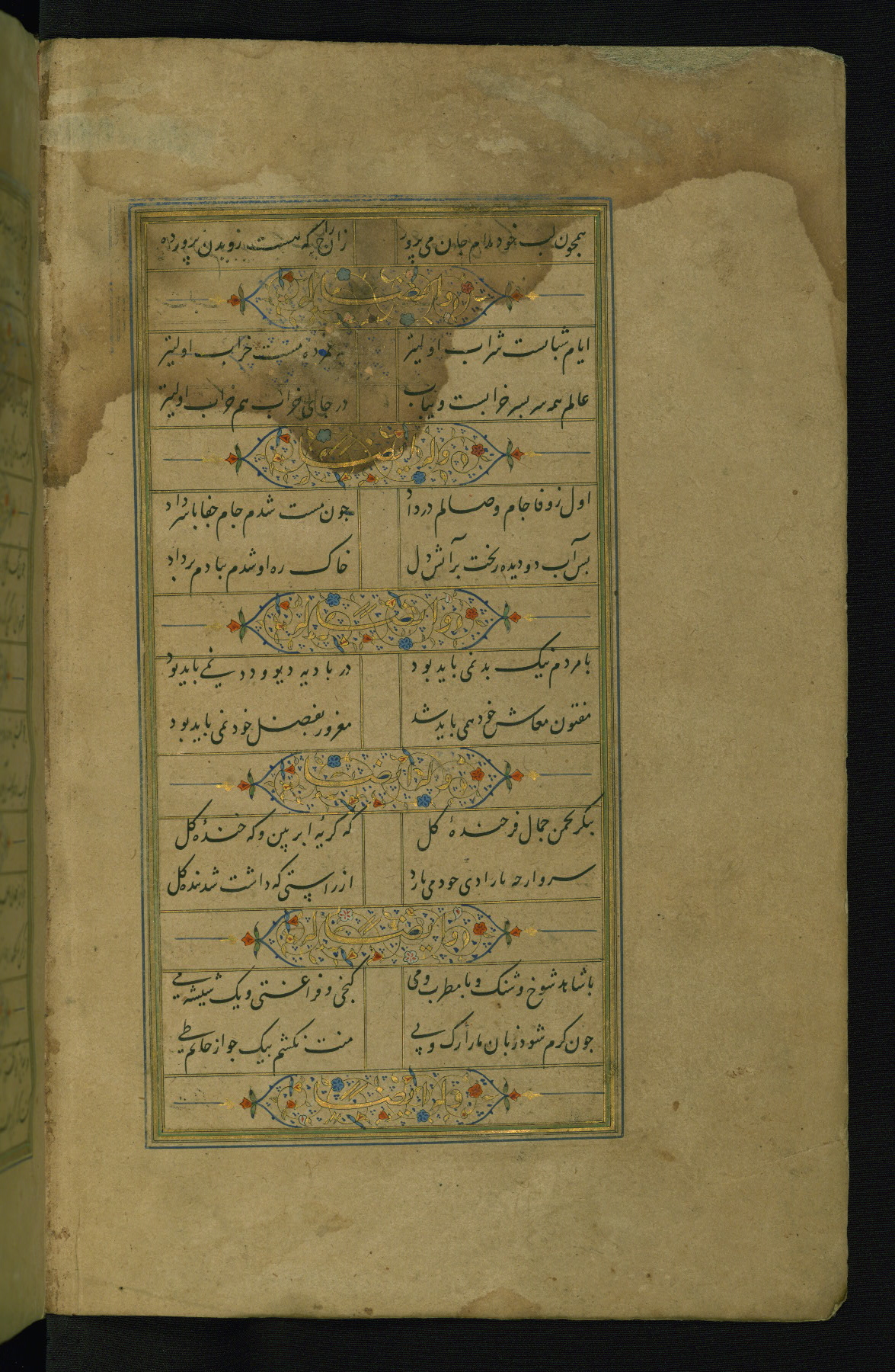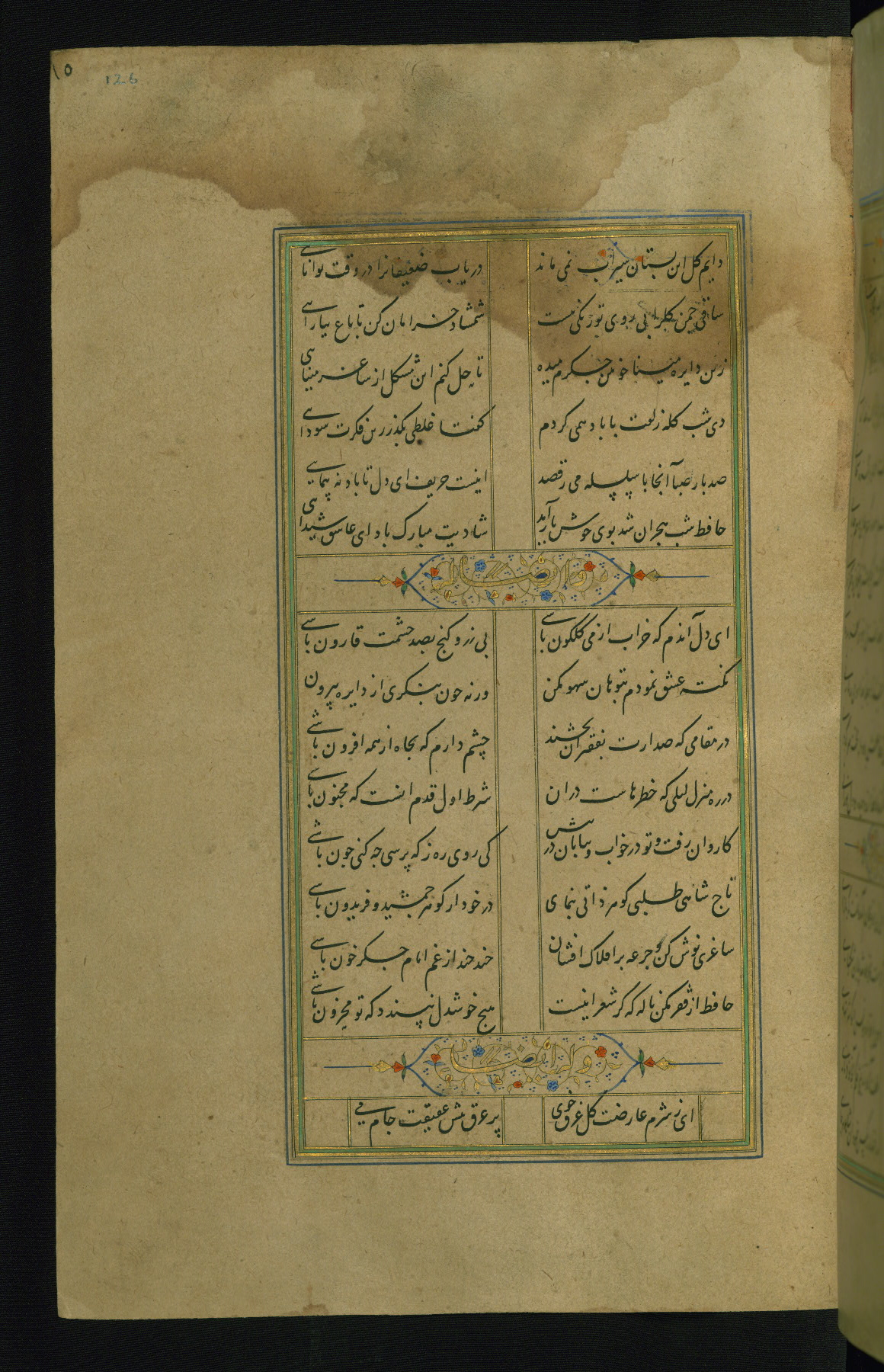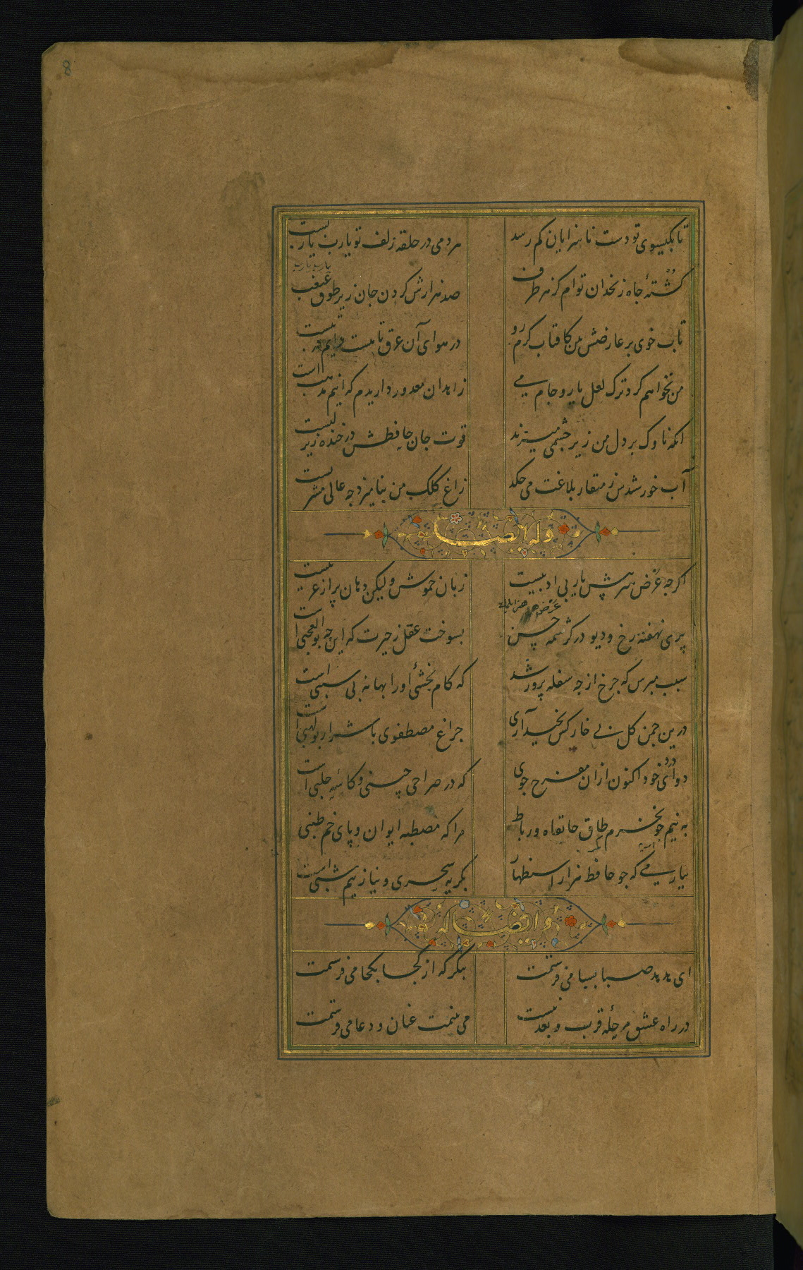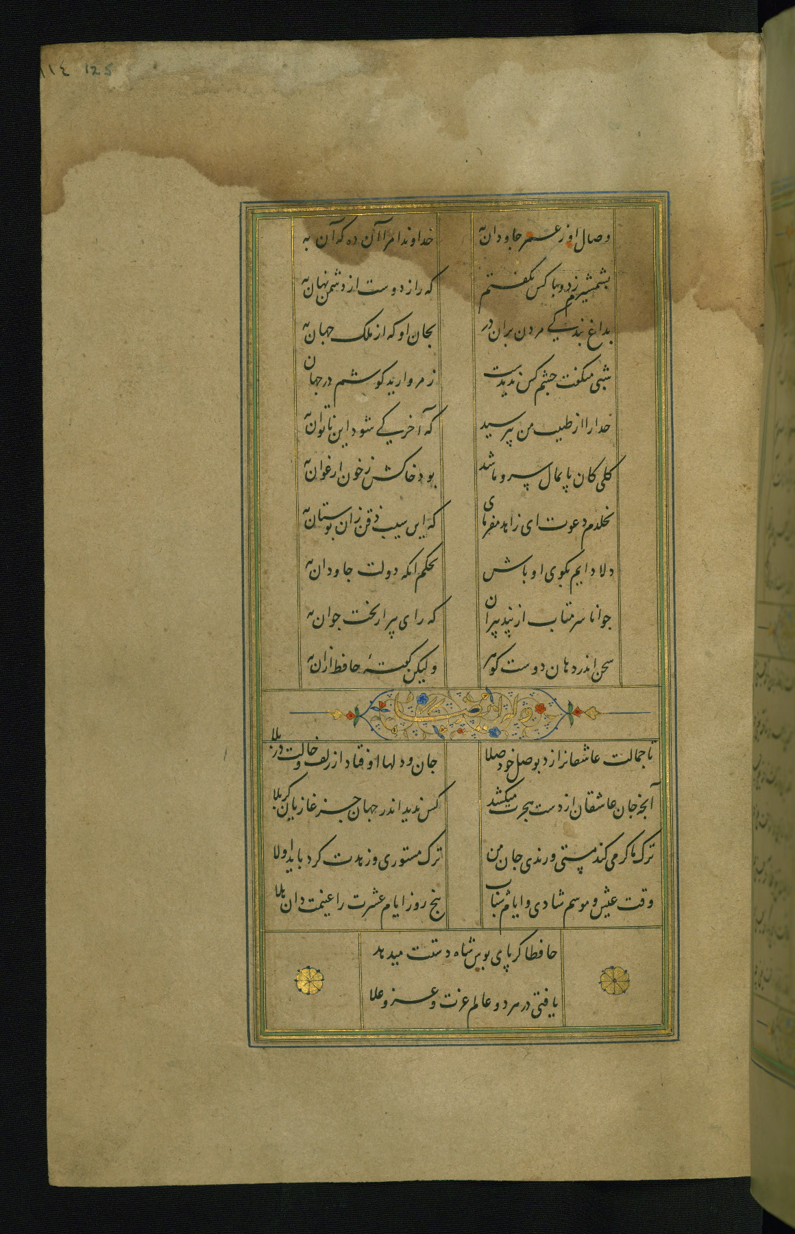 This is an illuminated and illustrated manuscript copy of the Collection of poems (dīvān) by Shams al-Dīn Muḥammad Ḥāfiz al-Shīrāzī (fl. eighth century AH / fourteenth CE). It was written in black nasta‘līq script with chapter/section headings in gold ink by Zayn al-‘Ābidīn ‘Abd al-Raḥmān al-Jāmī in 918 AH / 1512 CE in Safavid Iran. The manuscript opens with an illuminated medallion (fol. 1a), followed by a double-page illustrated frontispiece (fols. 1b-2a). The text begins with an incipit page with illuminated headpiece (fol. 2b). There are three additional illustrations (fols. 24a, 49b, and 87a). The red leather binding, which is not original and may be attributed to late twelfth-century AH / eighteenth CE or thirteenth-century AH / nineteenth CE Turkey, has a scalloped medallion with gold-tooled decoration and borders.
