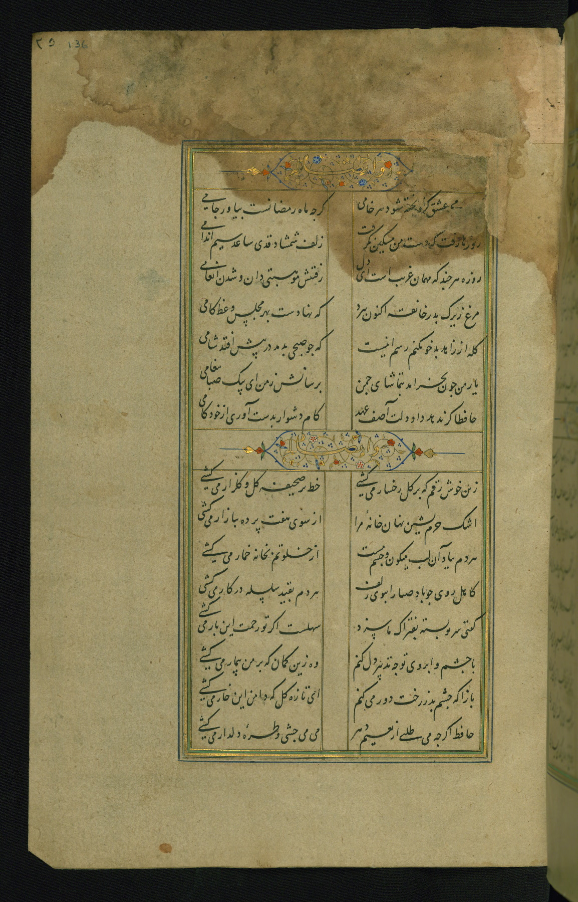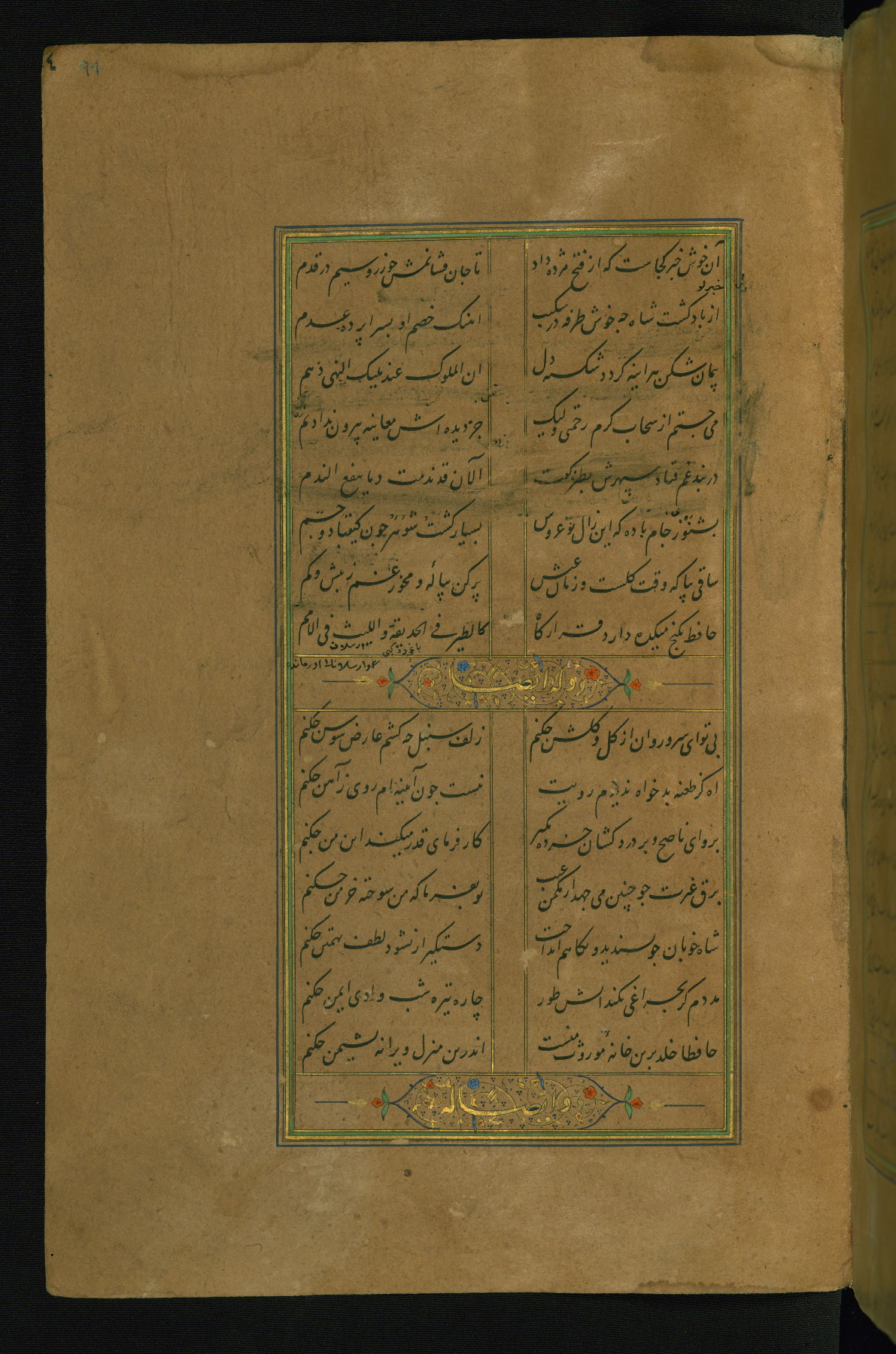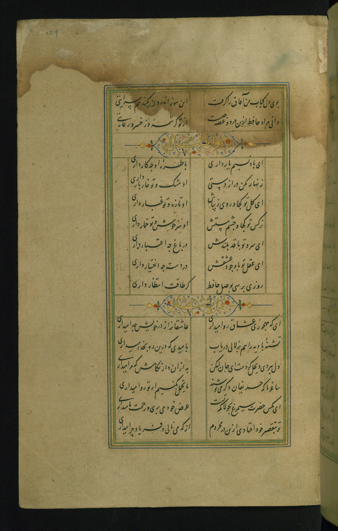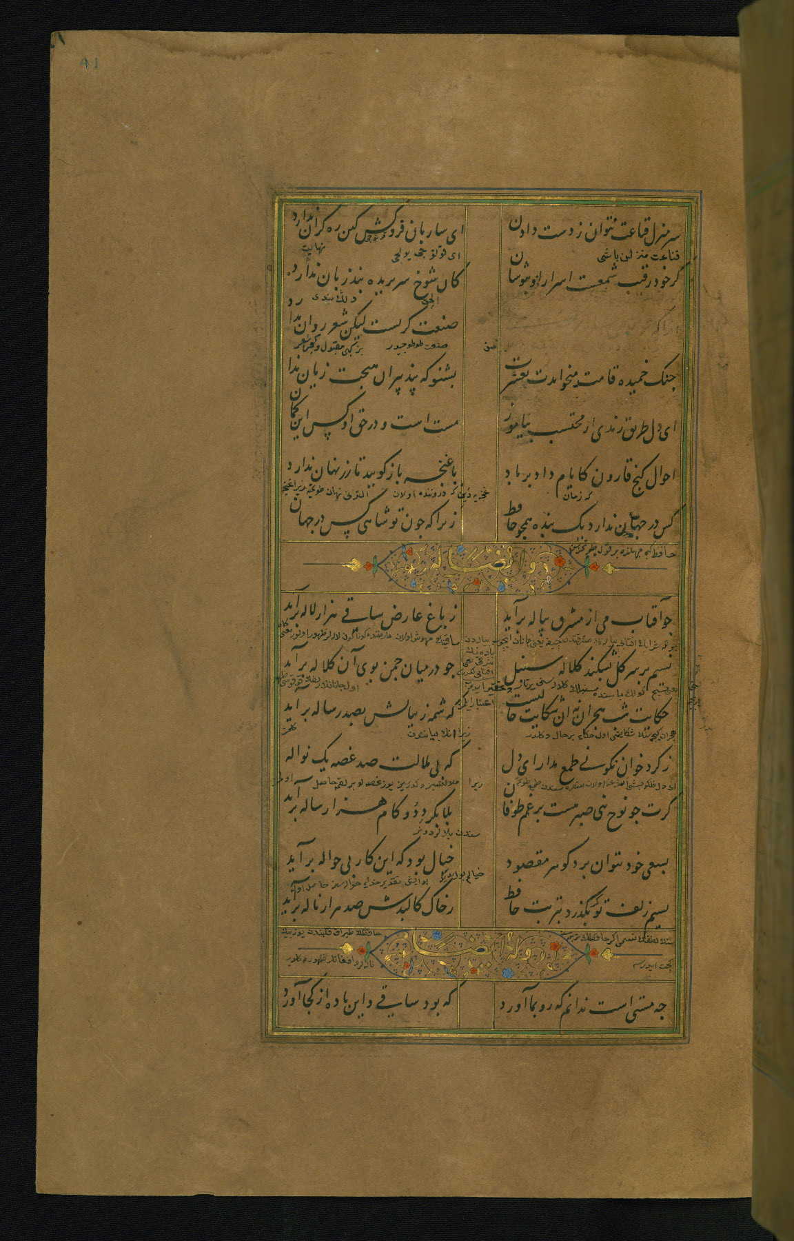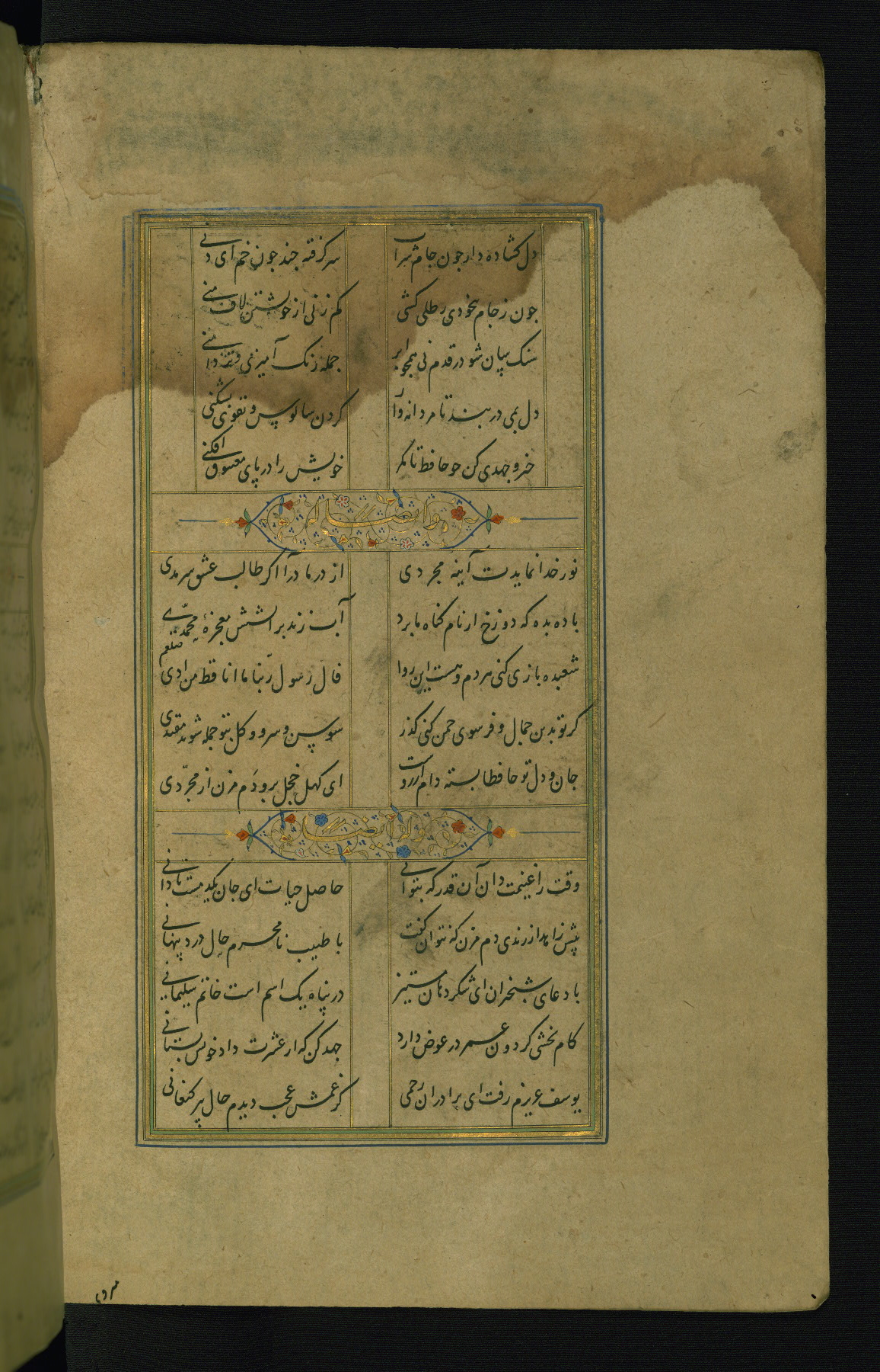This is an illuminated and illustrated manuscript copy of the Collection of poems (dīvān) by Shams al-Dīn Muḥammad Ḥāfiz al-Shīrāzī (fl. eighth century AH / fourteenth CE). It was written in black nasta‘līq script with chapter/section headings in gold ink by Zayn al-‘Ābidīn ‘Abd al-Raḥmān al-Jāmī in 918 AH / 1512 CE in Safavid Iran. The manuscript opens with an illuminated medallion (fol. 1a), followed by a double-page illustrated frontispiece (fols. 1b-2a). The text begins with an incipit page with illuminated headpiece (fol. 2b). There are three additional illustrations (fols. 24a, 49b, and 87a). The red leather binding, which is not original and may be attributed to late twelfth-century AH / eighteenth CE or thirteenth-century AH / nineteenth CE Turkey, has a scalloped medallion with gold-tooled decoration and borders.