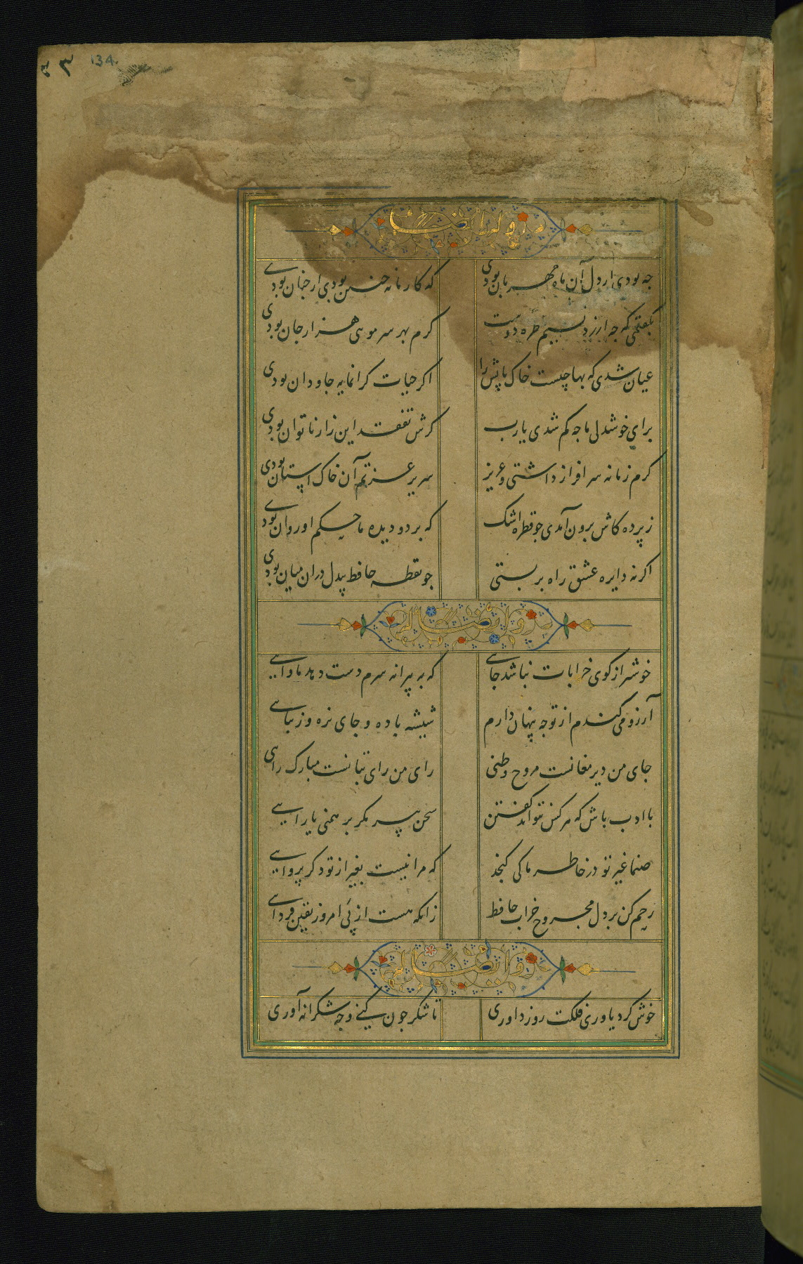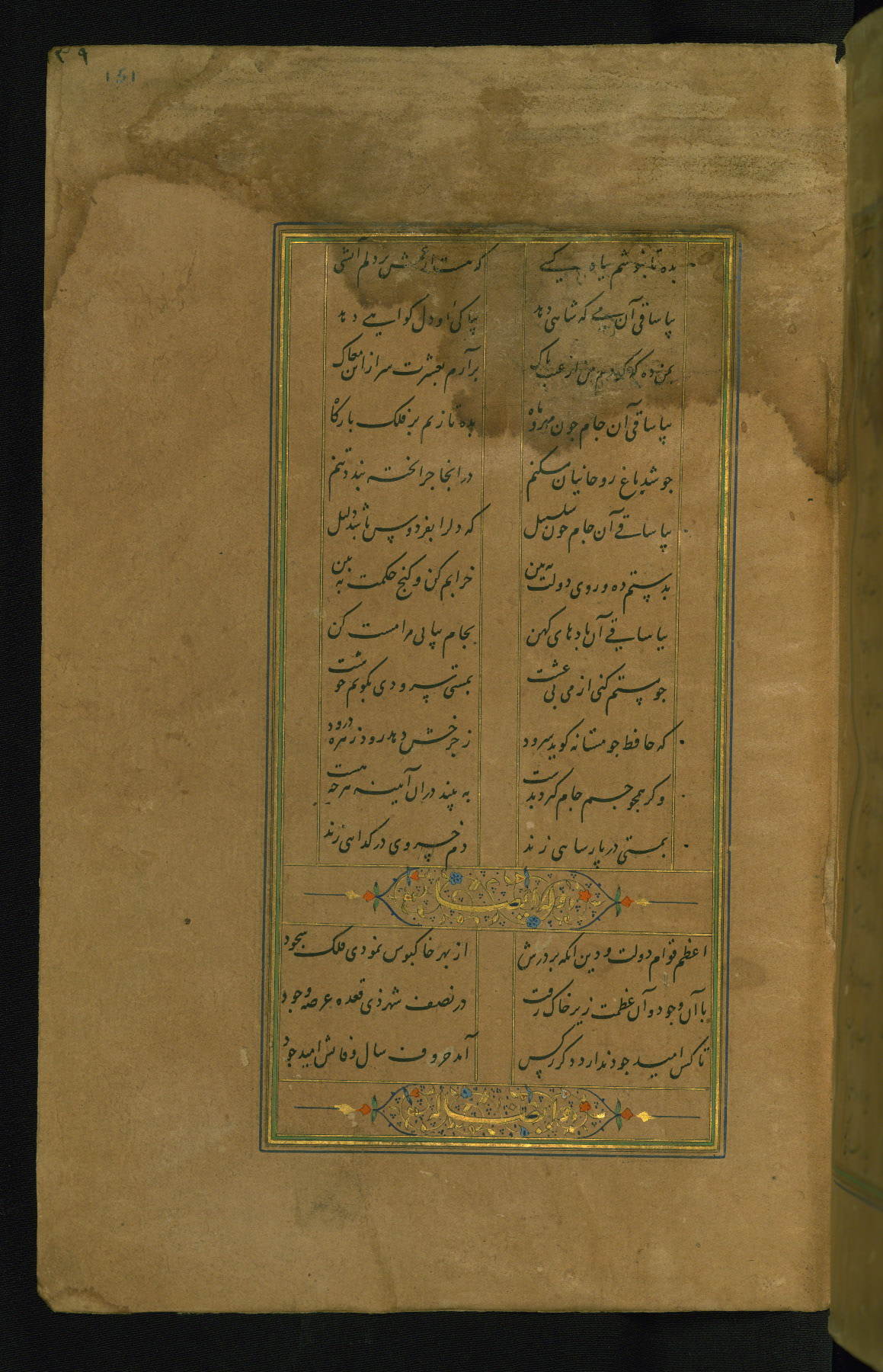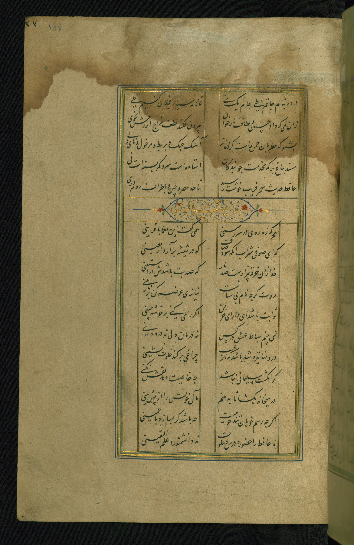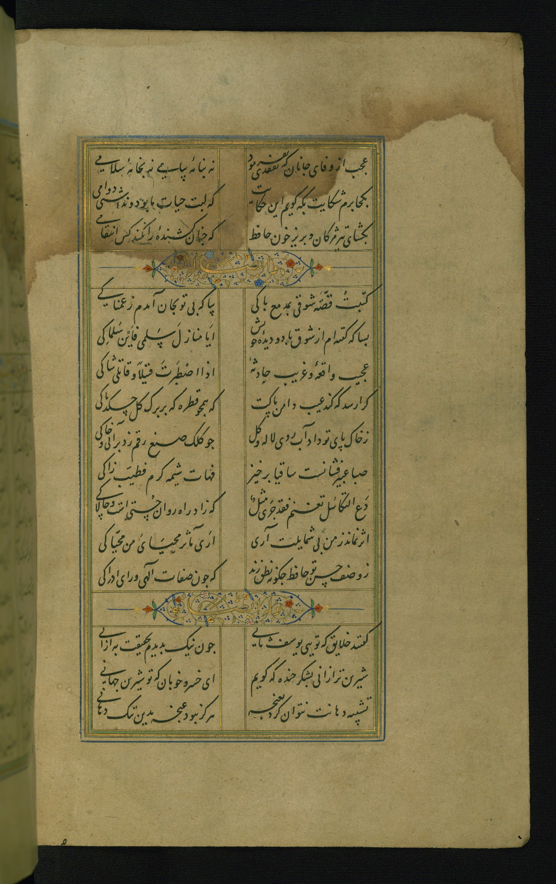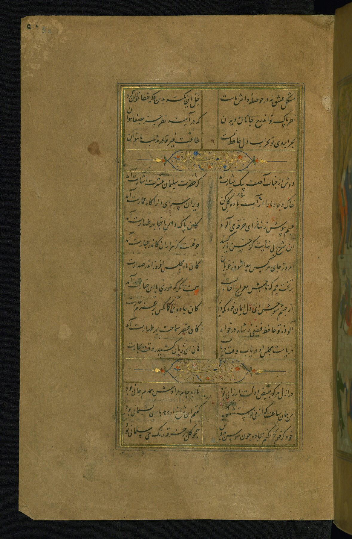 This is an illuminated and illustrated manuscript copy of the Collection of poems (dīvān) by Shams al-Dīn Muḥammad Ḥāfiz al-Shīrāzī (fl. eighth century AH / fourteenth CE). It was written in black nasta‘līq script with chapter/section headings in gold ink by Zayn al-‘Ābidīn ‘Abd al-Raḥmān al-Jāmī in 918 AH / 1512 CE in Safavid Iran. The manuscript opens with an illuminated medallion (fol. 1a), followed by a double-page illustrated frontispiece (fols. 1b-2a). The text begins with an incipit page with illuminated headpiece (fol. 2b). There are three additional illustrations (fols. 24a, 49b, and 87a). The red leather binding, which is not original and may be attributed to late twelfth-century AH / eighteenth CE or thirteenth-century AH / nineteenth CE Turkey, has a scalloped medallion with gold-tooled decoration and borders.