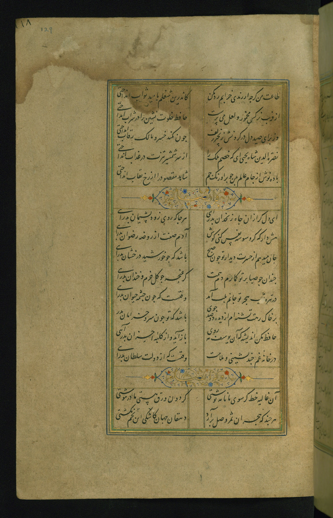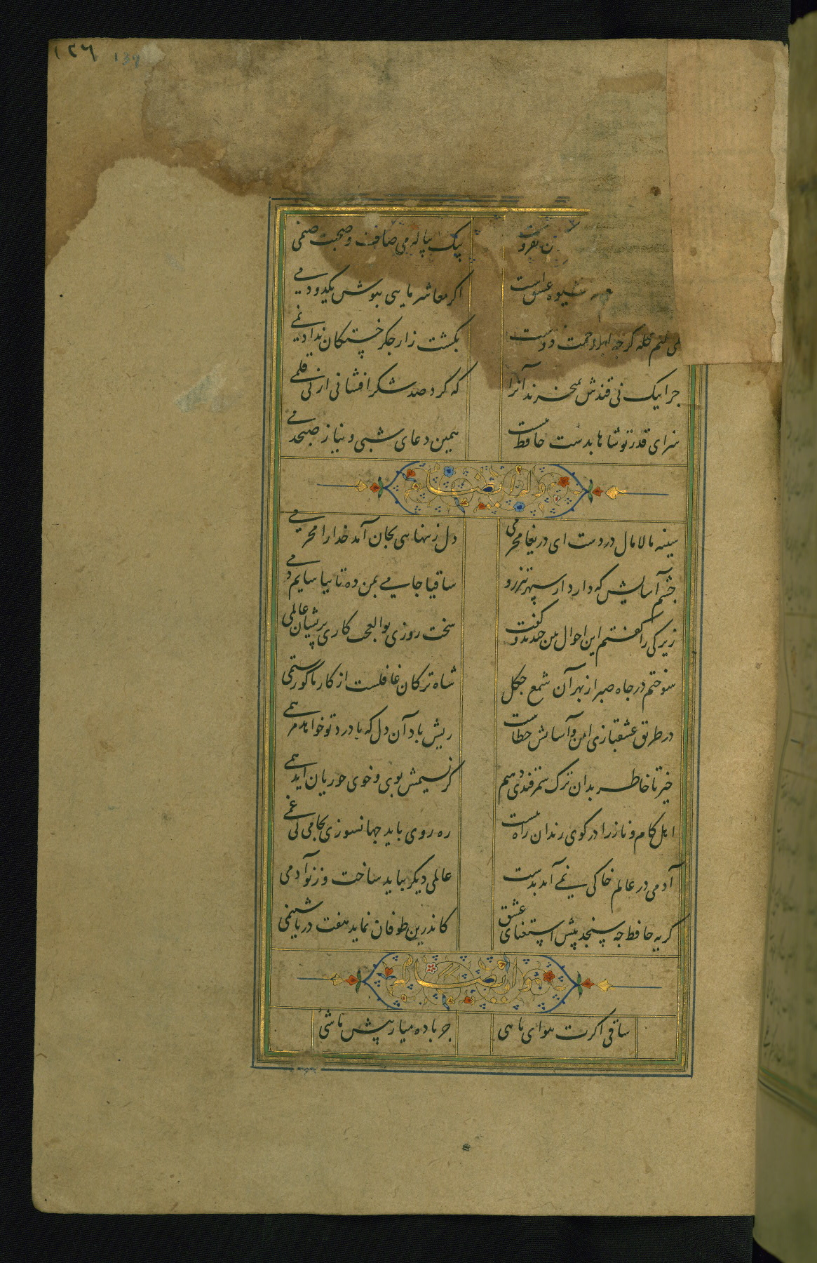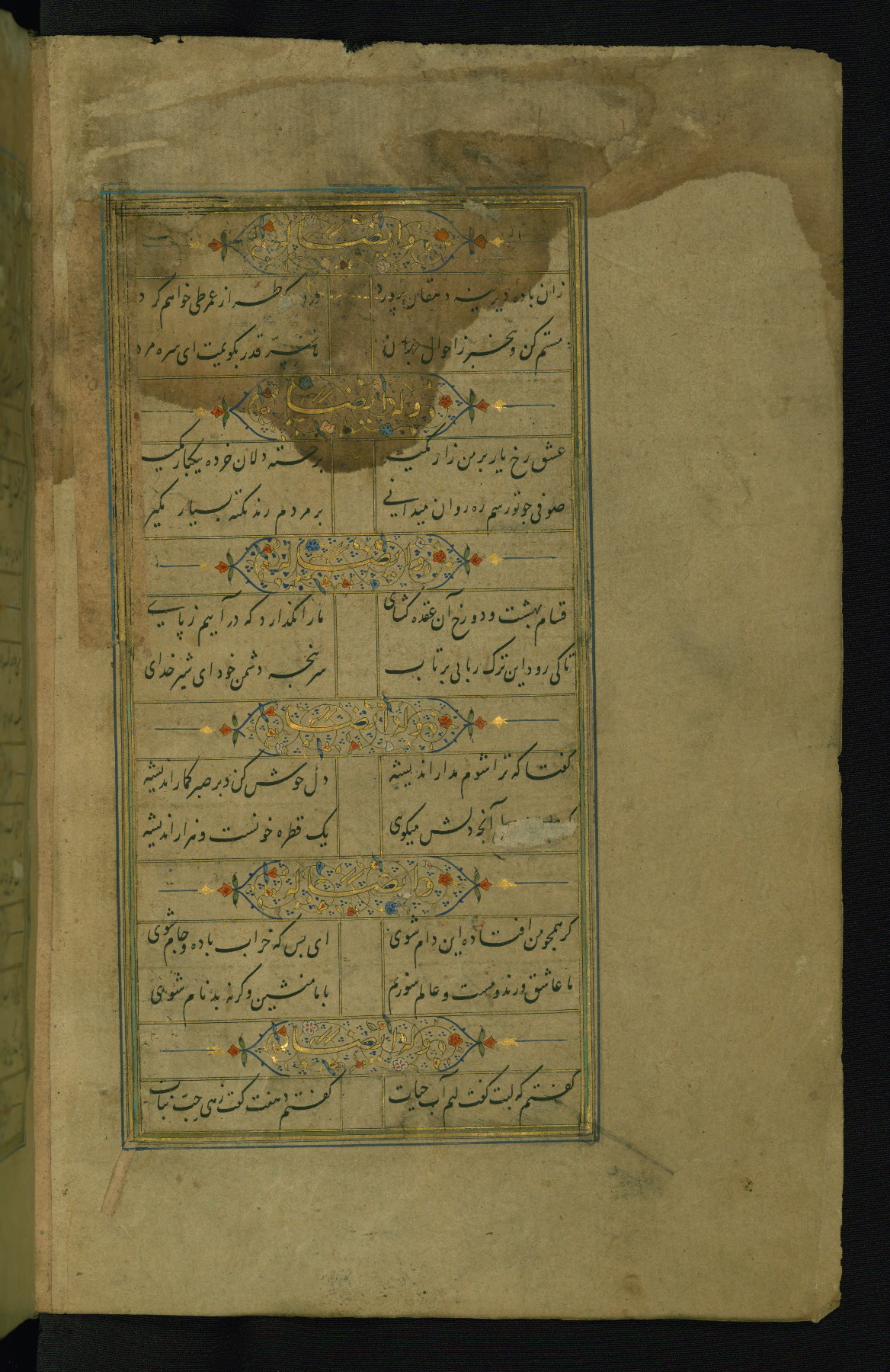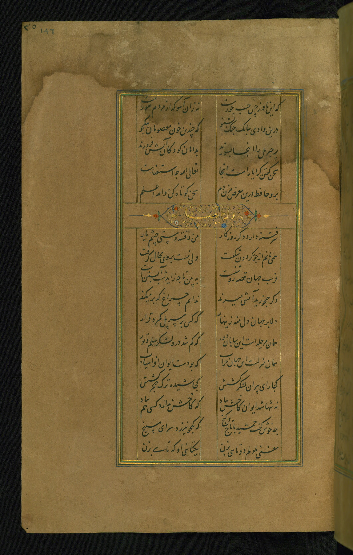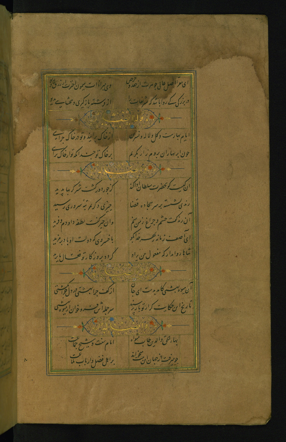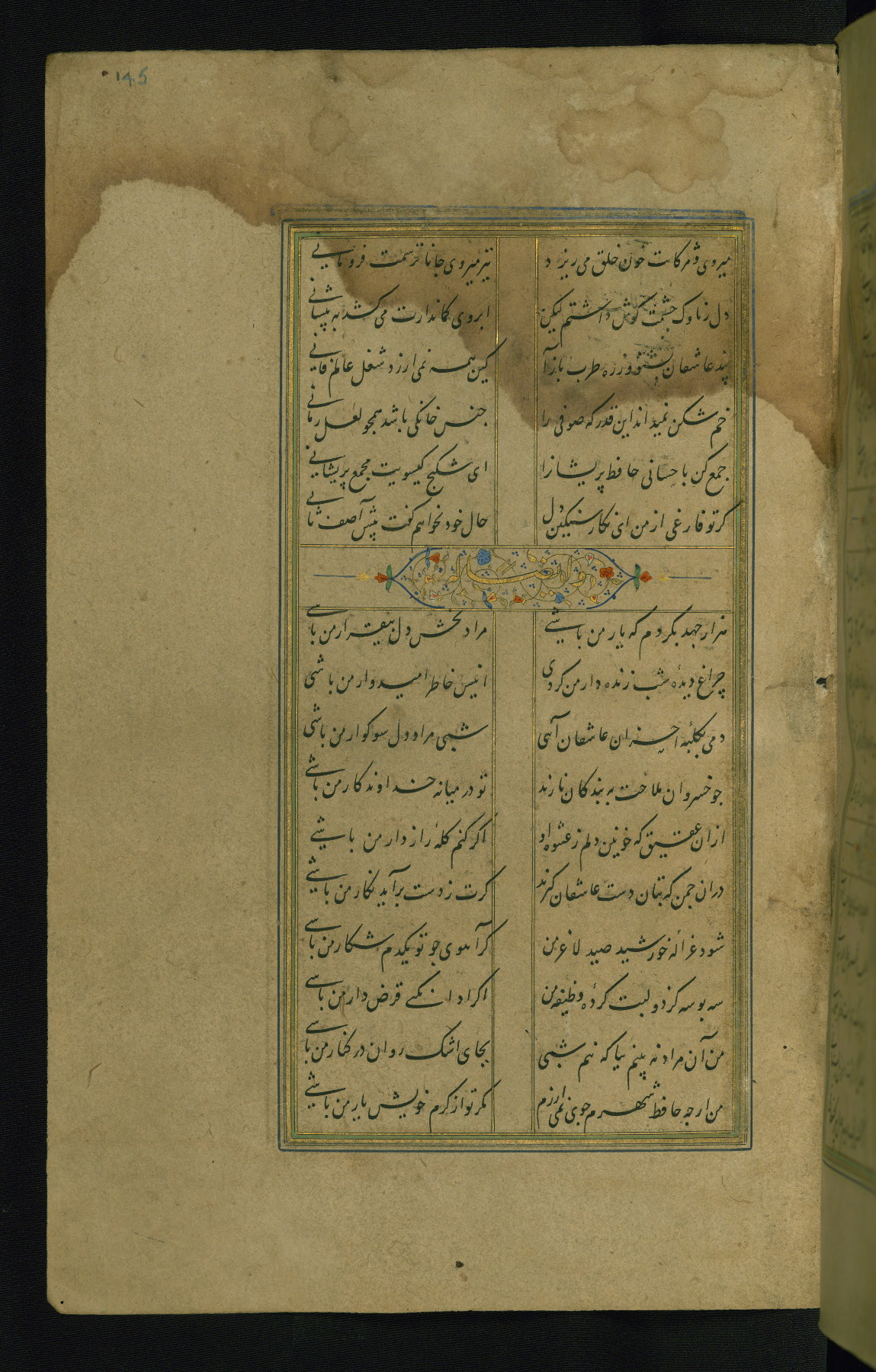This is an illuminated and illustrated manuscript copy of the Collection of poems (dīvān) by Shams al-Dīn Muḥammad Ḥāfiz al-Shīrāzī (fl. eighth century AH / fourteenth CE). It was written in black nasta‘līq script with chapter/section headings in gold ink by Zayn al-‘Ābidīn ‘Abd al-Raḥmān al-Jāmī in 918 AH / 1512 CE in Safavid Iran. The manuscript opens with an illuminated medallion (fol. 1a), followed by a double-page illustrated frontispiece (fols. 1b-2a). The text begins with an incipit page with illuminated headpiece (fol. 2b). There are three additional illustrations (fols. 24a, 49b, and 87a). The red leather binding, which is not original and may be attributed to late twelfth-century AH / eighteenth CE or thirteenth-century AH / nineteenth CE Turkey, has a scalloped medallion with gold-tooled decoration and borders.