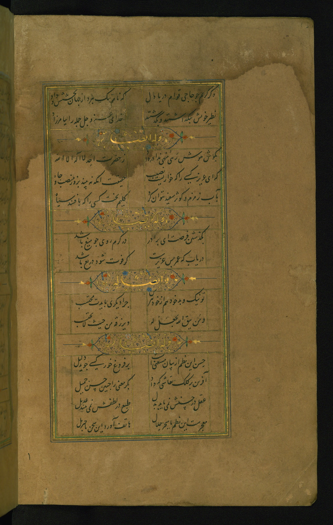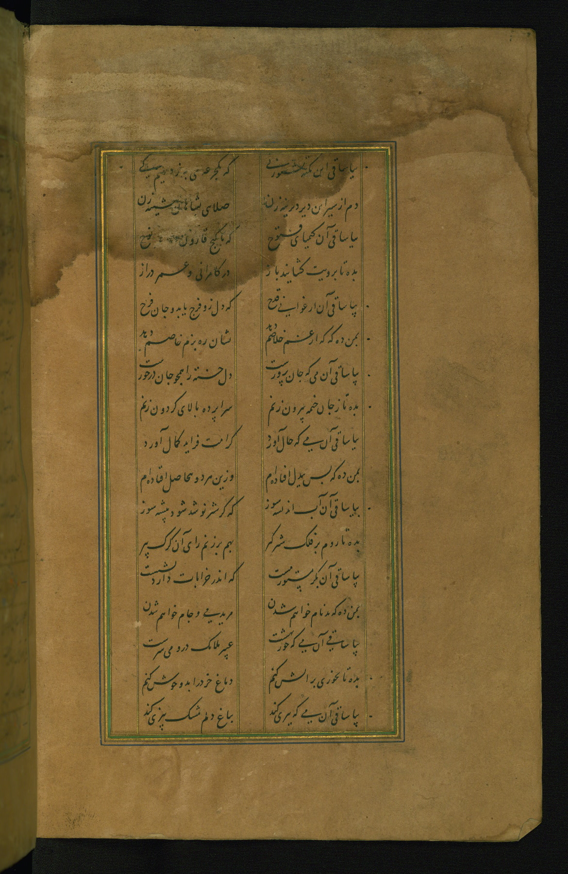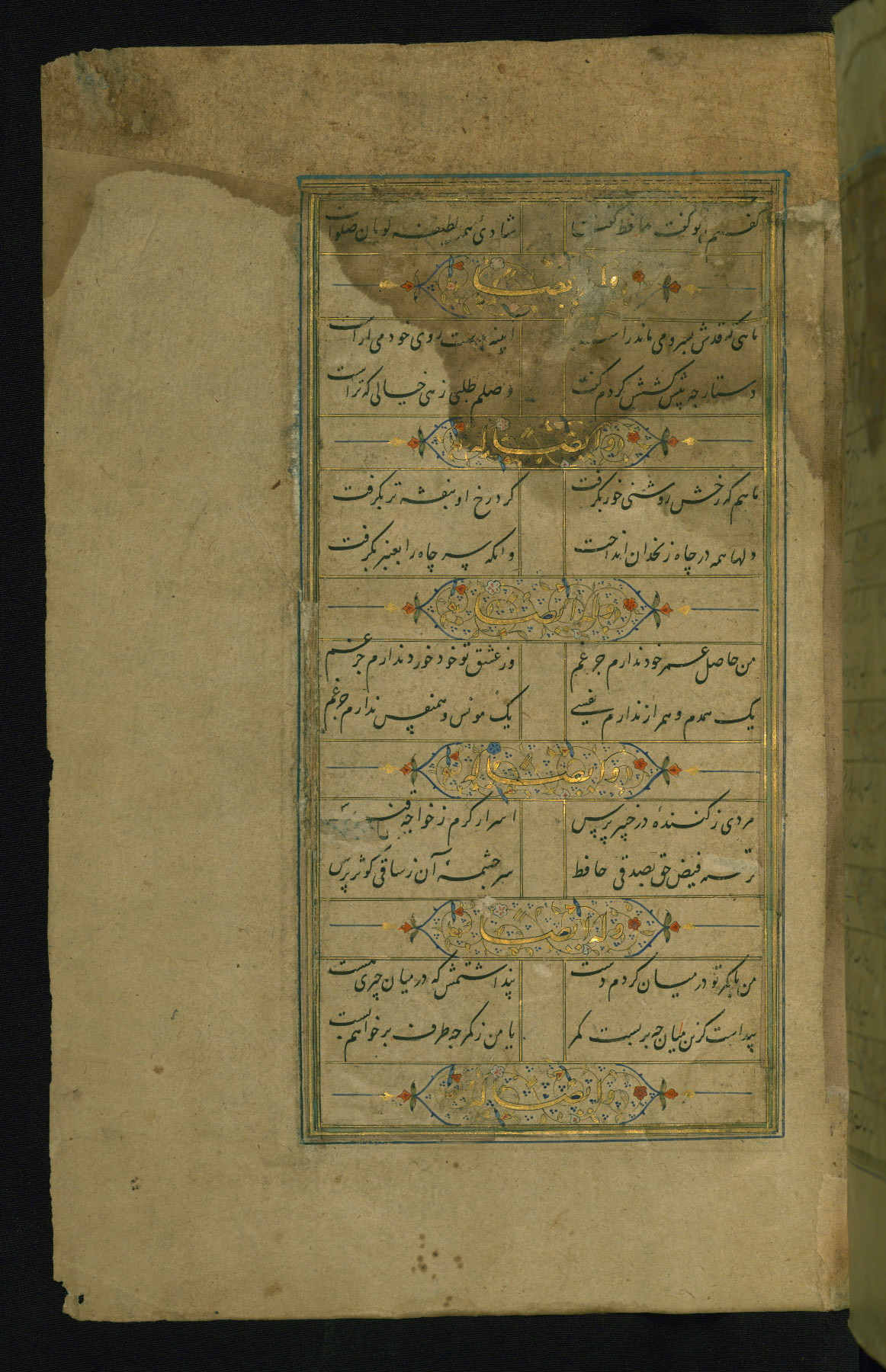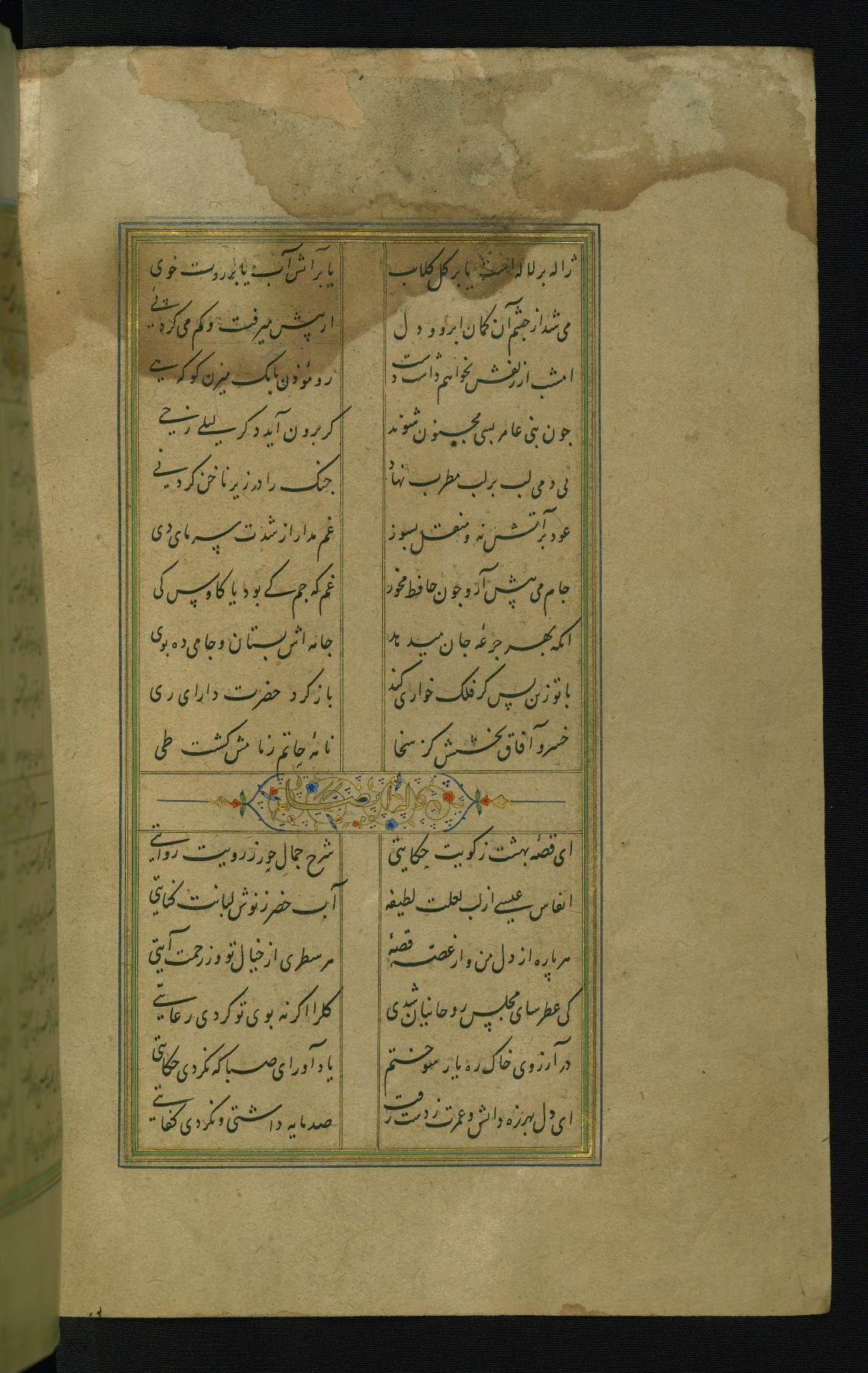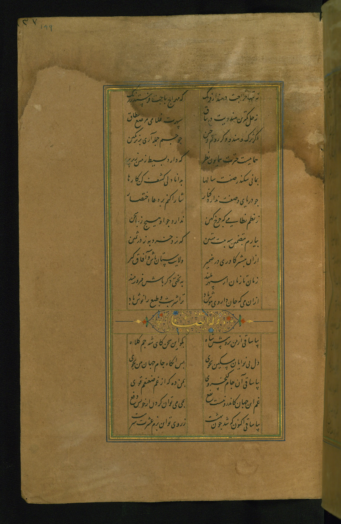 This is an illuminated and illustrated manuscript copy of the Collection of poems (dīvān) by Shams al-Dīn Muḥammad Ḥāfiz al-Shīrāzī (fl. eighth century AH / fourteenth CE). It was written in black nasta‘līq script with chapter/section headings in gold ink by Zayn al-‘Ābidīn ‘Abd al-Raḥmān al-Jāmī in 918 AH / 1512 CE in Safavid Iran. The manuscript opens with an illuminated medallion (fol. 1a), followed by a double-page illustrated frontispiece (fols. 1b-2a). The text begins with an incipit page with illuminated headpiece (fol. 2b). There are three additional illustrations (fols. 24a, 49b, and 87a). The red leather binding, which is not original and may be attributed to late twelfth-century AH / eighteenth CE or thirteenth-century AH / nineteenth CE Turkey, has a scalloped medallion with gold-tooled decoration and borders.