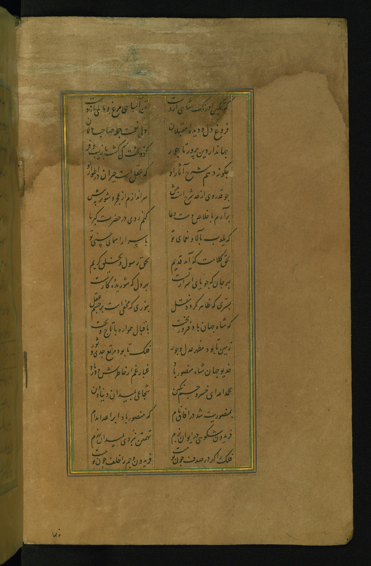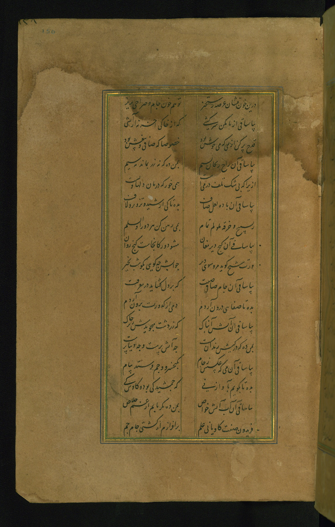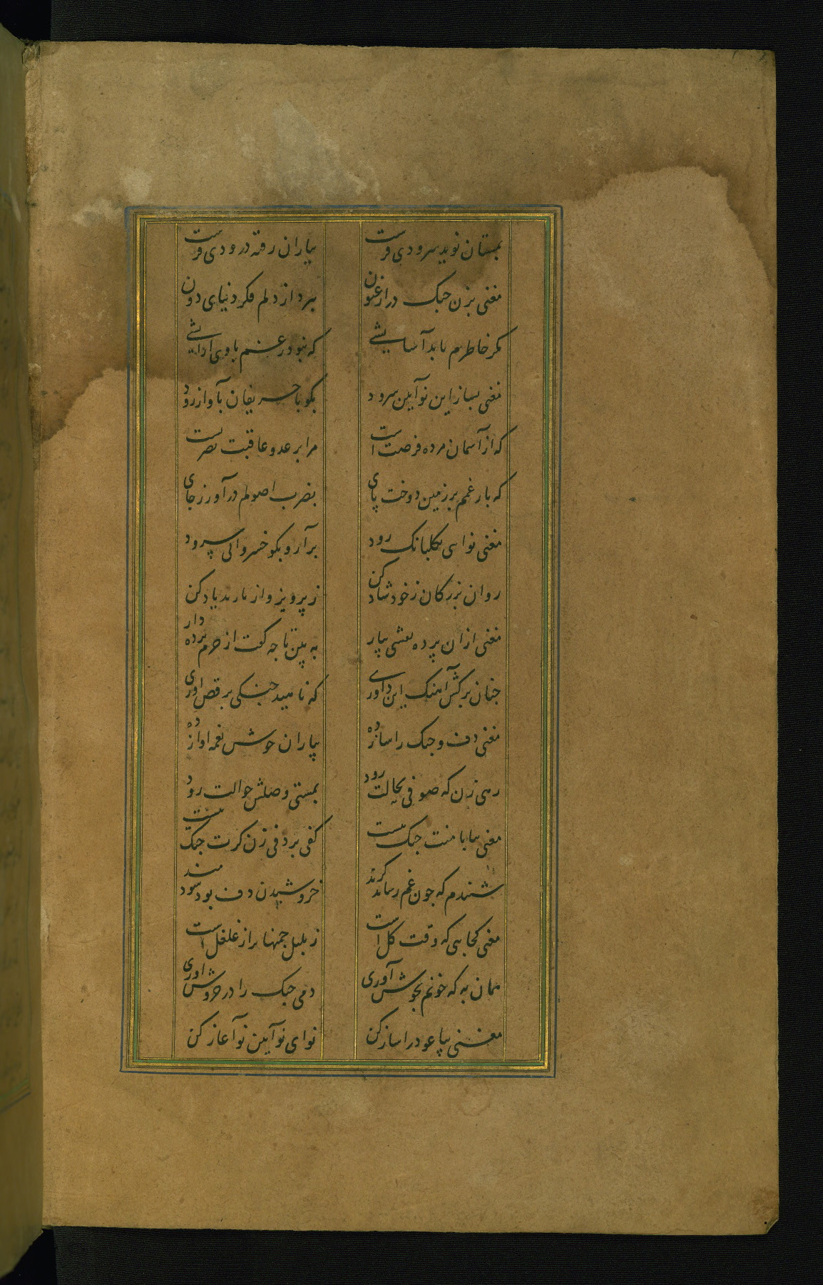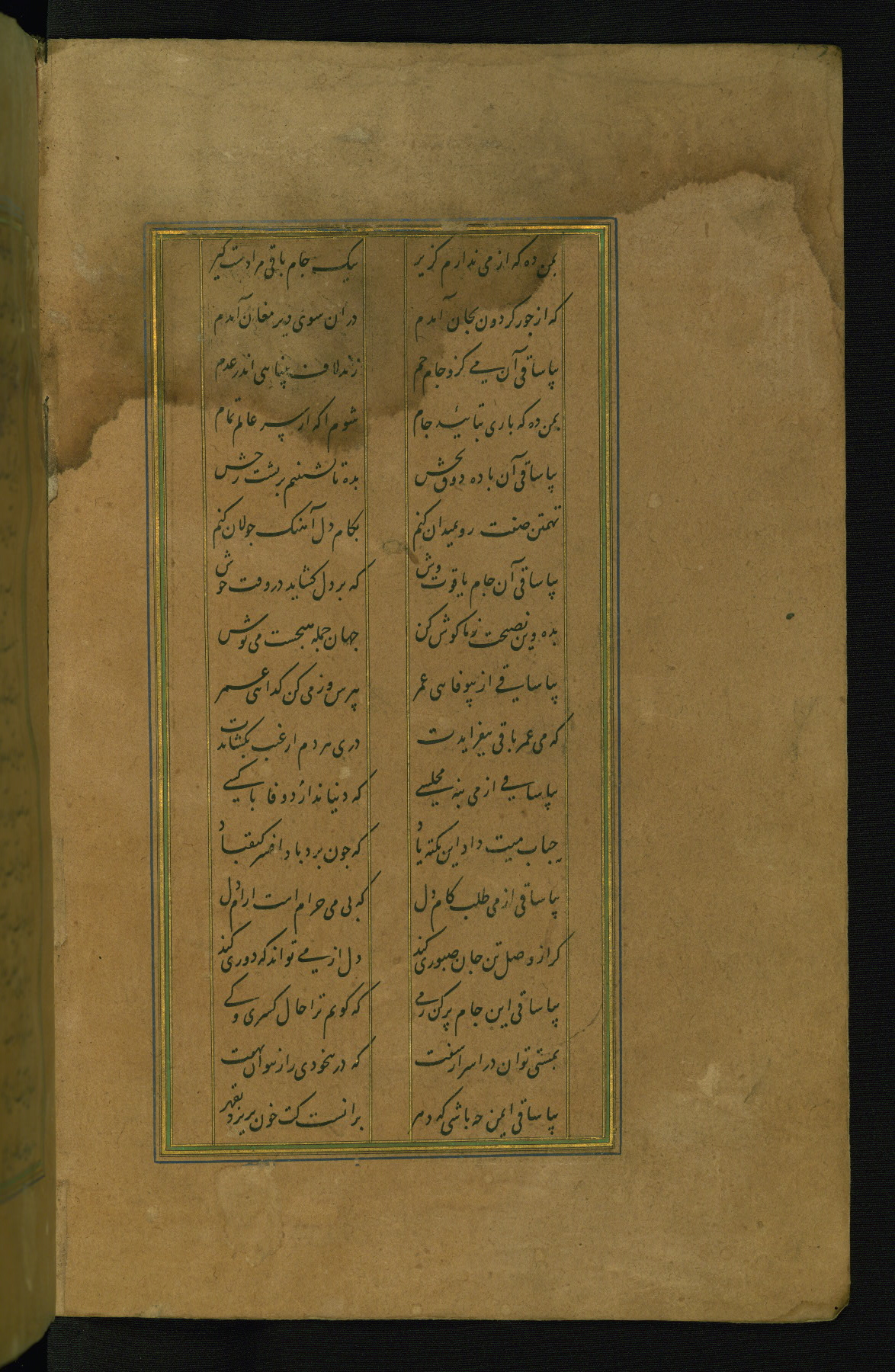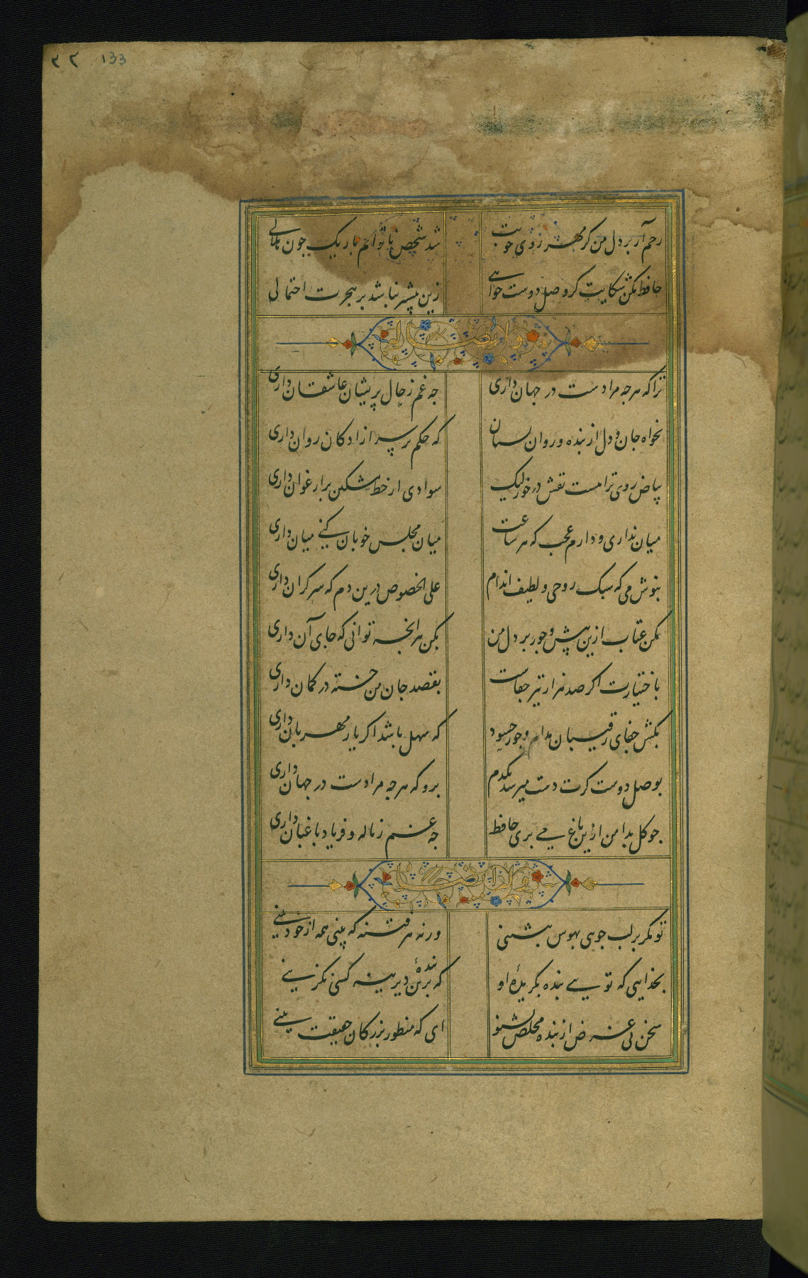 This is an illuminated and illustrated manuscript copy of the Collection of poems (dīvān) by Shams al-Dīn Muḥammad Ḥāfiz al-Shīrāzī (fl. eighth century AH / fourteenth CE). It was written in black nasta‘līq script with chapter/section headings in gold ink by Zayn al-‘Ābidīn ‘Abd al-Raḥmān al-Jāmī in 918 AH / 1512 CE in Safavid Iran. The manuscript opens with an illuminated medallion (fol. 1a), followed by a double-page illustrated frontispiece (fols. 1b-2a). The text begins with an incipit page with illuminated headpiece (fol. 2b). There are three additional illustrations (fols. 24a, 49b, and 87a). The red leather binding, which is not original and may be attributed to late twelfth-century AH / eighteenth CE or thirteenth-century AH / nineteenth CE Turkey, has a scalloped medallion with gold-tooled decoration and borders.