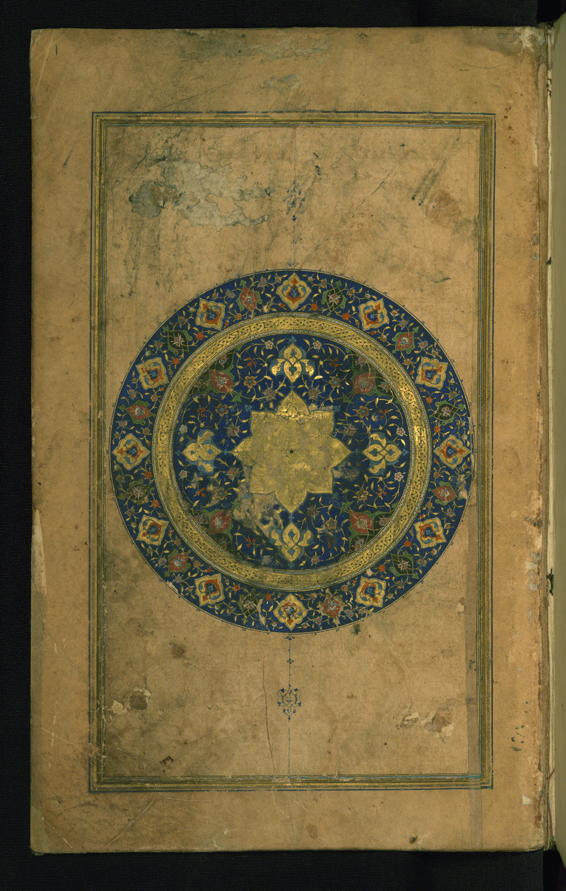 - Label: This frontispiece is decorated with a round illuminated medallion (shamsah), decorated in blue, red, and gold designs.