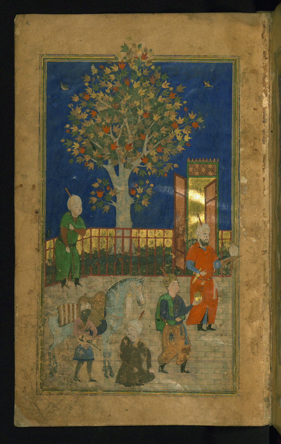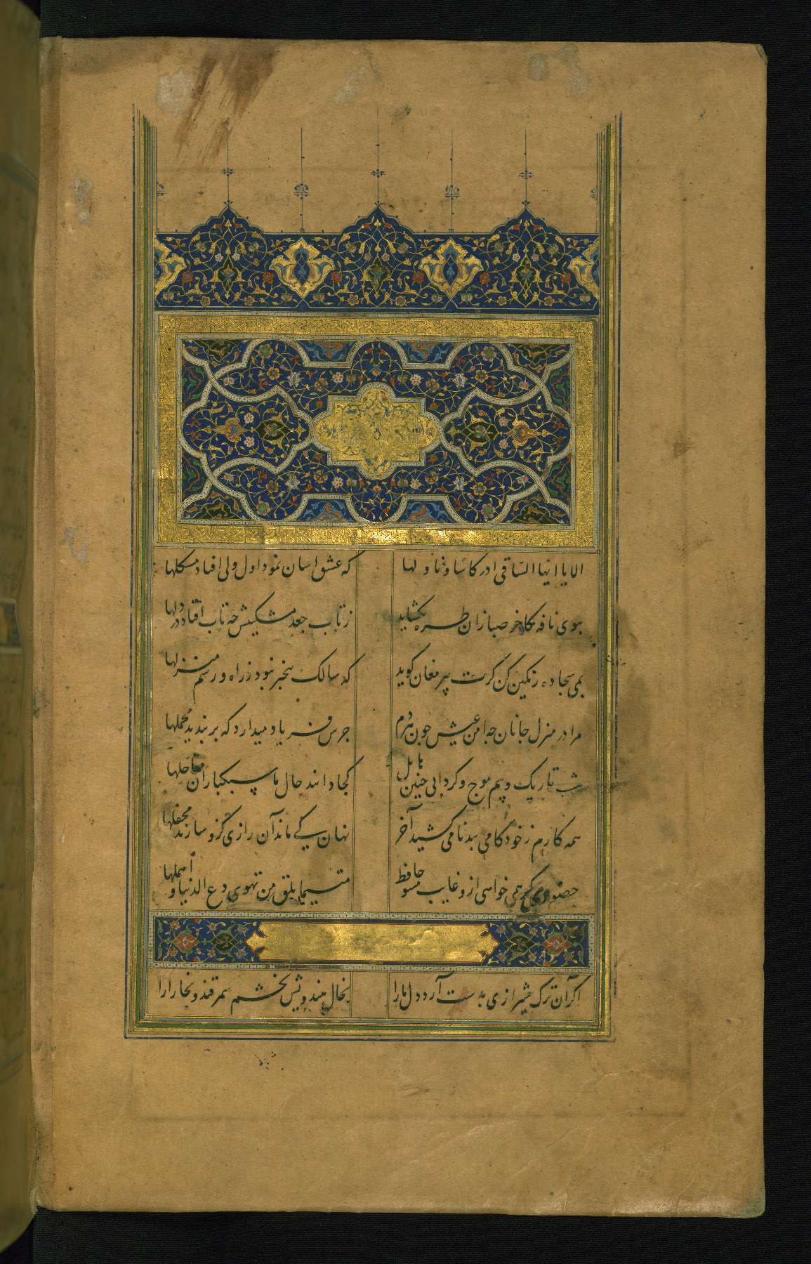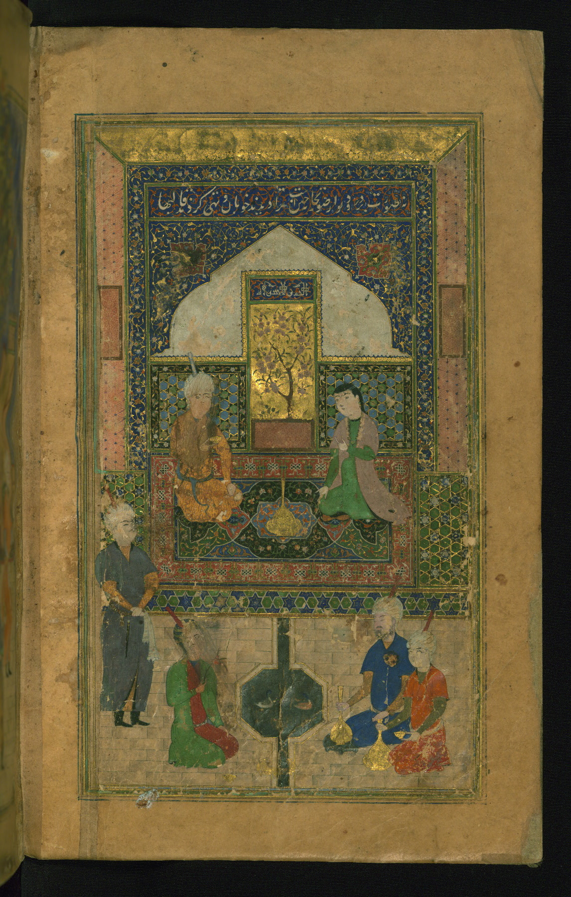 This is an illuminated and illustrated manuscript copy of the Collection of poems (dīvān) by Shams al-Dīn Muḥammad Ḥāfiz al-Shīrāzī (fl. eighth century AH / fourteenth CE). It was written in black nasta‘līq script with chapter/section headings in gold ink by Zayn al-‘Ābidīn ‘Abd al-Raḥmān al-Jāmī in 918 AH / 1512 CE in Safavid Iran. The manuscript opens with an illuminated medallion (fol. 1a), followed by a double-page illustrated frontispiece (fols. 1b-2a). The text begins with an incipit page with illuminated headpiece (fol. 2b). There are three additional illustrations (fols. 24a, 49b, and 87a). The red leather binding, which is not original and may be attributed to late twelfth-century AH / eighteenth CE or thirteenth-century AH / nineteenth CE Turkey, has a scalloped medallion with gold-tooled decoration and borders.