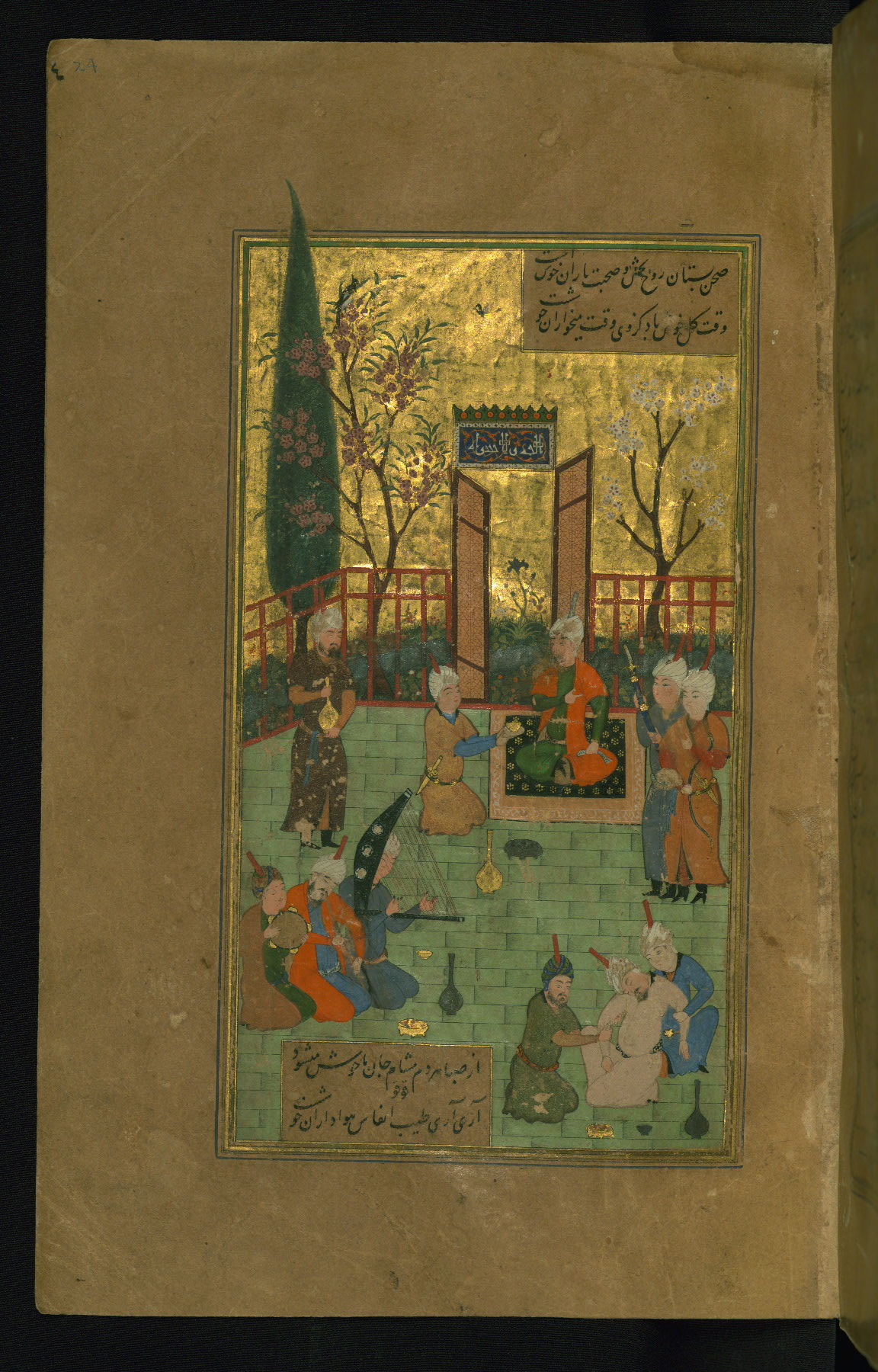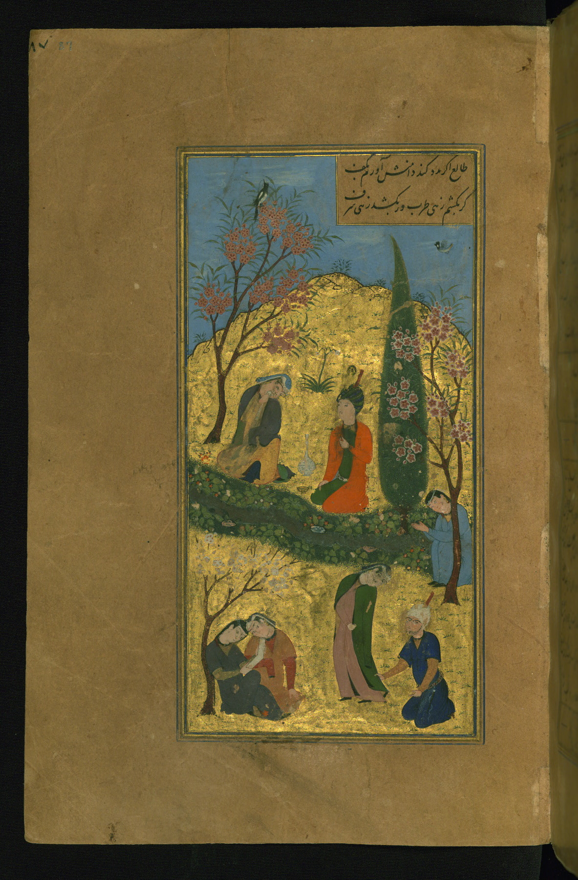 - Label: This illustration depicts an outdoor gathering (majlis), with figures engaged in playing music and drinking. One is so inebriated he is being held upright.