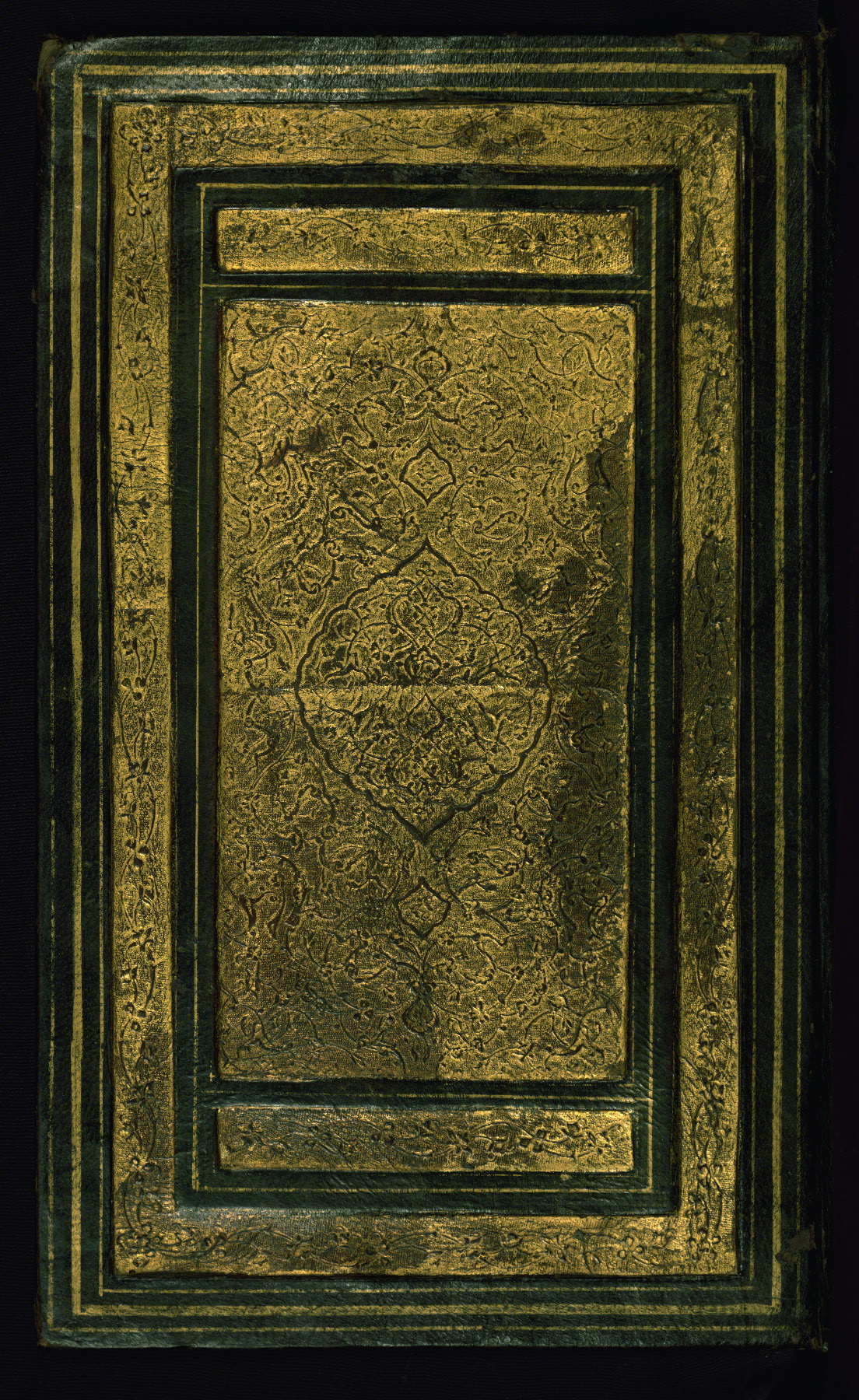 - Label: This dark brown leather binding with flap is original to the manuscript, which is dated Shaʿbān 966 AH / 1559 CE. The decoration consists of a gold-brushed, panel-stamped central lobed medallion with pendants and an allover floral and vine decoration. There is a wide outer frame surrounded by narrow, gold-painted outer frames.