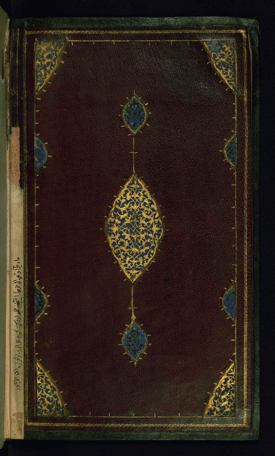 - Label: The doublures of this manuscript are red-brown leather decorated with a central medallion, pendants, and cornerpieces in leather filigree on a blue ground.